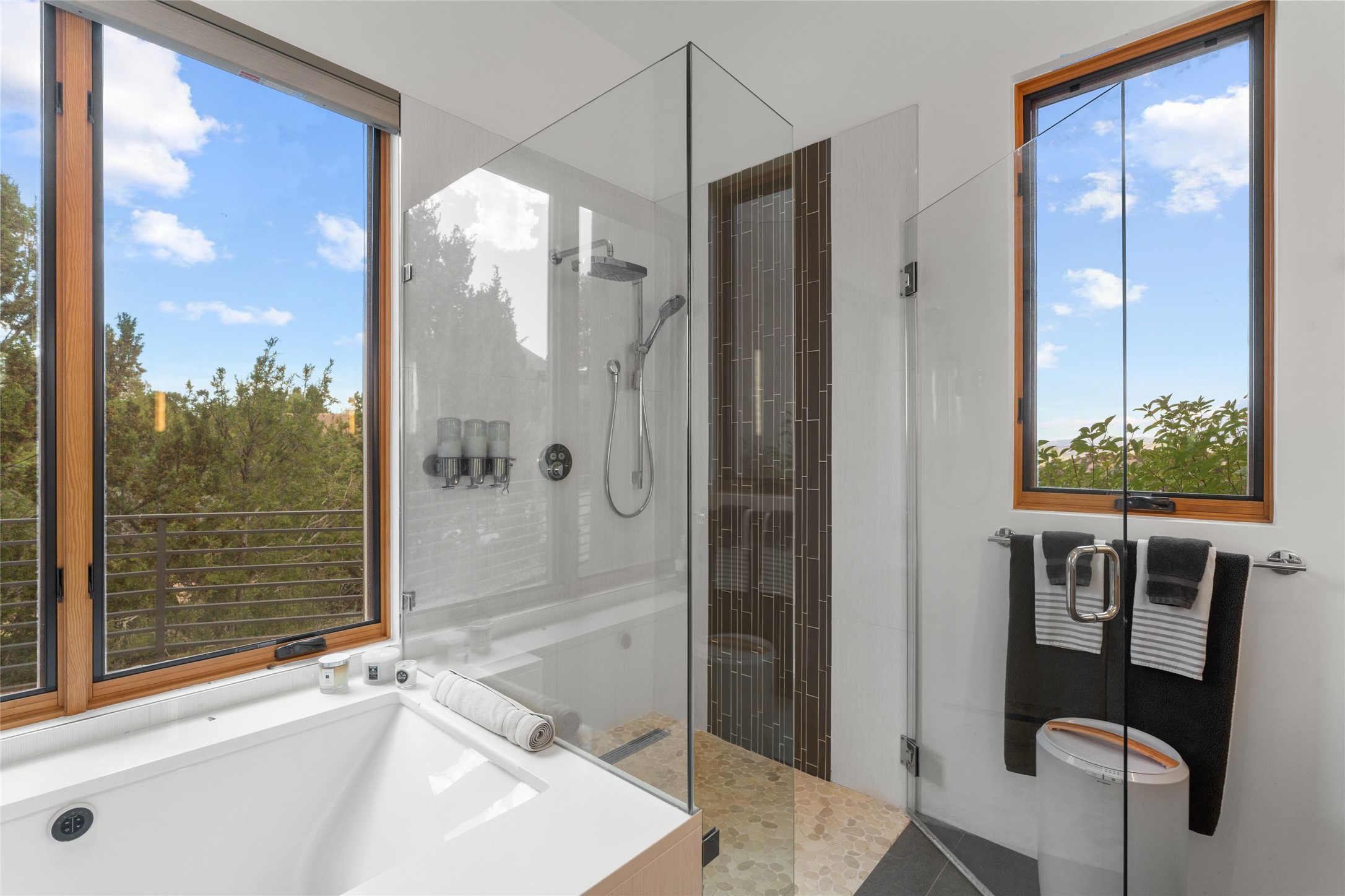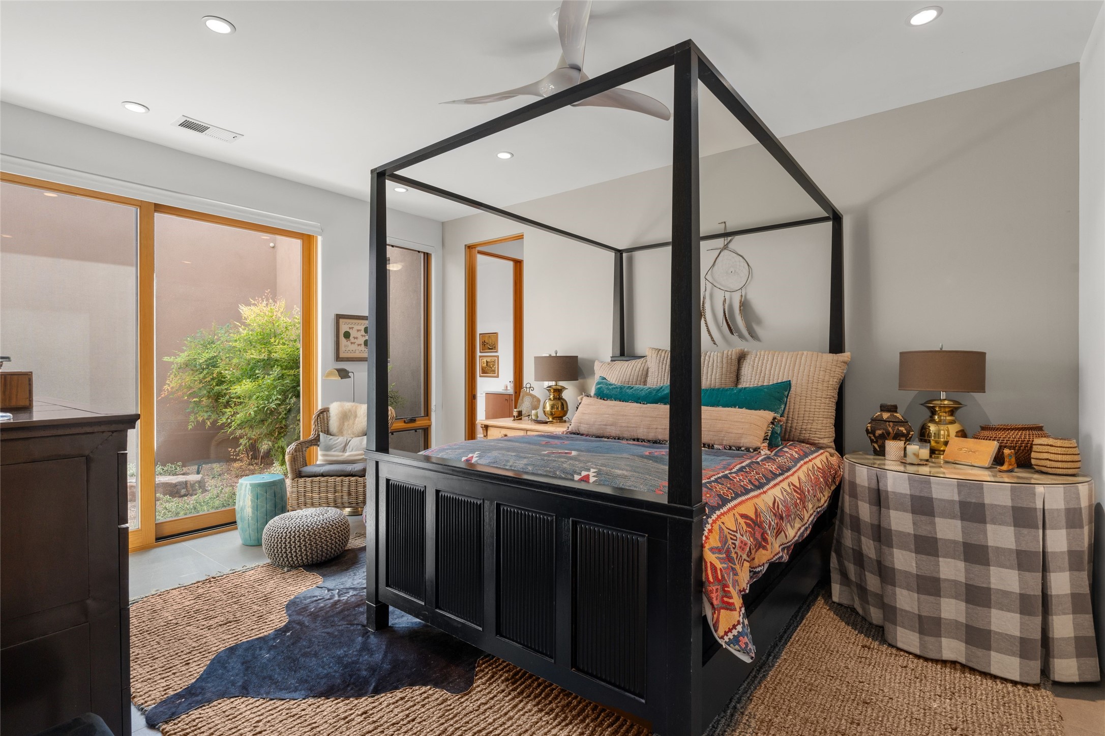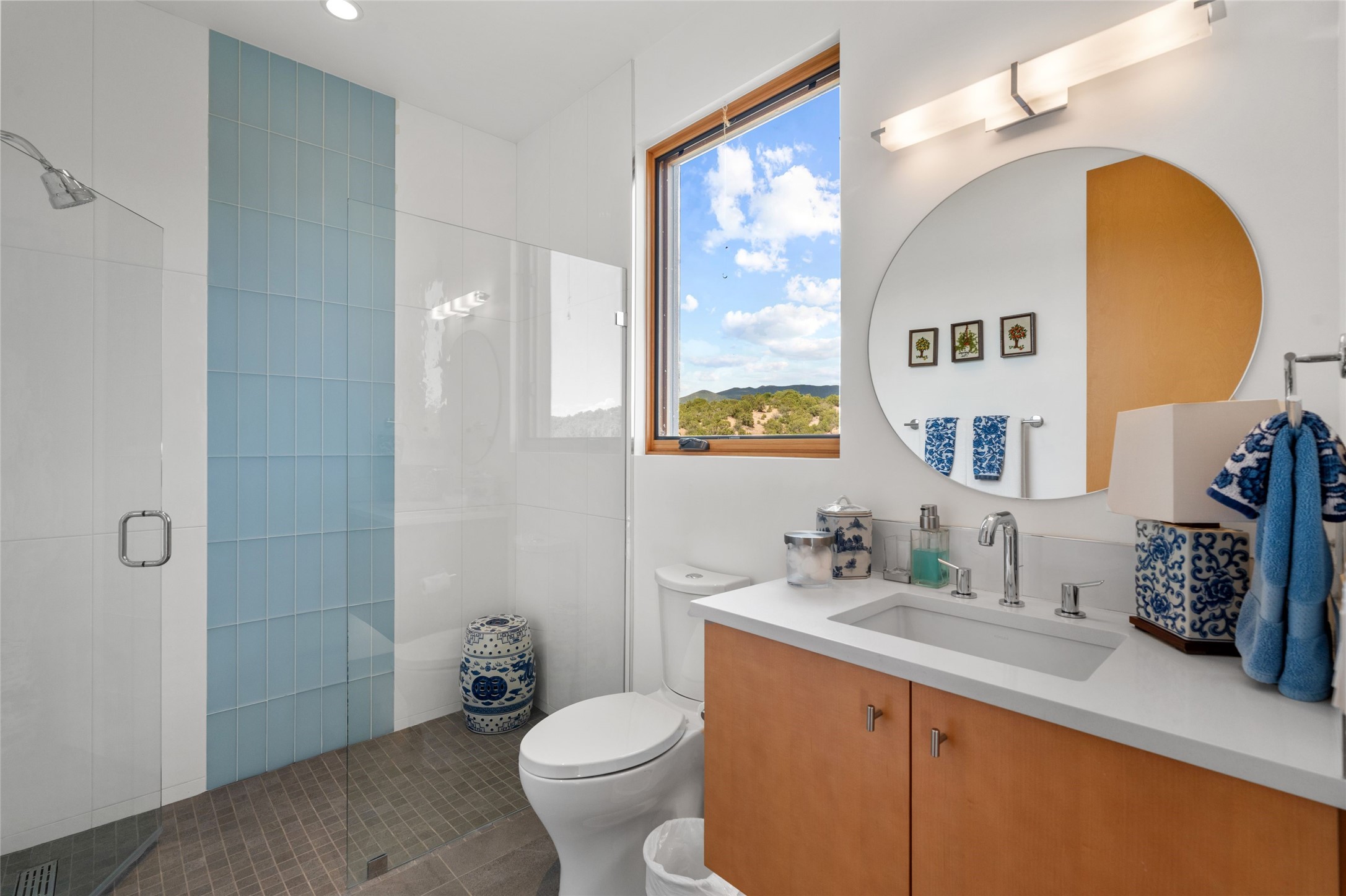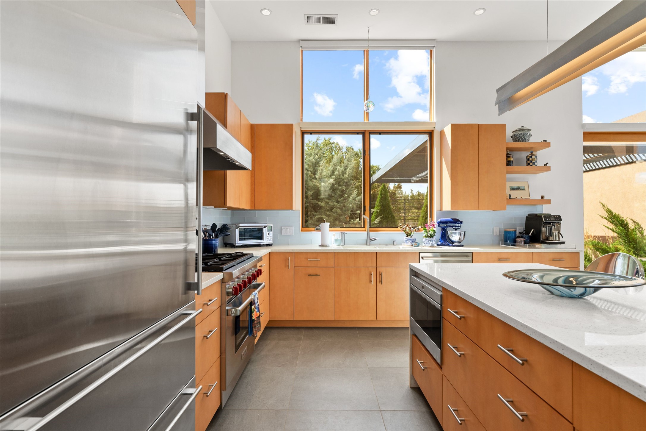 Welcome to the Opera House. Just a stones throw to the entrance to the world renowned Santa Fe Opera is this stunning soft contemporary home situated on a beautiful view lot that boasts expansive private views of the Sangre de Christo Mountain range and the Badlands to the north. This light filled home is a dream residence for the most discriminating Buyer. Top of the line quality abounds in every area from landscaping, custom rock retaining walls, and a stone drive way that greet your guests arrival. Extensive native plant landscaping compliments every entry for a dramatic effect. Custom outdoor kitchen is a entertaining dream plus a fully covered deck that faces the north east off both living areas. The home offers a split floor plan, each bedroom with their own ensuite bath and privacy. The 2 living areas have soaring floor to ceiling windows with unobstructed views. Top of the line appliances, cabinetry that grace the kitchen great room area for a spacious and relaxed environment. Custom hot tub, a bonus, overlooking the mountains and natural landscape and offering a starlit New Mexico sky for your evening relaxation. Impeccably maintained, one of a kind, this this property is a special offering.