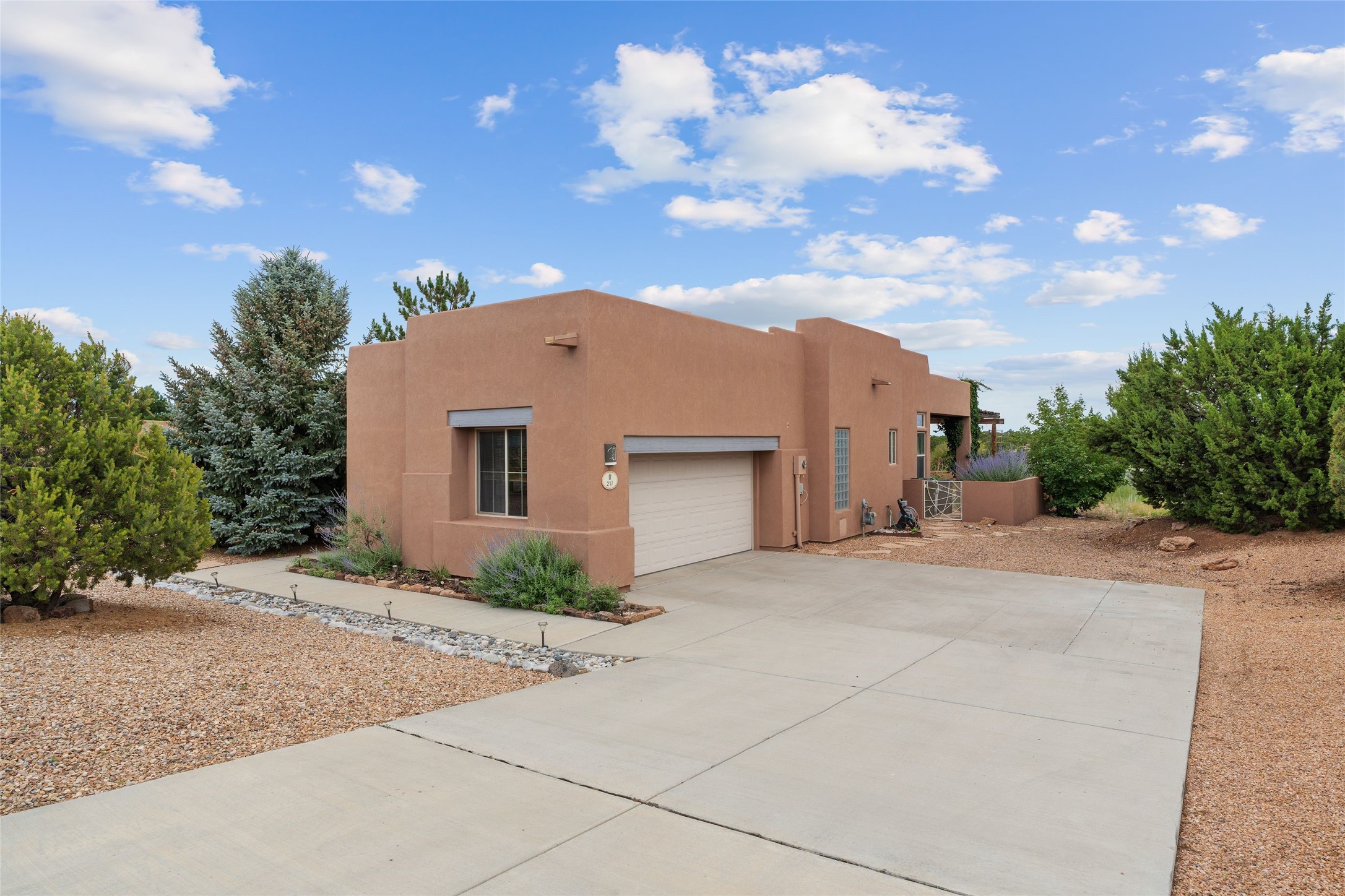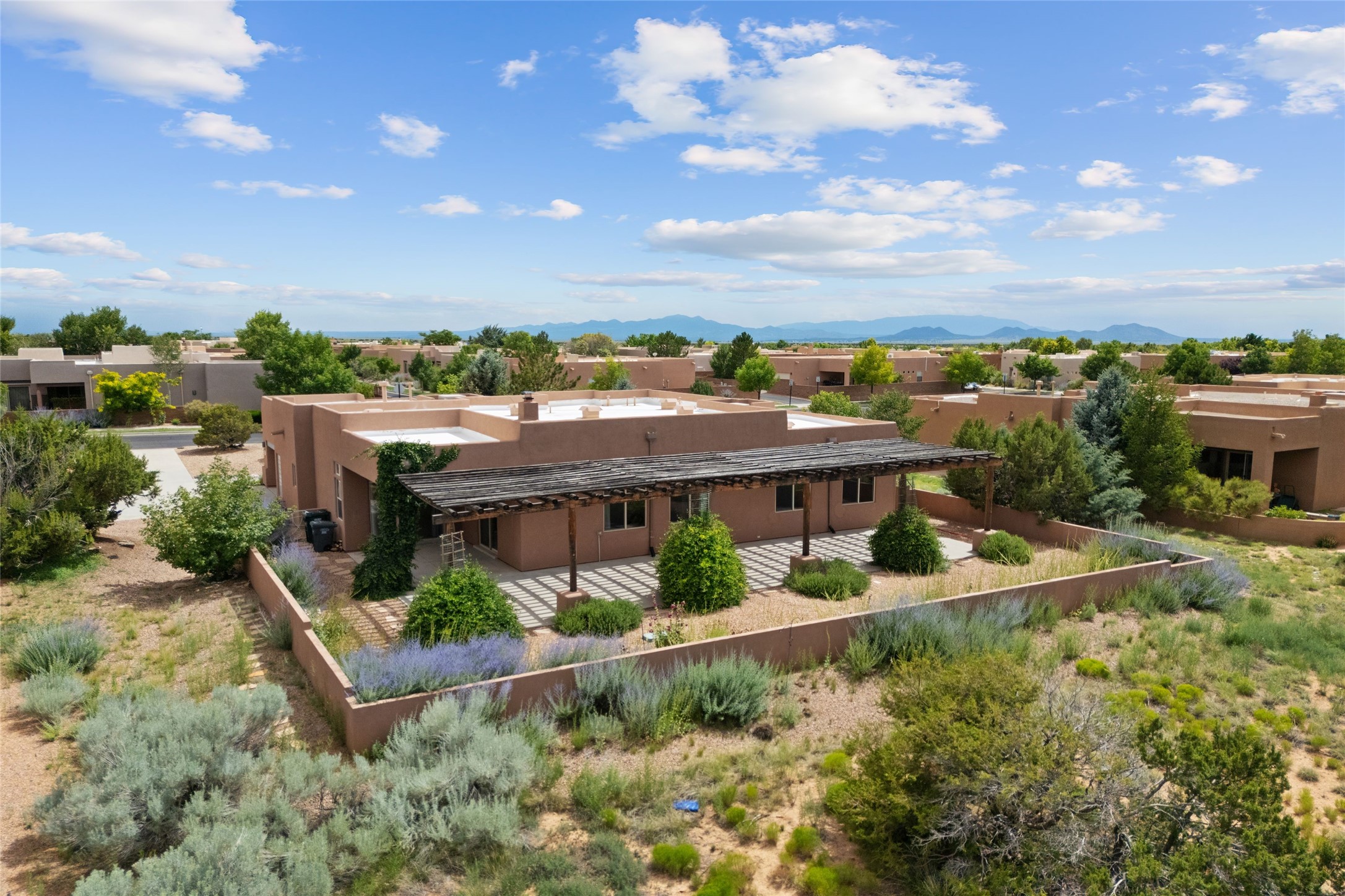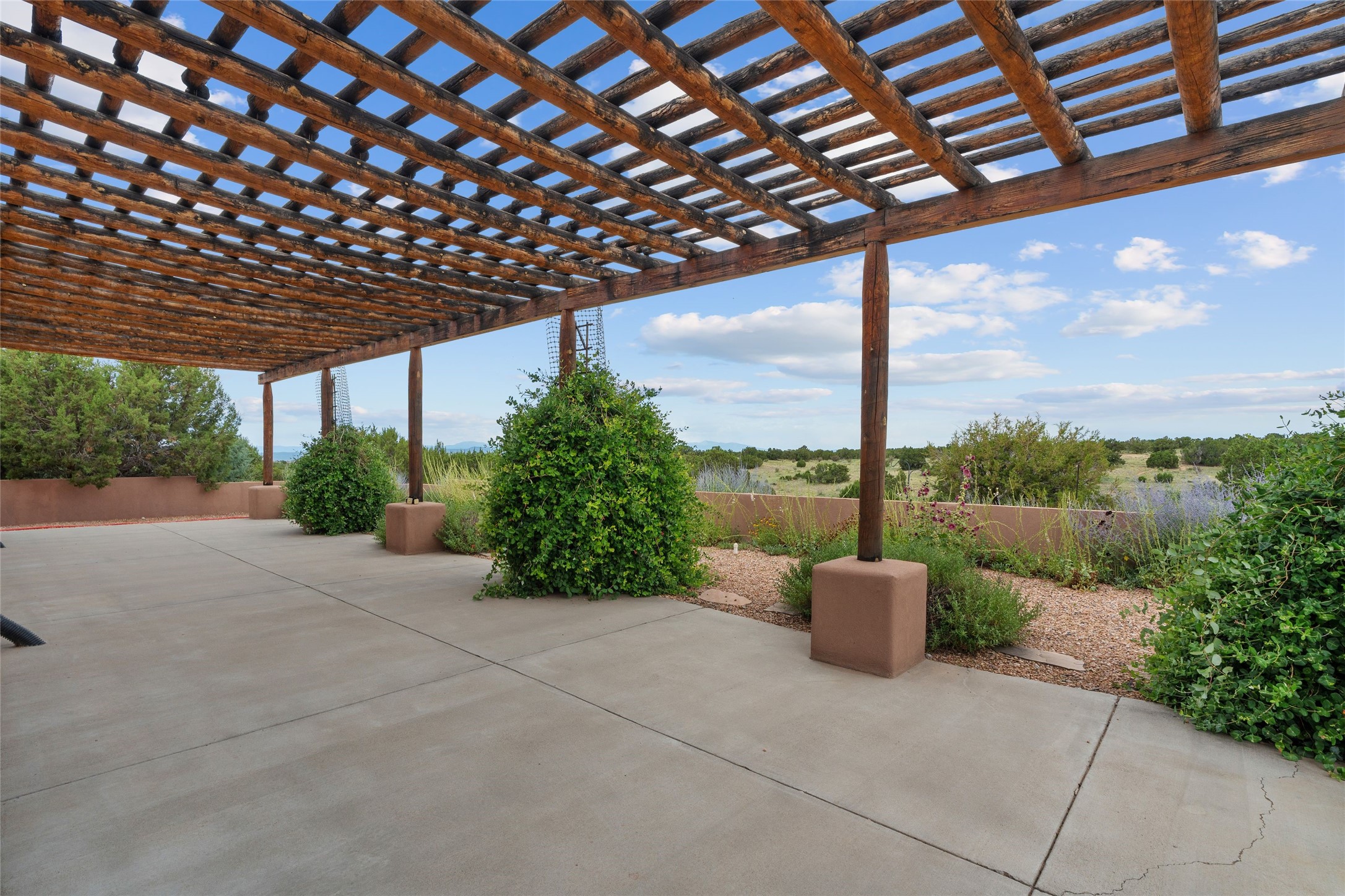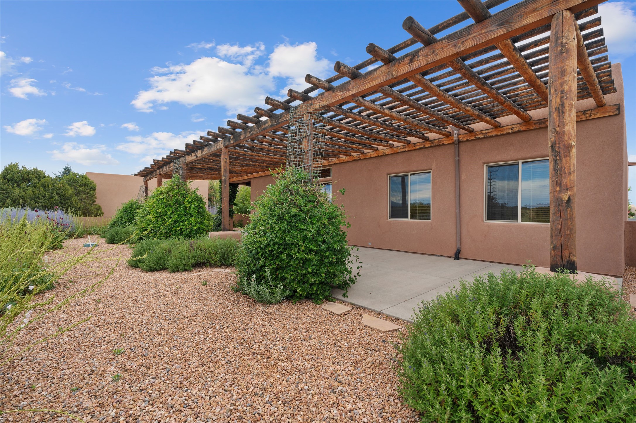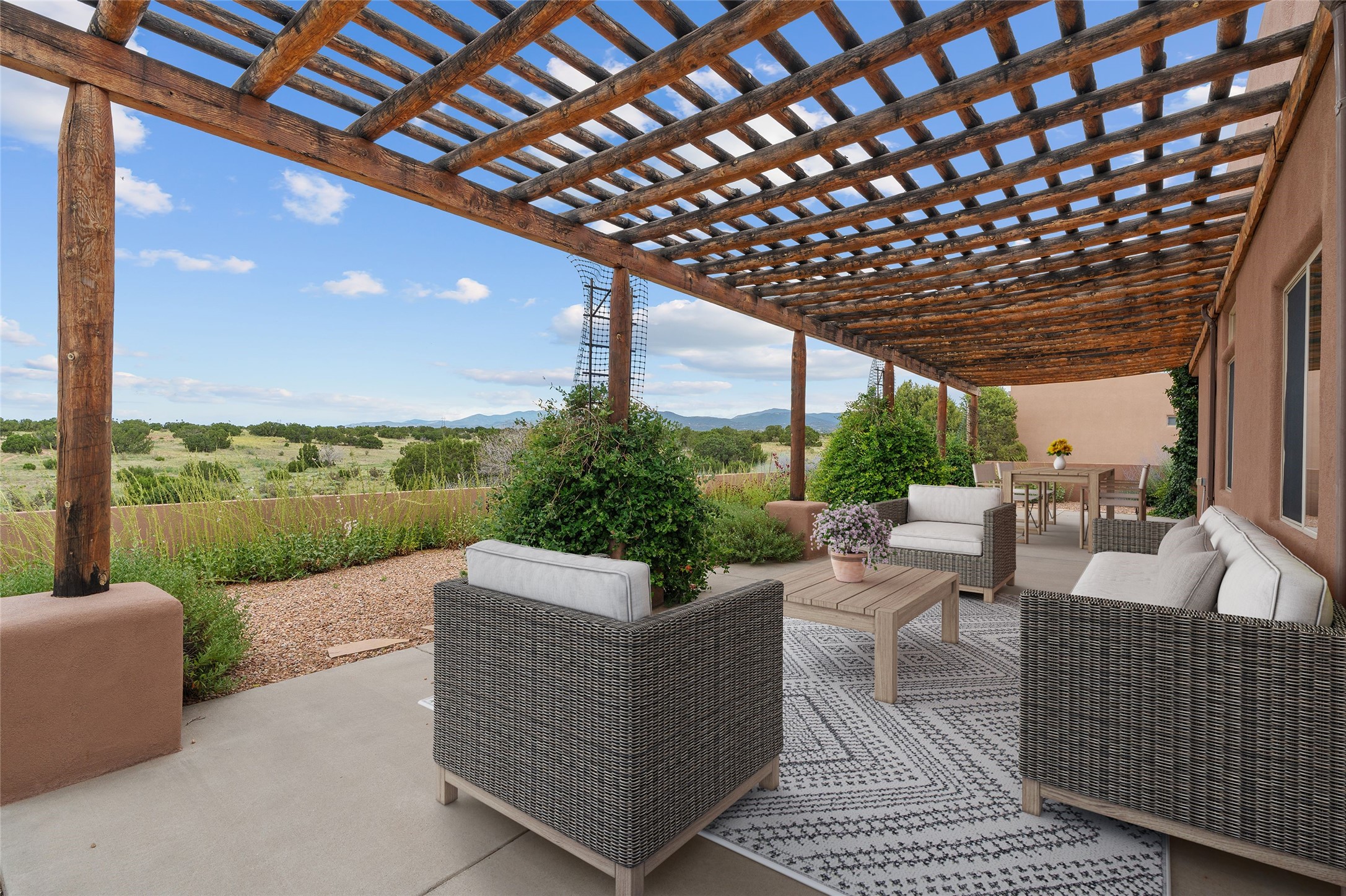 Excellent Opportunity! Sited on acre + conservation lot with expansive dedicated open space and unobstructed Sangre de Cristo and Jemez Mountain views. An immense ramada and solid covered portal embraces the great outdoors and view. Enjoy over 13 miles of private walking and biking trails steps from the back yard and Rancho Viejo's numerous open spaces, parks and playground areas. The spacious home features a large open kitchen, dining and living area floor plan with large view windows, patio/portal access, 12 ft ceilings with vigas, and a corner kiva fireplace with custom screen. The primary suite has total separation, boasts an oversize walk-in closet, a spacious bath with a big double vanity area, jetted tub, walk-in shower and private WC. The substantial 4th bedroom offers versatility with its own French doors entrance for private office, family room or your own desired application. The generous, attractive kitchen has an enviable, bright breakfast area and a nice roomy seating bar for family and guests' comfortable interaction with the cooks. The counter tops are granite tile, and the cabinets are Knotty Alder. The garage is oversize direct entry with extra storage/workshop space. The front yard features large, mature Spruce trees, attractive landscaping and hardscaping detail, irrigation system and water catchment. The backyard is enclosed with a pony wall and adorned with perennials. This special property has lots of custom features including all solid pine doors and an ornamental custom front screen door with security dead bolt. Pre-inspected, move-in ready.