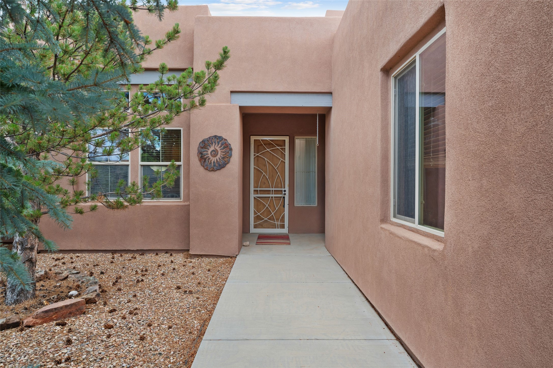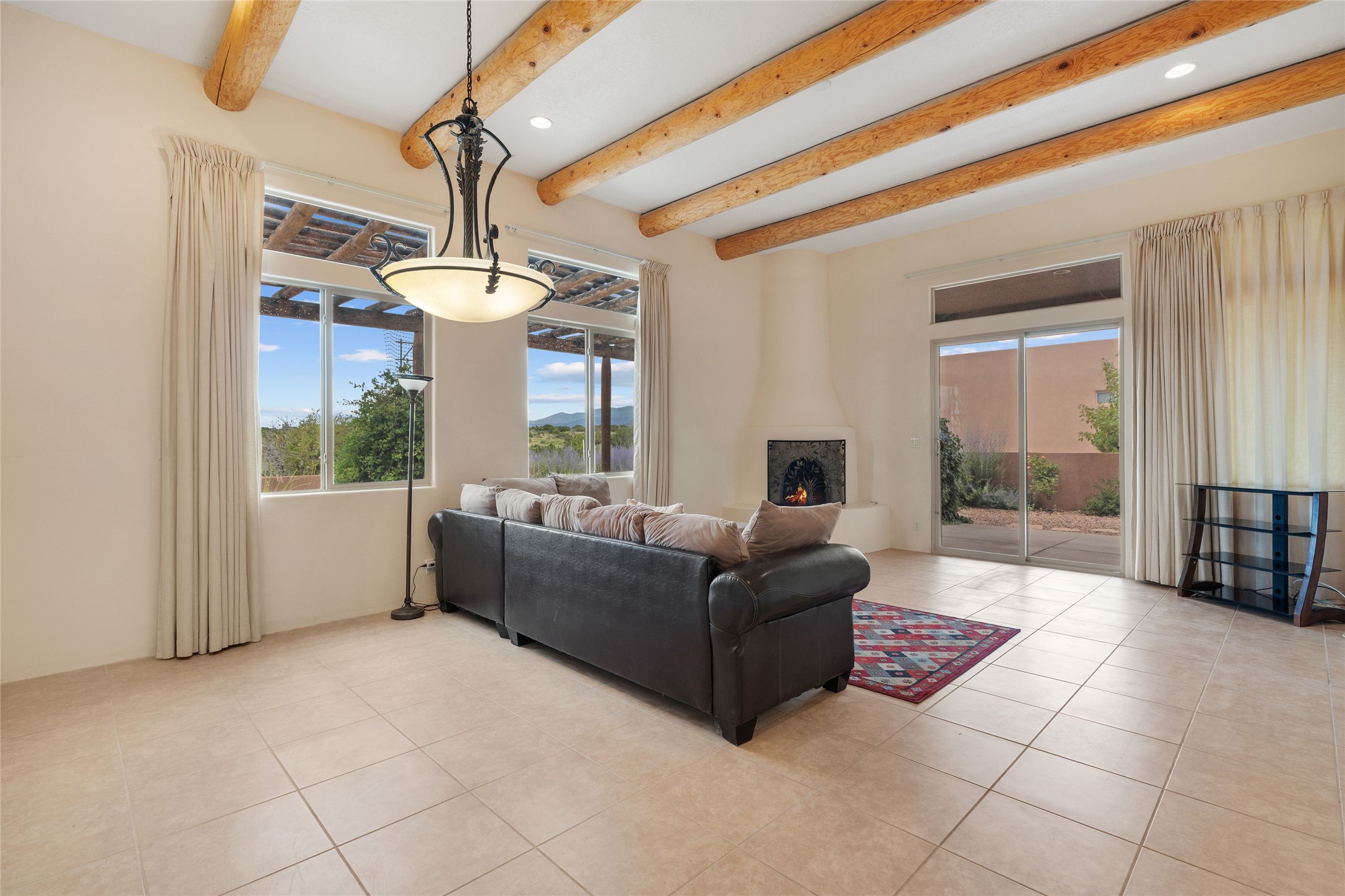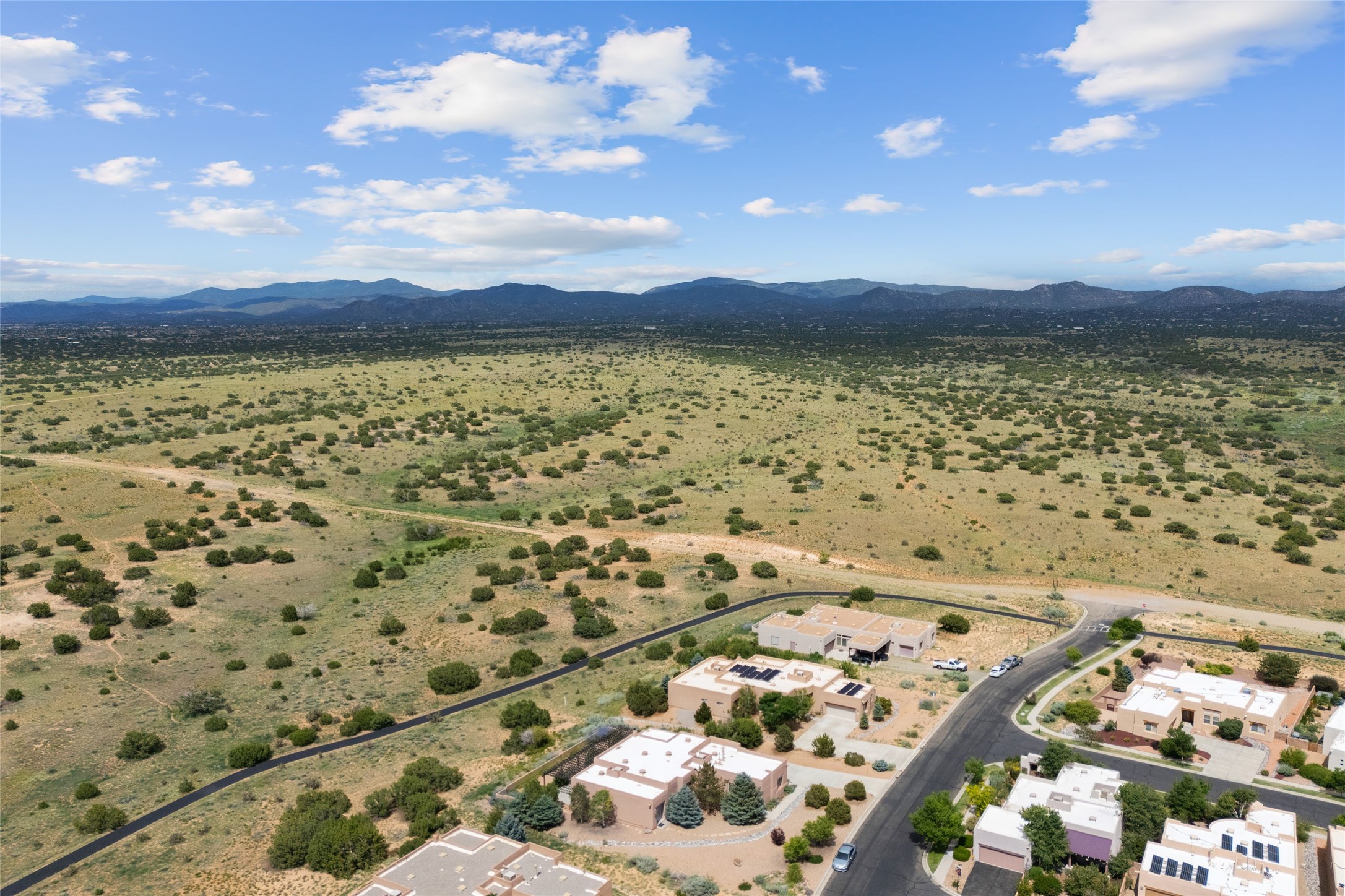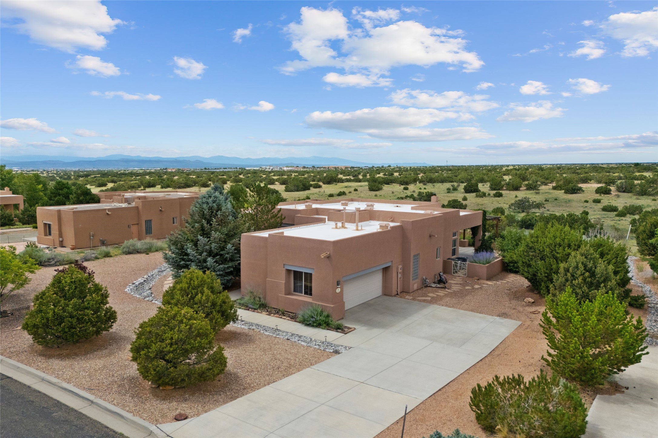 Excellent Opportunity! Sited on acre + conservation lot with expansive dedicated open space and unobstructed Sangre de Cristo and Jemez Mountain views. An immense ramada and solid covered portal embraces the great outdoors and view. Enjoy over 13 miles of private walking and biking trails steps from the back yard and Rancho Viejo's numerous open spaces, parks and playground areas. The spacious home features a large open kitchen, dining and living area floor plan with large view windows, patio/portal access, 12 ft ceilings with vigas, and a corner kiva fireplace with custom screen. The primary suite has total separation, boasts an oversize walk-in closet, a spacious bath with a big double vanity area, jetted tub, walk-in shower and private WC. The substantial 4th bedroom offers versatility with its own French doors entrance for private office, family room or your own desired application. The generous, attractive kitchen has an enviable, bright breakfast area and a nice roomy seating bar for family and guests' comfortable interaction with the cooks. The counter tops are granite tile, and the cabinets are Knotty Alder. The garage is oversize direct entry with extra storage/workshop space. The front yard features large, mature Spruce trees, attractive landscaping and hardscaping detail, irrigation system and water catchment. The backyard is enclosed with a pony wall and adorned with perennials. This special property has lots of custom features including all solid pine doors and an ornamental custom front screen door with security dead bolt. Pre-inspected, move-in ready.