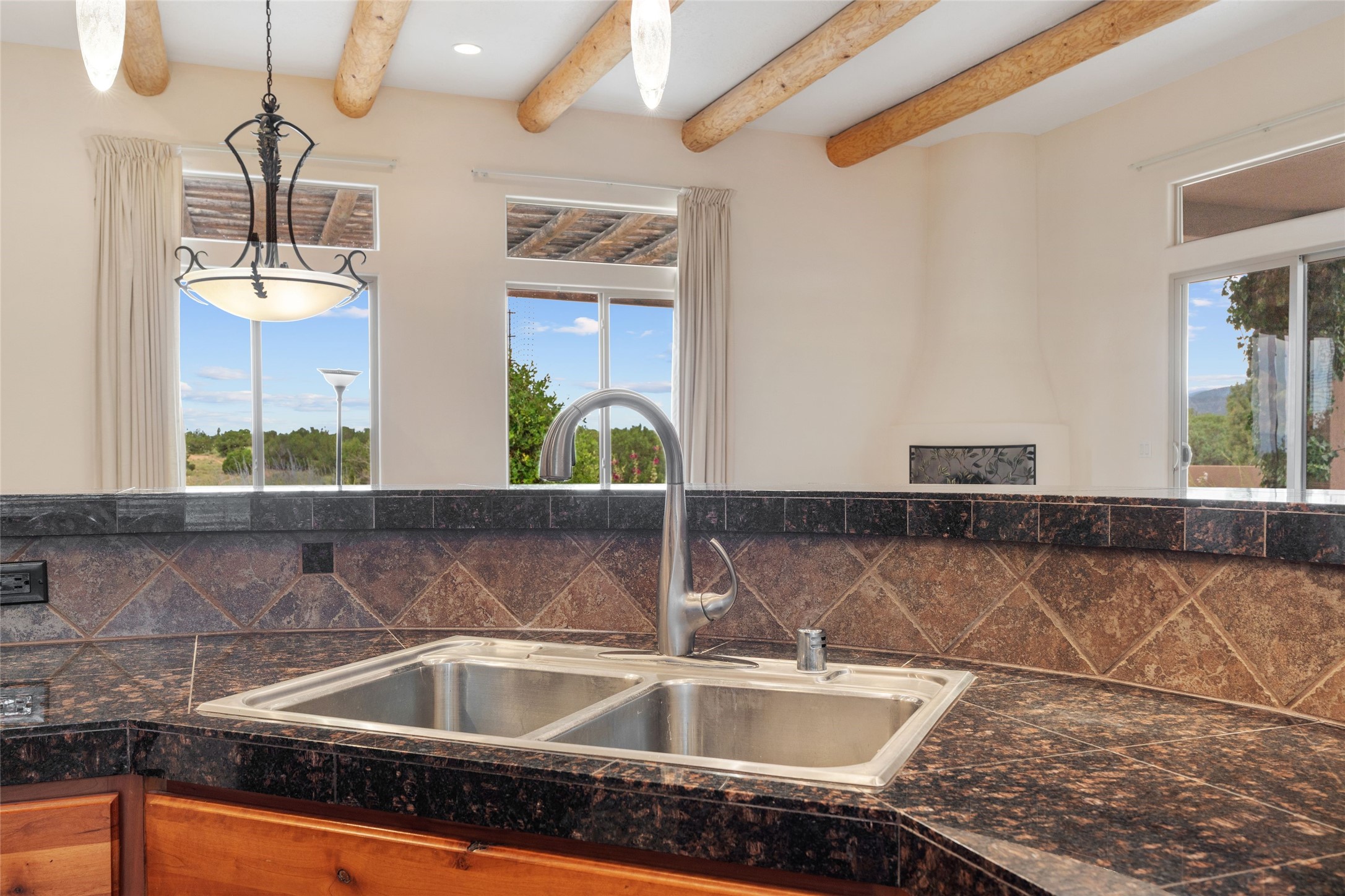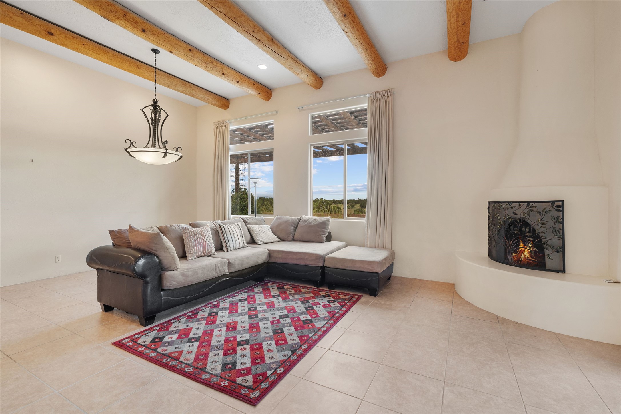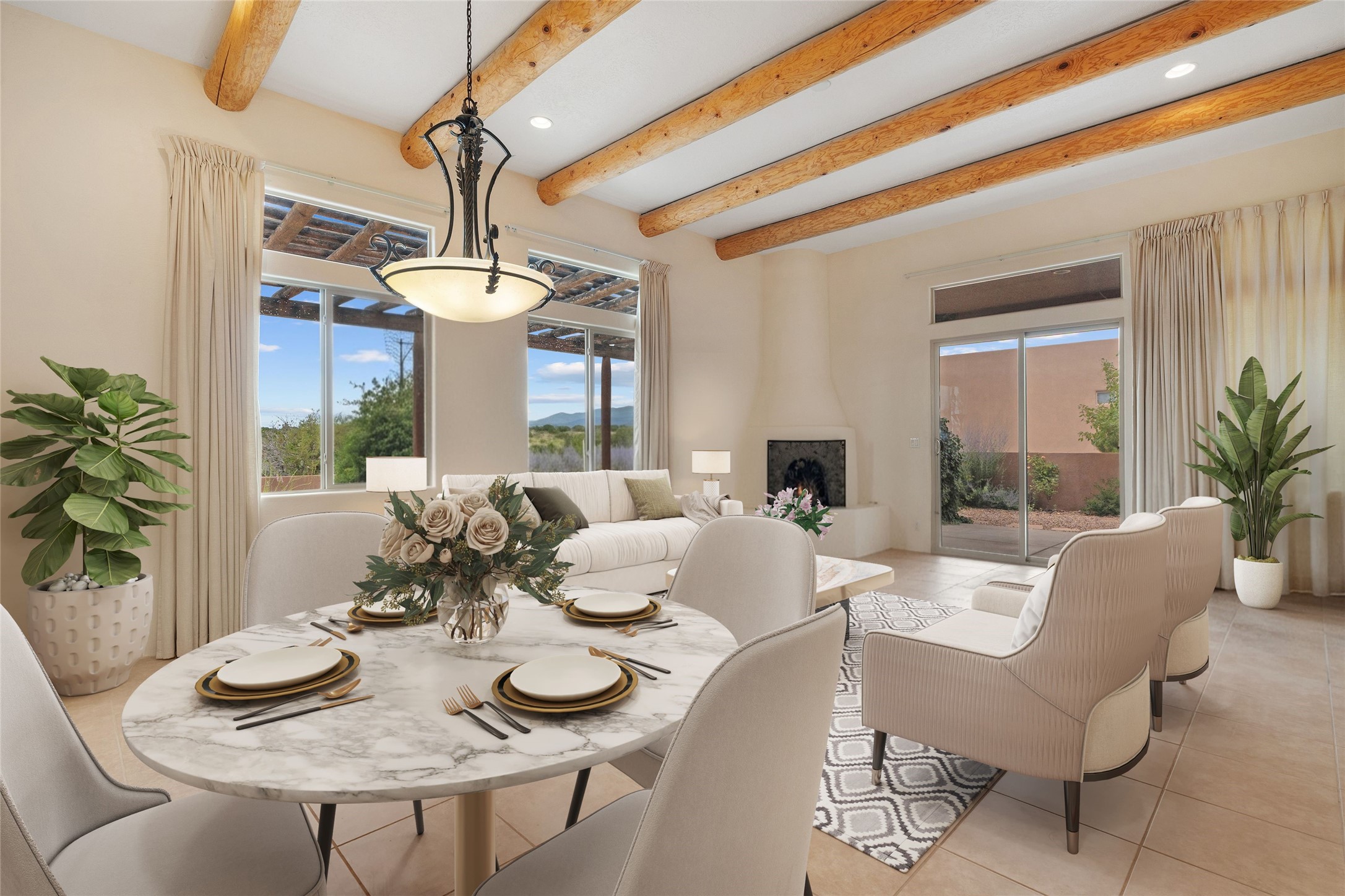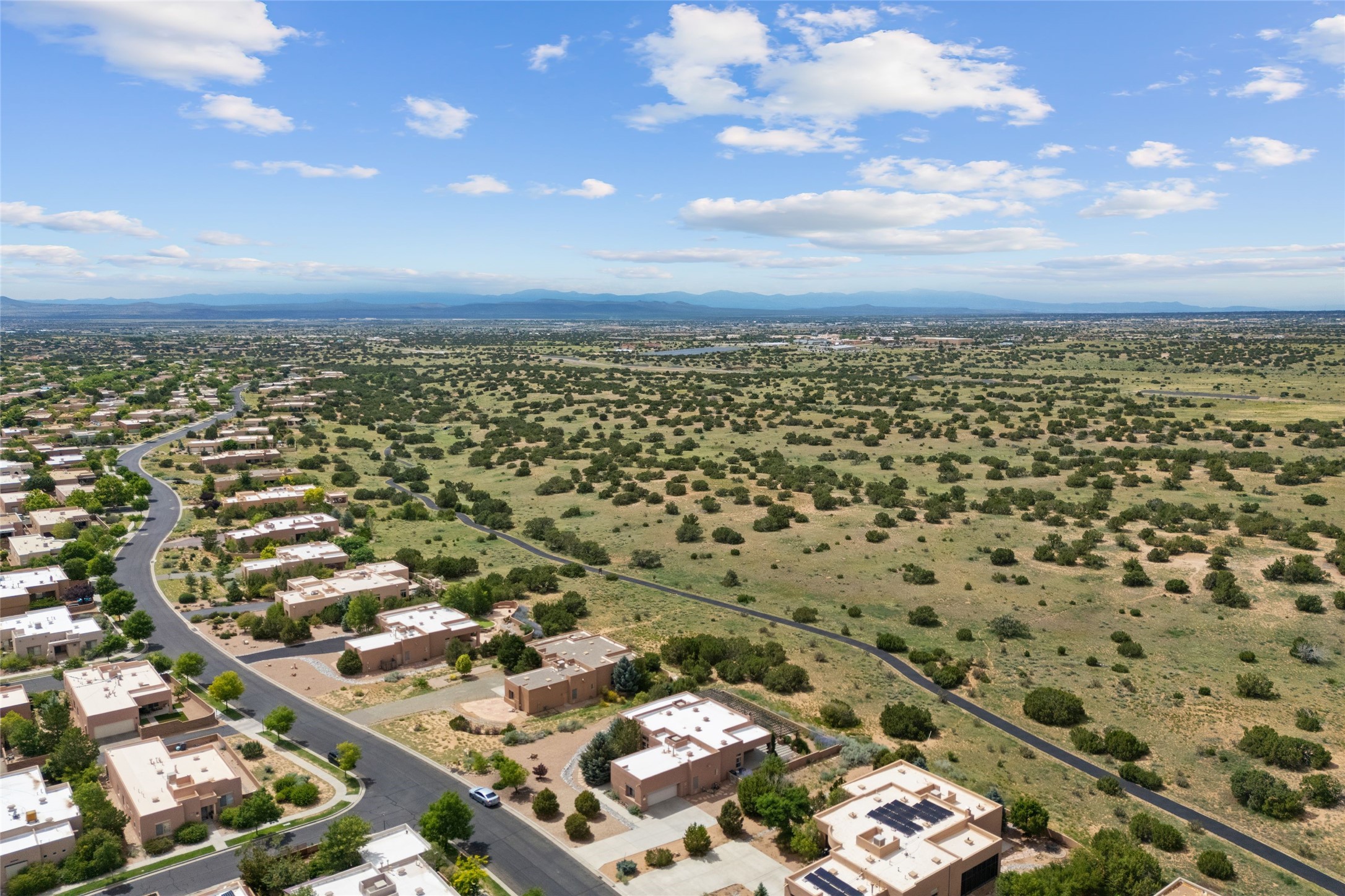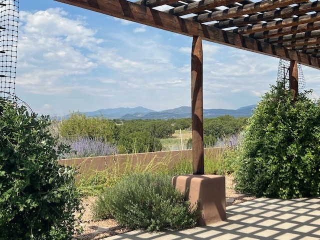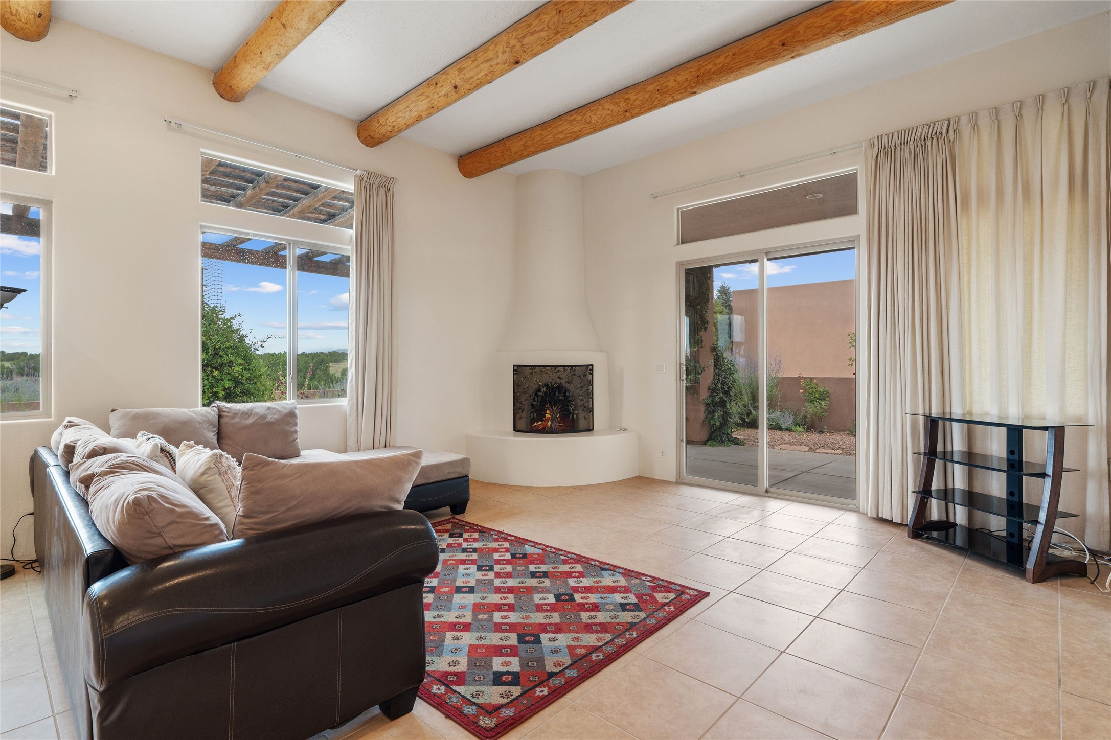 Excellent Opportunity! Sited on acre + conservation lot with expansive dedicated open space and unobstructed Sangre de Cristo and Jemez Mountain views. An immense ramada and solid covered portal embraces the great outdoors and view. Enjoy over 13 miles of private walking and biking trails steps from the back yard and Rancho Viejo's numerous open spaces, parks and playground areas. The spacious home features a large open kitchen, dining and living area floor plan with large view windows, patio/portal access, 12 ft ceilings with vigas, and a corner kiva fireplace with custom screen. The primary suite has total separation, boasts an oversize walk-in closet, a spacious bath with a big double vanity area, jetted tub, walk-in shower and private WC. The substantial 4th bedroom offers versatility with its own French doors entrance for private office, family room or your own desired application. The generous, attractive kitchen has an enviable, bright breakfast area and a nice roomy seating bar for family and guests' comfortable interaction with the cooks. The counter tops are granite tile, and the cabinets are Knotty Alder. The garage is oversize direct entry with extra storage/workshop space. The front yard features large, mature Spruce trees, attractive landscaping and hardscaping detail, irrigation system and water catchment. The backyard is enclosed with a pony wall and adorned with perennials. This special property has lots of custom features including all solid pine doors and an ornamental custom front screen door with security dead bolt. Pre-inspected, move-in ready.