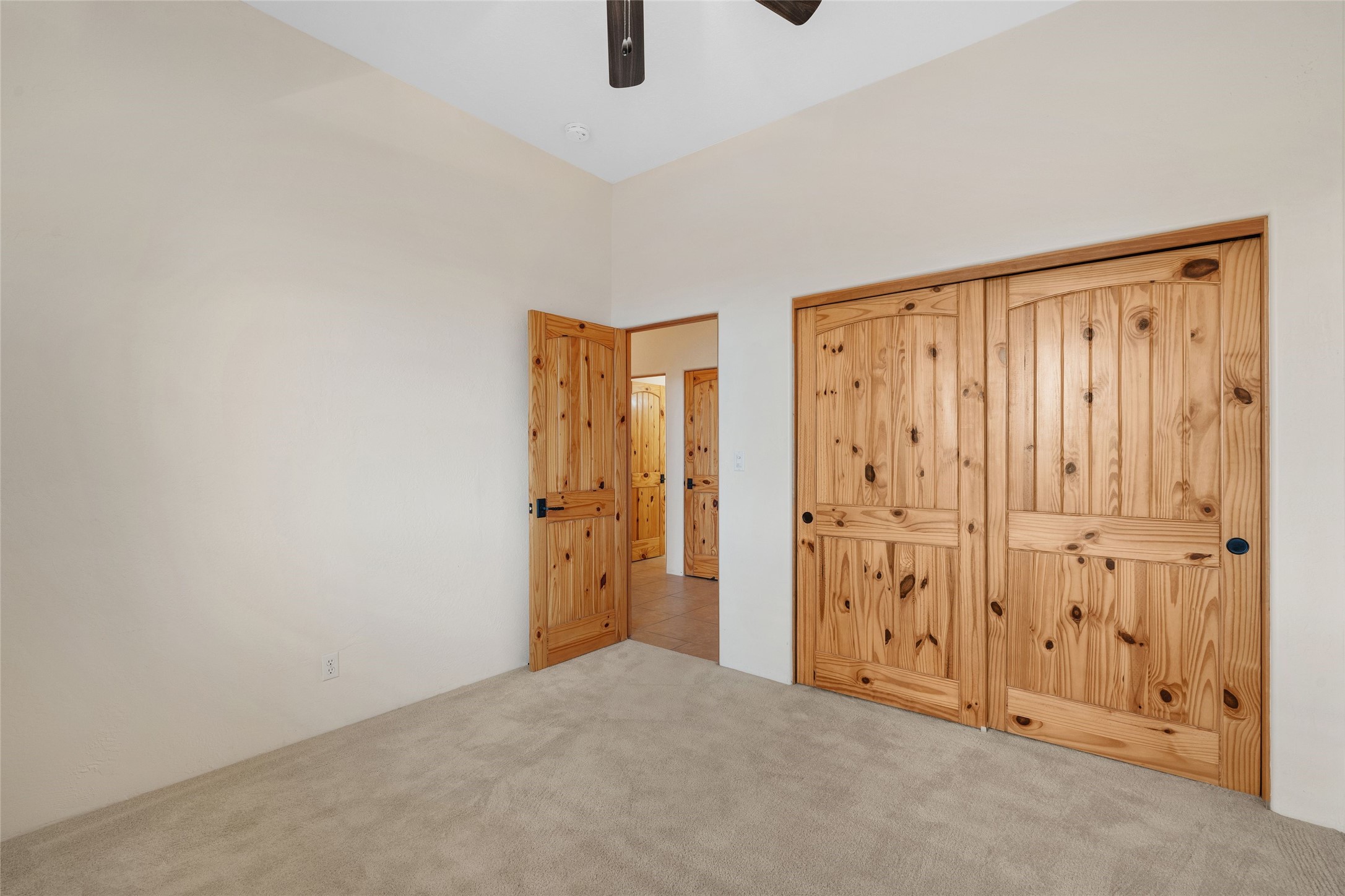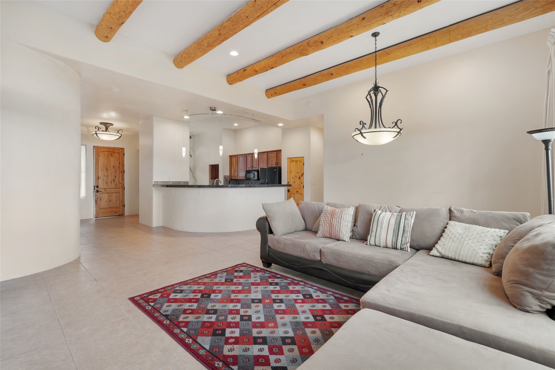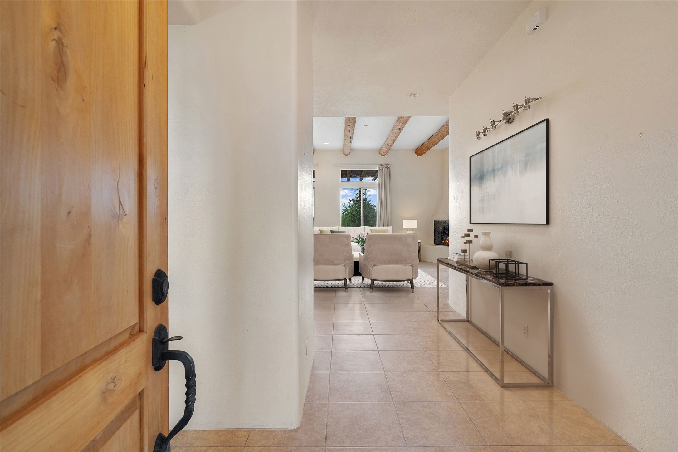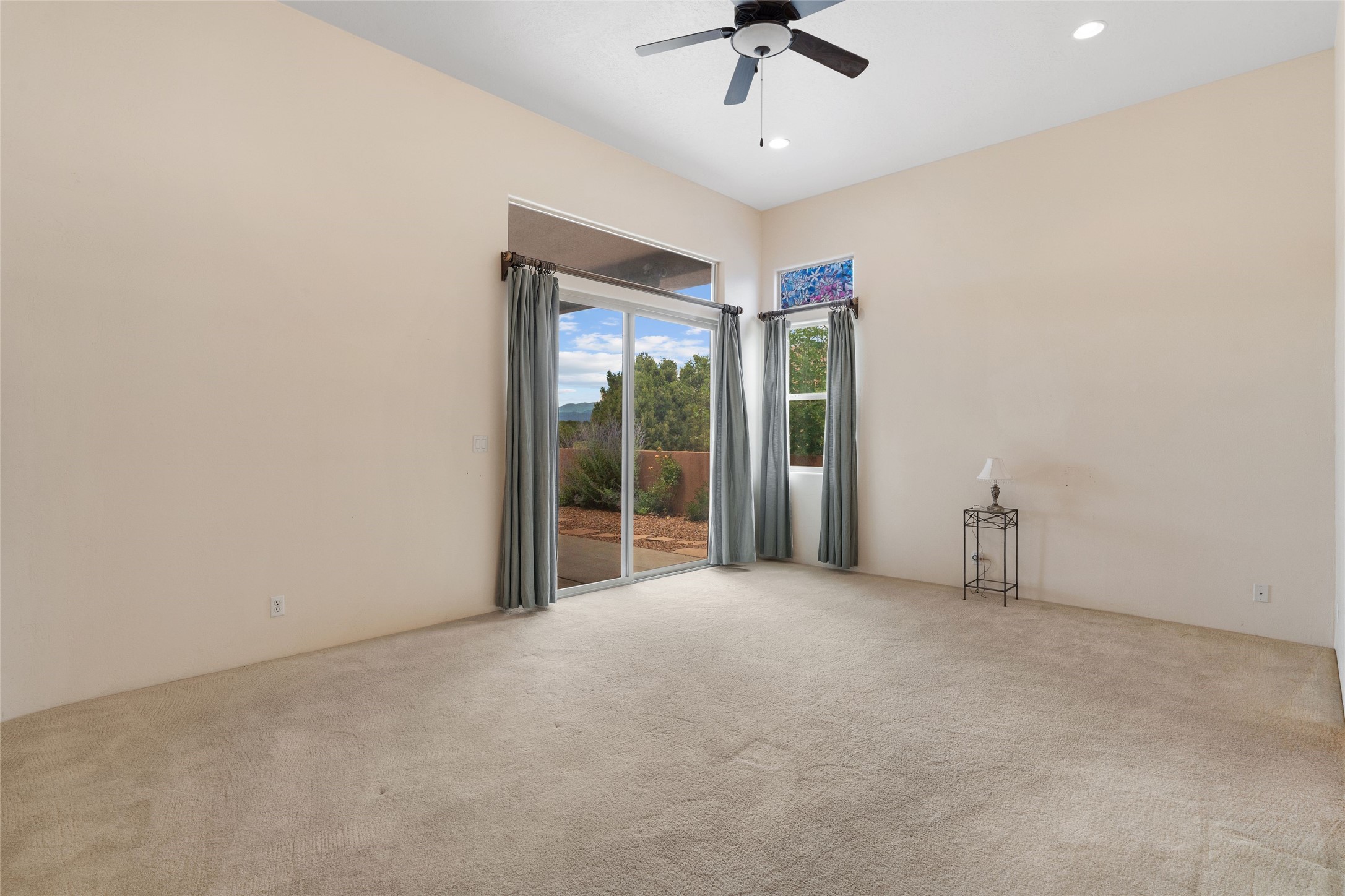 Excellent Opportunity! Sited on acre + conservation lot with expansive dedicated open space and unobstructed Sangre de Cristo and Jemez Mountain views. An immense ramada and solid covered portal embraces the great outdoors and view. Enjoy over 13 miles of private walking and biking trails steps from the back yard and Rancho Viejo's numerous open spaces, parks and playground areas. The spacious home features a large open kitchen, dining and living area floor plan with large view windows, patio/portal access, 12 ft ceilings with vigas, and a corner kiva fireplace with custom screen. The primary suite has total separation, boasts an oversize walk-in closet, a spacious bath with a big double vanity area, jetted tub, walk-in shower and private WC. The substantial 4th bedroom offers versatility with its own French doors entrance for private office, family room or your own desired application. The generous, attractive kitchen has an enviable, bright breakfast area and a nice roomy seating bar for family and guests' comfortable interaction with the cooks. The counter tops are granite tile, and the cabinets are Knotty Alder. The garage is oversize direct entry with extra storage/workshop space. The front yard features large, mature Spruce trees, attractive landscaping and hardscaping detail, irrigation system and water catchment. The backyard is enclosed with a pony wall and adorned with perennials. This special property has lots of custom features including all solid pine doors and an ornamental custom front screen door with security dead bolt. Pre-inspected, move-in ready.