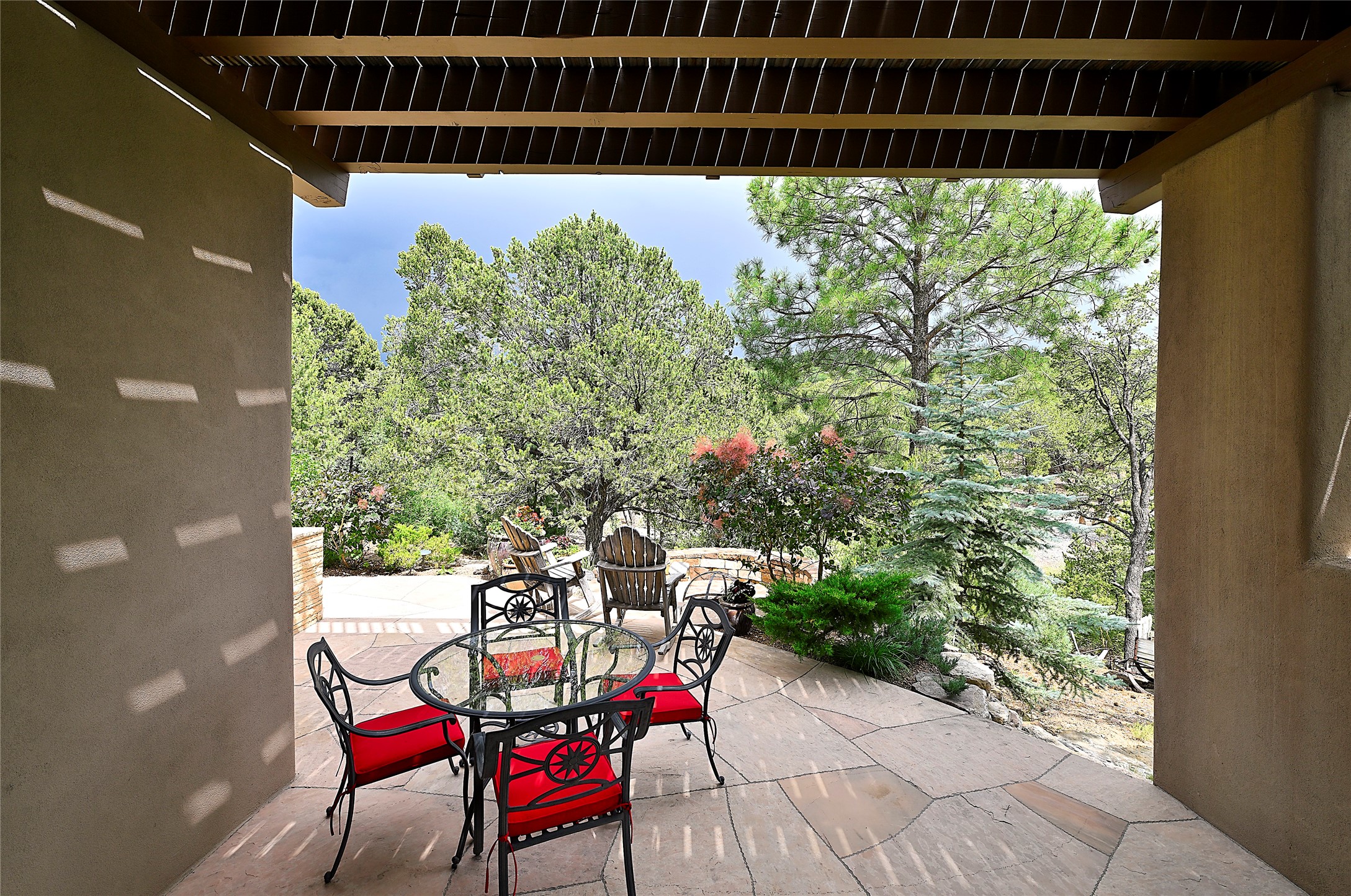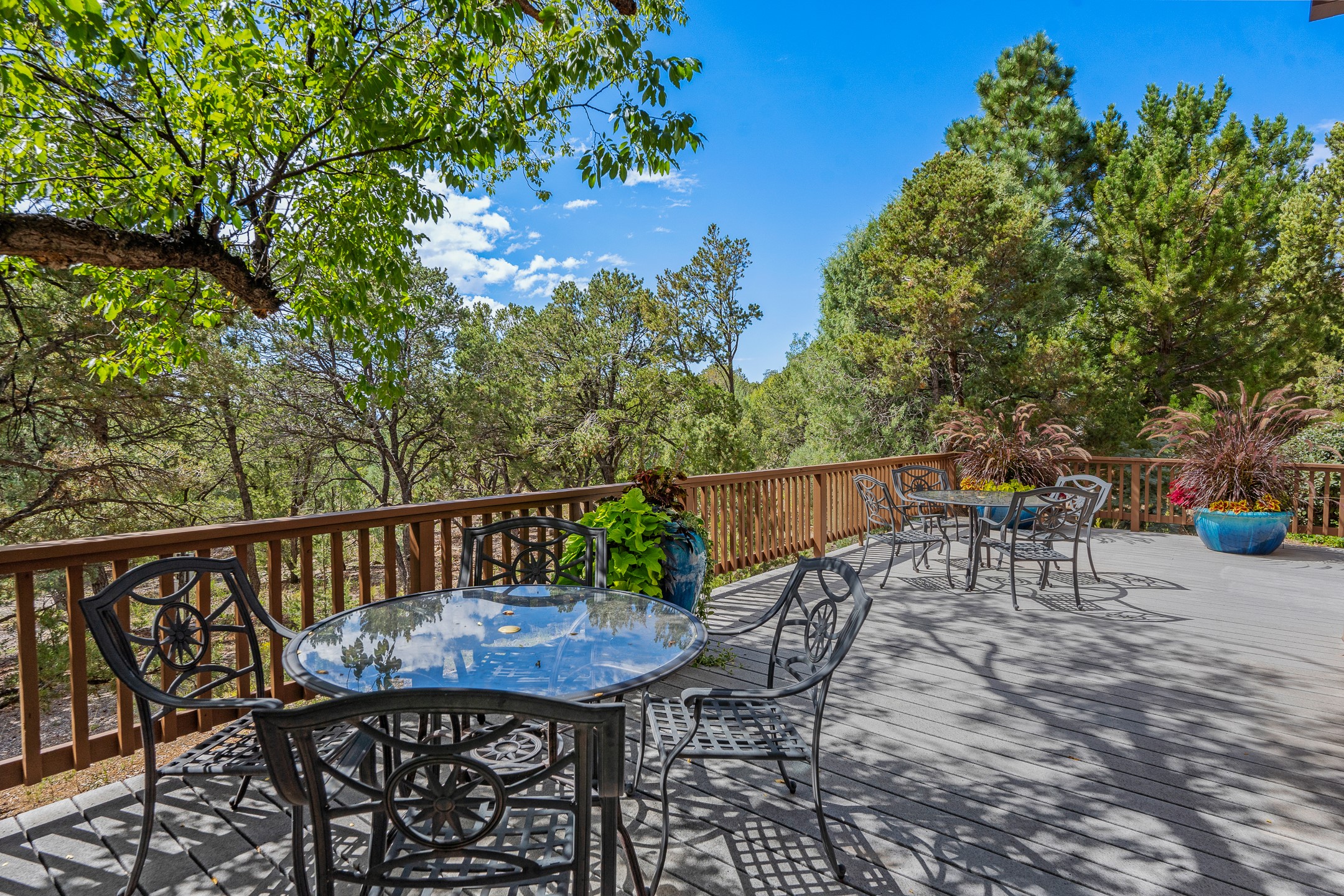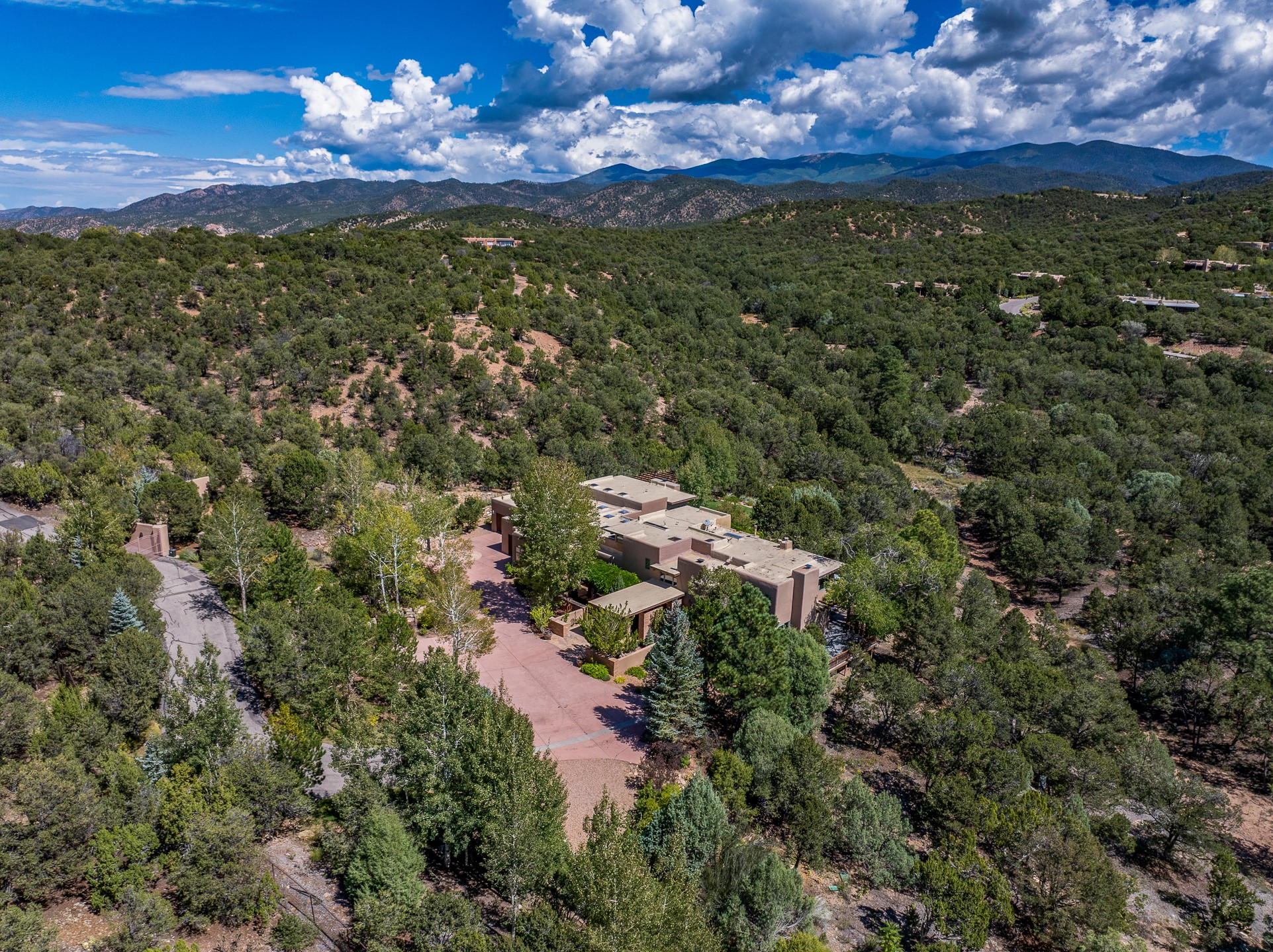 Perched on over 3 lush acres in one of Santa Fe's most coveted enclaves, this exceptional estate offers a rare synthesis of space, serenity, and natural beauty. It is less than 10 minutes from the plaza and the city's extensive mountain hiking trails are only a short walk away. Designed with both privacy and flexibility in mind, the residence unfolds across two thoughtfully connected wings, encompassing five bedrooms and a range of inviting communal and intimate spaces. It is ideally suited for multigenerational living, entertaining, or even a creative retreat.The main level is tailored for effortless single-level living, featuring expansive formal and informal gathering areas, two nicely equipped kitchens, three bedrooms (one of which is a grand suite with a private entrance), a game room and 2 car garage. A sauna and steamroom are situated in the guest bath on the main level. Seamless indoor-outdoor living is made possible through multiple portals, decks, and lawn spaces, framed by towering Aspens, Ponderosa Pines and Pinons, with manicured lawn and gardens, tranquil water features, and sweeping mountain views.Upstairs, two spacious en-suite bedrooms each open to their own private view decks, offering peaceful havens for rest, reading, or quiet contemplation. The home is connected to city utilities, has central air conditioning and heat and has been meticulously maintained, ensuring comfort, durability, and modern ease.Properties of this caliber, combining architectural versatility, natural grace, and premier location, are seldom available. Additional contiguous parcels totaling over 11 acres with commanding hilltop views may be acquired separately, offering a rare opportunity to expand and create an even more secluded private compound.