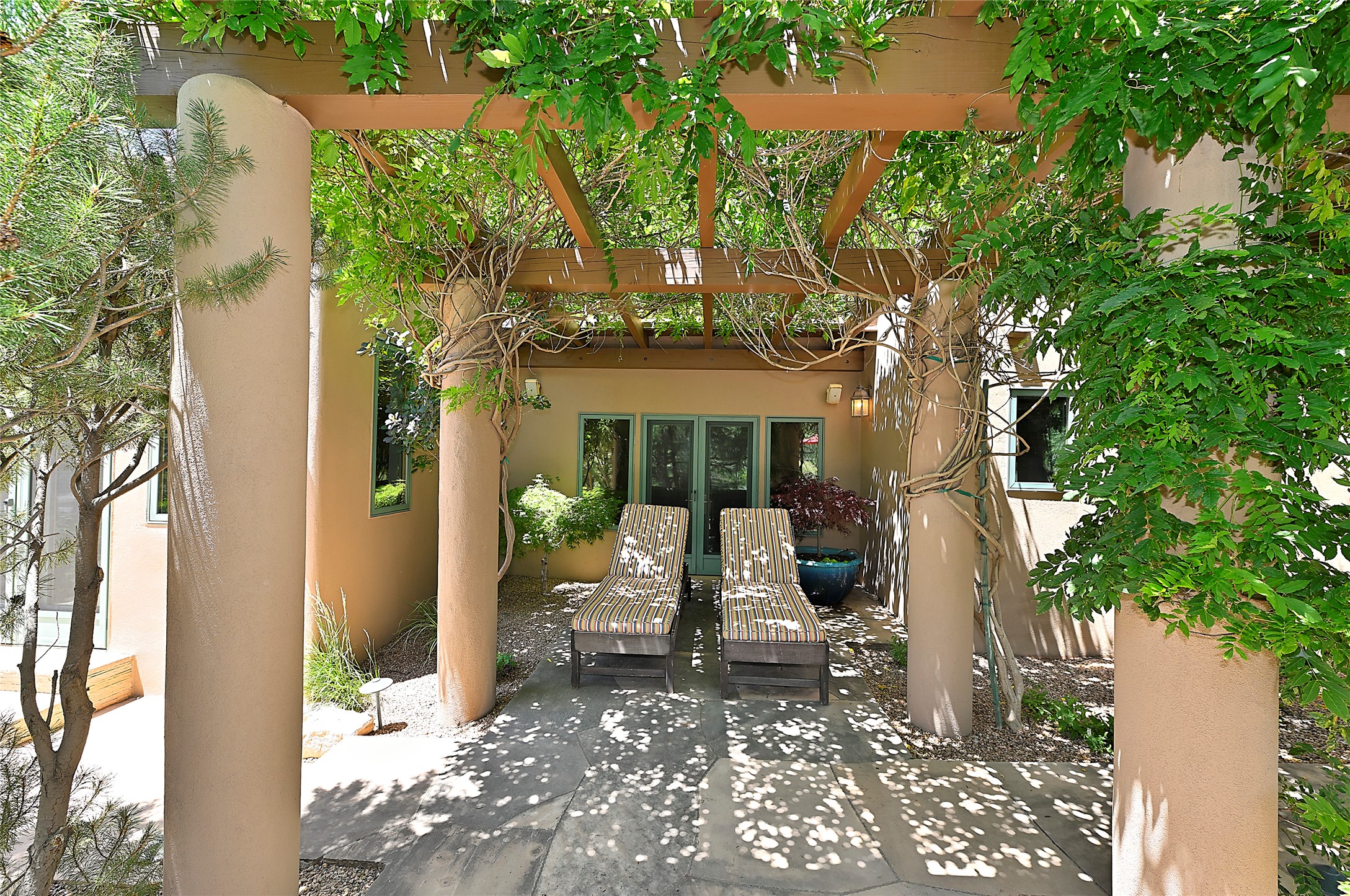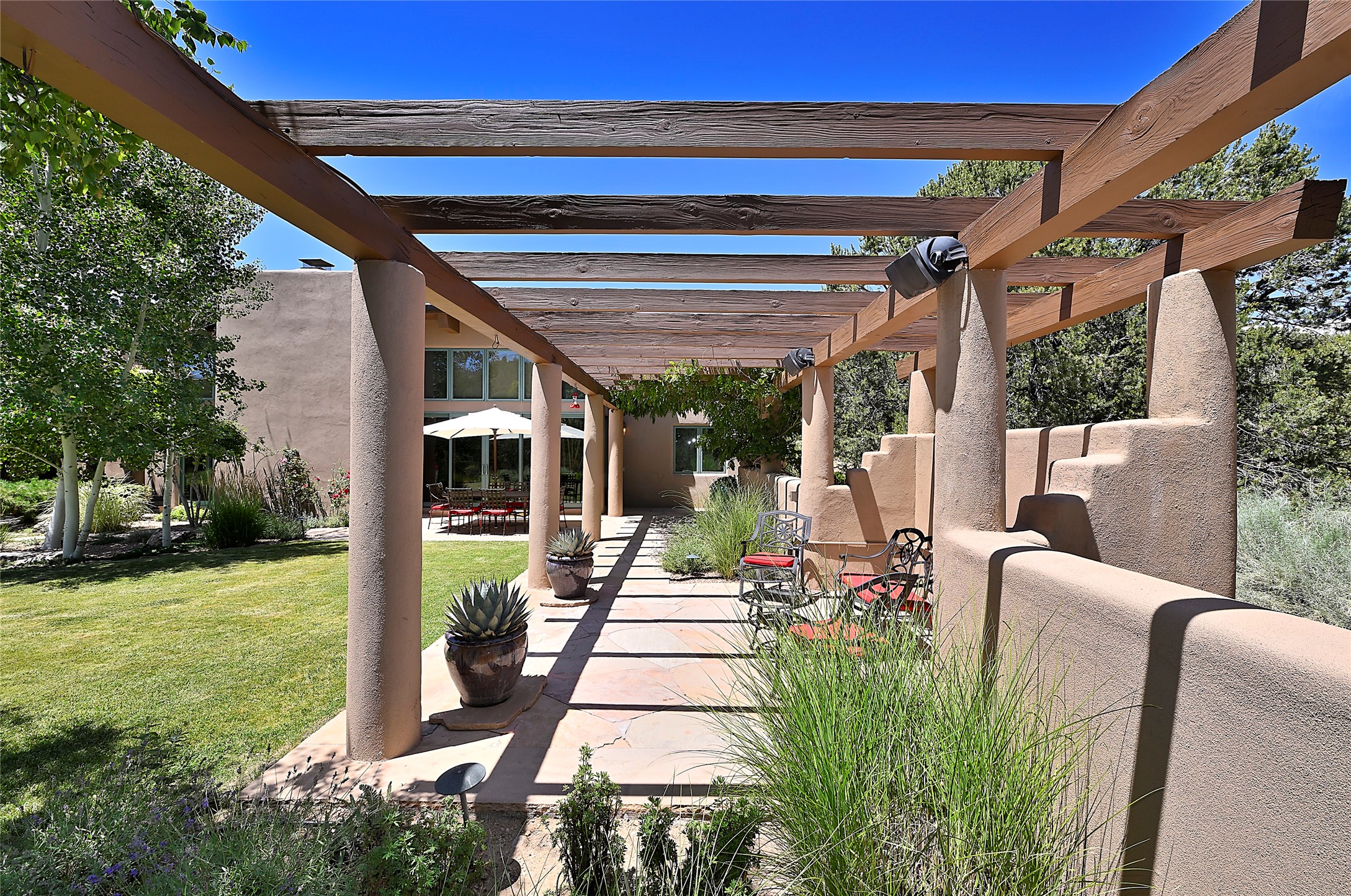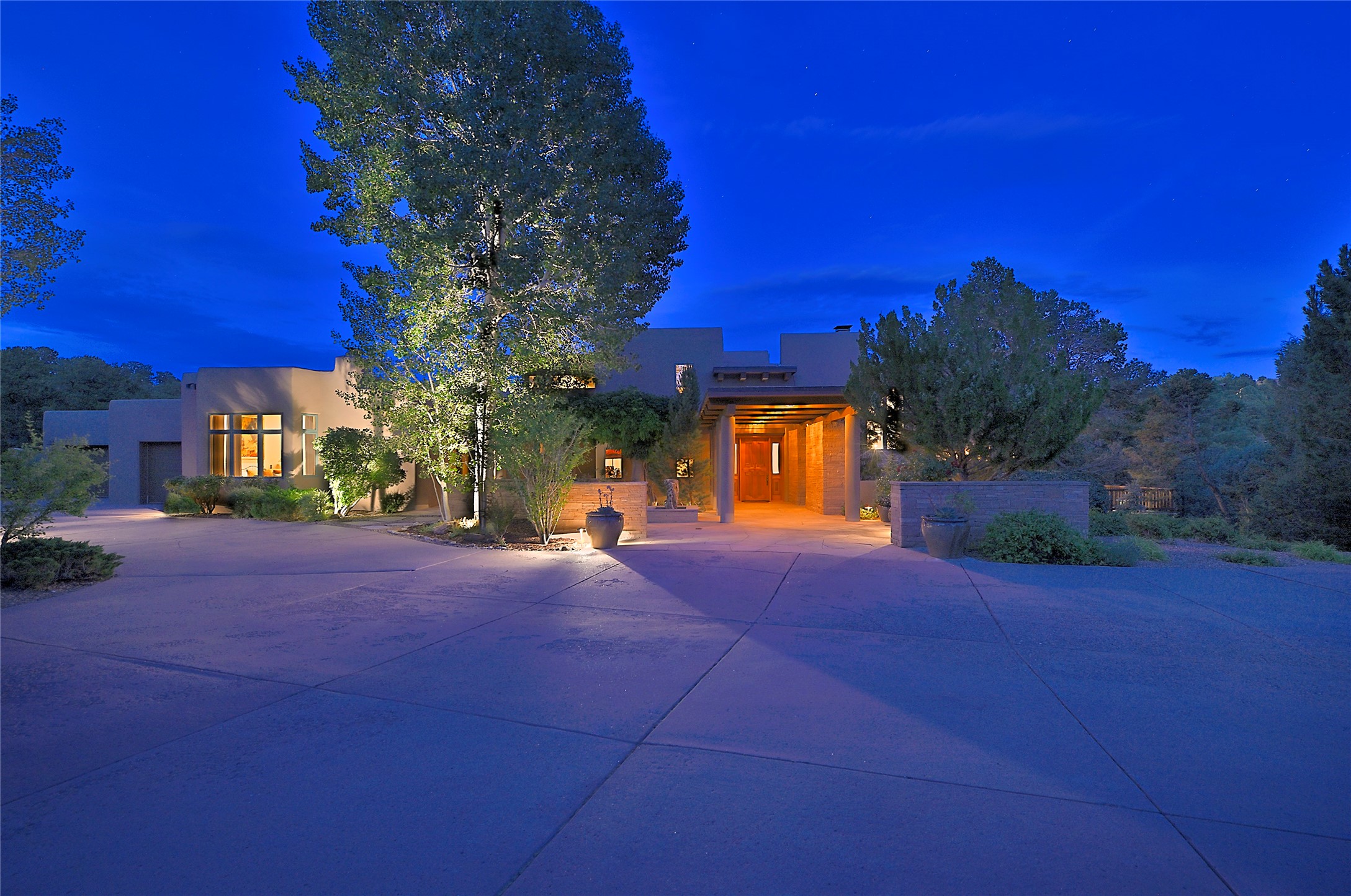 Perched on over 3 lush acres in one of Santa Fe's most coveted enclaves, this exceptional estate offers a rare synthesis of space, serenity, and natural beauty. It is less than 10 minutes from the plaza and the city's extensive mountain hiking trails are only a short walk away. Designed with both privacy and flexibility in mind, the residence unfolds across two thoughtfully connected wings, encompassing five bedrooms and a range of inviting communal and intimate spaces. It is ideally suited for multigenerational living, entertaining, or even a creative retreat.The main level is tailored for effortless single-level living, featuring expansive formal and informal gathering areas, two nicely equipped kitchens, three bedrooms (one of which is a grand suite with a private entrance), a game room and 2 car garage. A sauna and steamroom are situated in the guest bath on the main level. Seamless indoor-outdoor living is made possible through multiple portals, decks, and lawn spaces, framed by towering Aspens, Ponderosa Pines and Pinons, with manicured lawn and gardens, tranquil water features, and sweeping mountain views.Upstairs, two spacious en-suite bedrooms each open to their own private view decks, offering peaceful havens for rest, reading, or quiet contemplation. The home is connected to city utilities, has central air conditioning and heat and has been meticulously maintained, ensuring comfort, durability, and modern ease.Properties of this caliber, combining architectural versatility, natural grace, and premier location, are seldom available. Additional contiguous parcels totaling over 11 acres with commanding hilltop views may be acquired separately, offering a rare opportunity to expand and create an even more secluded private compound.