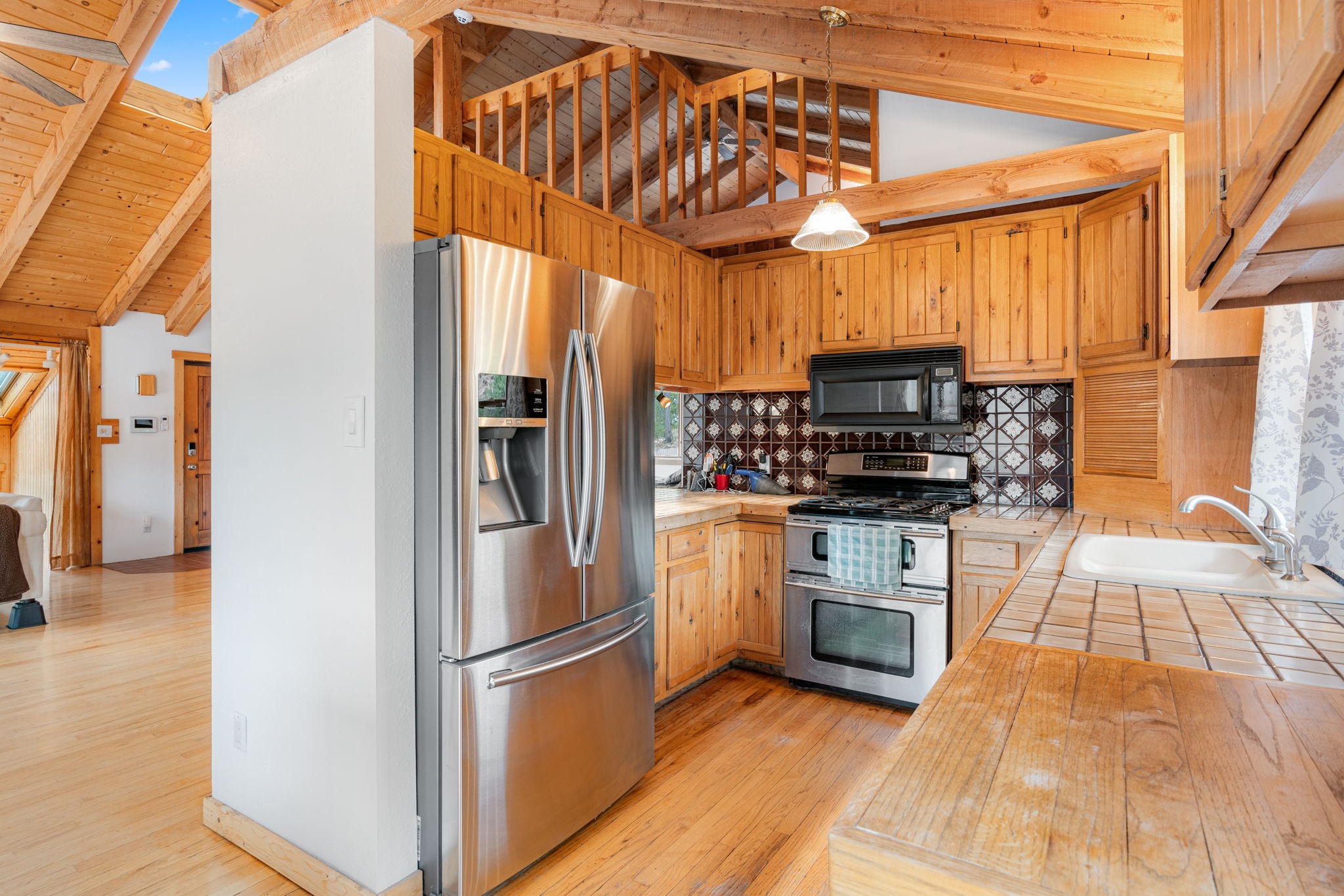 Breathtaking setting for this home in Jemez Springs perched among soaring mountain views. This spacious home has soaring beamed ceilings, wood floors, light-filled rooms, & loft with ample storage. Open floor plan with inviting living & dining area that expands to sunroom. Ideal for cozy reading rm, yoga/meditation or artist studio. Wood stove & mini splits making it comfortable all year long. Newer appliances in the kitchen. Access to expansive deck to enjoy mountain views and cool breezes. Lower level includes 2 flex spaces, a laundry room & full bathroom. Entry to an oversized one car garage. Could be used for a workshop. Property has a detached shed & covered carport, room for 2 vehicles. Home is on a very private lot at the end of cul-de-sac. Easy commute to LANL, Albuquerque, Fenton Lake. Buyer to confirm square footage.