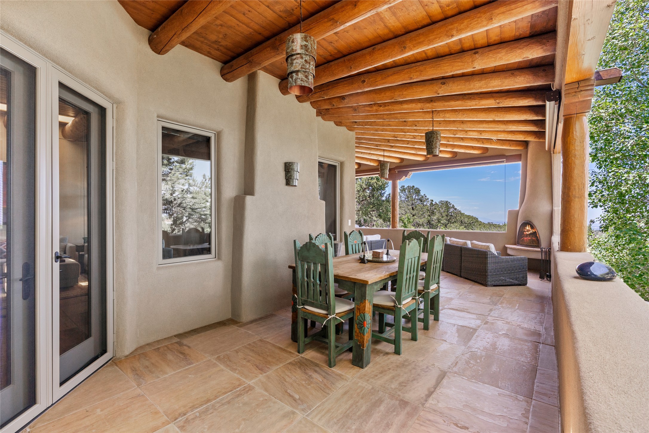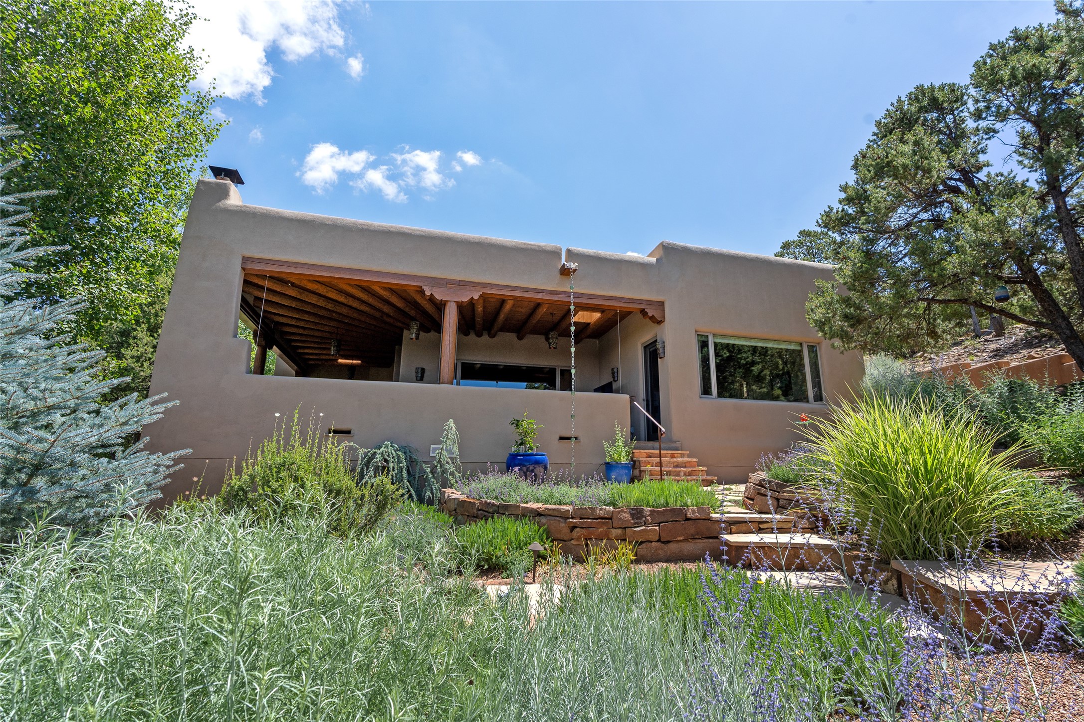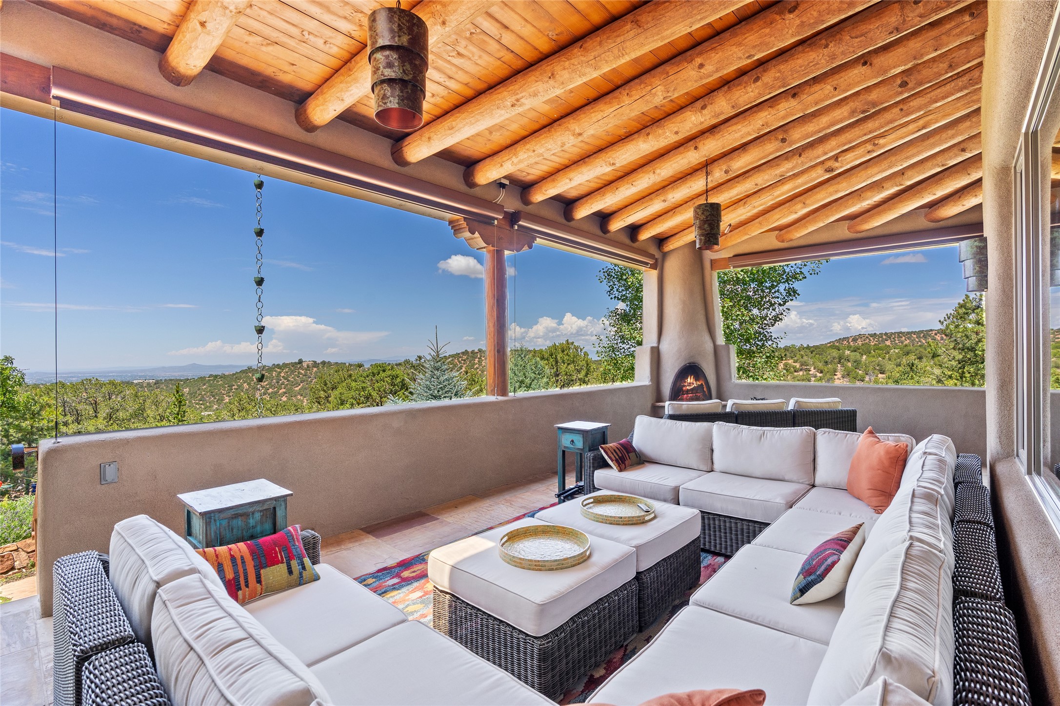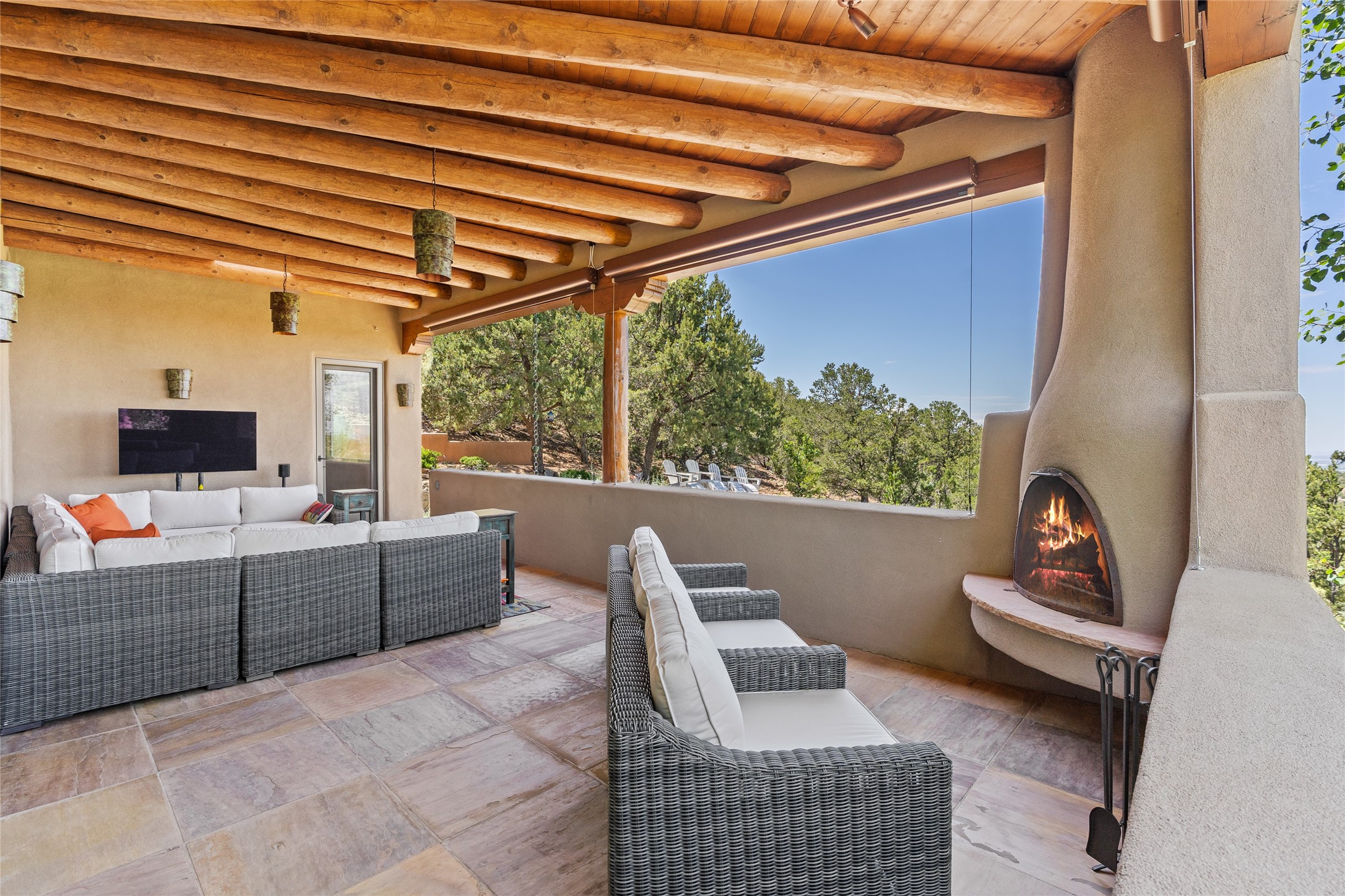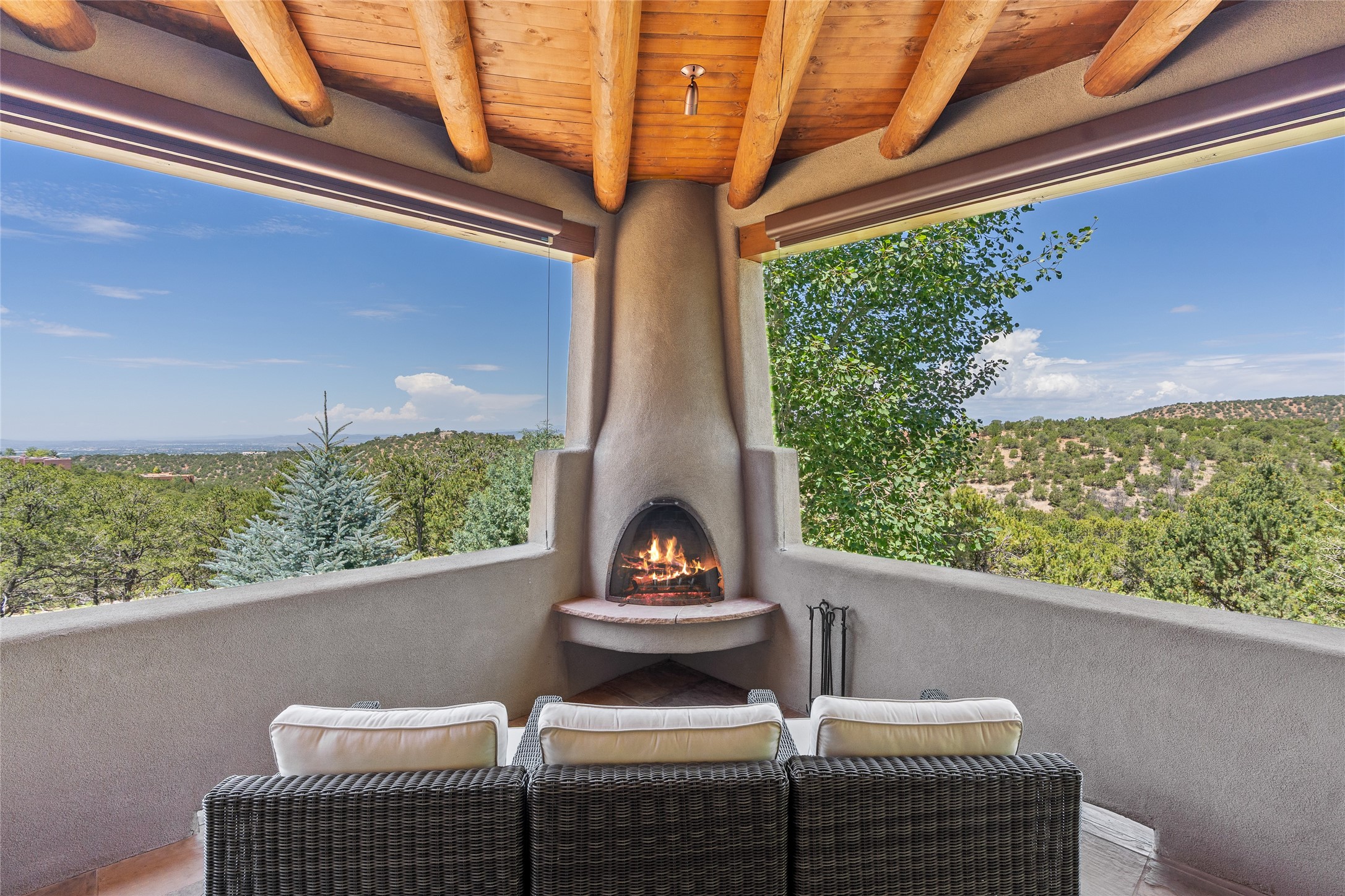 Located in the gated community of High Summit, eight minutes from the Santa Fe Plaza, this exquisite 3 bedroom, 2 bath Pueblo style home built in 2009 seamlessly blends traditional Southwestern elegance with modern luxury. Carved wooden doors, smooth plaster walls, and stone flooring envelope the home in warmth and timeless craftsmanship. Three gas equipped indoor fireplaces--including one in the generous primary suite--add cozy ambience and convenience. Huge picture windows bathe interiors in light and frame beautiful views of the Jemez Mountains, with sunset vistas that transform evening conversation into art. The gourmet kitchen is outfitted with Sub Zero refrigeration, a six burner Wolf range, ample prep surfaces and storage. The primary bedroom suite, tucked away for privacy, features its own fireplace, a panoramic picture window, and a spa like bath with soaking tub, steam shower, gas fireplace and walk in closet. Stepping outdoors, you'll find a 650sq.ft. wrap around portal with kiva fireplace separating the living and dining areas, all framed by stunning mountain views and equipped with remote controlled electronic shades for comfort at every hour. Professionally landscaped and an easy stroll from your backyard to the Dale Ball Trails system, a nearly 25 mile network trails that connect directly to the Santa Fe National Forest--truly your backyard playground, with countless miles of nature, skiing at the Santa Fe Ski Basin just minutes away, and the healing hot tubs of Ten Thousand Waves practically at your doorstep. With a brick laid driveway, 2 car garage, and a "lock and leave" lifestyle that is ideal for both full time living or your perfect get-a-way vacation home. In floor radiant heat, central cooling, city utilities--water, sewer, natural gas, underground electricity, and full natural gas powered home generator for backup.