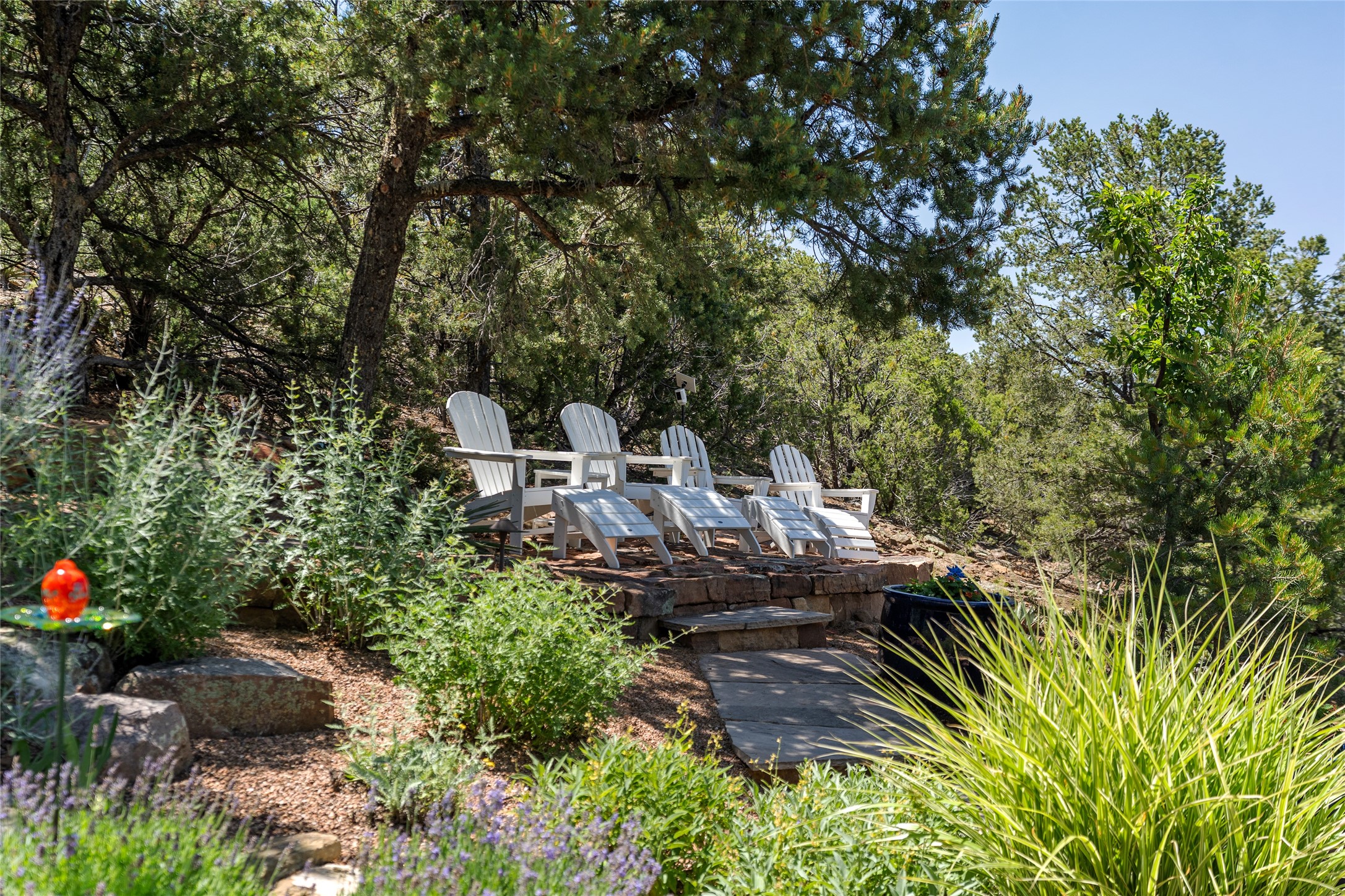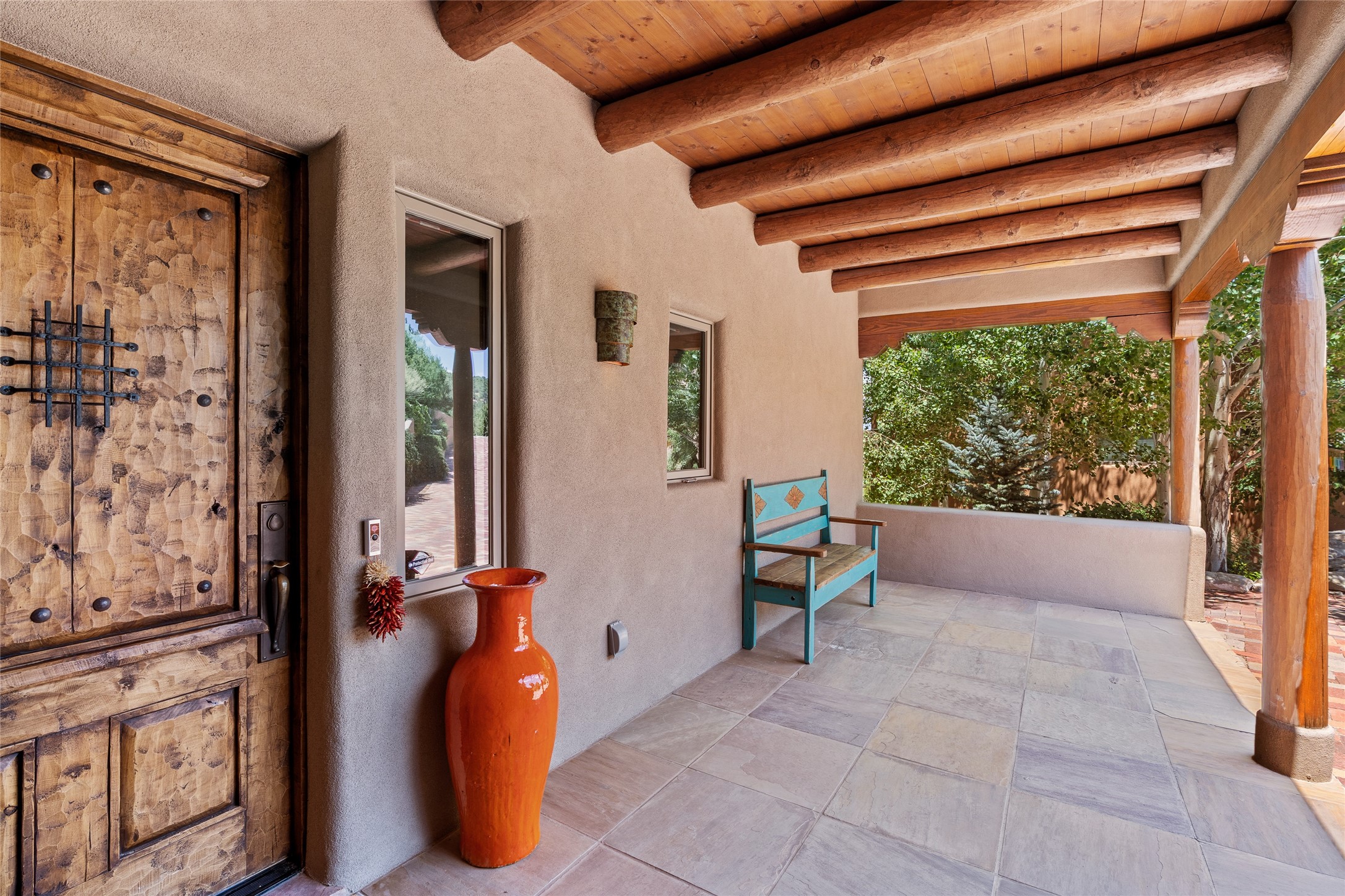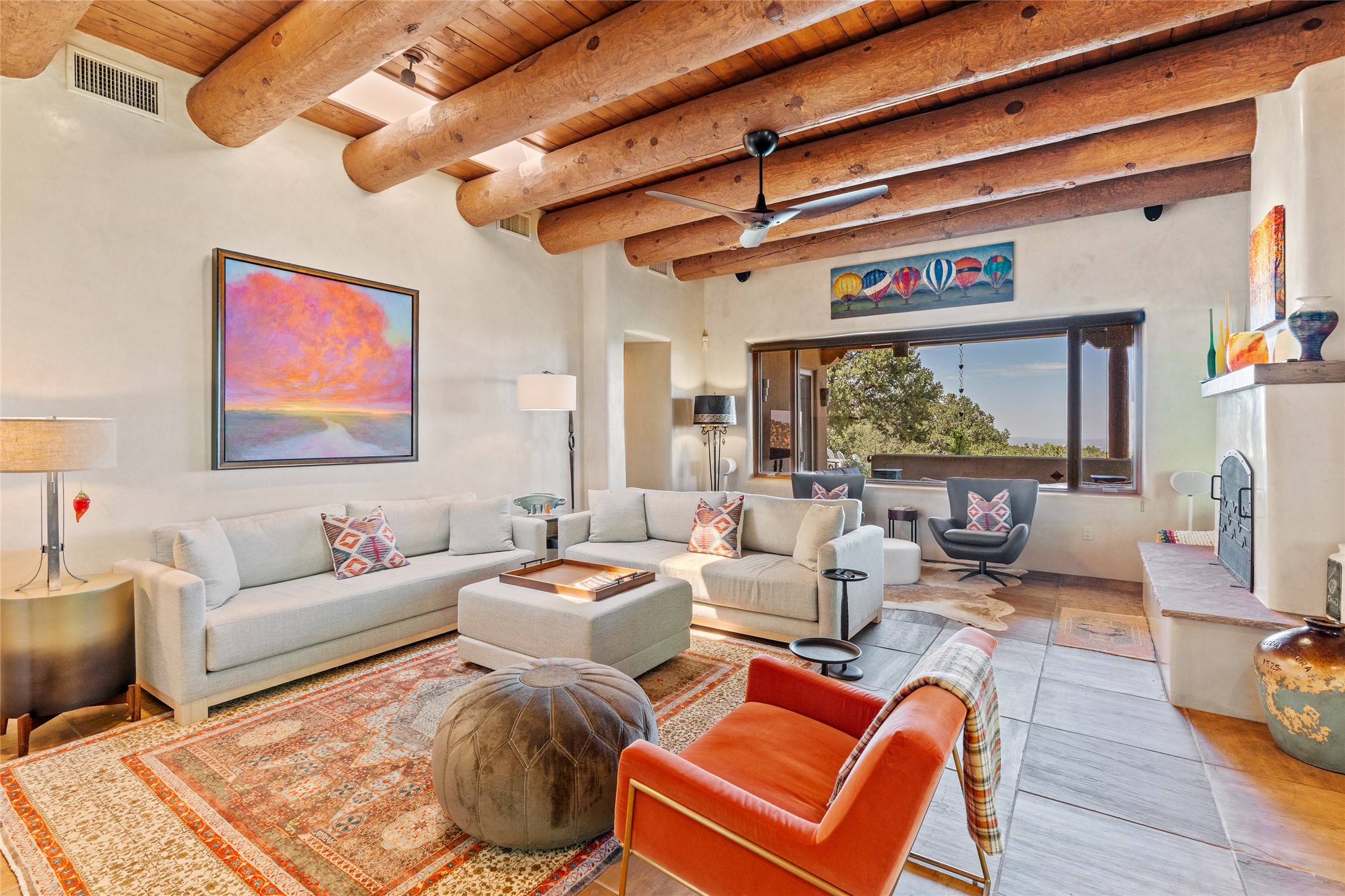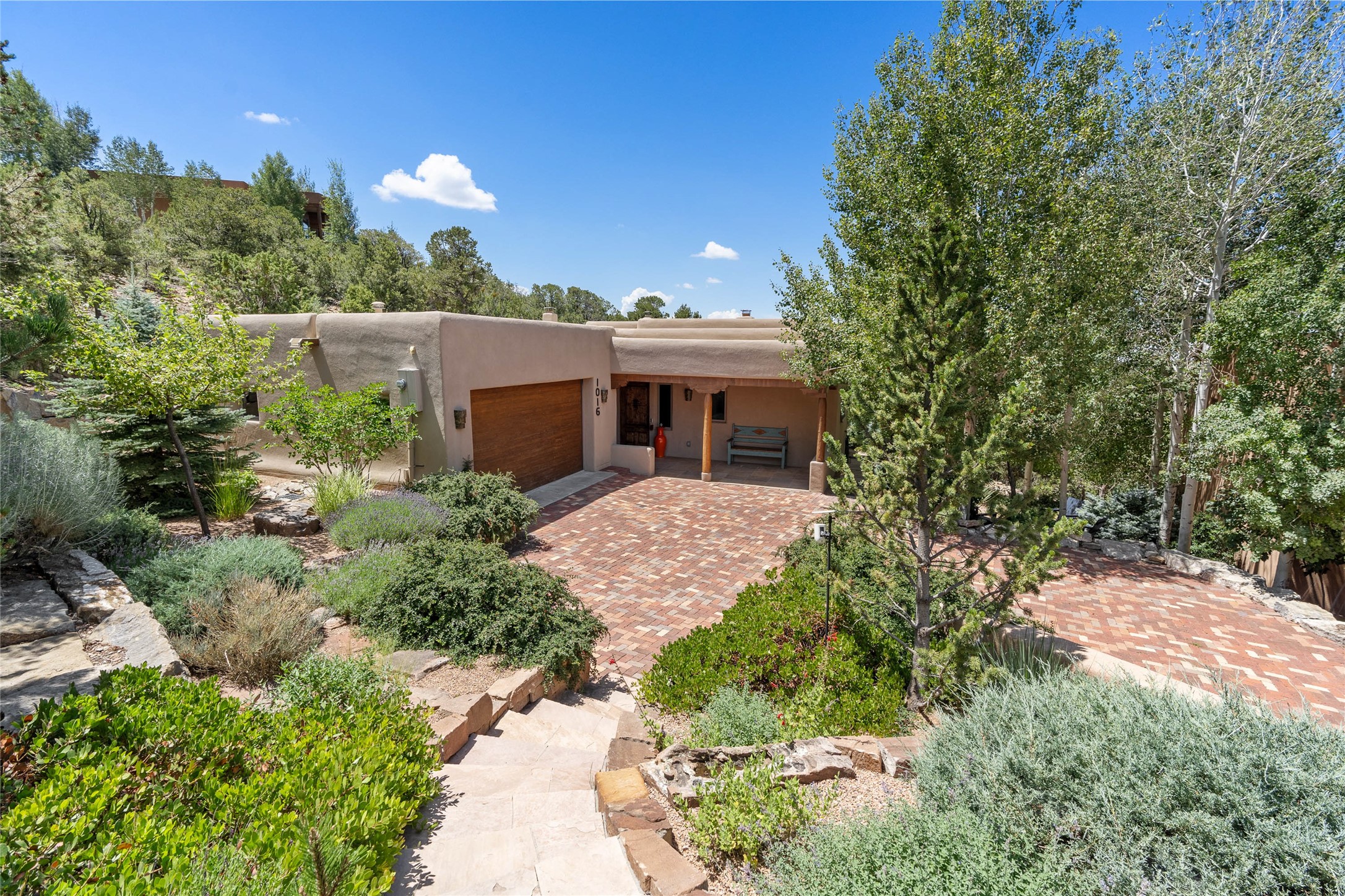 Located in the gated community of High Summit, eight minutes from the Santa Fe Plaza, this exquisite 3 bedroom, 2 bath Pueblo style home built in 2009 seamlessly blends traditional Southwestern elegance with modern luxury. Carved wooden doors, smooth plaster walls, and stone flooring envelope the home in warmth and timeless craftsmanship. Three gas equipped indoor fireplaces--including one in the generous primary suite--add cozy ambience and convenience. Huge picture windows bathe interiors in light and frame beautiful views of the Jemez Mountains, with sunset vistas that transform evening conversation into art. The gourmet kitchen is outfitted with Sub Zero refrigeration, a six burner Wolf range, ample prep surfaces and storage. The primary bedroom suite, tucked away for privacy, features its own fireplace, a panoramic picture window, and a spa like bath with soaking tub, steam shower, gas fireplace and walk in closet. Stepping outdoors, you'll find a 650sq.ft. wrap around portal with kiva fireplace separating the living and dining areas, all framed by stunning mountain views and equipped with remote controlled electronic shades for comfort at every hour. Professionally landscaped and an easy stroll from your backyard to the Dale Ball Trails system, a nearly 25 mile network trails that connect directly to the Santa Fe National Forest--truly your backyard playground, with countless miles of nature, skiing at the Santa Fe Ski Basin just minutes away, and the healing hot tubs of Ten Thousand Waves practically at your doorstep. With a brick laid driveway, 2 car garage, and a "lock and leave" lifestyle that is ideal for both full time living or your perfect get-a-way vacation home. In floor radiant heat, central cooling, city utilities--water, sewer, natural gas, underground electricity, and full natural gas powered home generator for backup.