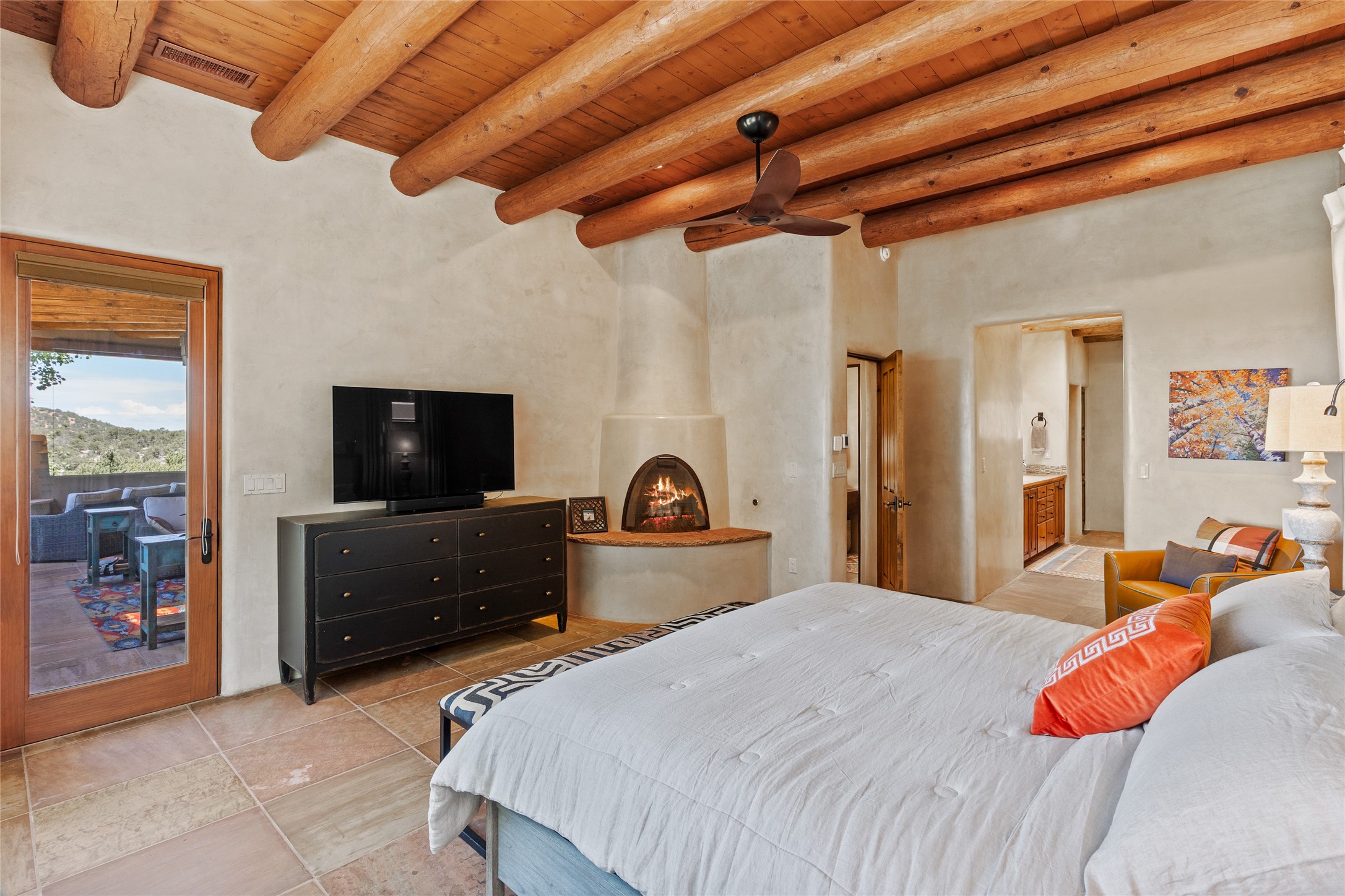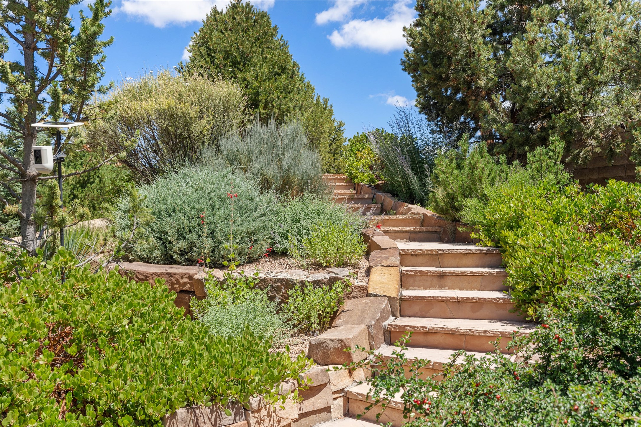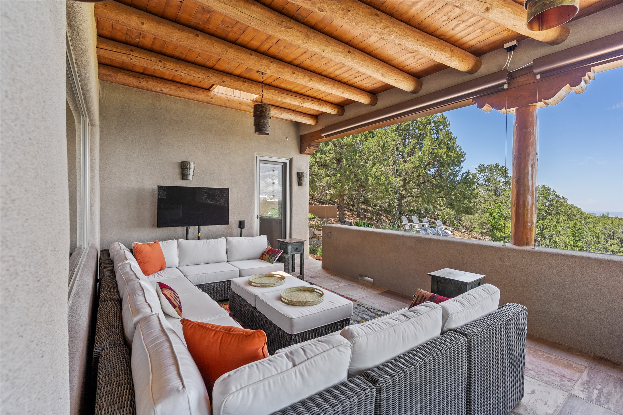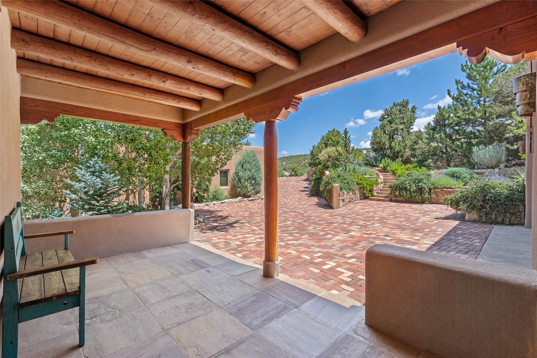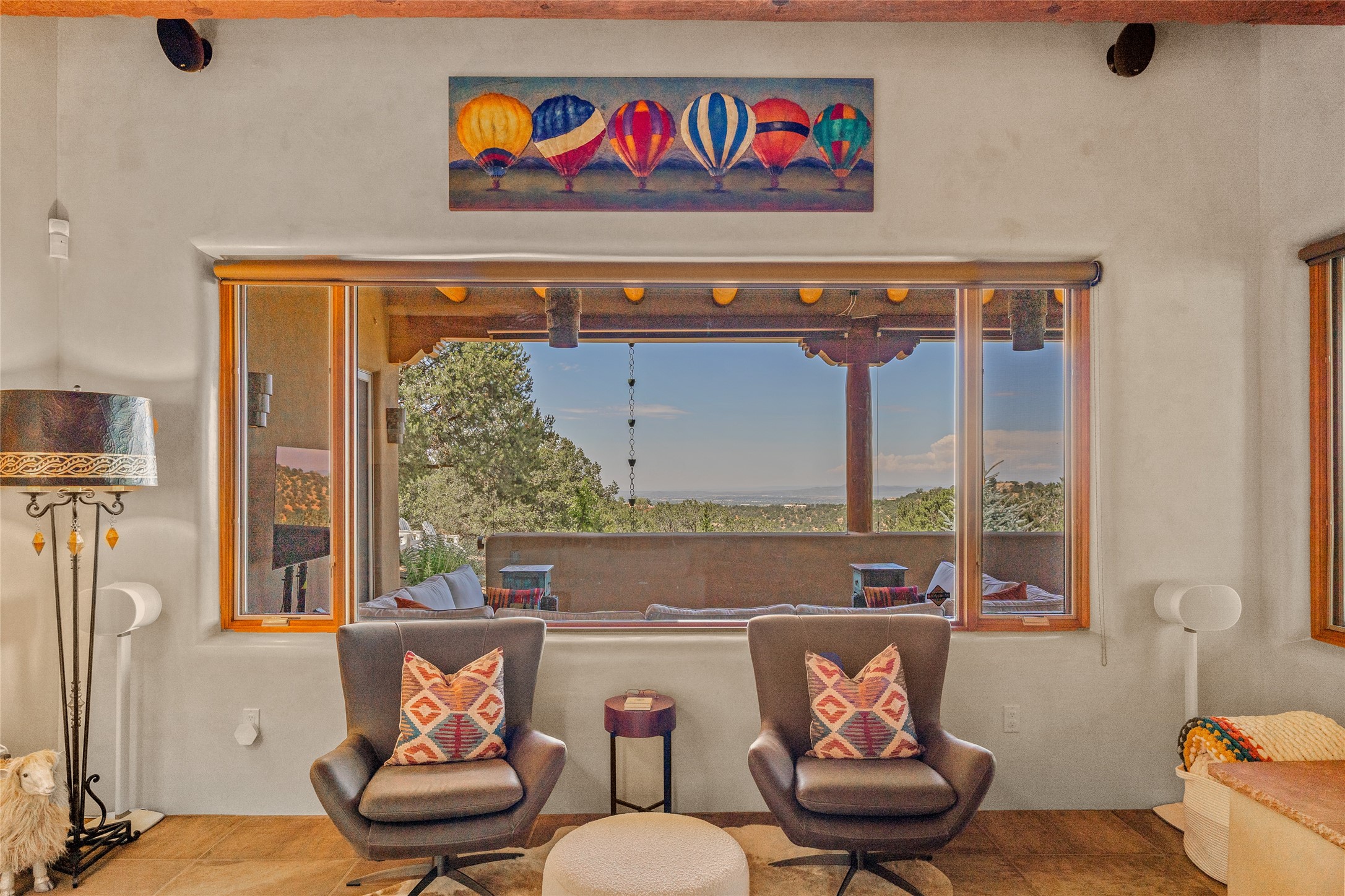 Located in the gated community of High Summit, eight minutes from the Santa Fe Plaza, this exquisite 3 bedroom, 2 bath Pueblo style home built in 2009 seamlessly blends traditional Southwestern elegance with modern luxury. Carved wooden doors, smooth plaster walls, and stone flooring envelope the home in warmth and timeless craftsmanship. Three gas equipped indoor fireplaces--including one in the generous primary suite--add cozy ambience and convenience. Huge picture windows bathe interiors in light and frame beautiful views of the Jemez Mountains, with sunset vistas that transform evening conversation into art. The gourmet kitchen is outfitted with Sub Zero refrigeration, a six burner Wolf range, ample prep surfaces and storage. The primary bedroom suite, tucked away for privacy, features its own fireplace, a panoramic picture window, and a spa like bath with soaking tub, steam shower, gas fireplace and walk in closet. Stepping outdoors, you'll find a 650sq.ft. wrap around portal with kiva fireplace separating the living and dining areas, all framed by stunning mountain views and equipped with remote controlled electronic shades for comfort at every hour. Professionally landscaped and an easy stroll from your backyard to the Dale Ball Trails system, a nearly 25 mile network trails that connect directly to the Santa Fe National Forest--truly your backyard playground, with countless miles of nature, skiing at the Santa Fe Ski Basin just minutes away, and the healing hot tubs of Ten Thousand Waves practically at your doorstep. With a brick laid driveway, 2 car garage, and a "lock and leave" lifestyle that is ideal for both full time living or your perfect get-a-way vacation home. In floor radiant heat, central cooling, city utilities--water, sewer, natural gas, underground electricity, and full natural gas powered home generator for backup.