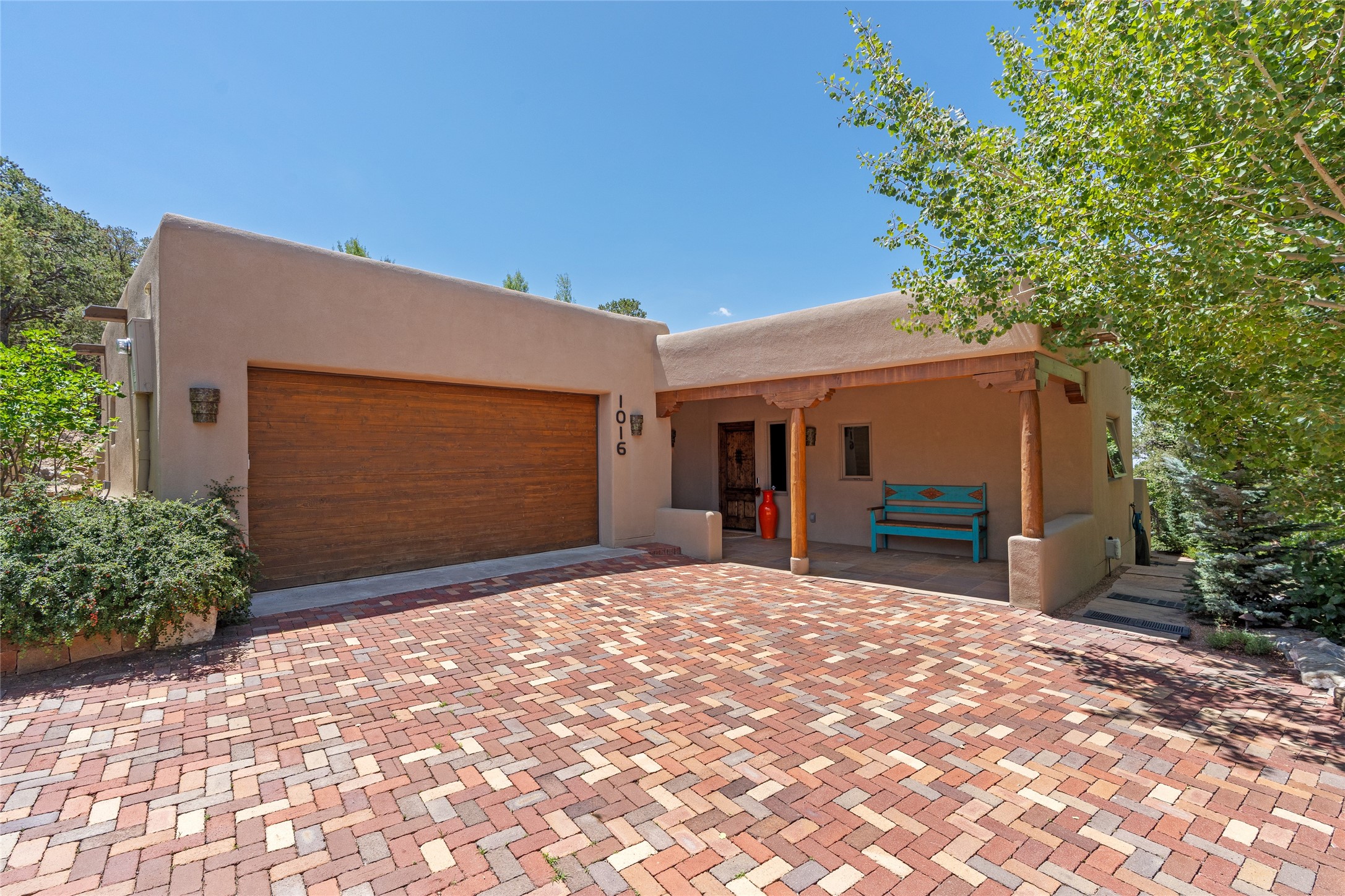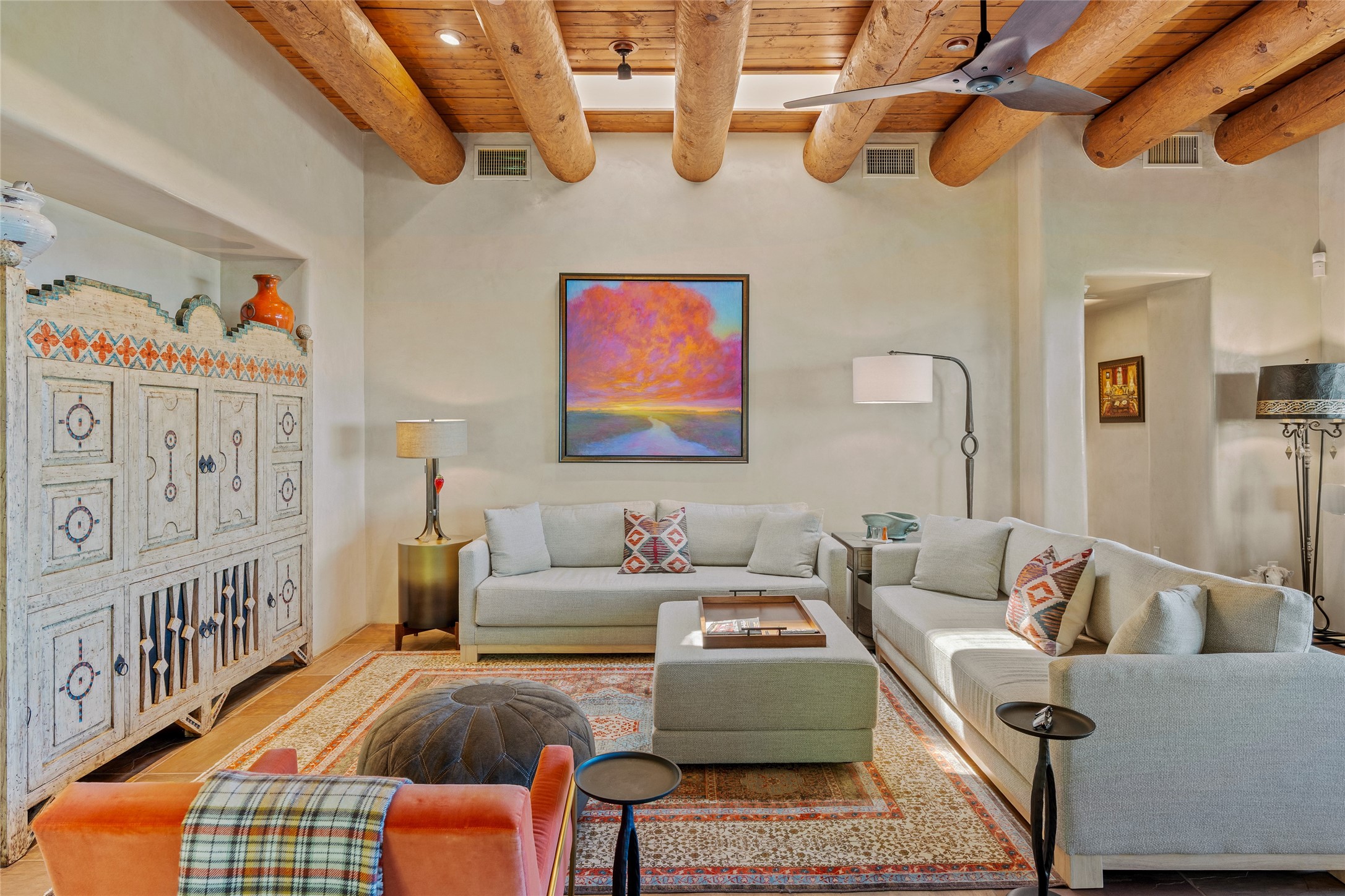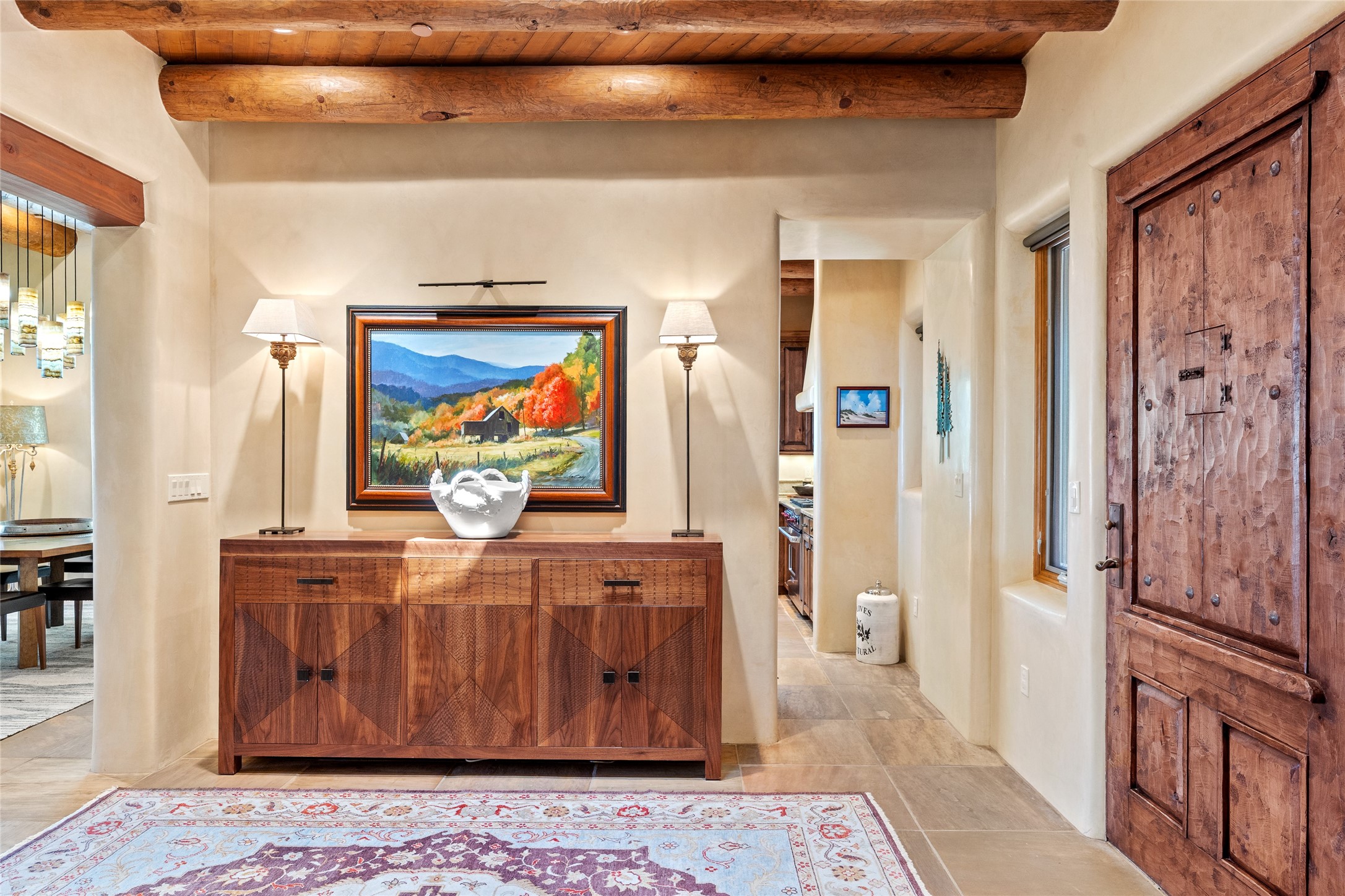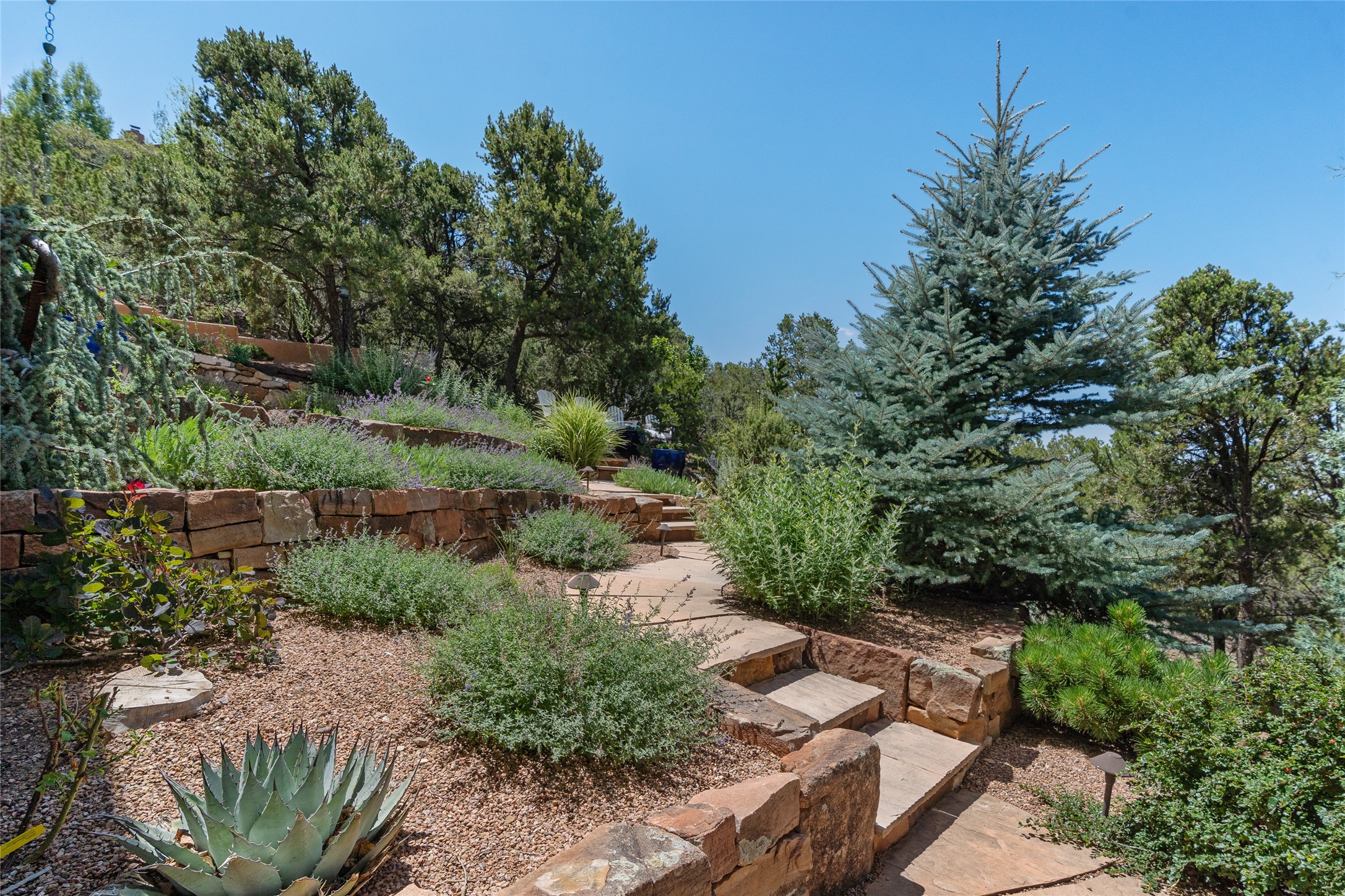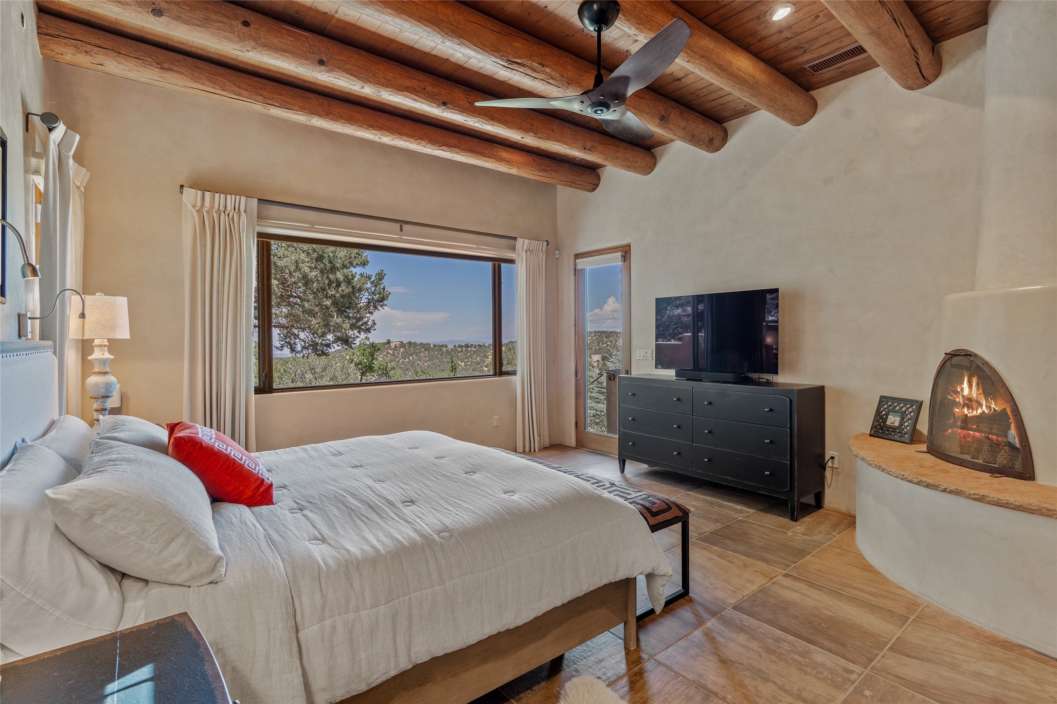 Located in the gated community of High Summit, eight minutes from the Santa Fe Plaza, this exquisite 3 bedroom, 2 bath Pueblo style home built in 2009 seamlessly blends traditional Southwestern elegance with modern luxury. Carved wooden doors, smooth plaster walls, and stone flooring envelope the home in warmth and timeless craftsmanship. Three gas equipped indoor fireplaces--including one in the generous primary suite--add cozy ambience and convenience. Huge picture windows bathe interiors in light and frame beautiful views of the Jemez Mountains, with sunset vistas that transform evening conversation into art. The gourmet kitchen is outfitted with Sub Zero refrigeration, a six burner Wolf range, ample prep surfaces and storage. The primary bedroom suite, tucked away for privacy, features its own fireplace, a panoramic picture window, and a spa like bath with soaking tub, steam shower, gas fireplace and walk in closet. Stepping outdoors, you'll find a 650sq.ft. wrap around portal with kiva fireplace separating the living and dining areas, all framed by stunning mountain views and equipped with remote controlled electronic shades for comfort at every hour. Professionally landscaped and an easy stroll from your backyard to the Dale Ball Trails system, a nearly 25 mile network trails that connect directly to the Santa Fe National Forest--truly your backyard playground, with countless miles of nature, skiing at the Santa Fe Ski Basin just minutes away, and the healing hot tubs of Ten Thousand Waves practically at your doorstep. With a brick laid driveway, 2 car garage, and a "lock and leave" lifestyle that is ideal for both full time living or your perfect get-a-way vacation home. In floor radiant heat, central cooling, city utilities--water, sewer, natural gas, underground electricity, and full natural gas powered home generator for backup.