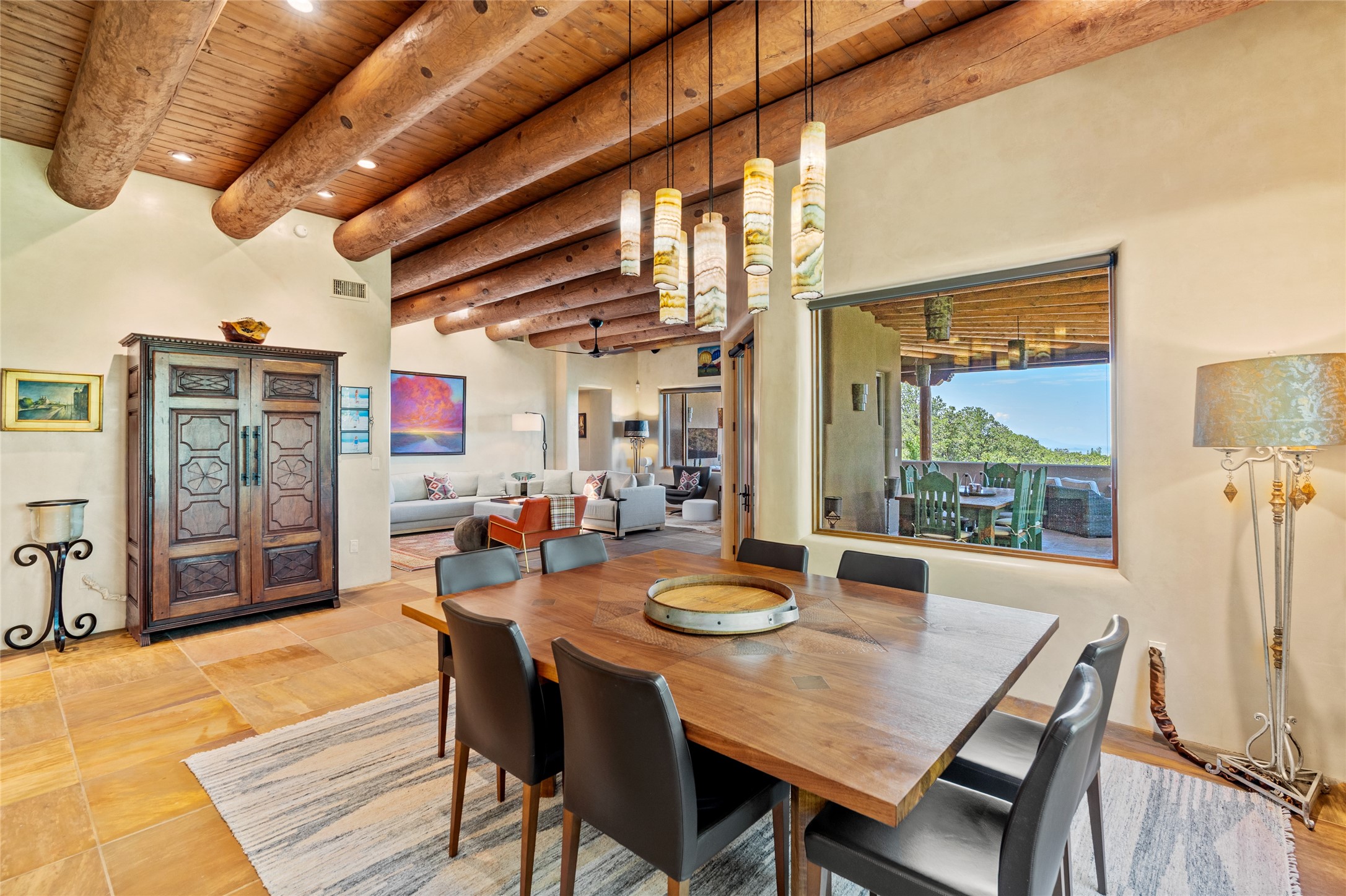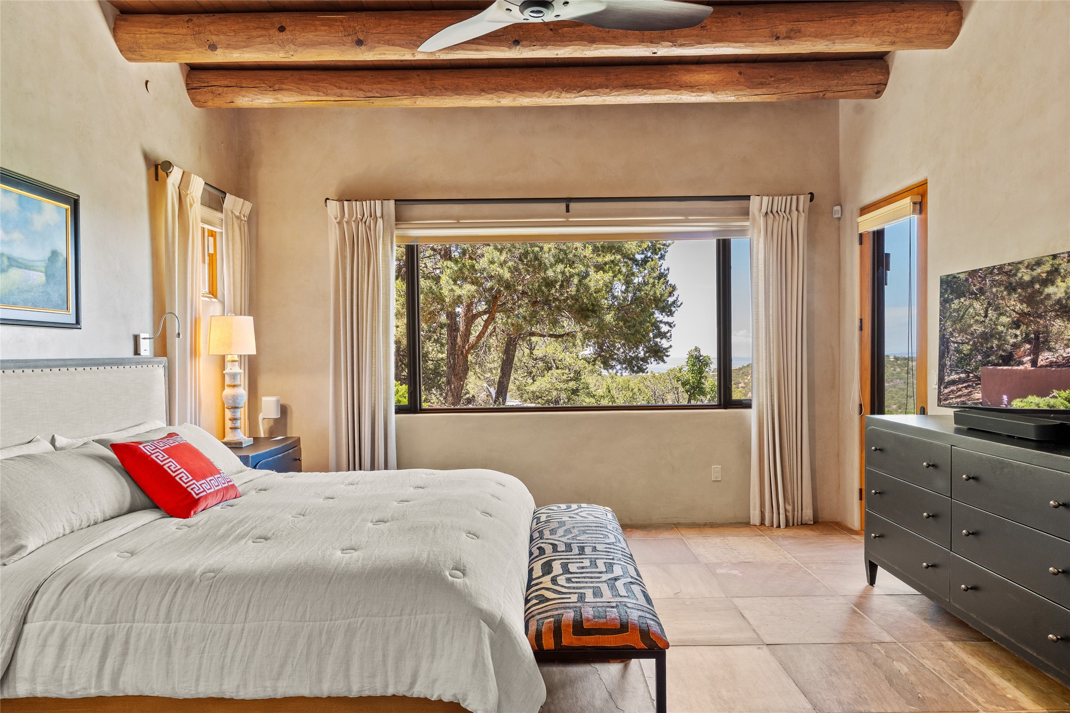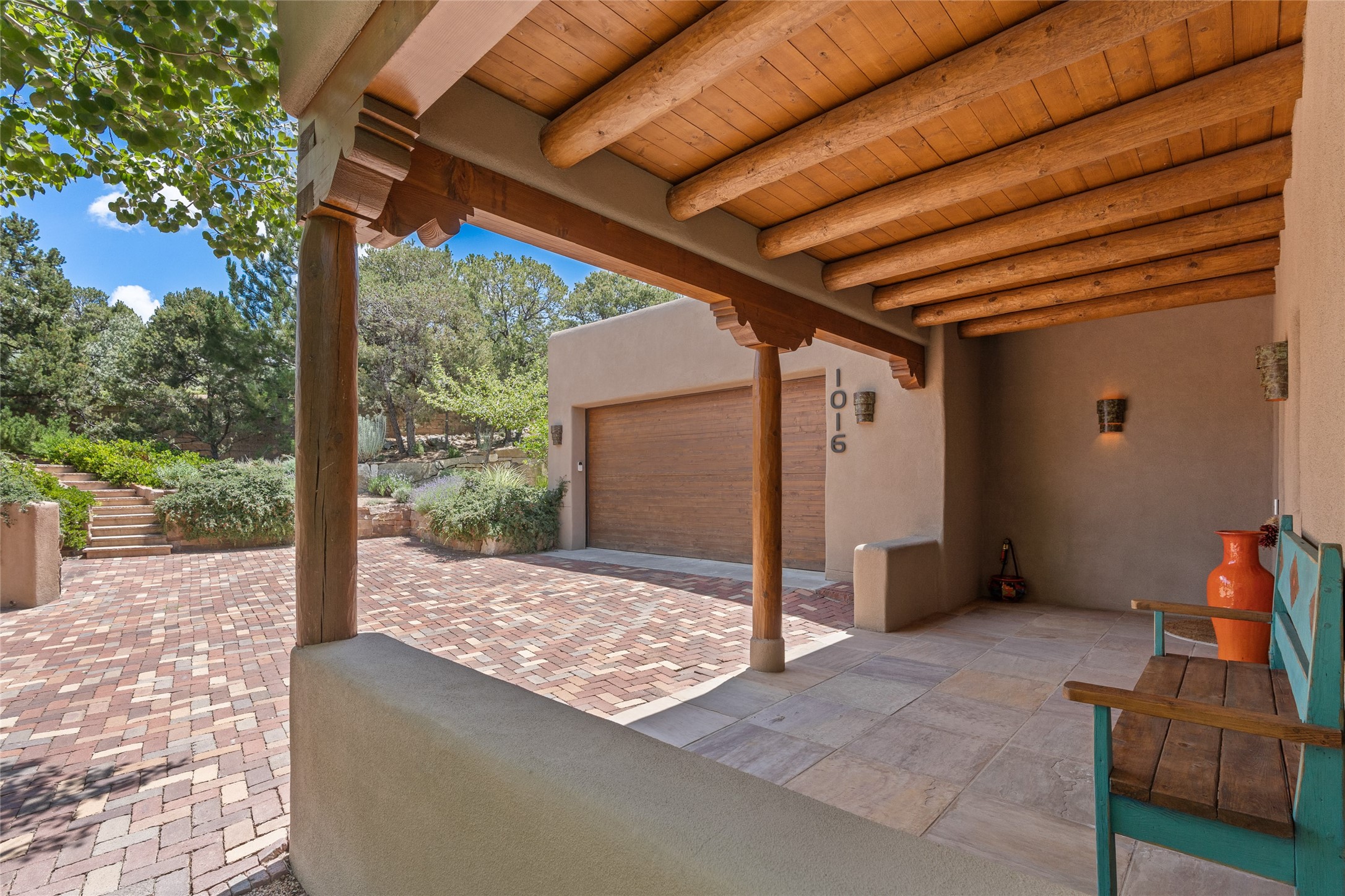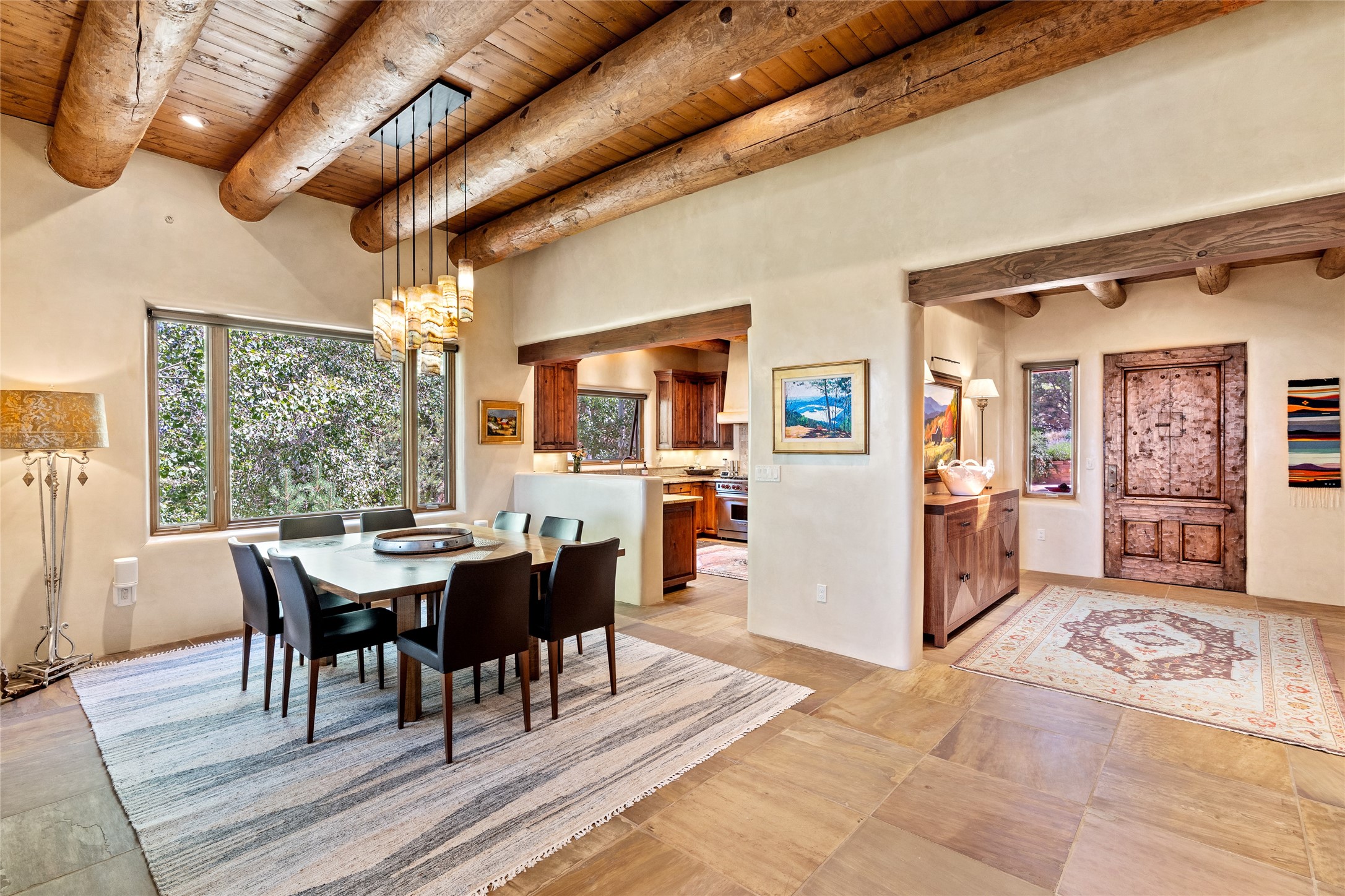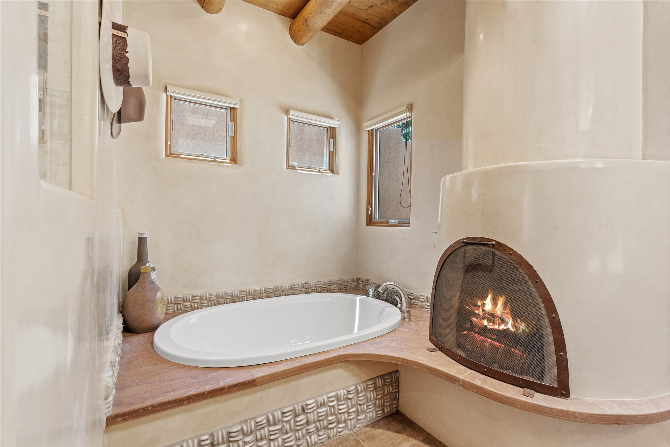 Located in the gated community of High Summit, eight minutes from the Santa Fe Plaza, this exquisite 3 bedroom, 2 bath Pueblo style home built in 2009 seamlessly blends traditional Southwestern elegance with modern luxury. Carved wooden doors, smooth plaster walls, and stone flooring envelope the home in warmth and timeless craftsmanship. Three gas equipped indoor fireplaces--including one in the generous primary suite--add cozy ambience and convenience. Huge picture windows bathe interiors in light and frame beautiful views of the Jemez Mountains, with sunset vistas that transform evening conversation into art. The gourmet kitchen is outfitted with Sub Zero refrigeration, a six burner Wolf range, ample prep surfaces and storage. The primary bedroom suite, tucked away for privacy, features its own fireplace, a panoramic picture window, and a spa like bath with soaking tub, steam shower, gas fireplace and walk in closet. Stepping outdoors, you'll find a 650sq.ft. wrap around portal with kiva fireplace separating the living and dining areas, all framed by stunning mountain views and equipped with remote controlled electronic shades for comfort at every hour. Professionally landscaped and an easy stroll from your backyard to the Dale Ball Trails system, a nearly 25 mile network trails that connect directly to the Santa Fe National Forest--truly your backyard playground, with countless miles of nature, skiing at the Santa Fe Ski Basin just minutes away, and the healing hot tubs of Ten Thousand Waves practically at your doorstep. With a brick laid driveway, 2 car garage, and a "lock and leave" lifestyle that is ideal for both full time living or your perfect get-a-way vacation home. In floor radiant heat, central cooling, city utilities--water, sewer, natural gas, underground electricity, and full natural gas powered home generator for backup.