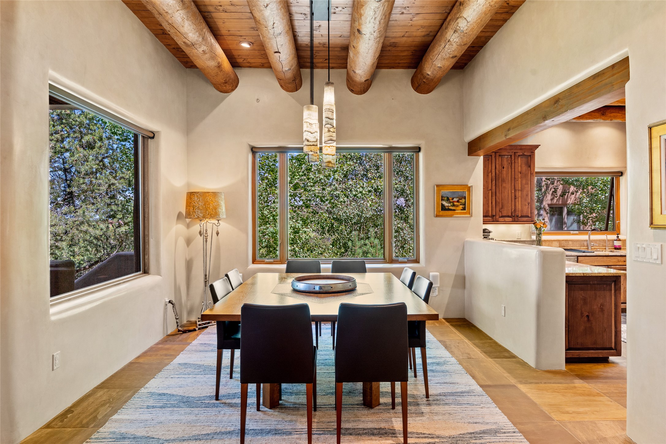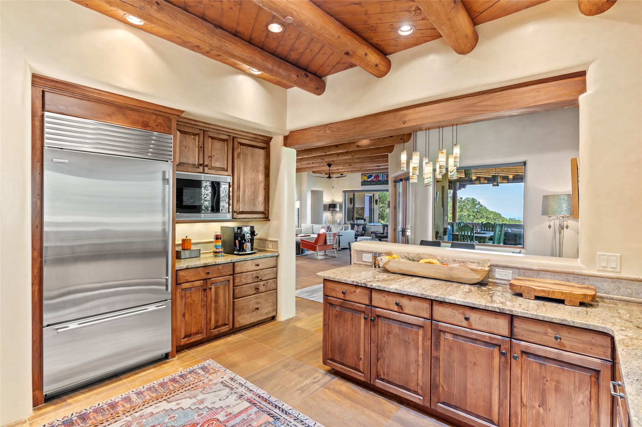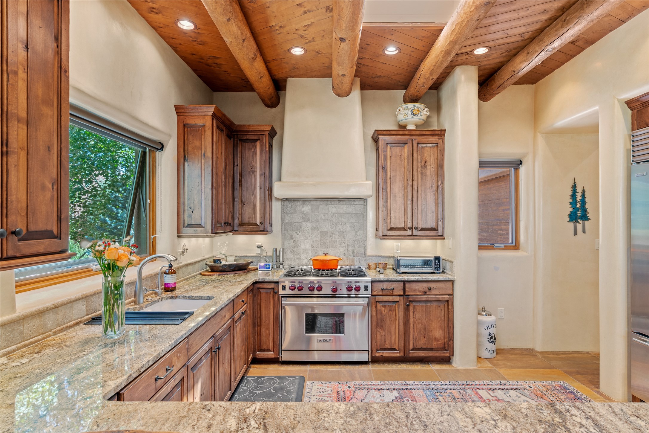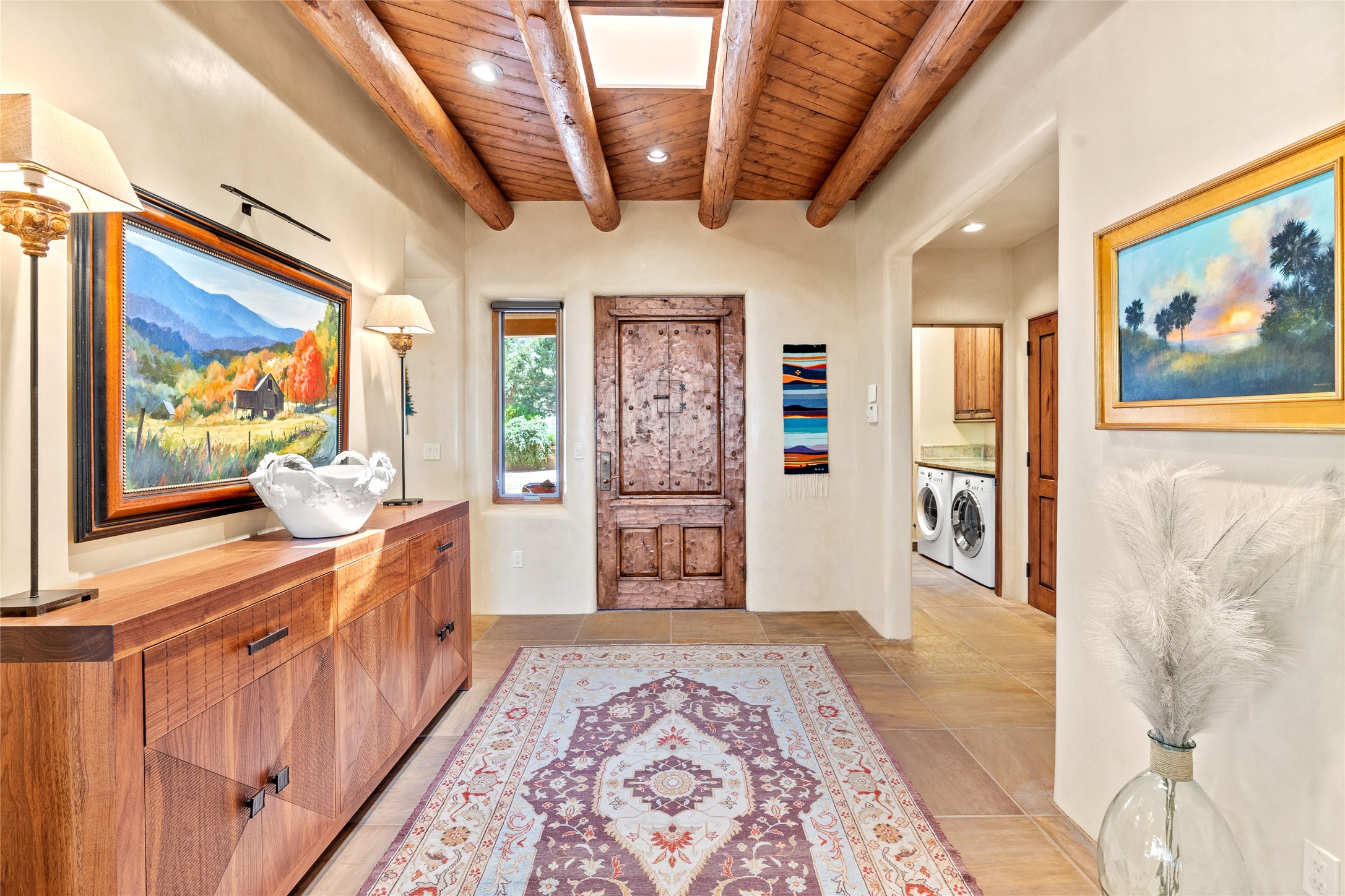 Located in the gated community of High Summit, eight minutes from the Santa Fe Plaza, this exquisite 3 bedroom, 2 bath Pueblo style home built in 2009 seamlessly blends traditional Southwestern elegance with modern luxury. Carved wooden doors, smooth plaster walls, and stone flooring envelope the home in warmth and timeless craftsmanship. Three gas equipped indoor fireplaces--including one in the generous primary suite--add cozy ambience and convenience. Huge picture windows bathe interiors in light and frame beautiful views of the Jemez Mountains, with sunset vistas that transform evening conversation into art. The gourmet kitchen is outfitted with Sub Zero refrigeration, a six burner Wolf range, ample prep surfaces and storage. The primary bedroom suite, tucked away for privacy, features its own fireplace, a panoramic picture window, and a spa like bath with soaking tub, steam shower, gas fireplace and walk in closet. Stepping outdoors, you'll find a 650sq.ft. wrap around portal with kiva fireplace separating the living and dining areas, all framed by stunning mountain views and equipped with remote controlled electronic shades for comfort at every hour. Professionally landscaped and an easy stroll from your backyard to the Dale Ball Trails system, a nearly 25 mile network trails that connect directly to the Santa Fe National Forest--truly your backyard playground, with countless miles of nature, skiing at the Santa Fe Ski Basin just minutes away, and the healing hot tubs of Ten Thousand Waves practically at your doorstep. With a brick laid driveway, 2 car garage, and a "lock and leave" lifestyle that is ideal for both full time living or your perfect get-a-way vacation home. In floor radiant heat, central cooling, city utilities--water, sewer, natural gas, underground electricity, and full natural gas powered home generator for backup.