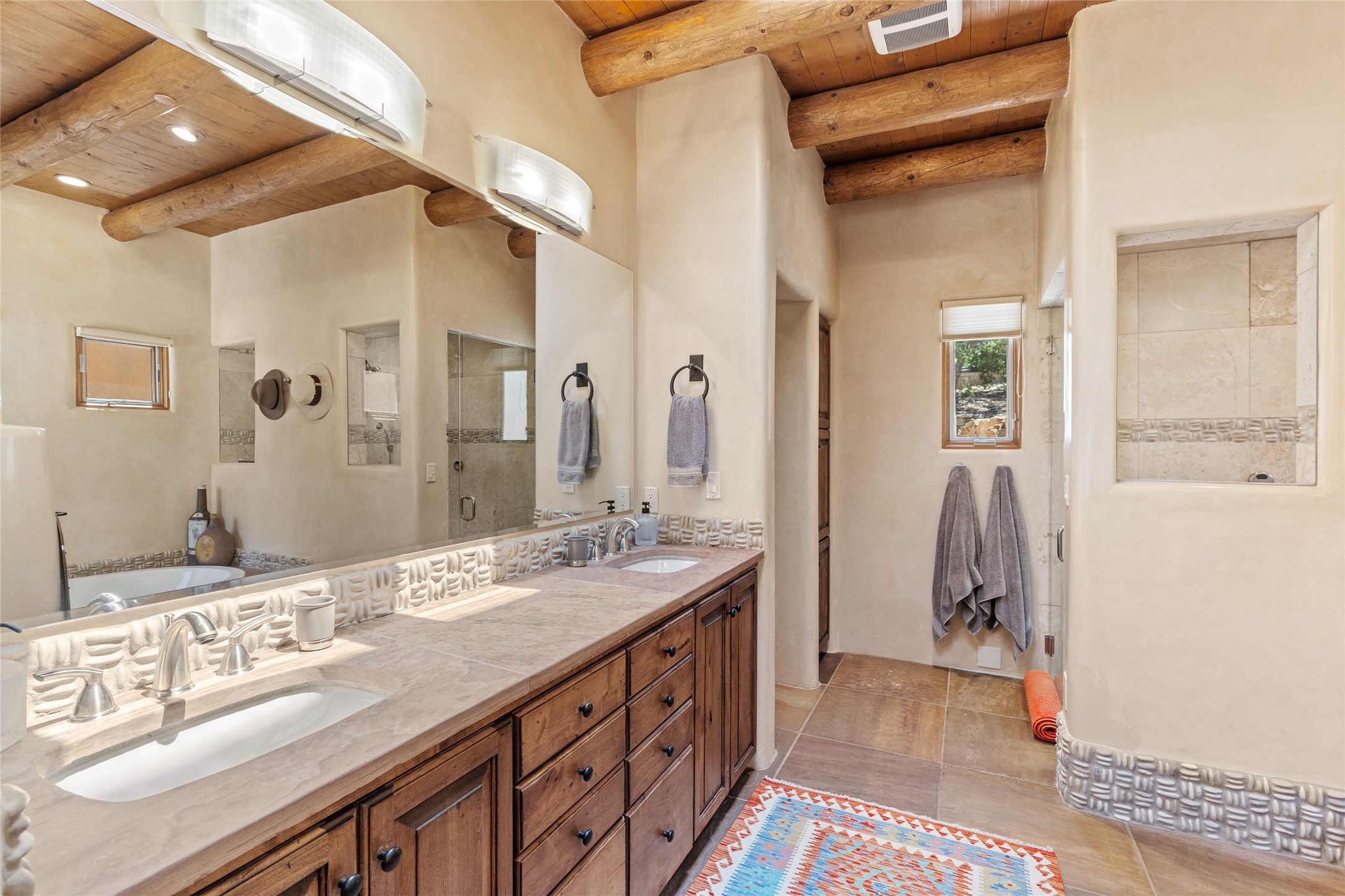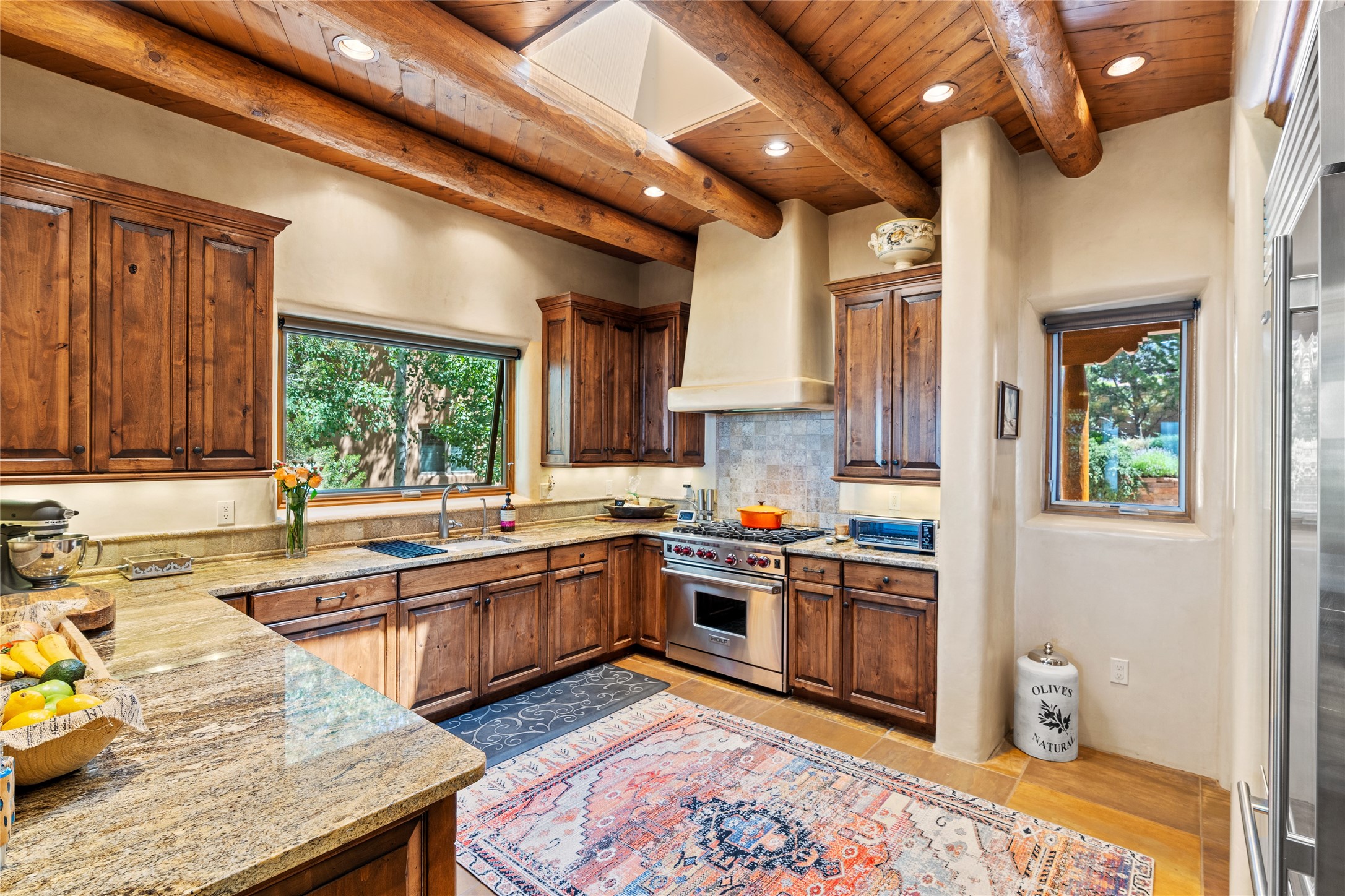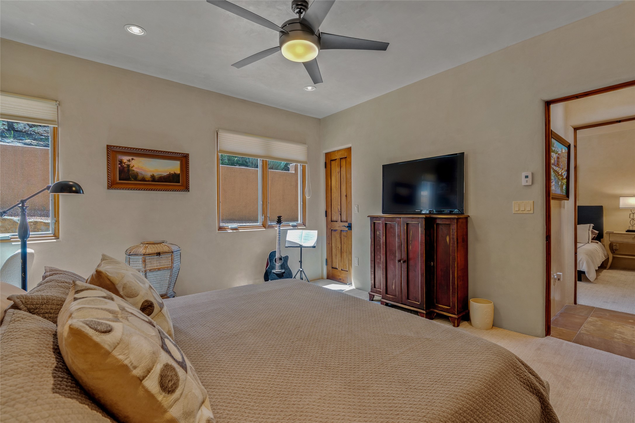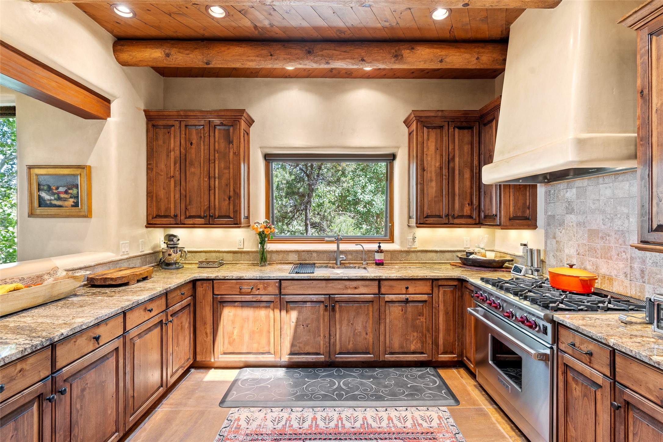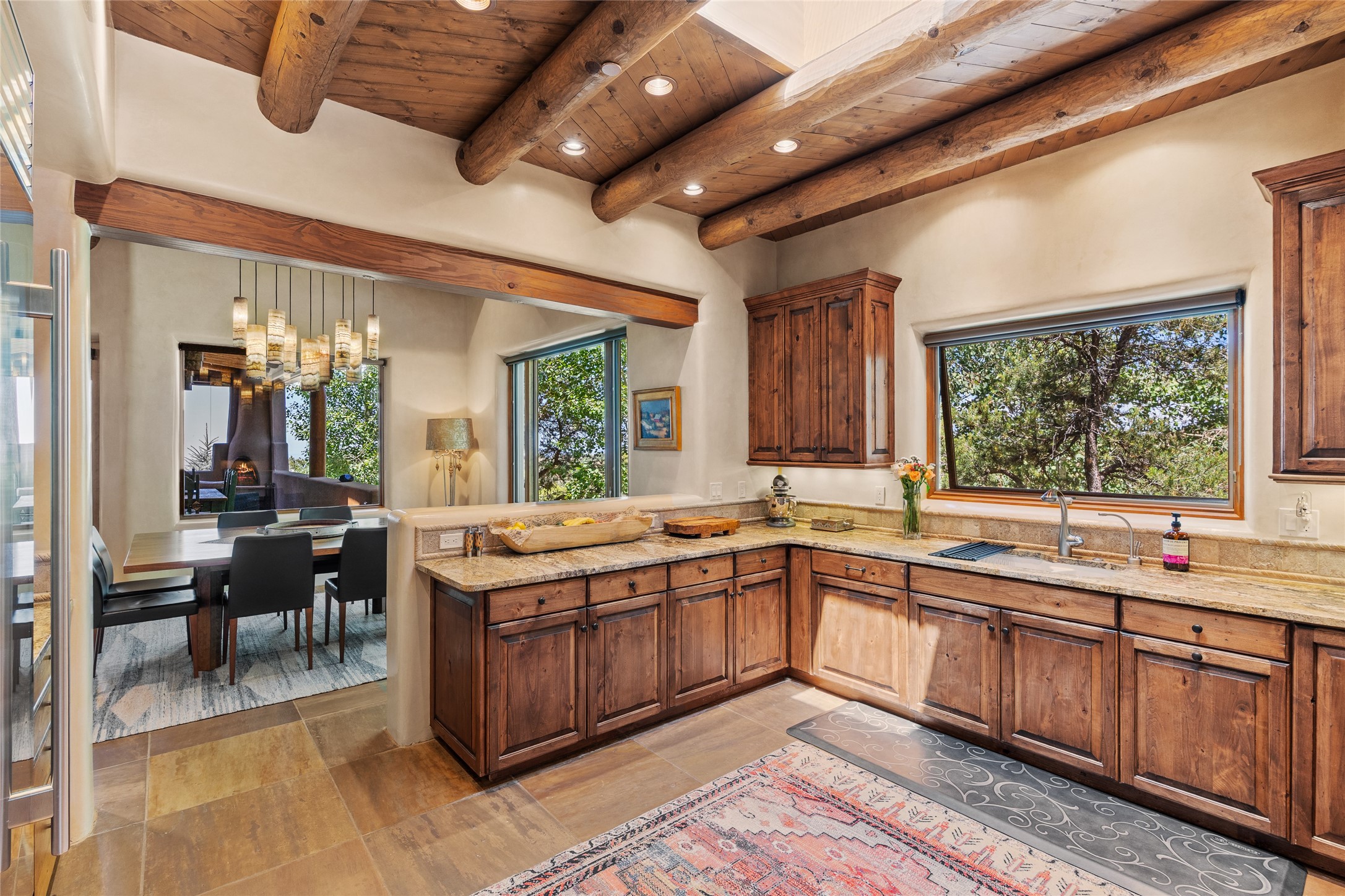 Located in the gated community of High Summit, eight minutes from the Santa Fe Plaza, this exquisite 3 bedroom, 2 bath Pueblo style home built in 2009 seamlessly blends traditional Southwestern elegance with modern luxury. Carved wooden doors, smooth plaster walls, and stone flooring envelope the home in warmth and timeless craftsmanship. Three gas equipped indoor fireplaces--including one in the generous primary suite--add cozy ambience and convenience. Huge picture windows bathe interiors in light and frame beautiful views of the Jemez Mountains, with sunset vistas that transform evening conversation into art. The gourmet kitchen is outfitted with Sub Zero refrigeration, a six burner Wolf range, ample prep surfaces and storage. The primary bedroom suite, tucked away for privacy, features its own fireplace, a panoramic picture window, and a spa like bath with soaking tub, steam shower, gas fireplace and walk in closet. Stepping outdoors, you'll find a 650sq.ft. wrap around portal with kiva fireplace separating the living and dining areas, all framed by stunning mountain views and equipped with remote controlled electronic shades for comfort at every hour. Professionally landscaped and an easy stroll from your backyard to the Dale Ball Trails system, a nearly 25 mile network trails that connect directly to the Santa Fe National Forest--truly your backyard playground, with countless miles of nature, skiing at the Santa Fe Ski Basin just minutes away, and the healing hot tubs of Ten Thousand Waves practically at your doorstep. With a brick laid driveway, 2 car garage, and a "lock and leave" lifestyle that is ideal for both full time living or your perfect get-a-way vacation home. In floor radiant heat, central cooling, city utilities--water, sewer, natural gas, underground electricity, and full natural gas powered home generator for backup.
