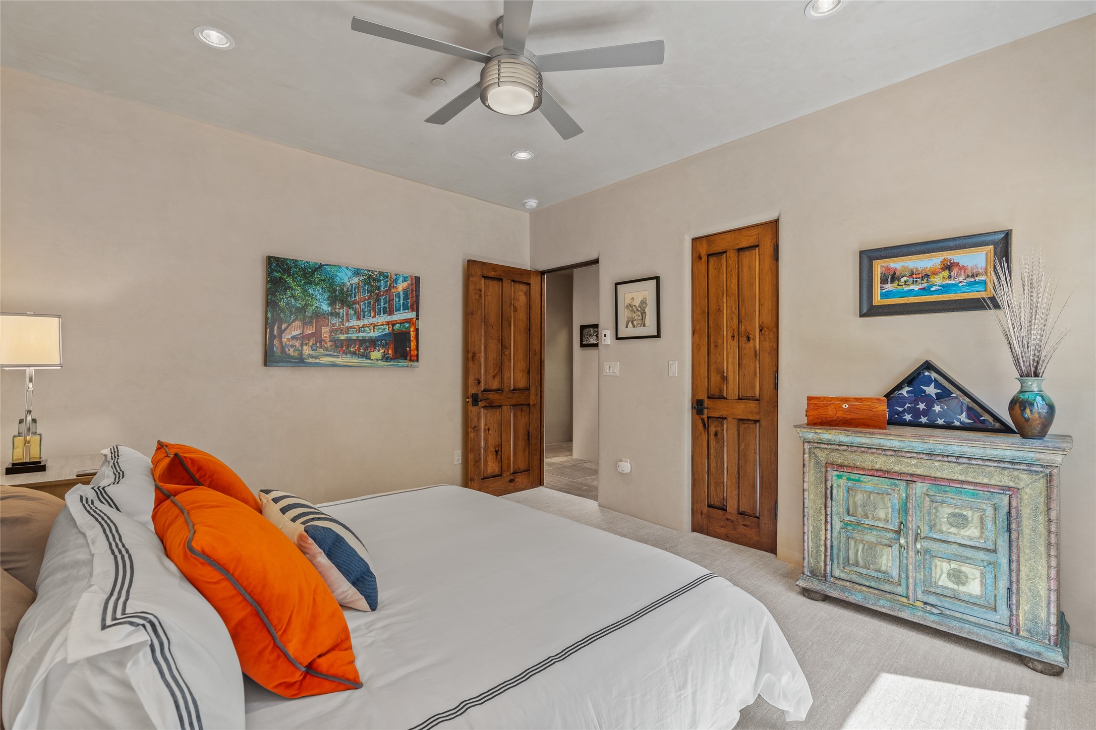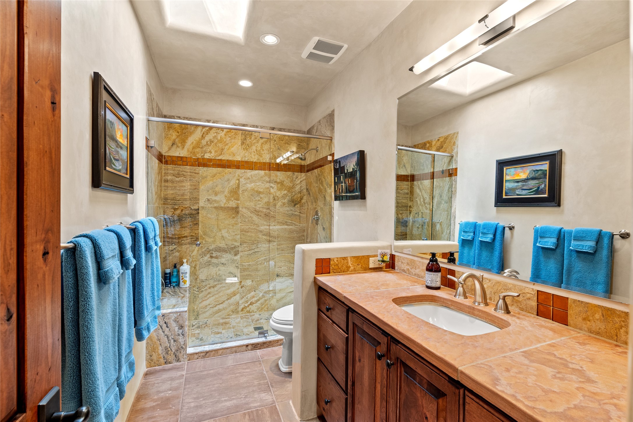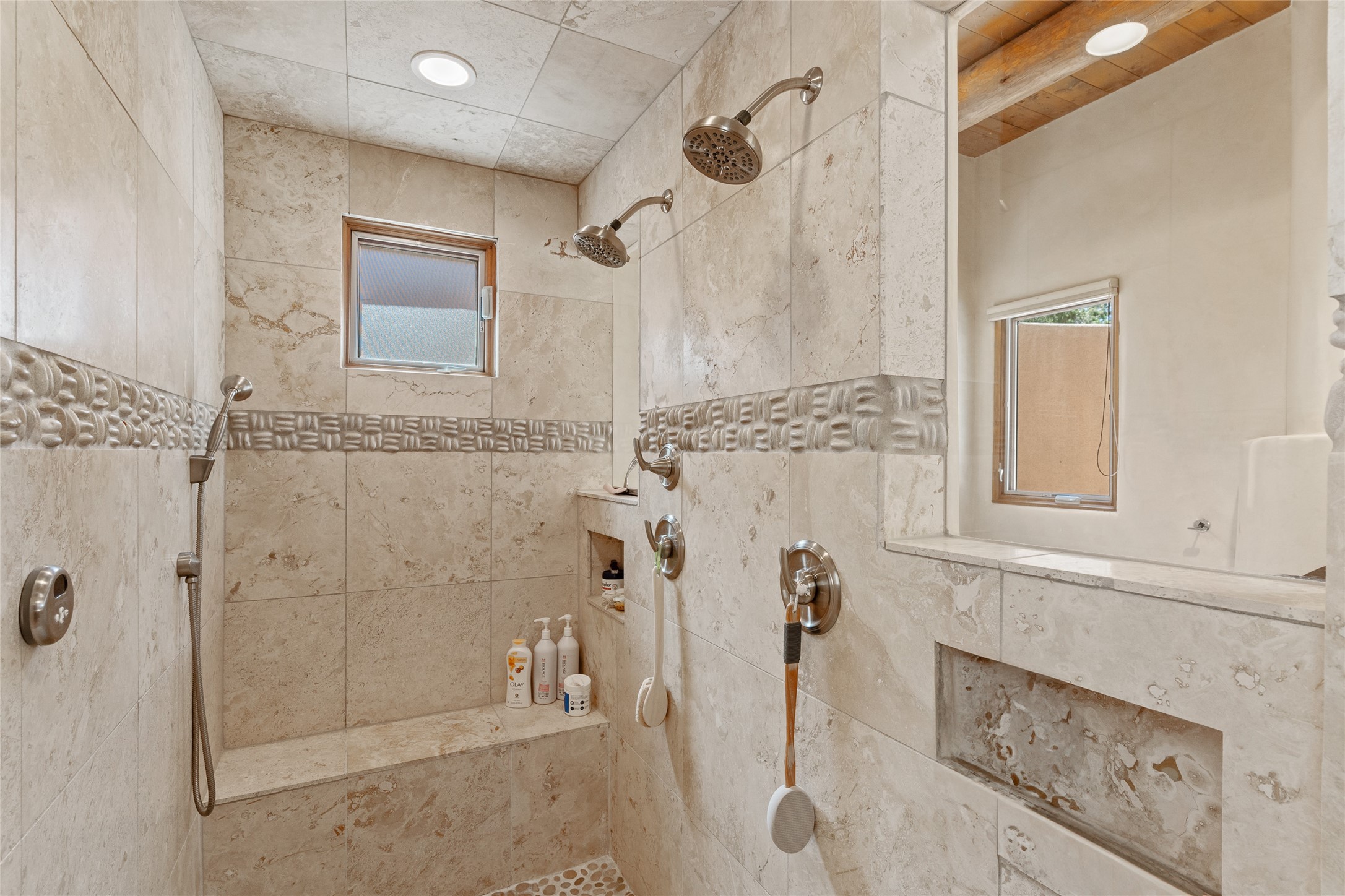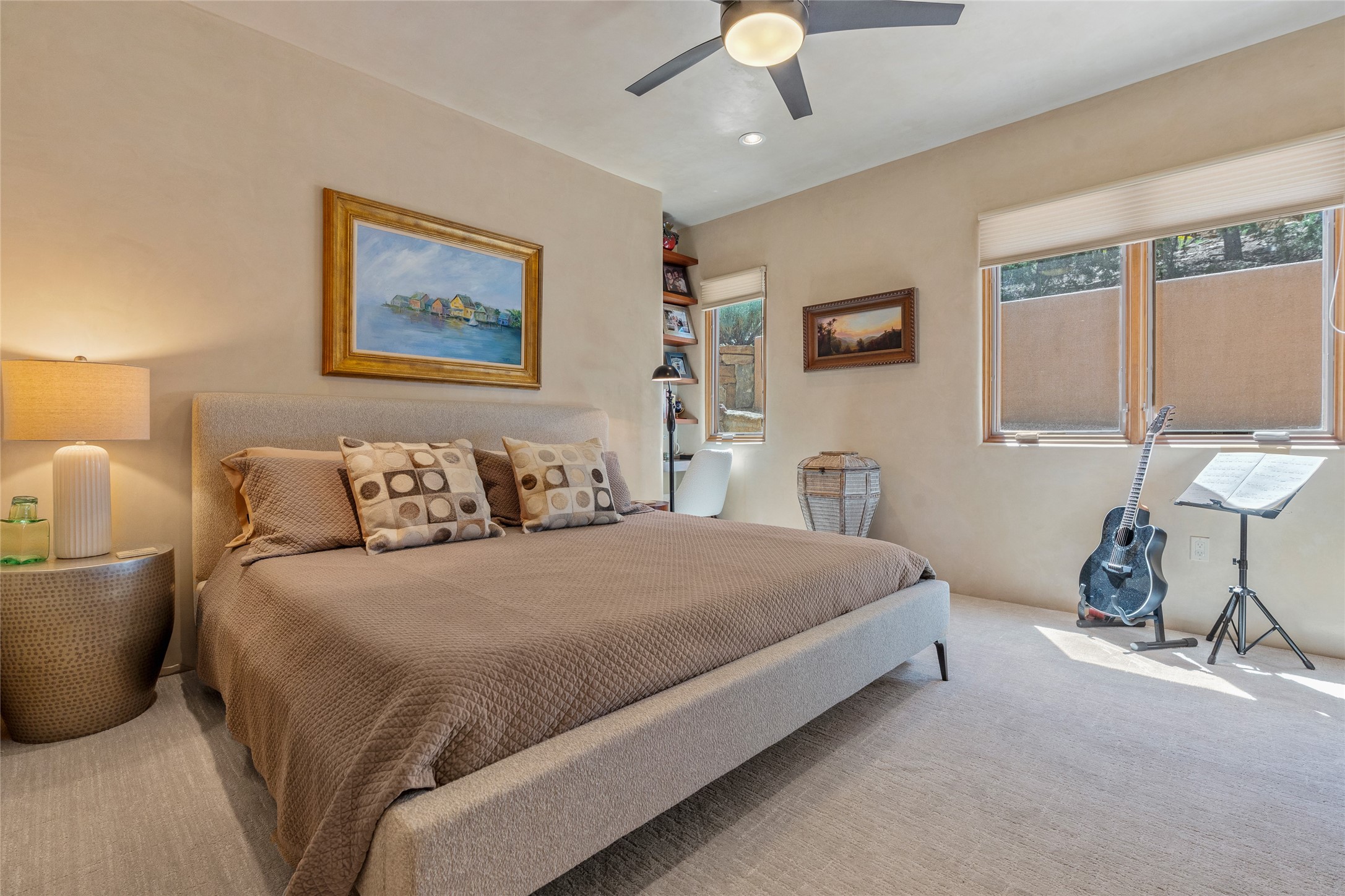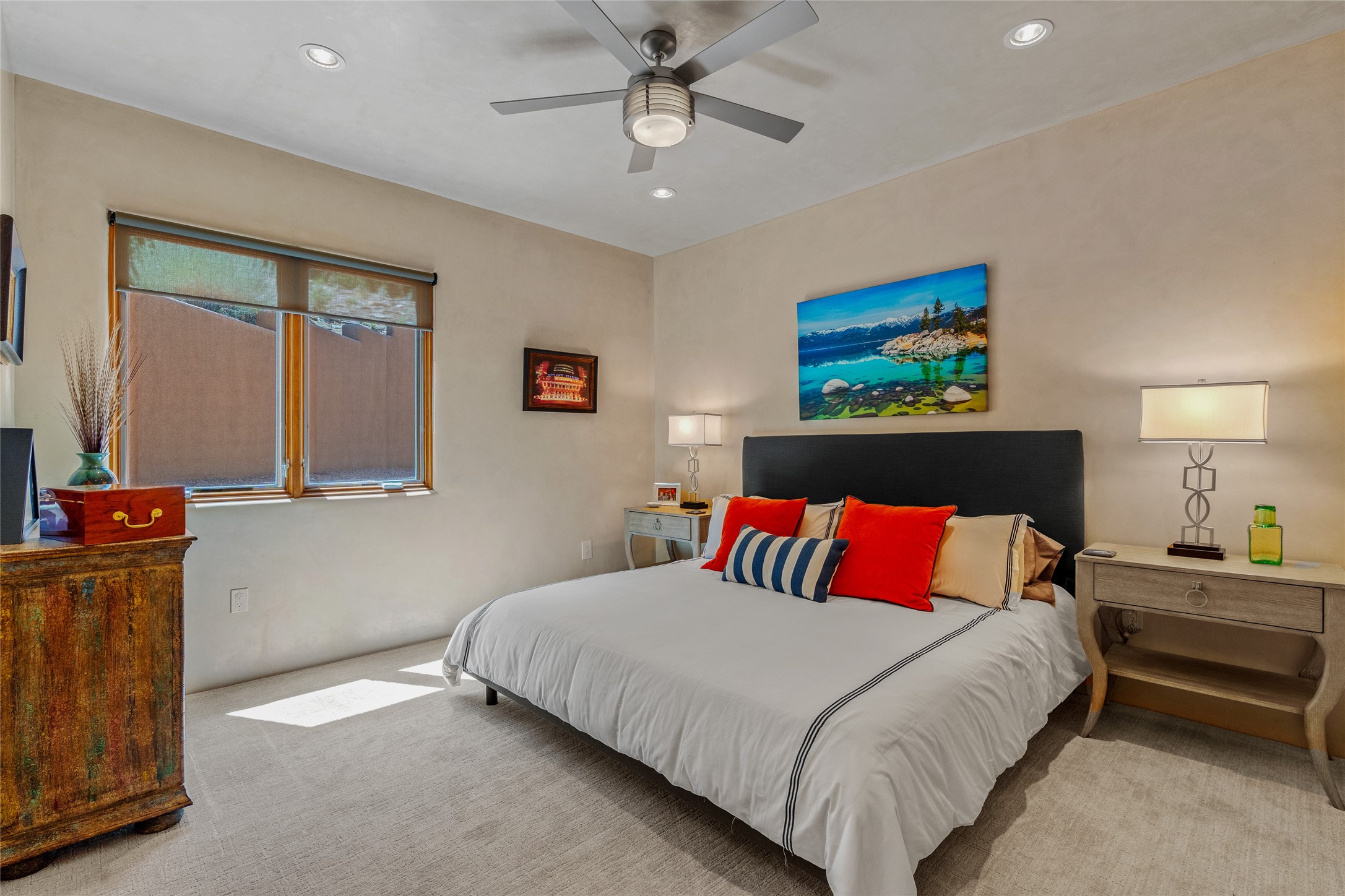 Located in the gated community of High Summit, eight minutes from the Santa Fe Plaza, this exquisite 3 bedroom, 2 bath Pueblo style home built in 2009 seamlessly blends traditional Southwestern elegance with modern luxury. Carved wooden doors, smooth plaster walls, and stone flooring envelope the home in warmth and timeless craftsmanship. Three gas equipped indoor fireplaces--including one in the generous primary suite--add cozy ambience and convenience. Huge picture windows bathe interiors in light and frame beautiful views of the Jemez Mountains, with sunset vistas that transform evening conversation into art. The gourmet kitchen is outfitted with Sub Zero refrigeration, a six burner Wolf range, ample prep surfaces and storage. The primary bedroom suite, tucked away for privacy, features its own fireplace, a panoramic picture window, and a spa like bath with soaking tub, steam shower, gas fireplace and walk in closet. Stepping outdoors, you'll find a 650sq.ft. wrap around portal with kiva fireplace separating the living and dining areas, all framed by stunning mountain views and equipped with remote controlled electronic shades for comfort at every hour. Professionally landscaped and an easy stroll from your backyard to the Dale Ball Trails system, a nearly 25 mile network trails that connect directly to the Santa Fe National Forest--truly your backyard playground, with countless miles of nature, skiing at the Santa Fe Ski Basin just minutes away, and the healing hot tubs of Ten Thousand Waves practically at your doorstep. With a brick laid driveway, 2 car garage, and a "lock and leave" lifestyle that is ideal for both full time living or your perfect get-a-way vacation home. In floor radiant heat, central cooling, city utilities--water, sewer, natural gas, underground electricity, and full natural gas powered home generator for backup.