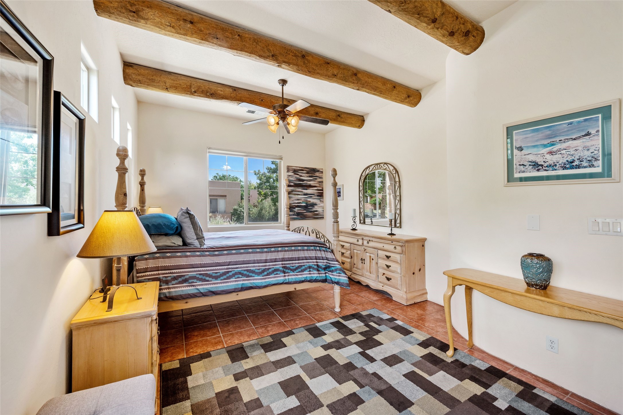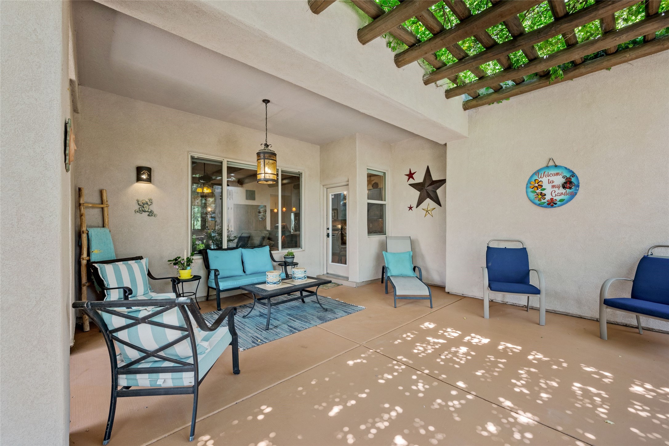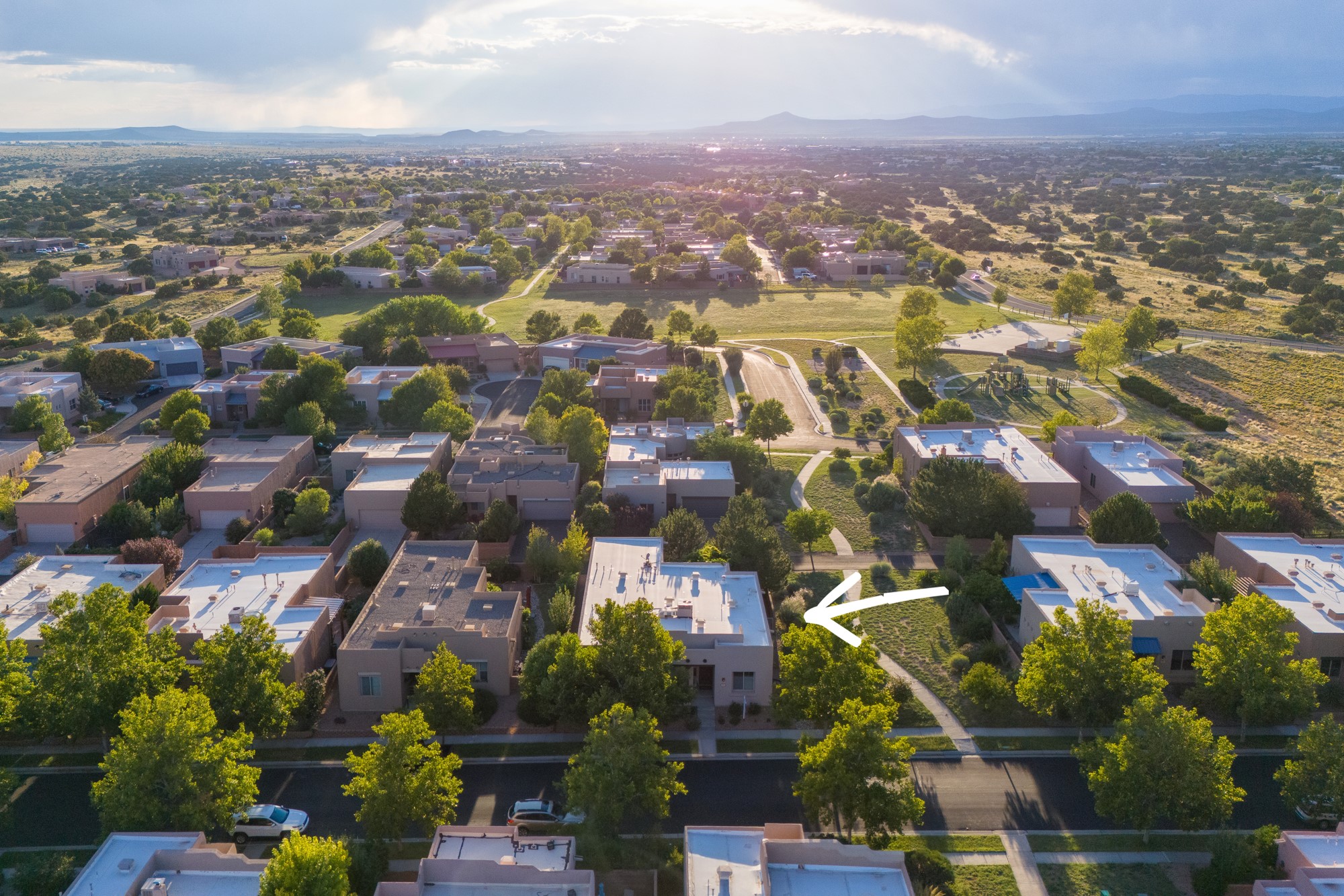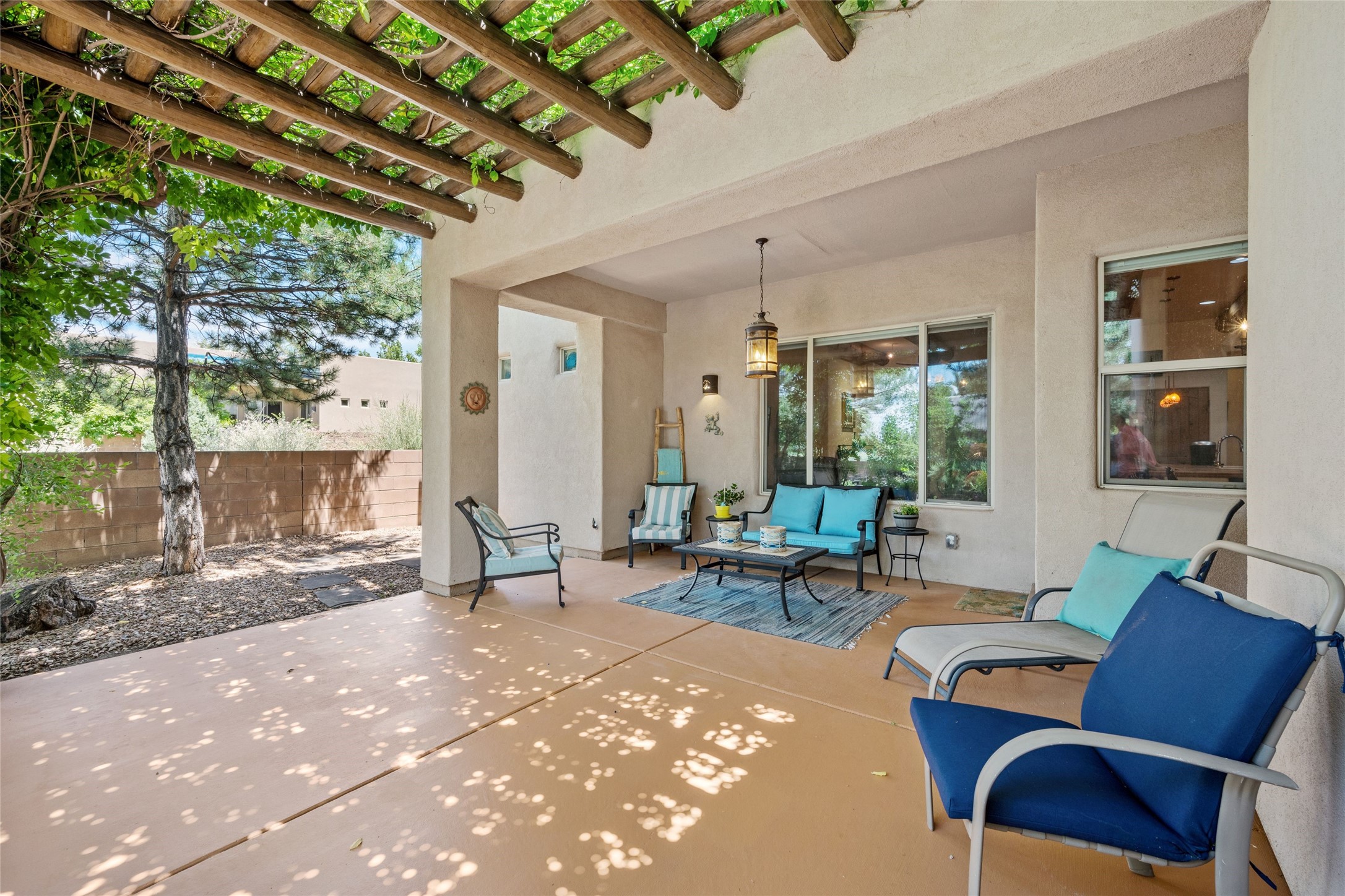 Exceptional 3-Bedroom, 2-Bath Home - Truchas Floor PlanBeautifully maintained and thoughtfully upgraded, this home showcases over $140K in enhancements completed prior to 2009 along with timeless design details. The Truchas Floor Plan is a popular single-level, split-bedroom layout designed for both privacy and flow--featuring an open central living space flanked by a secluded primary suite on one side and two guest bedrooms on the other.The private primary suite includes custom lighting, window treatments, and professional closet organizers. Architectural highlights include viga & beam ceilings, solid alder doors, a gas kiva fireplace, and insulated windows.The gourmet kitchen is equipped with stainless steel Maytag appliances--including a built-in microwave--plus a large sink, a 'Good Water' filtration system and softener, and abundant storage. The open living area includes built-in surround sound for the television system, ideal for entertaining. Year-round comfort is ensured with radiant heating, refrigerated air, and all-tile flooring.Additional features include an extended insulated garage and beautifully landscaped grounds with irrigation system, an extended covered portal for outdoor living, and security system with motion activated lights. Dryer replaced in 2022. Energy Star-rated for efficiency, with exceptional quality.Located next to a green space walkway to a children's park within Rancho Viejo, a master-planned Santa Fe community known for its scenic open spaces, village-style design, and over 12 miles of walking trails, this home offers both a peaceful setting and convenient access to shopping, schools, parks, and downtown Santa Fe.