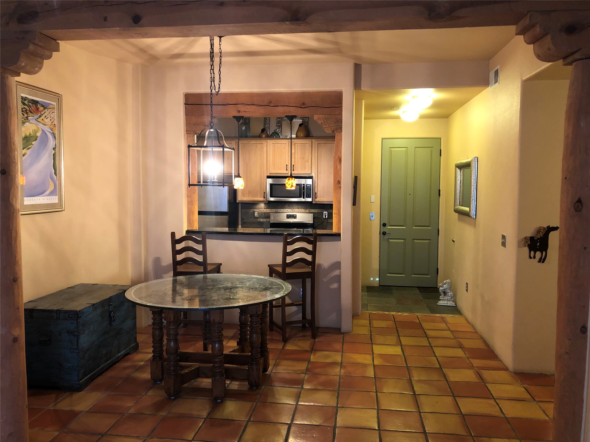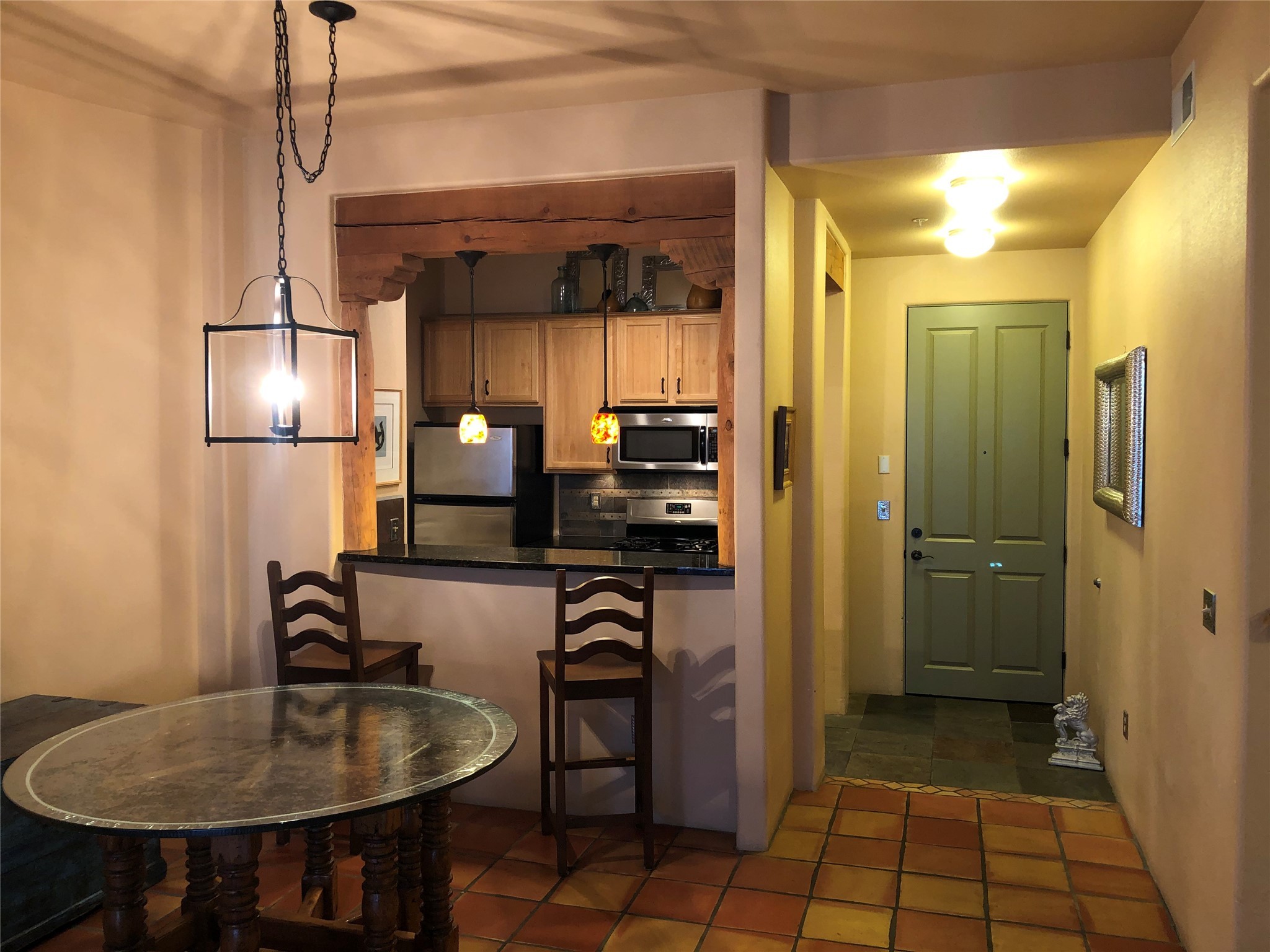 Spacious 2nd floor, Unit B-238, north facing 2 bedrooms, 2 bath condominium located in The Alameda. Extra attached storage area plus a large detached garage. This well done unit features vigas, tongue and groove ceilings, Saltillo and slate floors beautifully done. tile and granite counter tops in kitchen and baths, stainless appliances, washer and dryer included, high ceilings with vigas, Natural gas kiva fireplace, refrigerated air and nice deck area. Amenities: The Alameda is a secure complex, security patrols, with gated parking areas, located in the heart of Santa Fe's prime recreational, entertainment and shopping corridor and boasts a private fitness center, fabulous inner courtyard and outdoor pool, conference center, offices, public gathering area, wine tasting room and is 24 hour access controlled. It's a fantastic unit in a great building & allows for good quality of life.