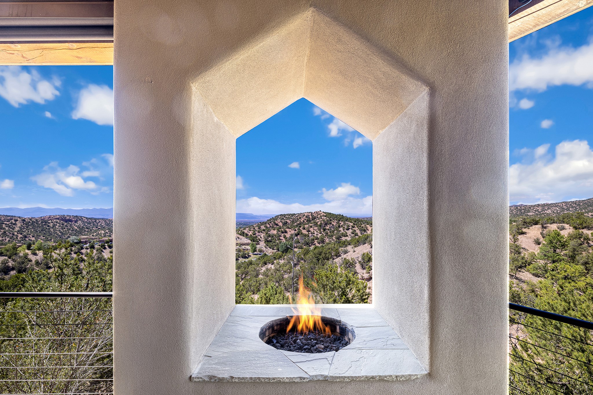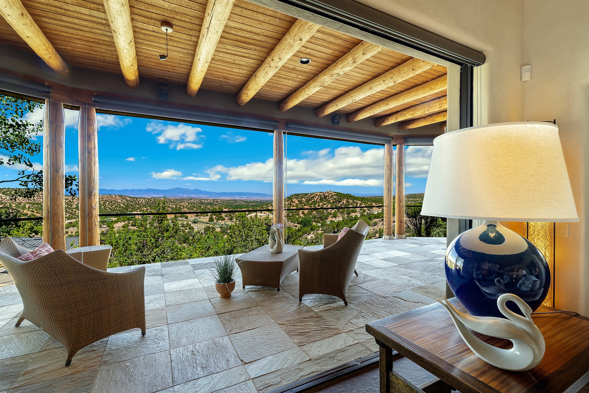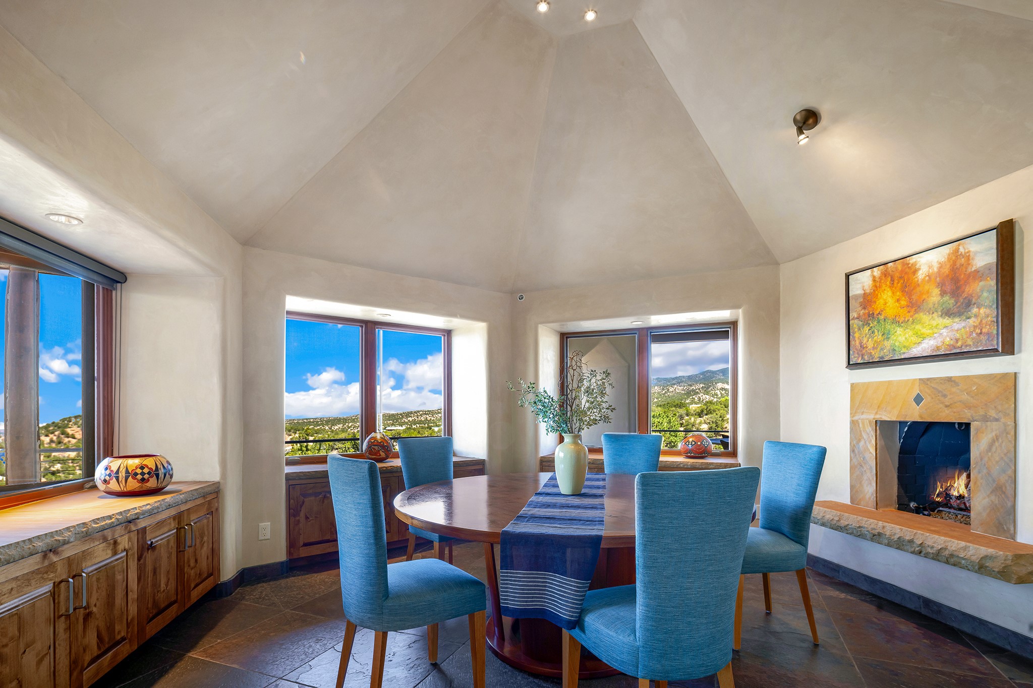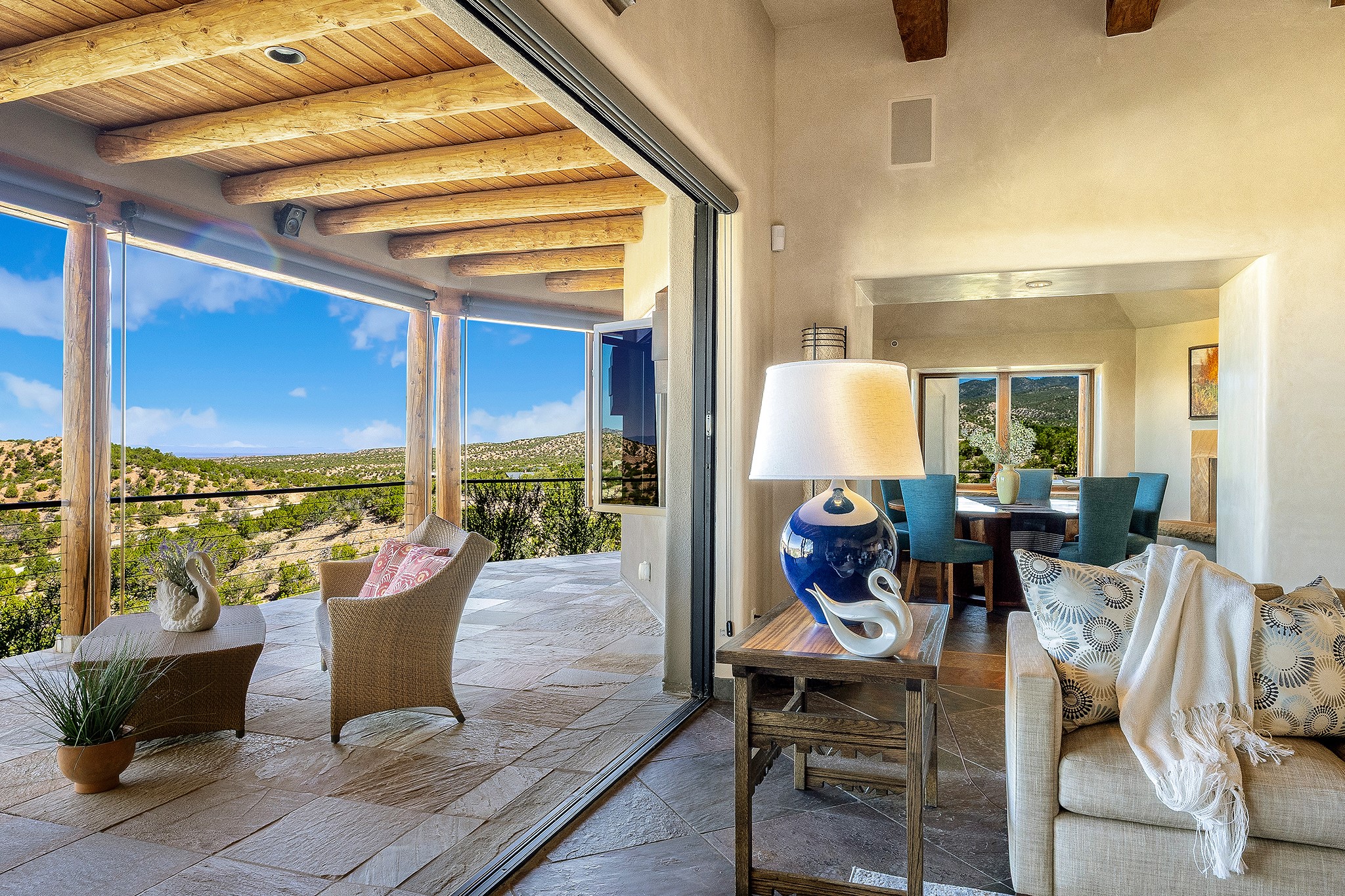An exceptional Value in Bishop's Lodge Hills & Villas! Perched above the Tesuque hills on 2.38 acres, 9 Lodge Circle offers a rare combination of panoramic mountain views and a unique Southwestern design--all just minutes from the Plaza. Set within the gated community of Bishop's Lodge Hills and Villas, this extraordinary property includes a 4,300 sq. ft. main residence and a versatile 1,500 sq. ft. detached studio, with commanding views of both the Jemez and Sangre de Cristo mountain ranges. The main home is a masterclass in design, showcasing a unique architectural blend of contemporary and Southwestern influences. The central living area features disappearing glass doors that open to a sweeping west-facing portal--perfect for soaking in Santa Fe's golden-hour light. An outdoor cantina with a gas fireplace and built-in grill sets the stage for elegant al fresco entertaining.The chef's kitchen is equally inspired, with a spacious island, cozy banco, butler's pantry, dumbwaiter, and an expansive picture window framing the Sangres. A dramatic dining room with a raised octagonal ceiling and fireplace offers a captivating setting for both intimate and grand gatherings. The primary suite is a private sanctuary, complete with a secluded hot tub for sunset views and stargazing. Two guest suites each offer ensuite baths, while a separate office provides quiet space for work or reflection. The detached 1,500 sq. ft. studio--originally a woodworking shop-- brimming with potential as a creative studio, gym, or guest quarters. As a bonus, ownership includes social membership privileges at the world-renowned Bishop's Lodge Resort. With its new price of $3,395,000, this exceptional property presents a compelling value in one of Santa Fe's most coveted locations--where design, privacy, and inspiration converge.