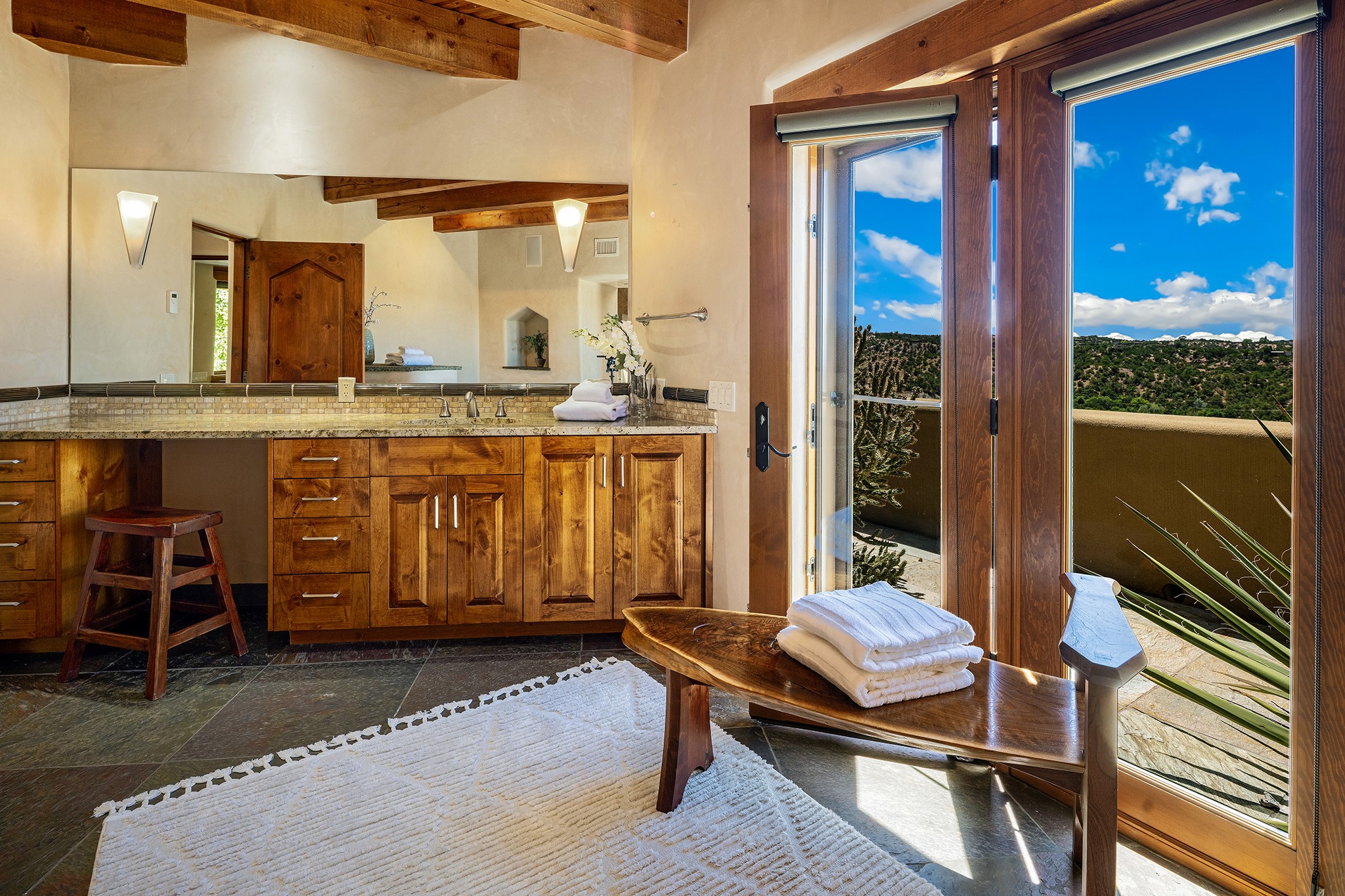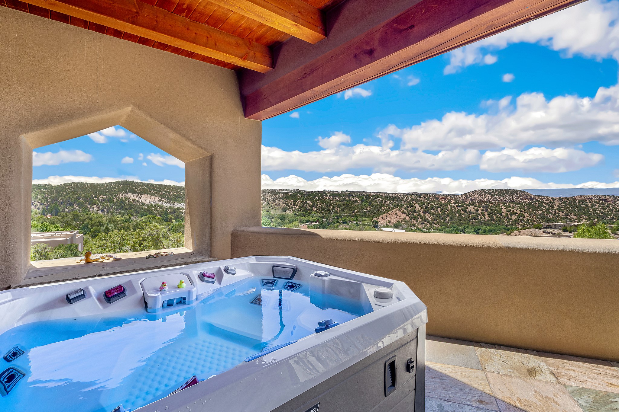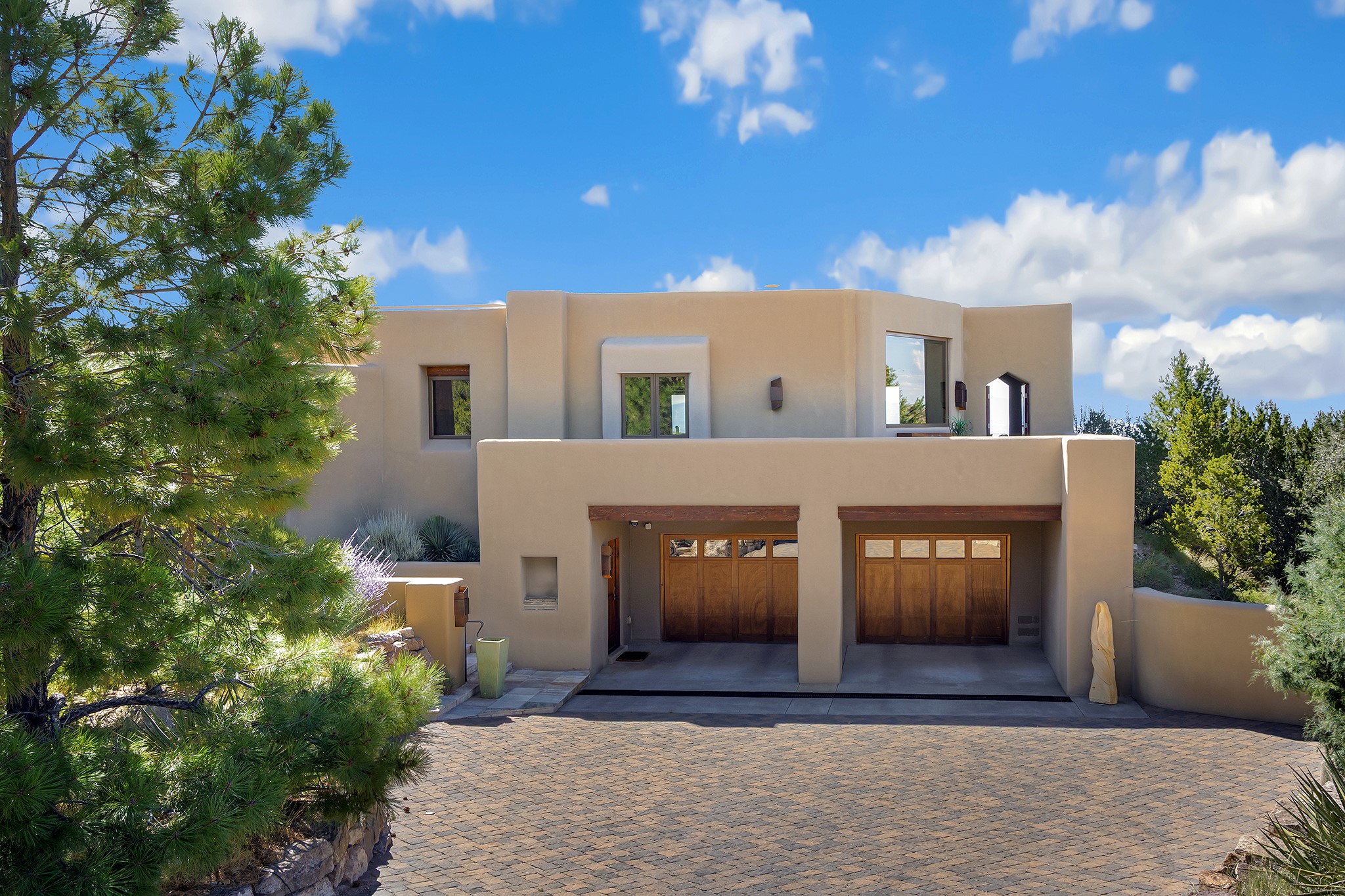 An exceptional Value in Bishop's Lodge Hills & Villas! Perched above the Tesuque hills on 2.38 acres, 9 Lodge Circle offers a rare combination of panoramic mountain views and a unique Southwestern design--all just minutes from the Plaza. Set within the gated community of Bishop's Lodge Hills and Villas, this extraordinary property includes a 4,300 sq. ft. main residence and a versatile 1,500 sq. ft. detached studio, with commanding views of both the Jemez and Sangre de Cristo mountain ranges. The main home is a masterclass in design, showcasing a unique architectural blend of contemporary and Southwestern influences. The central living area features disappearing glass doors that open to a sweeping west-facing portal--perfect for soaking in Santa Fe's golden-hour light. An outdoor cantina with a gas fireplace and built-in grill sets the stage for elegant al fresco entertaining.The chef's kitchen is equally inspired, with a spacious island, cozy banco, butler's pantry, dumbwaiter, and an expansive picture window framing the Sangres. A dramatic dining room with a raised octagonal ceiling and fireplace offers a captivating setting for both intimate and grand gatherings. The primary suite is a private sanctuary, complete with a secluded hot tub for sunset views and stargazing. Two guest suites each offer ensuite baths, while a separate office provides quiet space for work or reflection. The detached 1,500 sq. ft. studio--originally a woodworking shop-- brimming with potential as a creative studio, gym, or guest quarters. As a bonus, ownership includes social membership privileges at the world-renowned Bishop's Lodge Resort. With its new price of $3,395,000, this exceptional property presents a compelling value in one of Santa Fe's most coveted locations--where design, privacy, and inspiration converge.