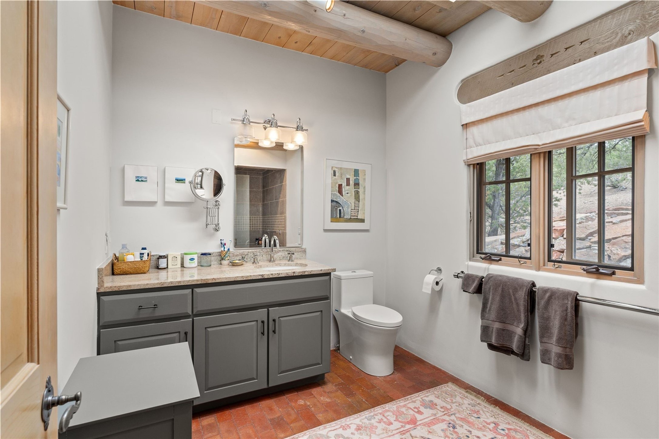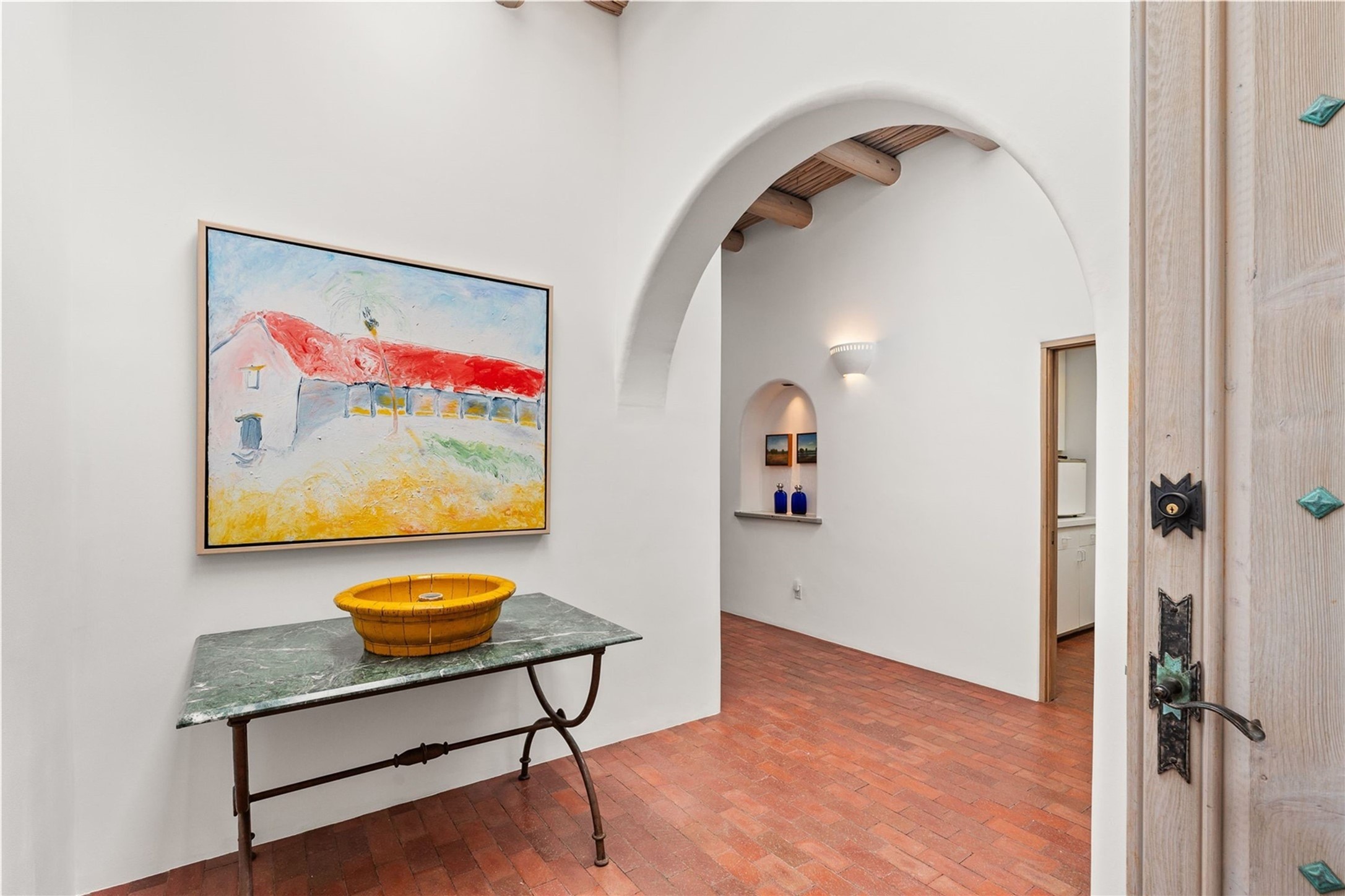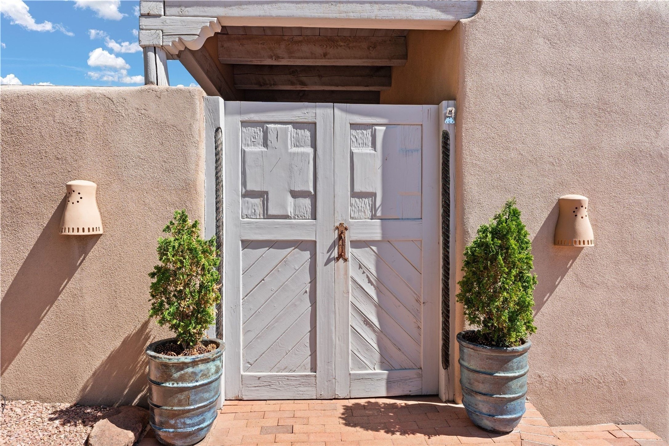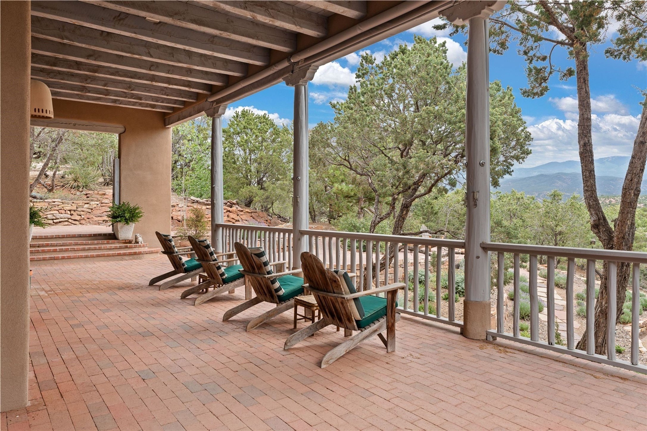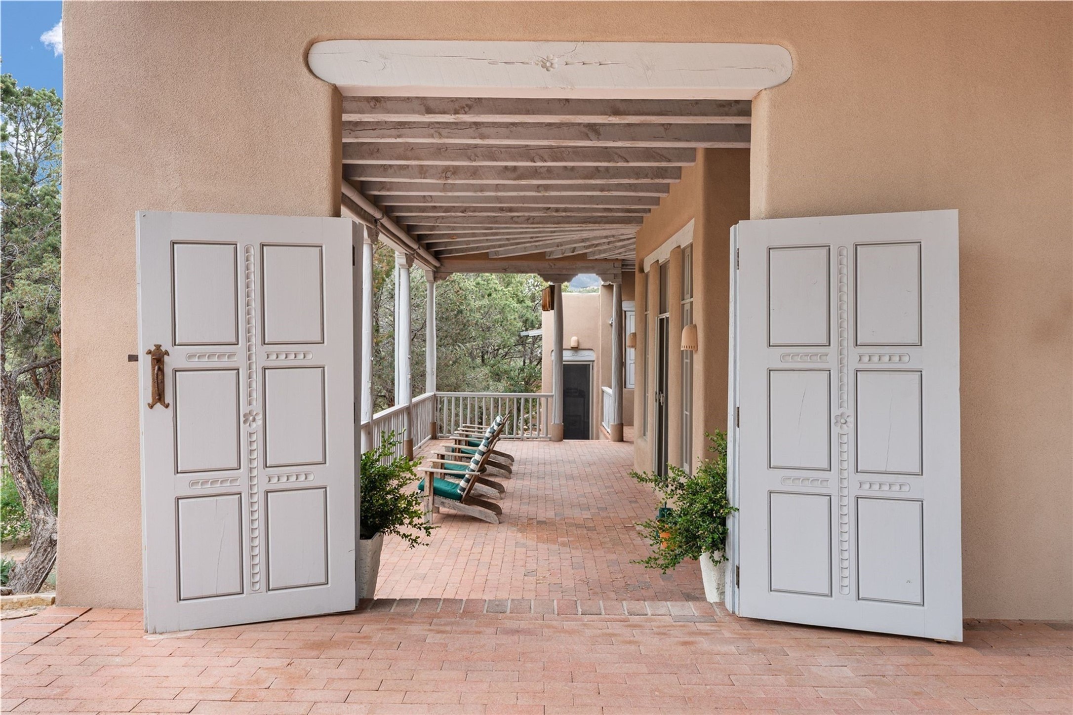 Gated Sangre de Cristo Estates 3 bedroom, 3.5 bath, single level, custom-built home with spectacular Sangre de Cristo Mountain views. Quality design features throughout include high ceilings, spacious rooms, vigas and beams, wood and brick floors, diamond finish plaster walls and arched doorways. Many recent improvements such as new (2023) membrane roof, completely renovated kitchen and baths, and brick driveways. Light and airy living room with stately fireplace. Spacious gourmet kitchen with high-end Bosch appliances, center island with Wolf gas range top, plentiful cabinetry and an informal breakfast room. Dining room with French doors and built in cabinetry. Dedicated personal library with a wood burning kiva fireplace and French doors to the outside in addition to a second living area or media room. There are 3-bedroom suites set apart from one another. Primary suite includes a kiva fireplace, sitting area and a wall of doors to the outside. Bonus flex space can be a personal gym or office. 2-car attached garage. The deep portals provide space for large events or leisurely relaxation in a secluded setting among mature pions and aspens, established landscaping, and sweeping mountain views. Conveniently located with easy access to 84/285 and only minutes away from the Santa Fe Opera and the historic downtown Plaza.