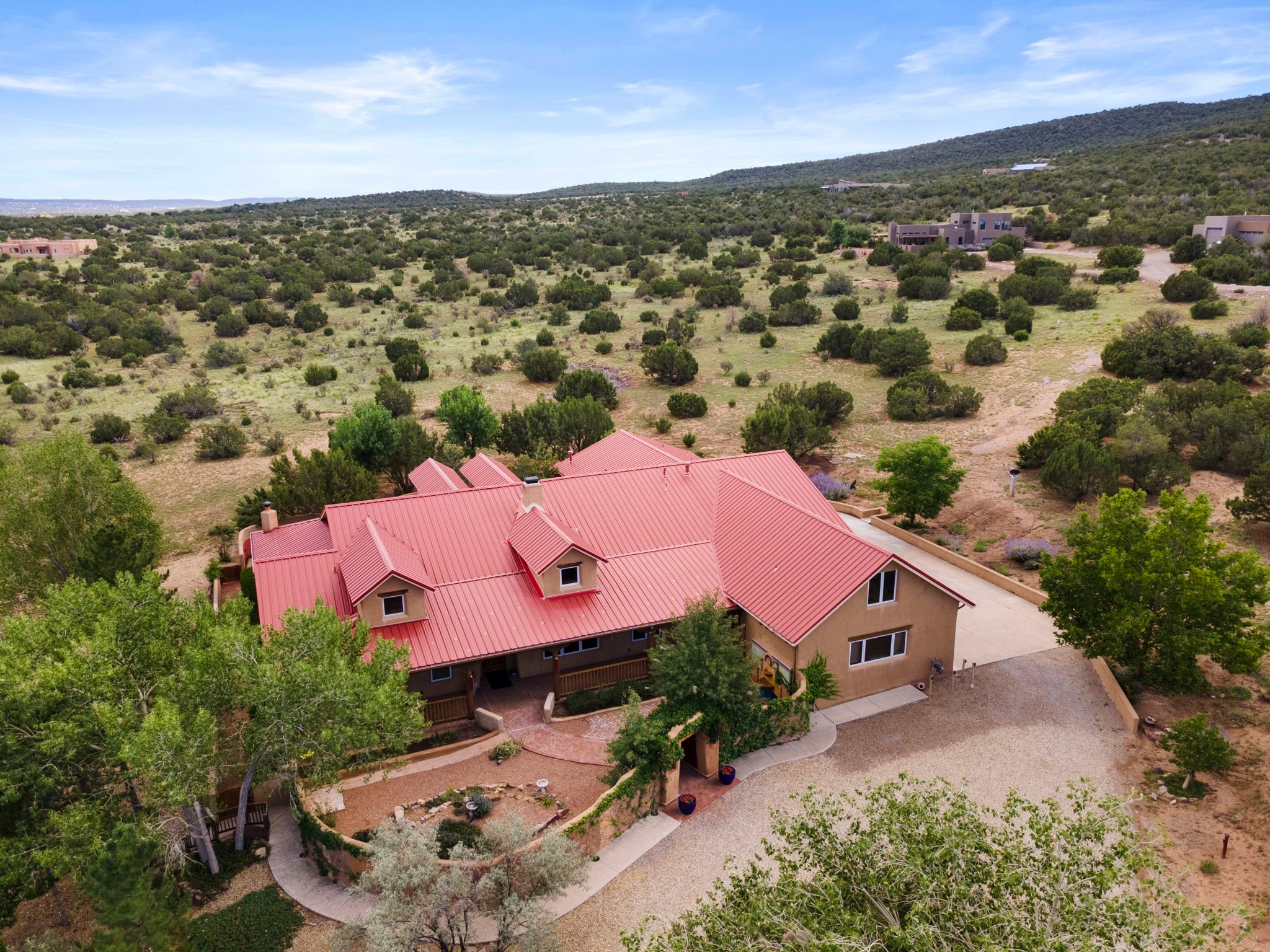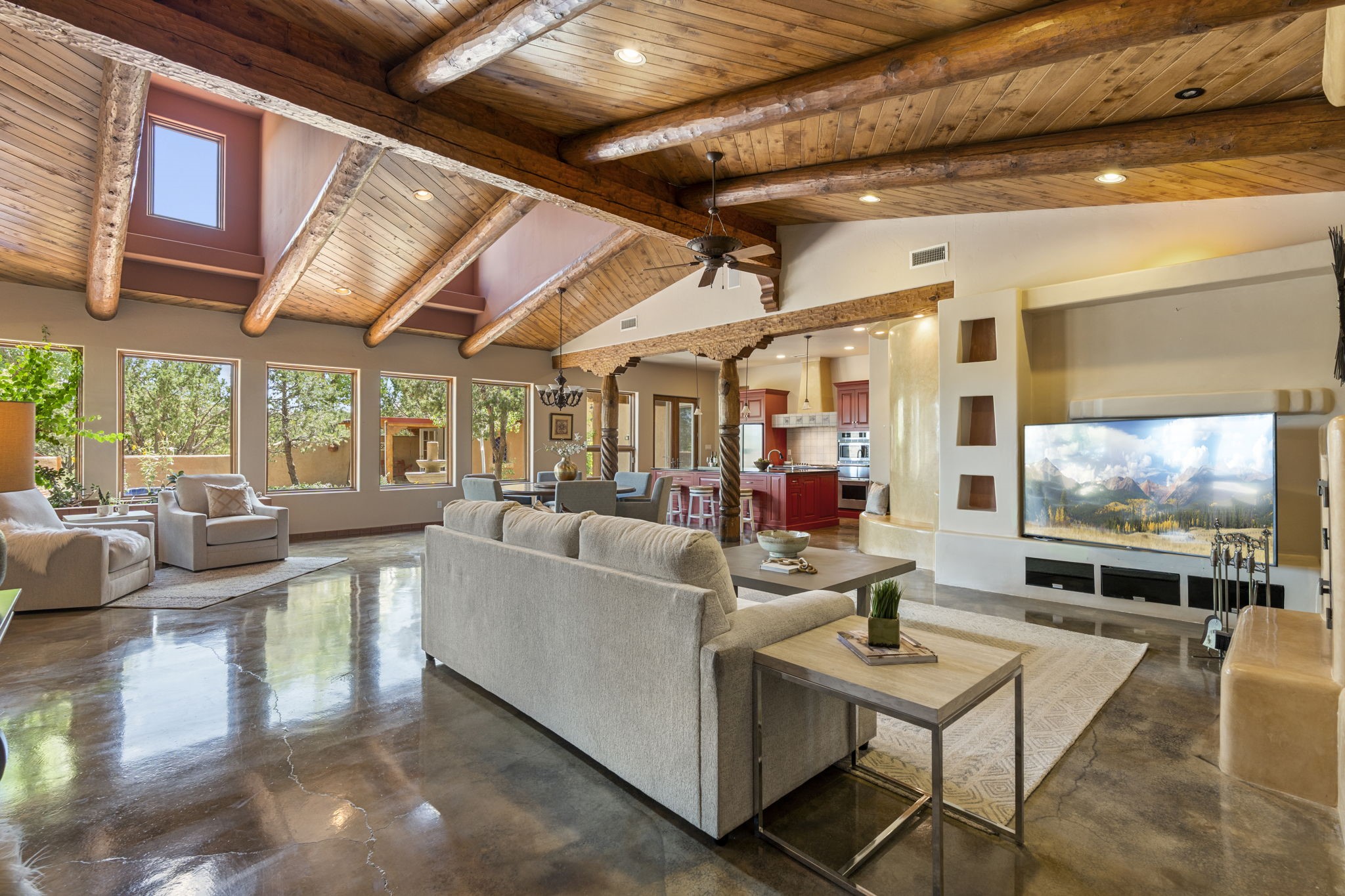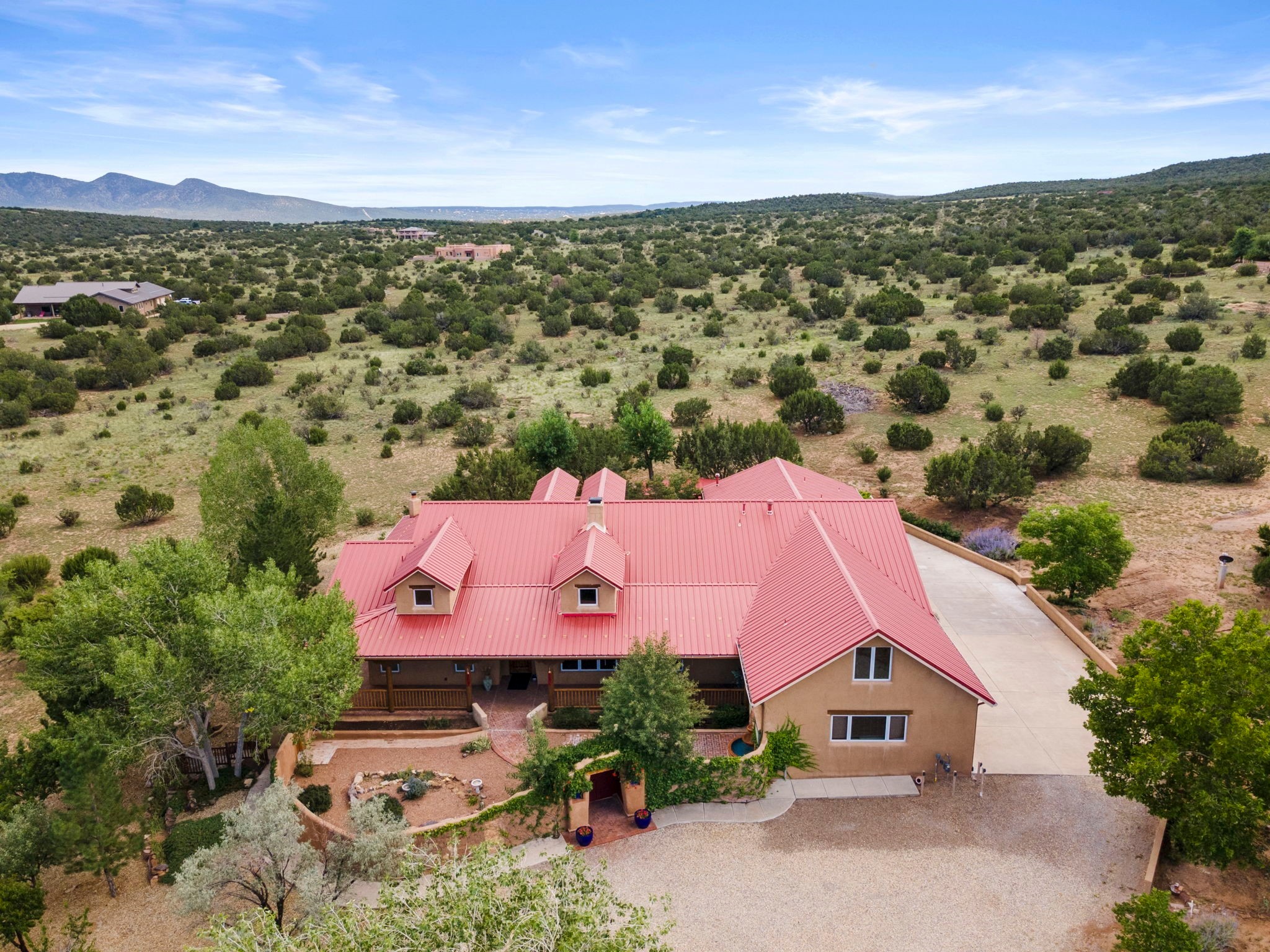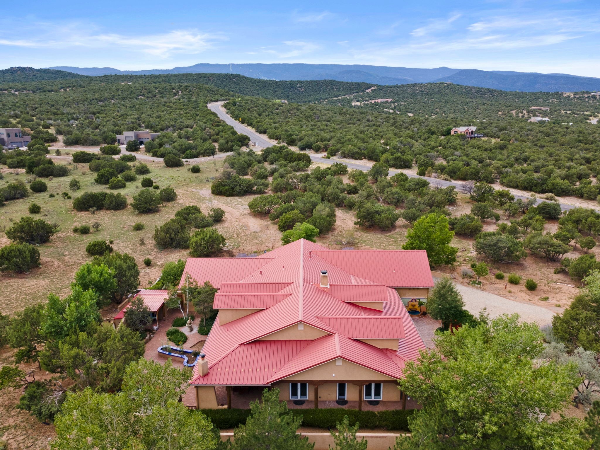 Artistic Mountain Home set on 10.14 private acres in San Pedro Creek, this distinctive 4 bedroom, 4 bath home is a true work of art- blending traditional Northern New Mexican design with creative, custom craftsmanship throughout. Built to inspire, the residence features expansive open-concept living with polished concrete floors, a dual-sided fireplace connecting the living and library areas, and large windows that frame panoramic views of ridges and endless skies. The kitchen is warm and welcoming, with artisanal cabinetry, handcrafted tile, and a layout that encourages gathering and creativity. The home features two separate bathrooms and walk-in closets within the primary bedroom making this space truly one of a kind! As you walk through, you'll be surrounded by beauty from thehand-painted murals, handmade tiles, and natural materials create a rich, organic feel throughout- tied with sleek modern touches in the tankless, wall-hung toilets and the zero entry showers. The office and a separate library offer quiet spaces for work or reading, while the light-filled attic studio is ideal for artists, writers, or anyone seeking a peaceful retreat above the trees. Outdoor living is just as intentional as the interior with all rooms having their own entrance to the exterior- leading to multiple patios and seating areas including an outdoor fireplace and a separate firepit, perfect for stargazing, storytelling, and cool desert evenings. A charming potting shed supports gardening and outdoor projects. The land offers room to roam, with space for gardens, or simply quiet observation of the surrounding wildlife and native flora. Schedule your private showing today!