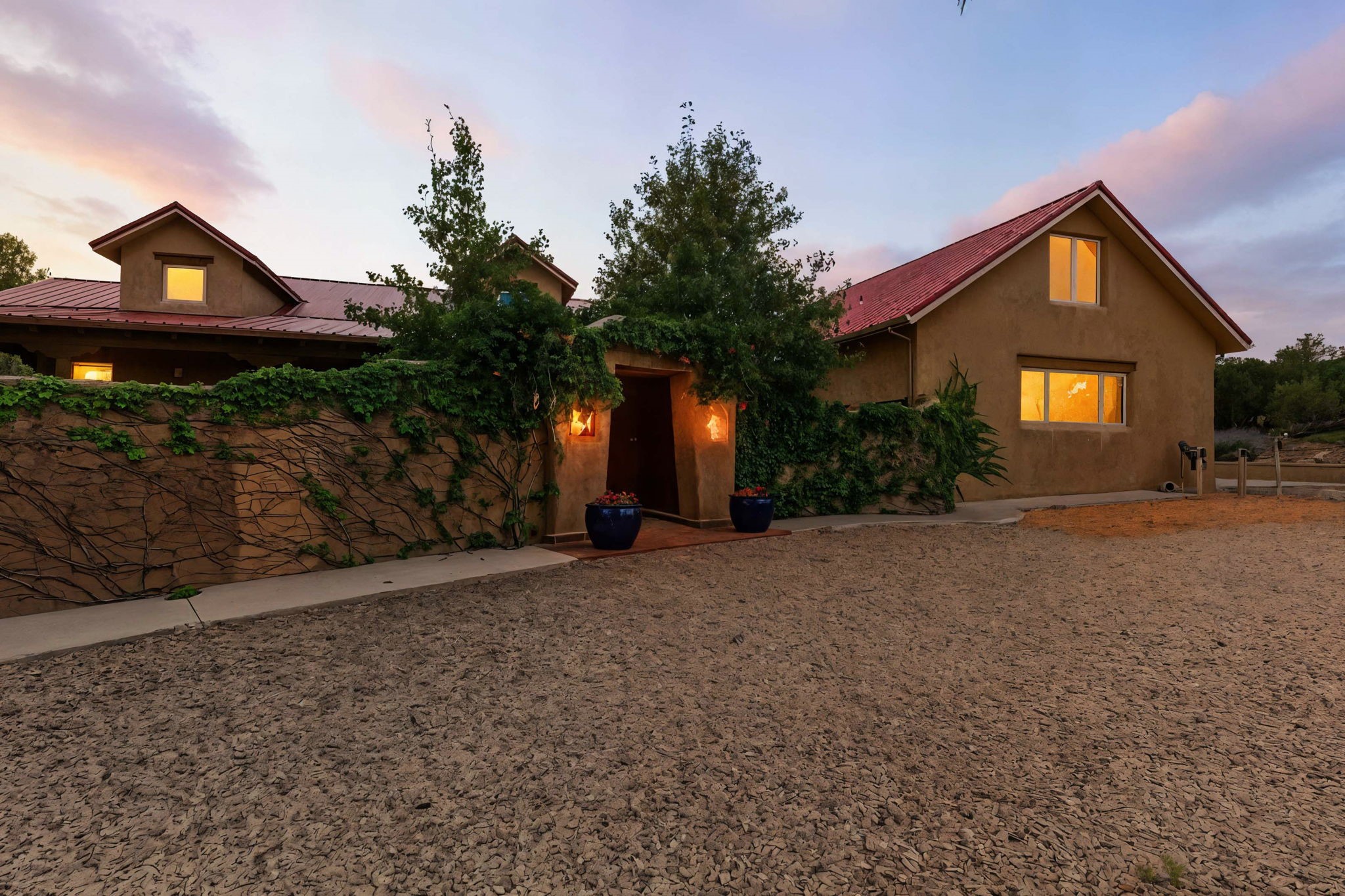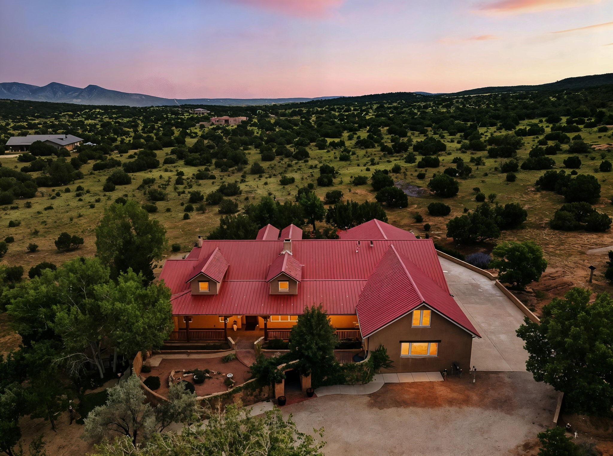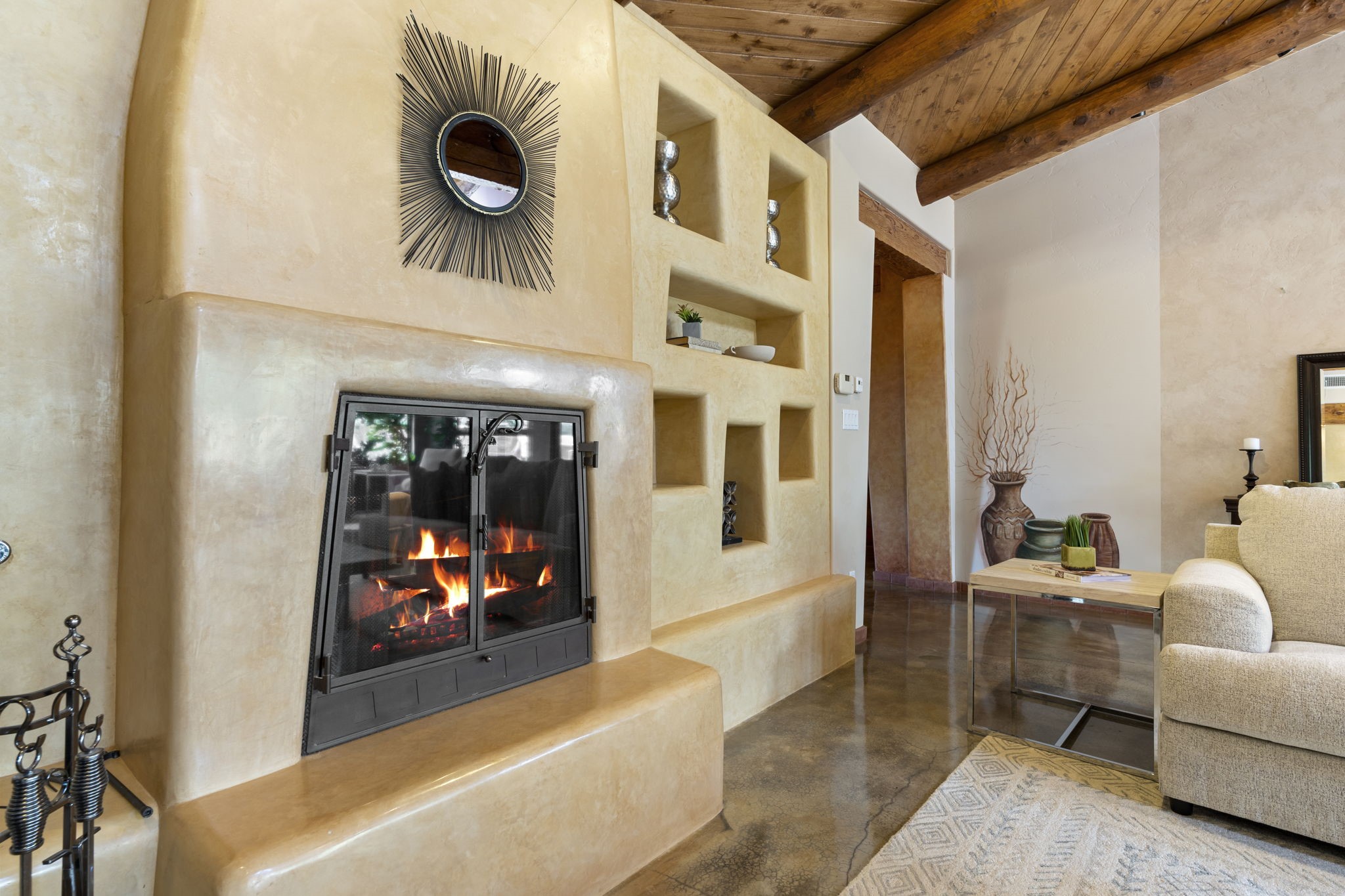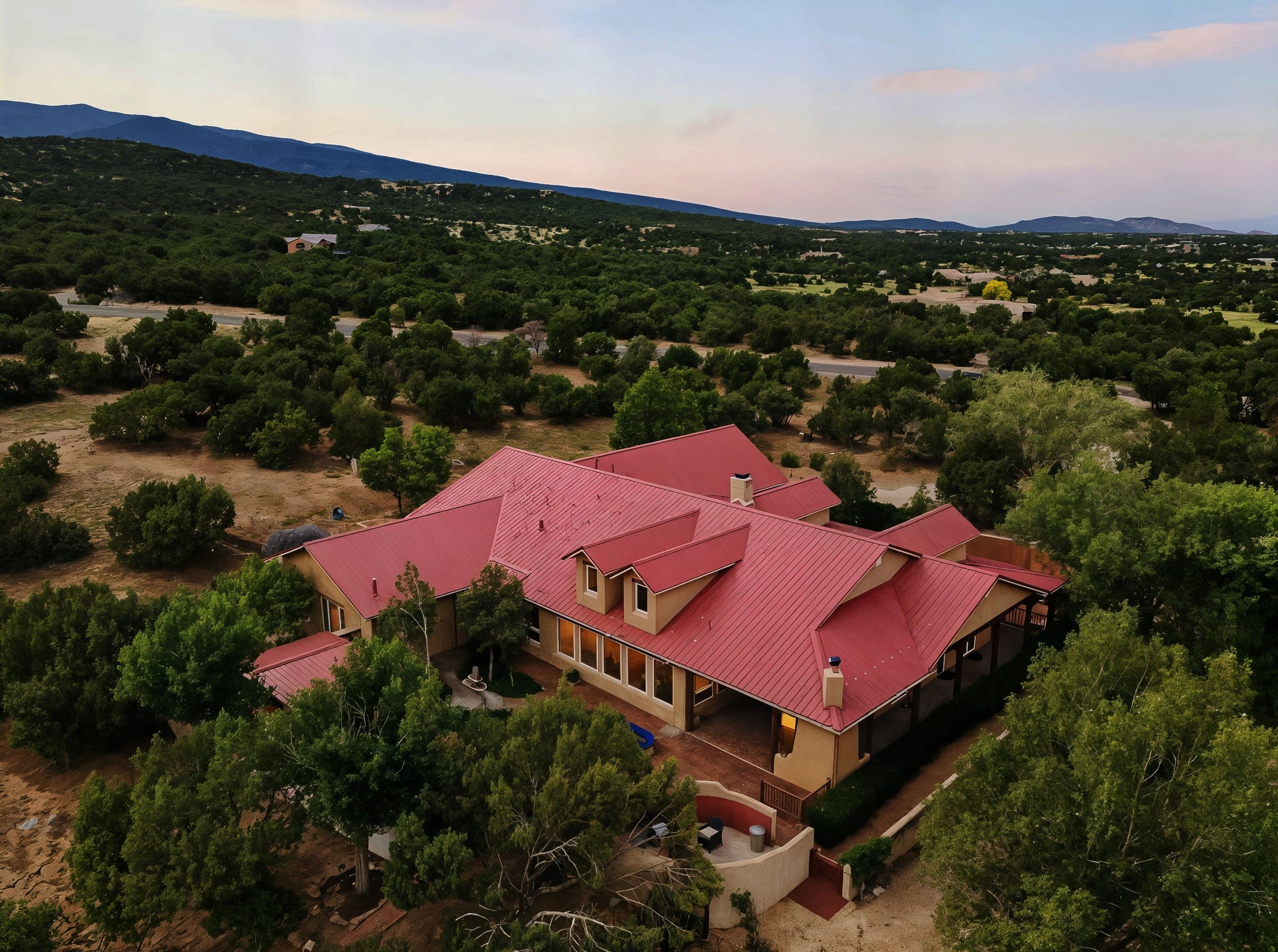 Artistic Mountain Home set on 10.14 private acres in San Pedro Creek, this distinctive 4 bedroom, 4 bath home is a true work of art- blending traditional Northern New Mexican design with creative, custom craftsmanship throughout. Built to inspire, the residence features expansive open-concept living with polished concrete floors, a dual-sided fireplace connecting the living and library areas, and large windows that frame panoramic views of ridges and endless skies. The kitchen is warm and welcoming, with artisanal cabinetry, handcrafted tile, and a layout that encourages gathering and creativity. The home features two separate bathrooms and walk-in closets within the primary bedroom making this space truly one of a kind! As you walk through, you'll be surrounded by beauty from thehand-painted murals, handmade tiles, and natural materials create a rich, organic feel throughout- tied with sleek modern touches in the tankless, wall-hung toilets and the zero entry showers. The office and a separate library offer quiet spaces for work or reading, while the light-filled attic studio is ideal for artists, writers, or anyone seeking a peaceful retreat above the trees. Outdoor living is just as intentional as the interior with all rooms having their own entrance to the exterior- leading to multiple patios and seating areas including an outdoor fireplace and a separate firepit, perfect for stargazing, storytelling, and cool desert evenings. A charming potting shed supports gardening and outdoor projects. The land offers room to roam, with space for gardens, or simply quiet observation of the surrounding wildlife and native flora. Schedule your private showing today!
