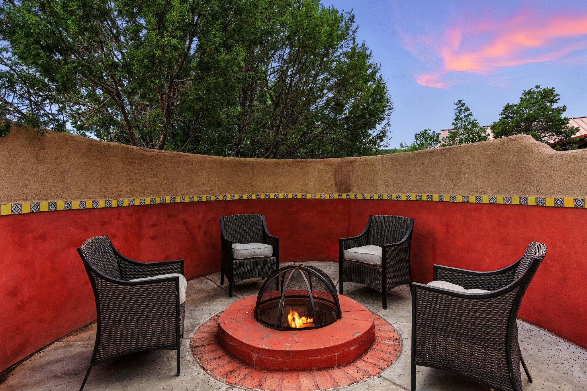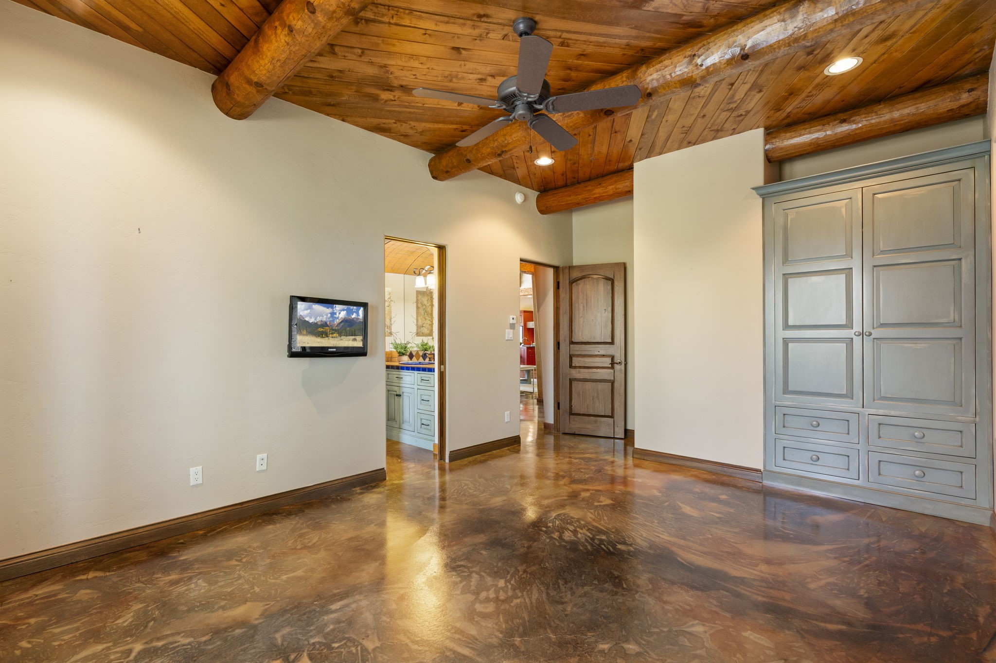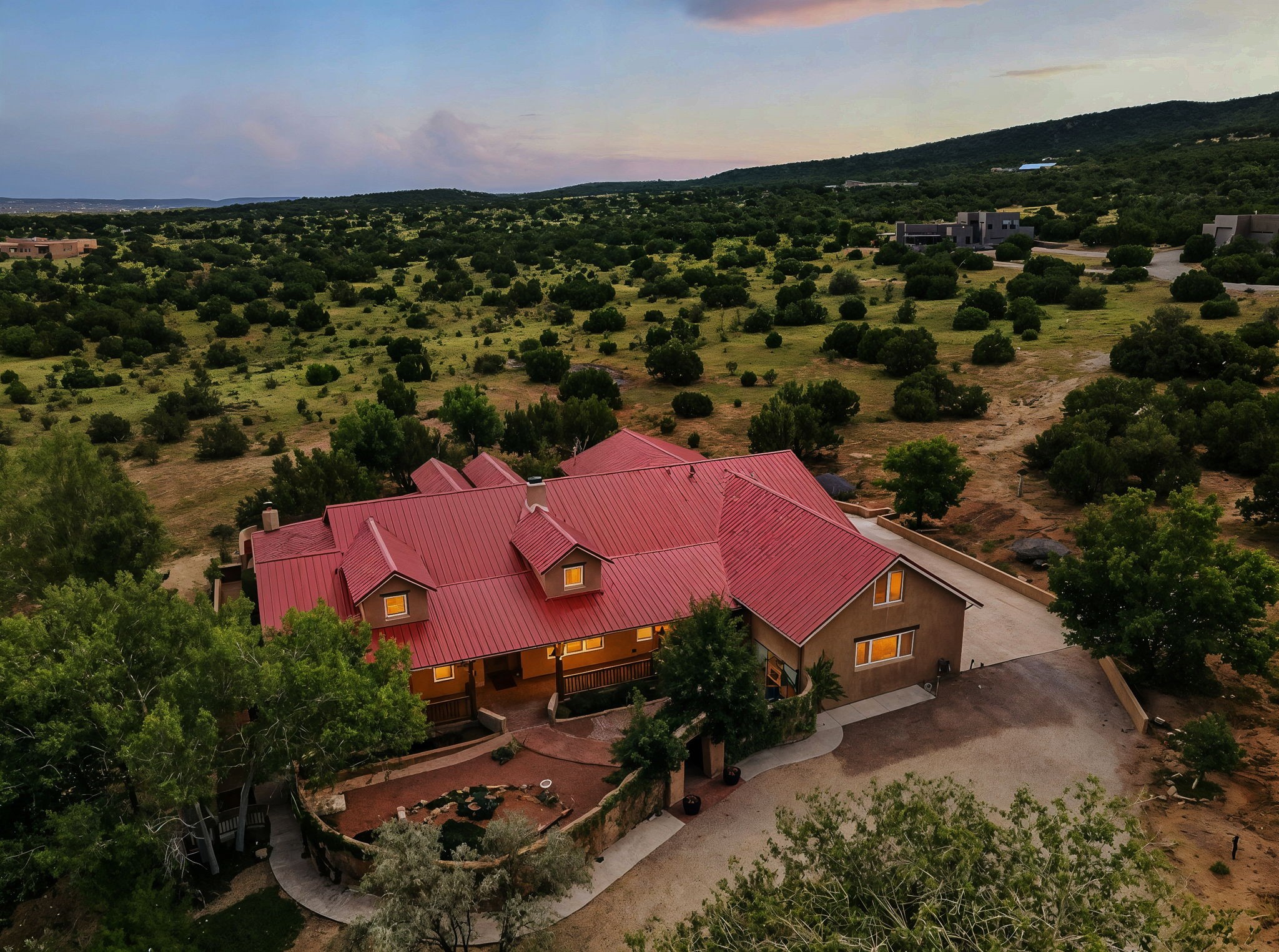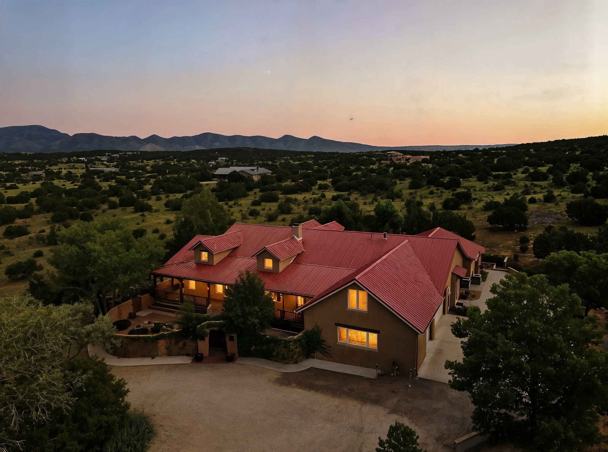 Artistic Mountain Home set on 10.14 private acres in San Pedro Creek, this distinctive 4 bedroom, 4 bath home is a true work of art- blending traditional Northern New Mexican design with creative, custom craftsmanship throughout. Built to inspire, the residence features expansive open-concept living with polished concrete floors, a dual-sided fireplace connecting the living and library areas, and large windows that frame panoramic views of ridges and endless skies. The kitchen is warm and welcoming, with artisanal cabinetry, handcrafted tile, and a layout that encourages gathering and creativity. The home features two separate bathrooms and walk-in closets within the primary bedroom making this space truly one of a kind! As you walk through, you'll be surrounded by beauty from thehand-painted murals, handmade tiles, and natural materials create a rich, organic feel throughout- tied with sleek modern touches in the tankless, wall-hung toilets and the zero entry showers. The office and a separate library offer quiet spaces for work or reading, while the light-filled attic studio is ideal for artists, writers, or anyone seeking a peaceful retreat above the trees. Outdoor living is just as intentional as the interior with all rooms having their own entrance to the exterior- leading to multiple patios and seating areas including an outdoor fireplace and a separate firepit, perfect for stargazing, storytelling, and cool desert evenings. A charming potting shed supports gardening and outdoor projects. The land offers room to roam, with space for gardens, or simply quiet observation of the surrounding wildlife and native flora. Schedule your private showing today!