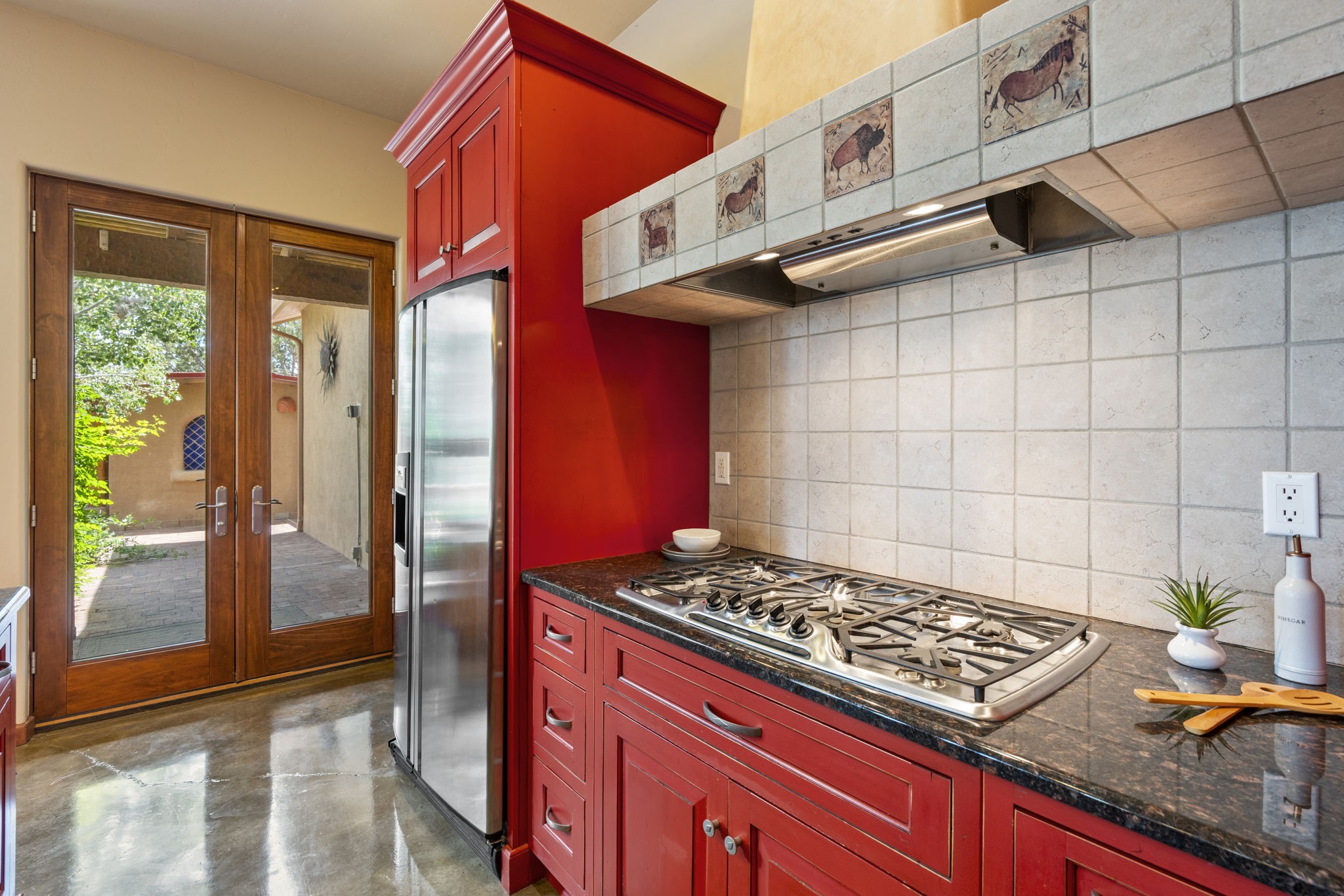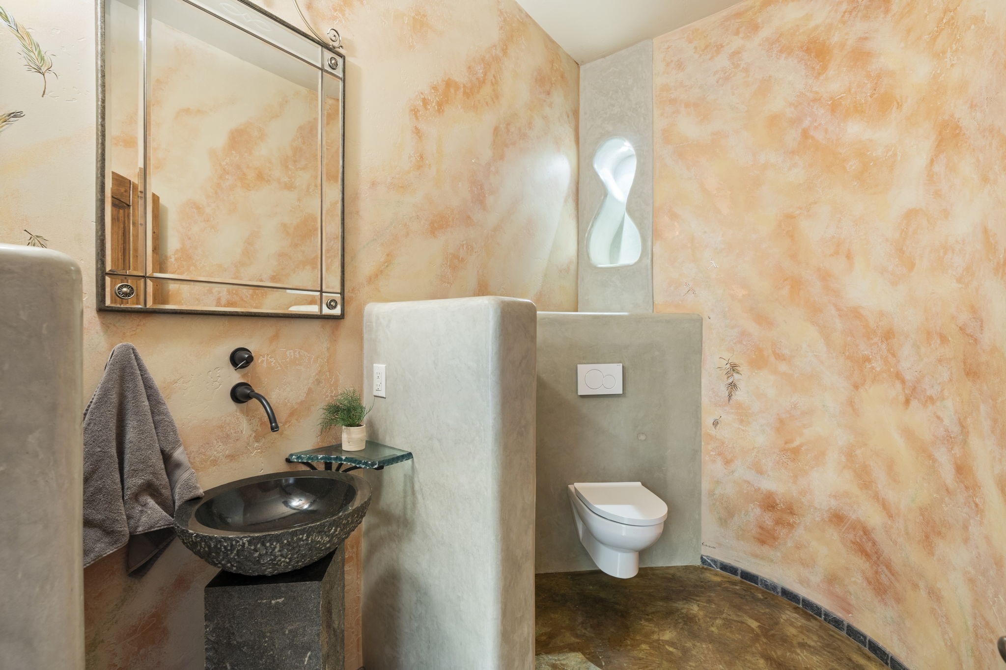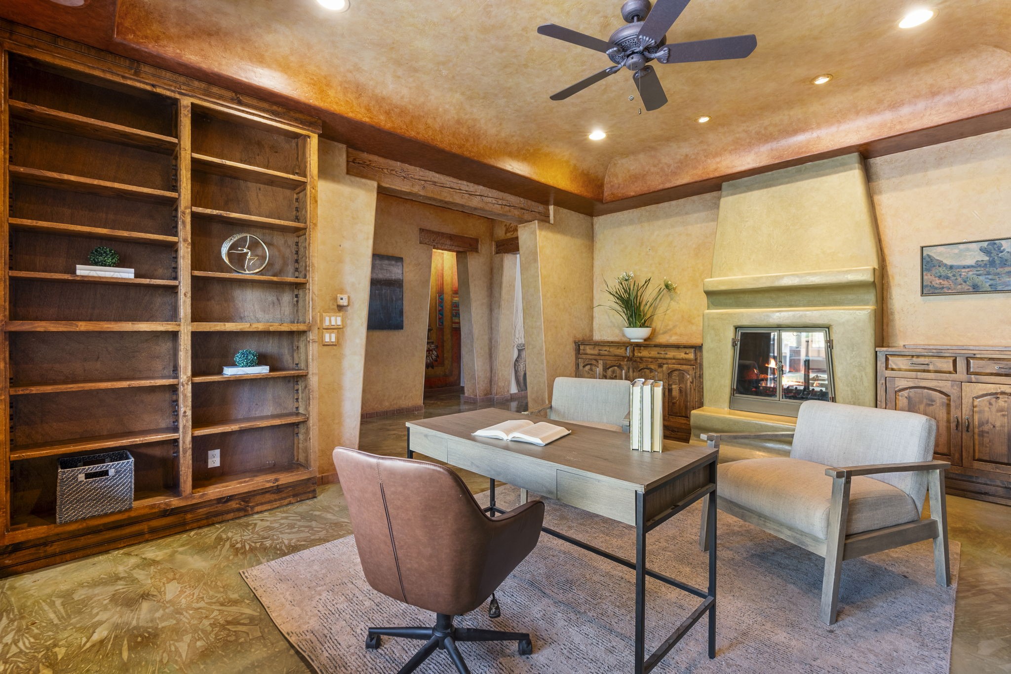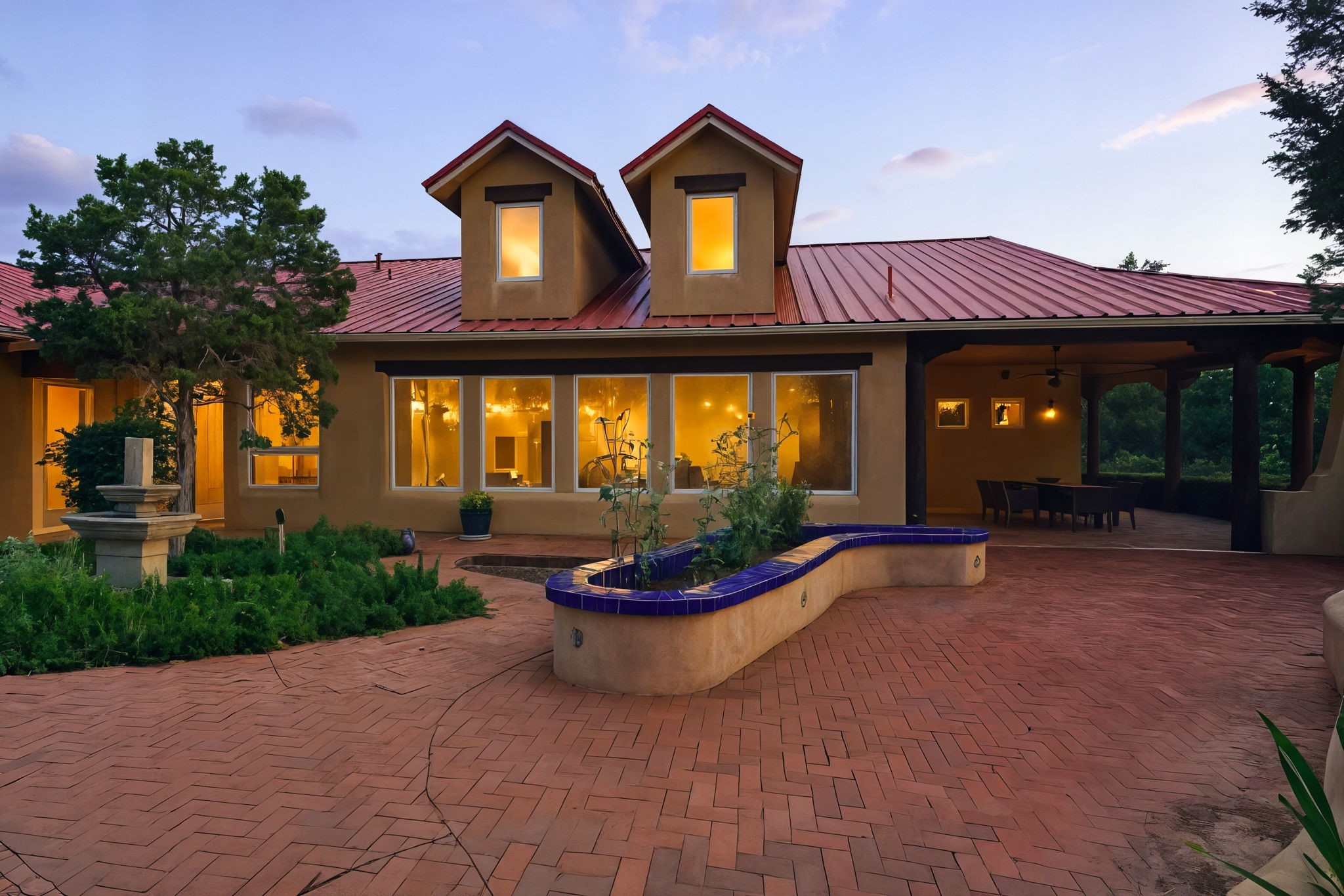Artistic Mountain Home set on 10.14 private acres in San Pedro Creek, this distinctive 4 bedroom, 4 bath home is a true work of art- blending traditional Northern New Mexican design with creative, custom craftsmanship throughout. Built to inspire, the residence features expansive open-concept living with polished concrete floors, a dual-sided fireplace connecting the living and library areas, and large windows that frame panoramic views of ridges and endless skies. The kitchen is warm and welcoming, with artisanal cabinetry, handcrafted tile, and a layout that encourages gathering and creativity. The home features two separate bathrooms and walk-in closets within the primary bedroom making this space truly one of a kind! As you walk through, you'll be surrounded by beauty from thehand-painted murals, handmade tiles, and natural materials create a rich, organic feel throughout- tied with sleek modern touches in the tankless, wall-hung toilets and the zero entry showers. The office and a separate library offer quiet spaces for work or reading, while the light-filled attic studio is ideal for artists, writers, or anyone seeking a peaceful retreat above the trees. Outdoor living is just as intentional as the interior with all rooms having their own entrance to the exterior- leading to multiple patios and seating areas including an outdoor fireplace and a separate firepit, perfect for stargazing, storytelling, and cool desert evenings. A charming potting shed supports gardening and outdoor projects. The land offers room to roam, with space for gardens, or simply quiet observation of the surrounding wildlife and native flora. Schedule your private showing today!