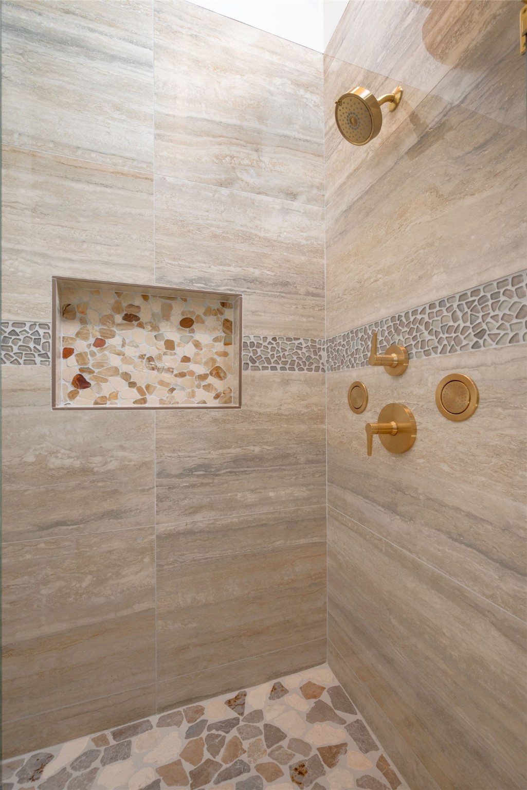 New construction throughout with a beautifully designed and hand-crafted adobe remodel and addition, this home blends classic Santa Fe style with modern comfort. A charming private courtyard greets you before the front door opens to a light-filled living room with high ceilings, exposed vigas, hand-troweled plaster walls, wood floors, and a custom-designed fireplace with quartz stone mantles. The gourmet kitchen features custom Alder cabinets, a built-in Wolf cooktop and oven, Fisher & Paykel refrigerator/freezer, Bosch dishwasher, quartz stone countertops, custom hardware and lighting, and travertine stone tile floors. The thoughtful three-bedroom, two-bath floor plan provides excellent separation between the luxurious primary suite and the additional bedrooms. One bedroom, located near the kitchen with its own entrance, offers flexibility for guests or use as a home office/den, with easy access to the courtyard. The primary suite exudes a spa-like feel, with warm plaster tones, natural wood finishes, custom Alder cabinetry and vanities, Italian porcelain tile surrounds, quartz countertops, a whirlpool bath, and a Kohler shower with body sprays. Additional bath features include mirrored, lighted anti-fog cabinets, a built-in makeup table with a lighted mirror, and elegant fixtures throughout. Other highlights include a custom-built entry gate, solid Alder doors, refrigerated air conditioning and heating, Pella windows, and Hunter Douglas blinds. Ideal as a full-time residence or a Santa Fe getaway, this home combines craftsmanship, comfort, and style in a prime location.