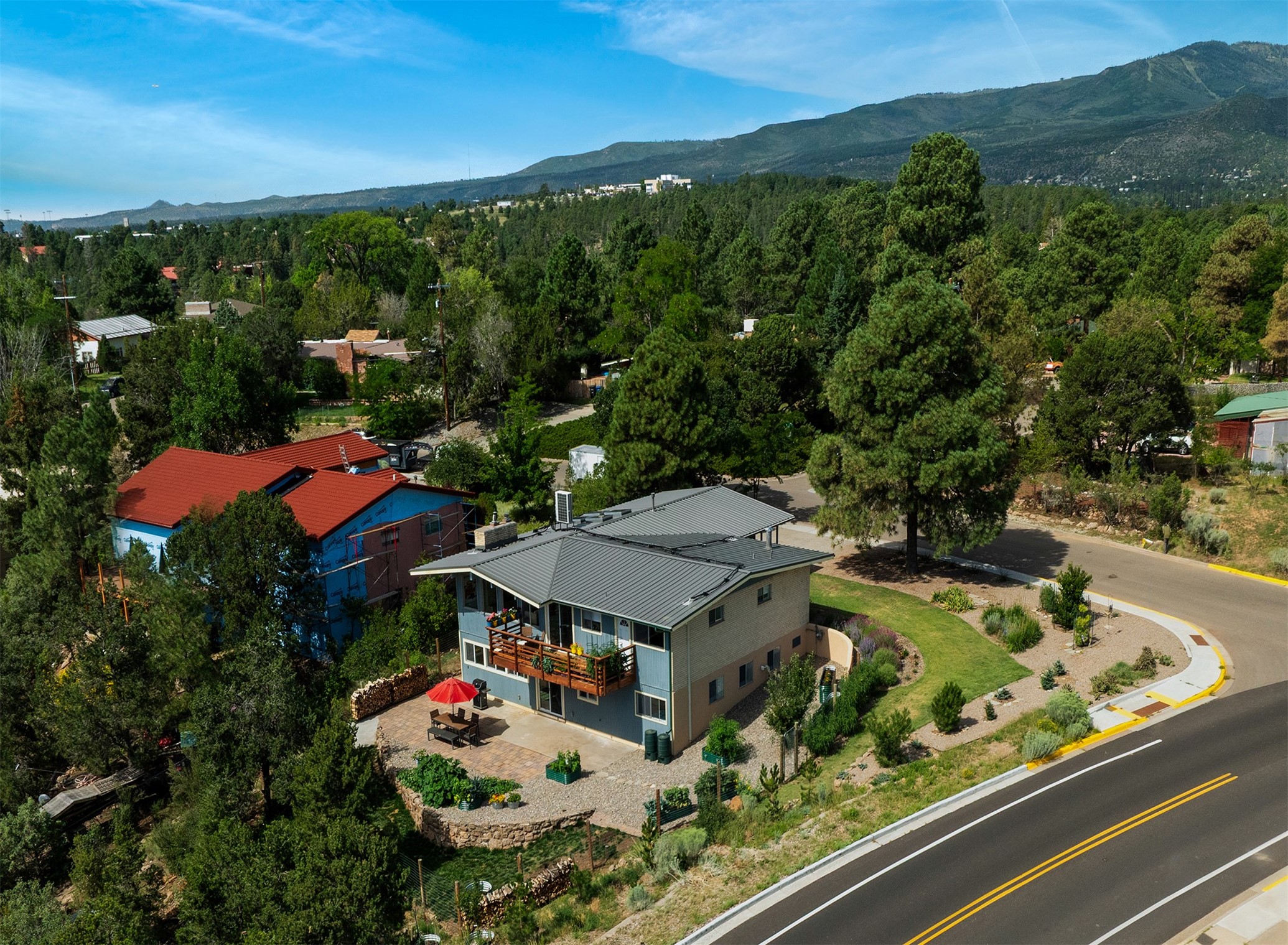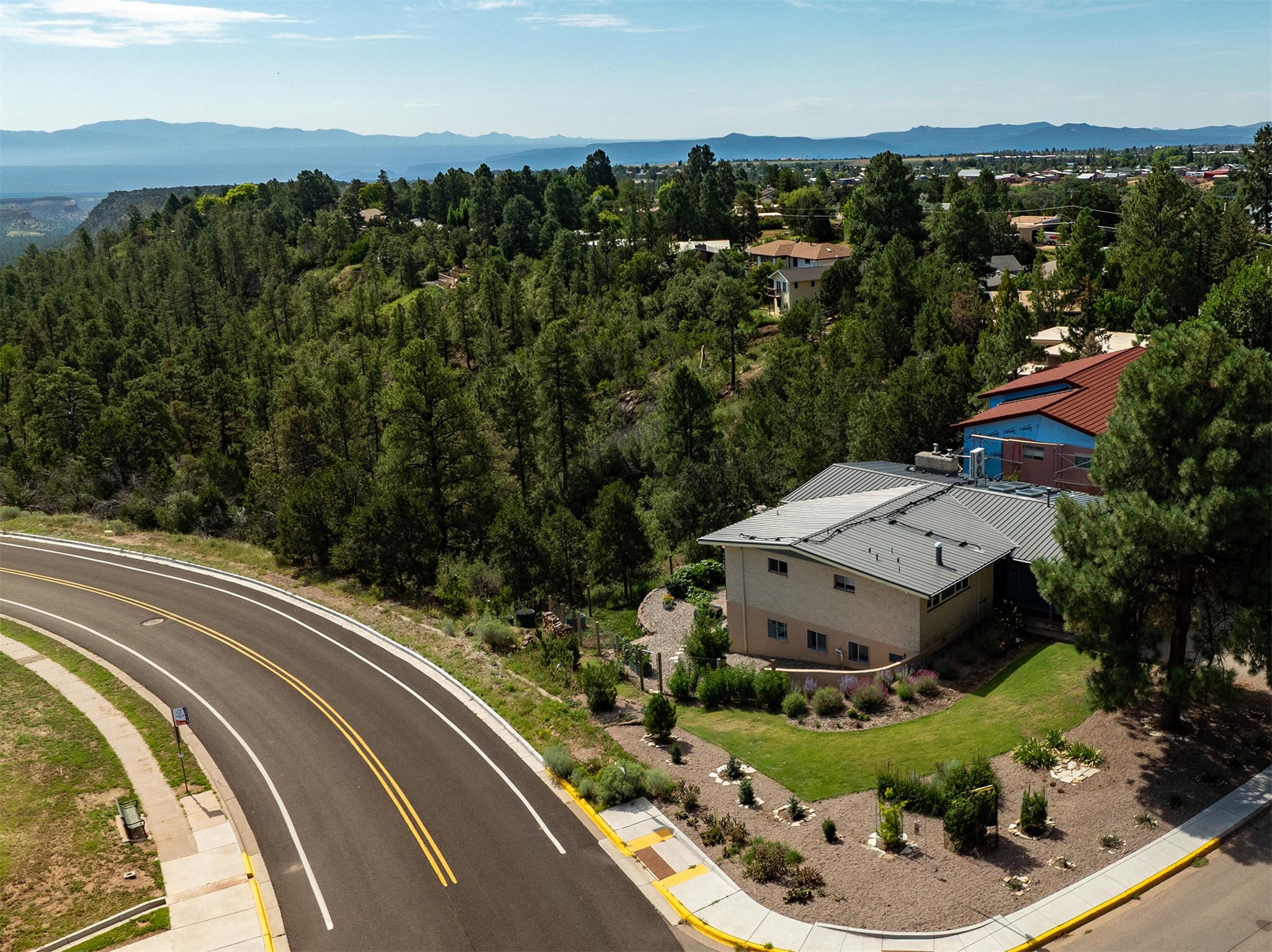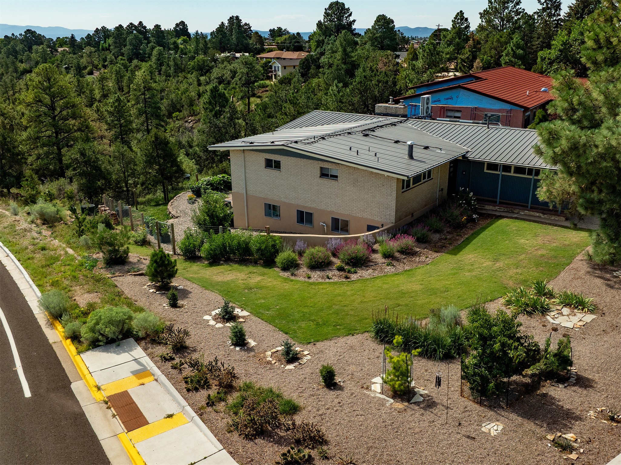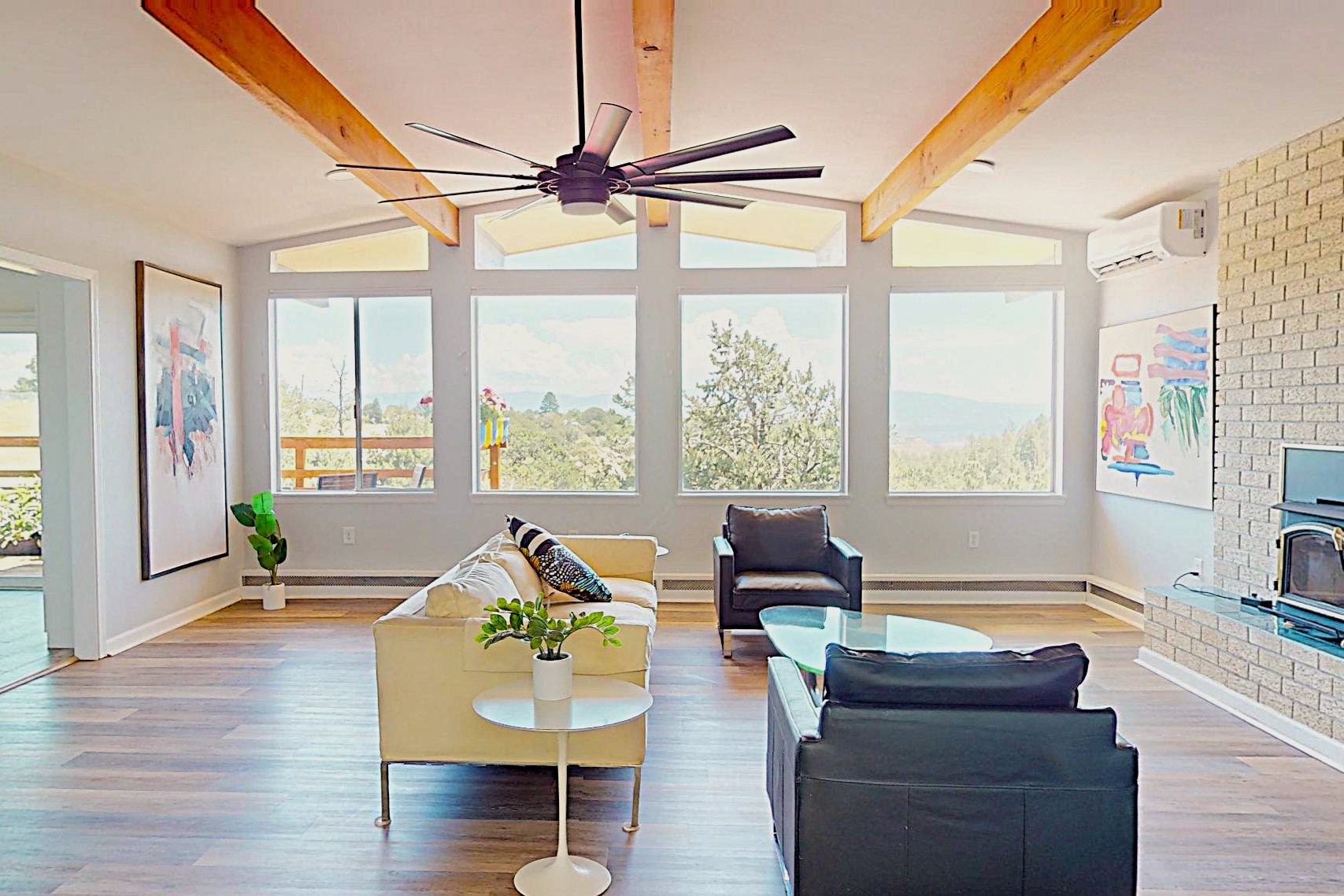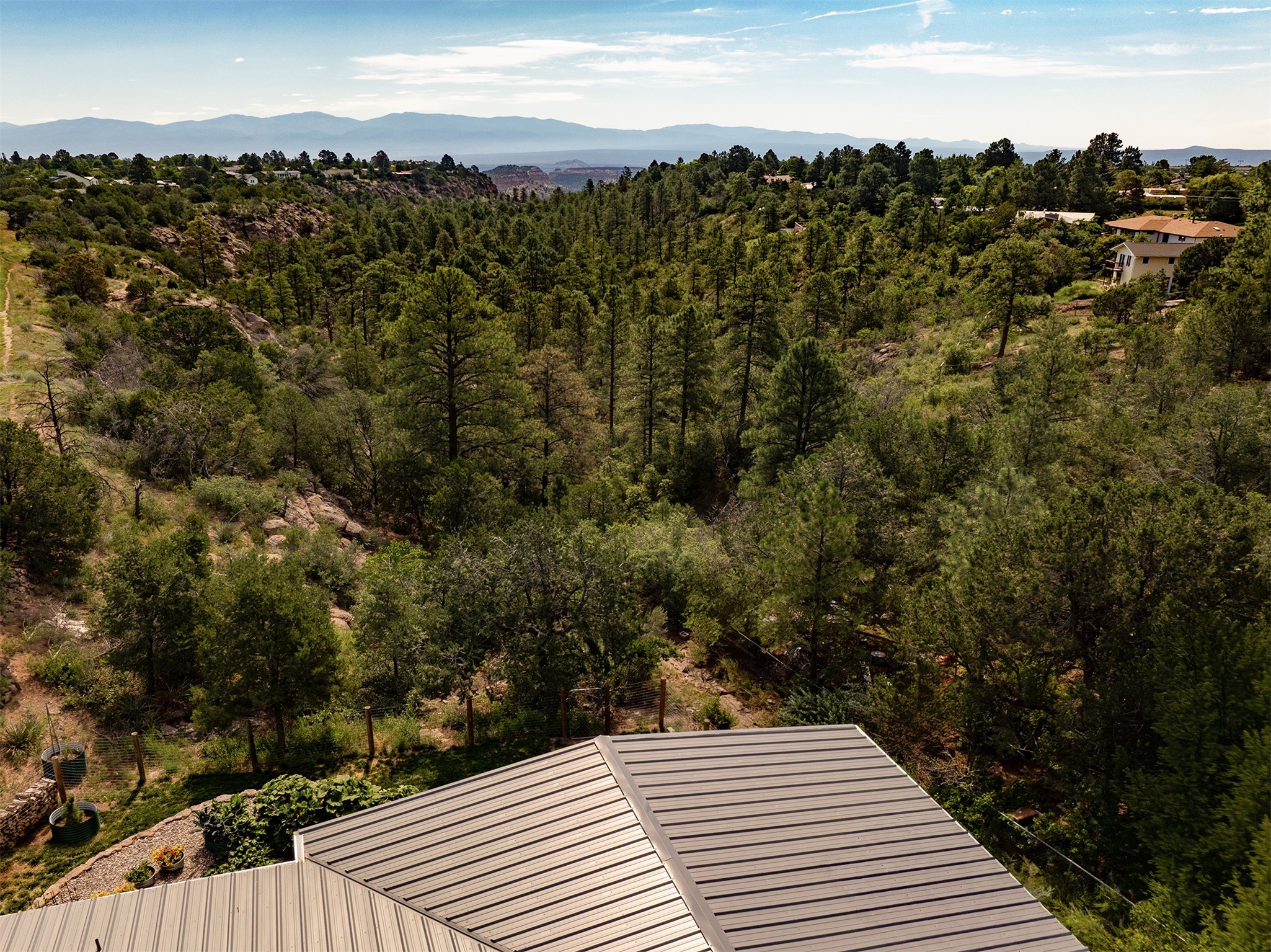 Perched on the canyon's edge, this 3,200+ sq. ft. home offers sweeping canyon and mountain views. The sun-filled entry atrium, with expansive windows and flagstone flooring, welcomes you into the home with a versatile space that offers so many options. Through French doors, the spacious living room features vaulted ceilings with exposed beams, a cozy fireplace, and picture windows that frame the stunning scenery. The living area opens to the kitchen, complete with updated cabinetry, quartz countertops, and stainless-steel appliances, including a Bosch dishwasher and a Caf dual-oven induction stove. Just off the kitchen is a deck where you can enjoy spectacular sunrises or evening shade with canyon breezes. The main level hosts a primary suite with an ensuite bath featuring shaker style cabinets and a curved-glass shower. A second bedroom with deck access and a full bath complete this level. Downstairs, a large den with brick fireplace opens to the fully fenced backyard, joined by a third bedroom, full bath, generous laundry room, and abundant storage. Mini splits create year-round comfort, complemented by gas hot water heat and two fireplace inserts. Outdoor amenities include terraced landscaping, a covered patio, and a backyard with access to the historic Gonzales Road Trail, connecting to the Bayo Canyon Trail system. Barranca Elementary, community pool, tennis courts, soccer fields, and a park with pavilion are all close by. Upgrades include: 2025: Quartz countertop, sink, disposal, ceiling fans, and entry door, 2024: South side re-stuccoed, new gutters/guard rails, refrigerator, and microwave, 2023: dishwasher, dual oven stove, vinyl plank flooring in living room/bedrooms, xeriscaping, and backyard patio 2022: Metal roof, mini splits, garage doors, fencing, water heater, washer/dryer and bathroom updates. With so many recent improvements, this home feels fresh, modern. Don't miss this one. Schedule your showing today!