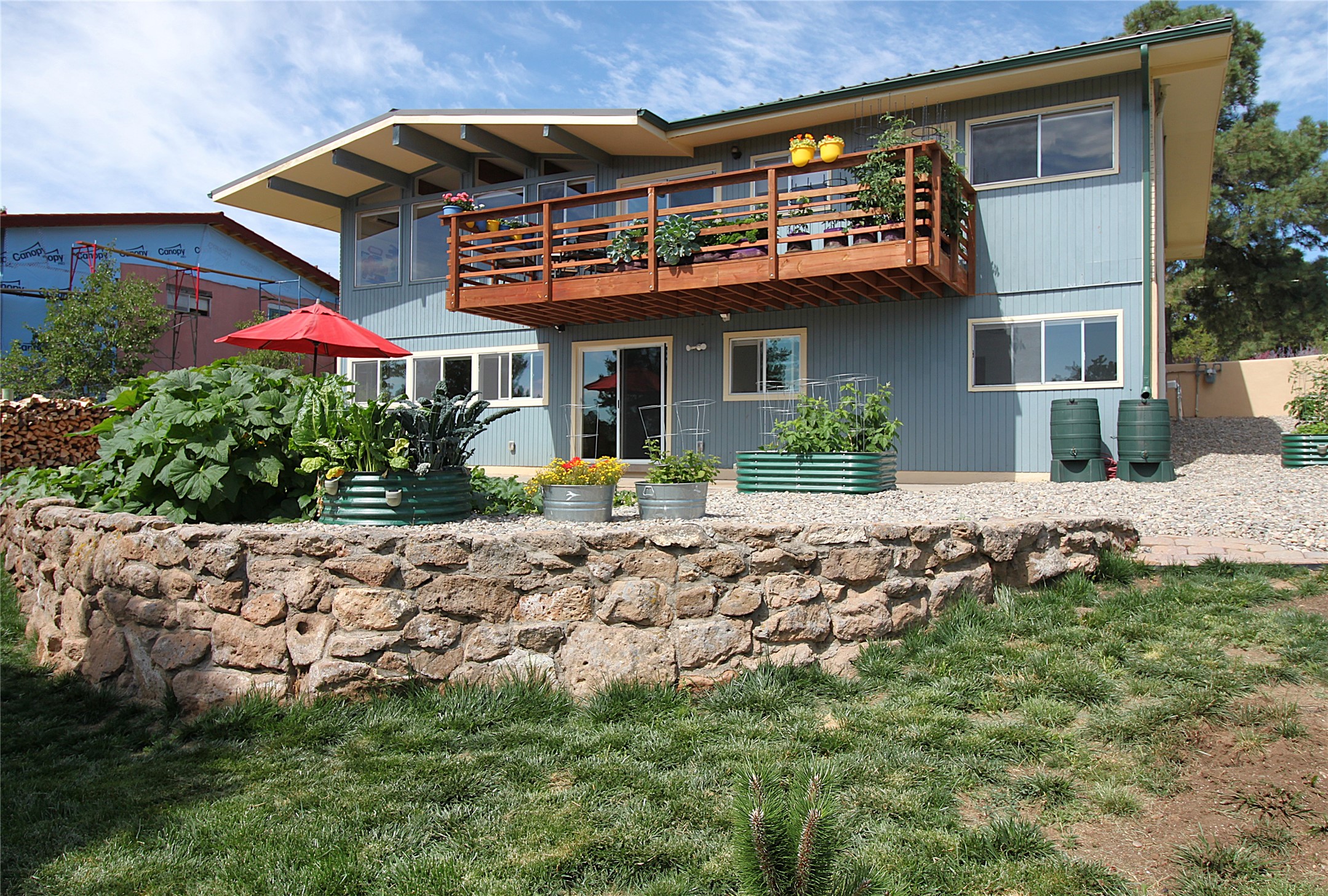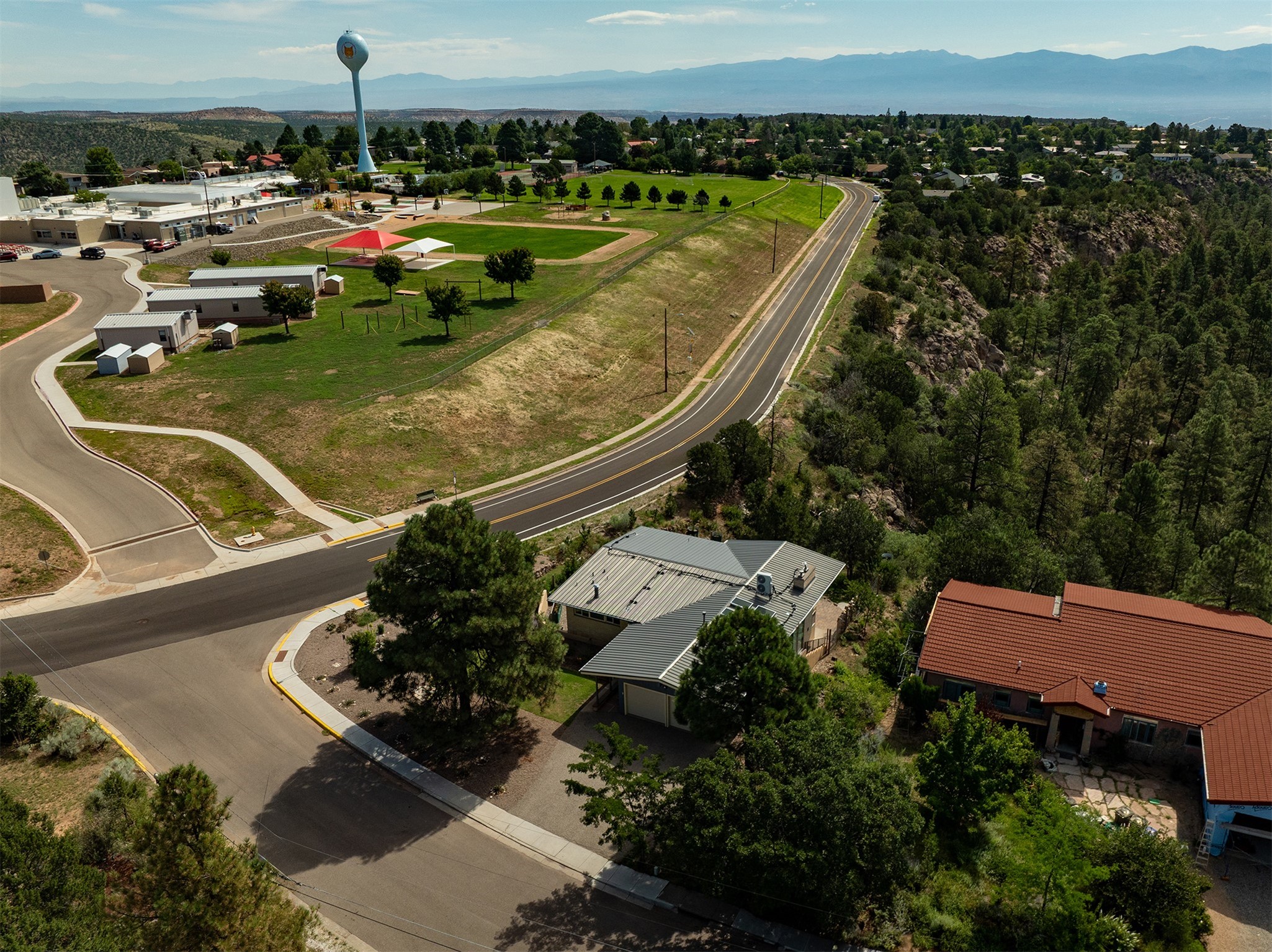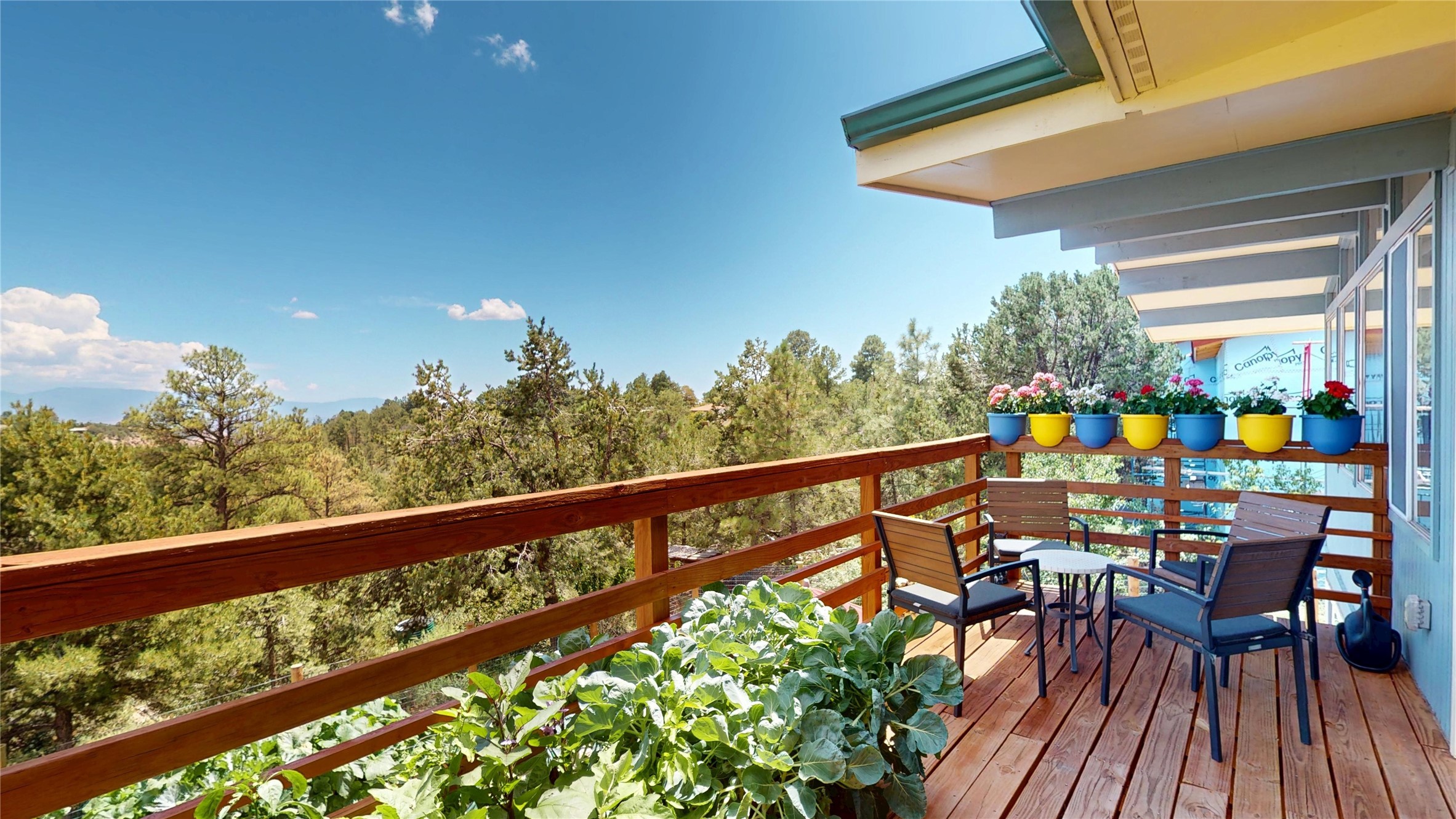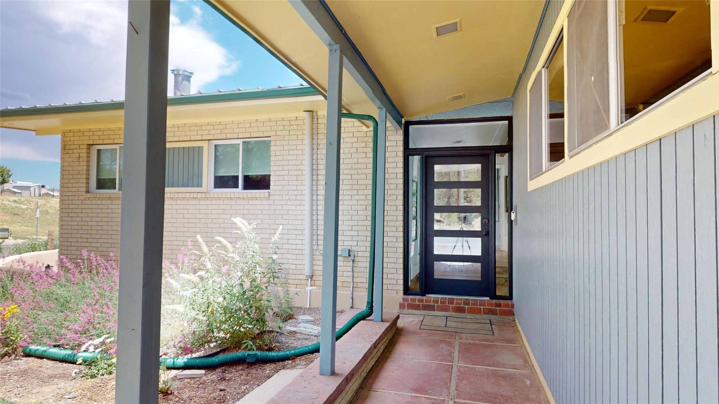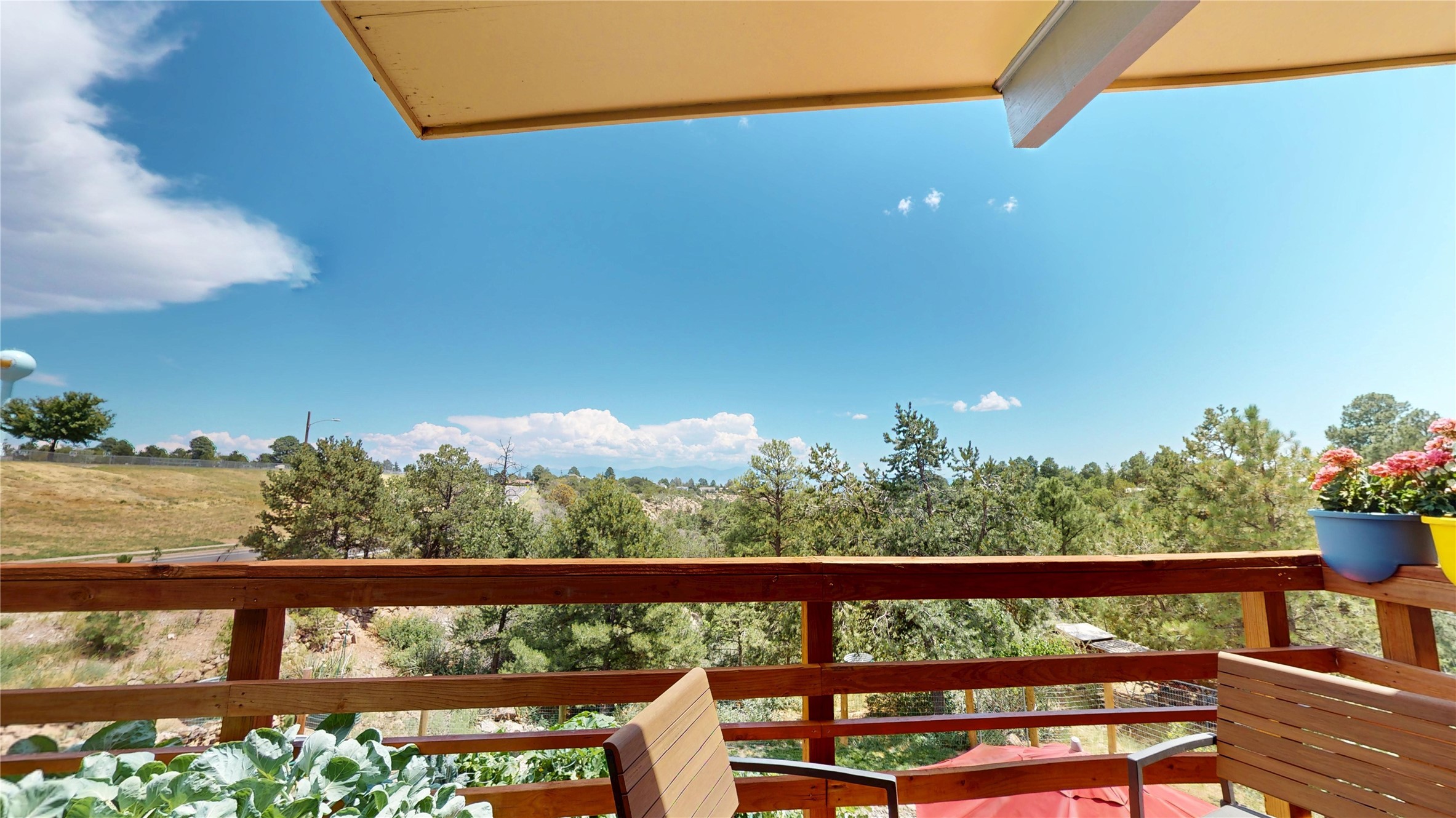 Perched on the canyon's edge, this 3,200+ sq. ft. home offers sweeping canyon and mountain views. The sun-filled entry atrium, with expansive windows and flagstone flooring, welcomes you into the home with a versatile space that offers so many options. Through French doors, the spacious living room features vaulted ceilings with exposed beams, a cozy fireplace, and picture windows that frame the stunning scenery. The living area opens to the kitchen, complete with updated cabinetry, quartz countertops, and stainless-steel appliances, including a Bosch dishwasher and a Caf dual-oven induction stove. Just off the kitchen is a deck where you can enjoy spectacular sunrises or evening shade with canyon breezes. The main level hosts a primary suite with an ensuite bath featuring shaker style cabinets and a curved-glass shower. A second bedroom with deck access and a full bath complete this level. Downstairs, a large den with brick fireplace opens to the fully fenced backyard, joined by a third bedroom, full bath, generous laundry room, and abundant storage. Mini splits create year-round comfort, complemented by gas hot water heat and two fireplace inserts. Outdoor amenities include terraced landscaping, a covered patio, and a backyard with access to the historic Gonzales Road Trail, connecting to the Bayo Canyon Trail system. Barranca Elementary, community pool, tennis courts, soccer fields, and a park with pavilion are all close by. Upgrades include: 2025: Quartz countertop, sink, disposal, ceiling fans, and entry door, 2024: South side re-stuccoed, new gutters/guard rails, refrigerator, and microwave, 2023: dishwasher, dual oven stove, vinyl plank flooring in living room/bedrooms, xeriscaping, and backyard patio 2022: Metal roof, mini splits, garage doors, fencing, water heater, washer/dryer and bathroom updates. With so many recent improvements, this home feels fresh, modern. Don't miss this one. Schedule your showing today!
