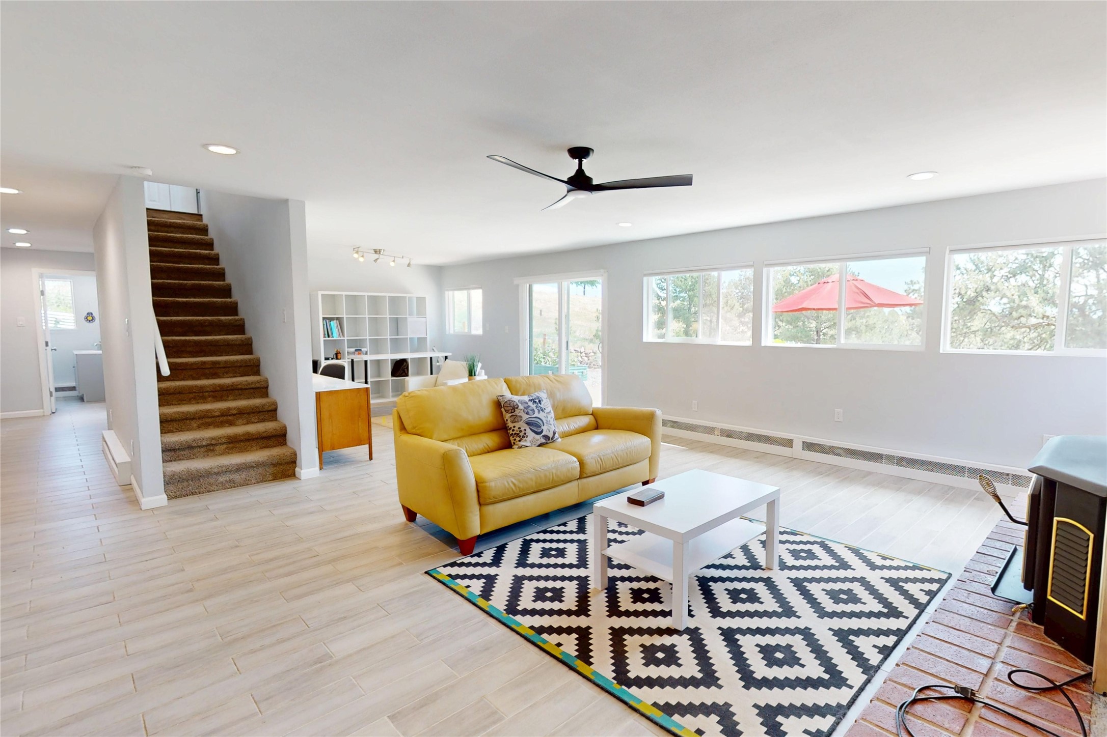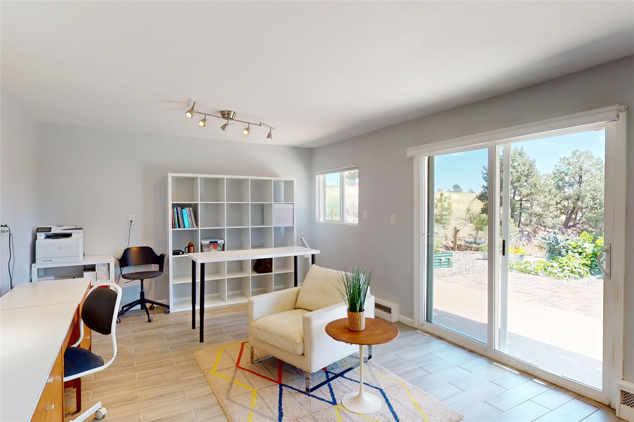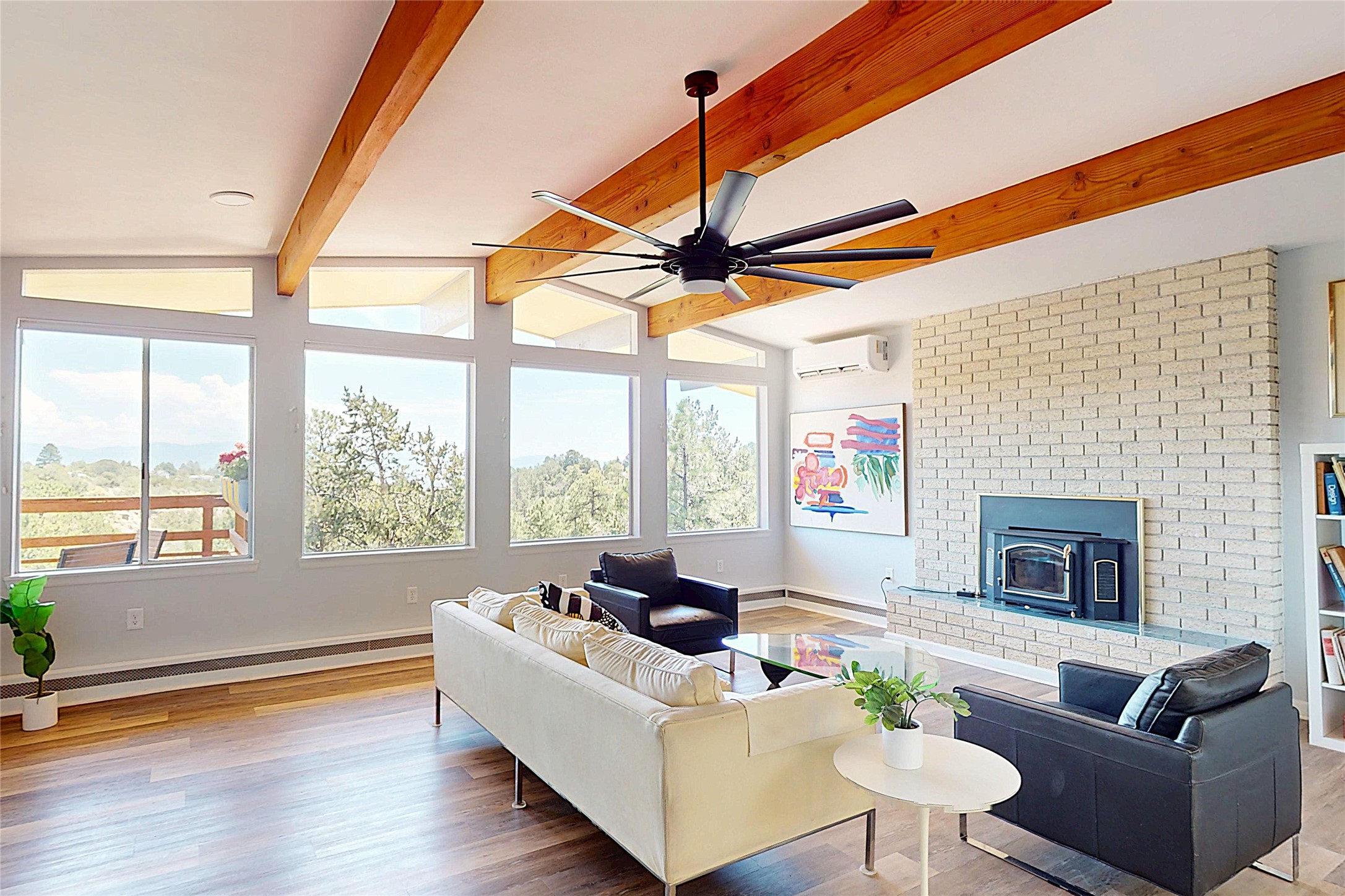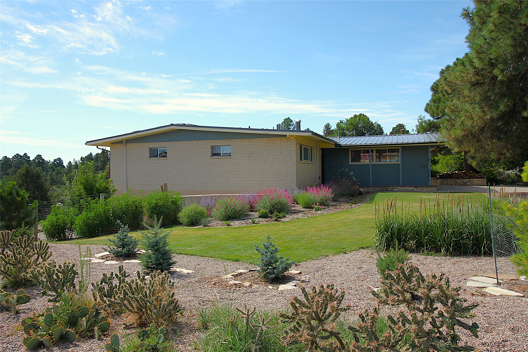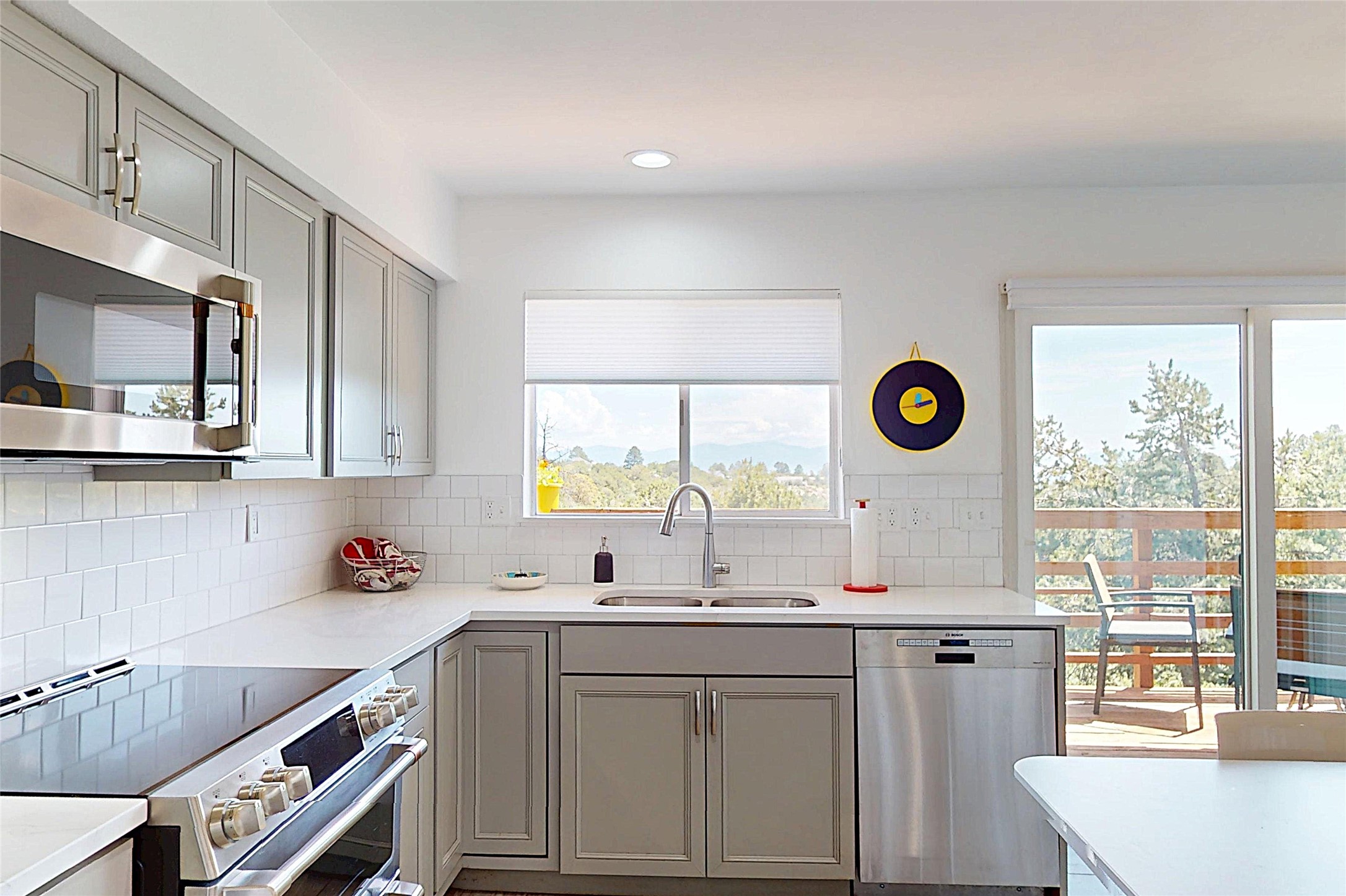 Perched on the canyon's edge, this 3,200+ sq. ft. home offers sweeping canyon and mountain views. The sun-filled entry atrium, with expansive windows and flagstone flooring, welcomes you into the home with a versatile space that offers so many options. Through French doors, the spacious living room features vaulted ceilings with exposed beams, a cozy fireplace, and picture windows that frame the stunning scenery. The living area opens to the kitchen, complete with updated cabinetry, quartz countertops, and stainless-steel appliances, including a Bosch dishwasher and a Caf dual-oven induction stove. Just off the kitchen is a deck where you can enjoy spectacular sunrises or evening shade with canyon breezes. The main level hosts a primary suite with an ensuite bath featuring shaker style cabinets and a curved-glass shower. A second bedroom with deck access and a full bath complete this level. Downstairs, a large den with brick fireplace opens to the fully fenced backyard, joined by a third bedroom, full bath, generous laundry room, and abundant storage. Mini splits create year-round comfort, complemented by gas hot water heat and two fireplace inserts. Outdoor amenities include terraced landscaping, a covered patio, and a backyard with access to the historic Gonzales Road Trail, connecting to the Bayo Canyon Trail system. Barranca Elementary, community pool, tennis courts, soccer fields, and a park with pavilion are all close by. Upgrades include: 2025: Quartz countertop, sink, disposal, ceiling fans, and entry door, 2024: South side re-stuccoed, new gutters/guard rails, refrigerator, and microwave, 2023: dishwasher, dual oven stove, vinyl plank flooring in living room/bedrooms, xeriscaping, and backyard patio 2022: Metal roof, mini splits, garage doors, fencing, water heater, washer/dryer and bathroom updates. With so many recent improvements, this home feels fresh, modern. Don't miss this one. Schedule your showing today!