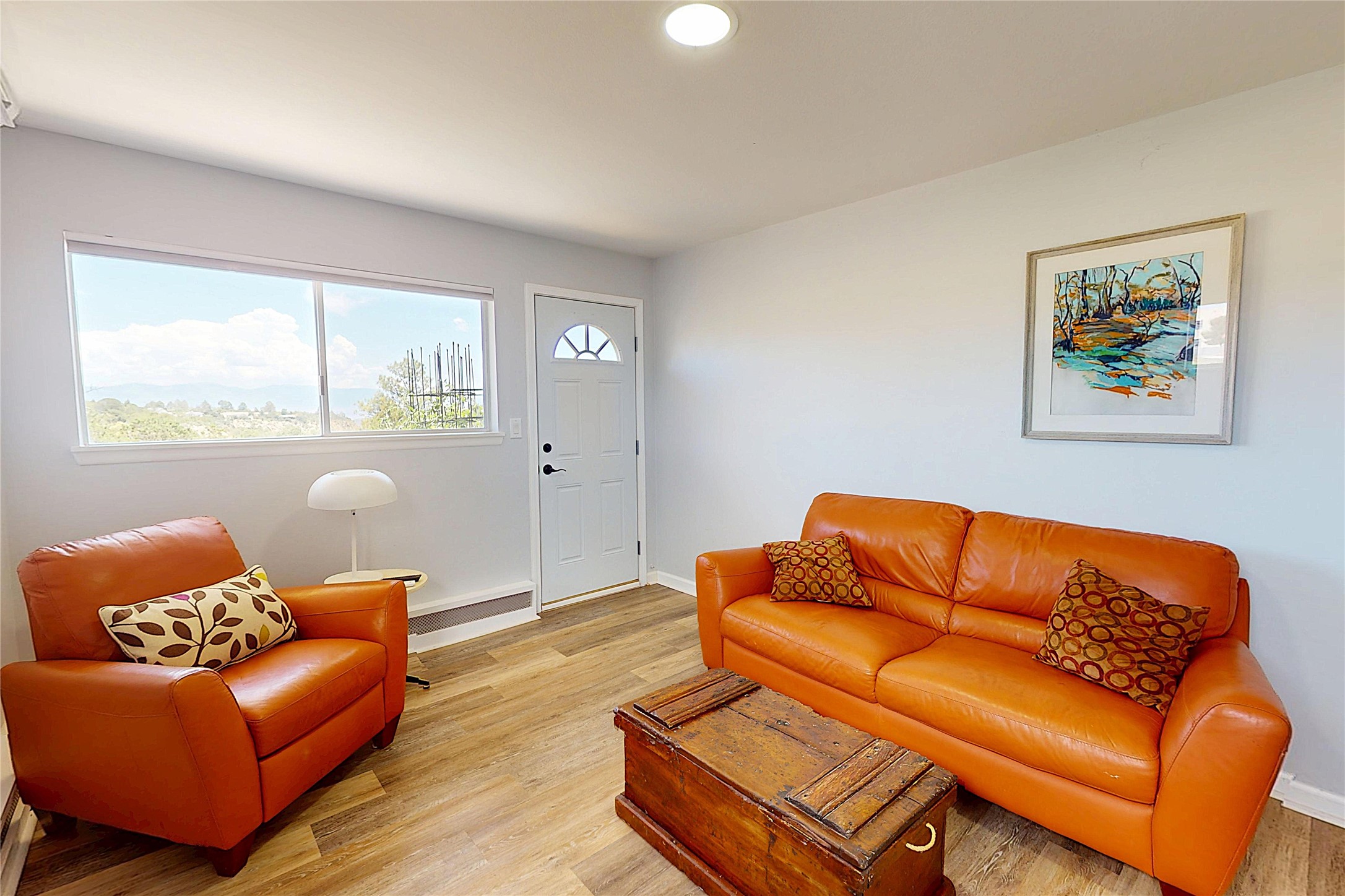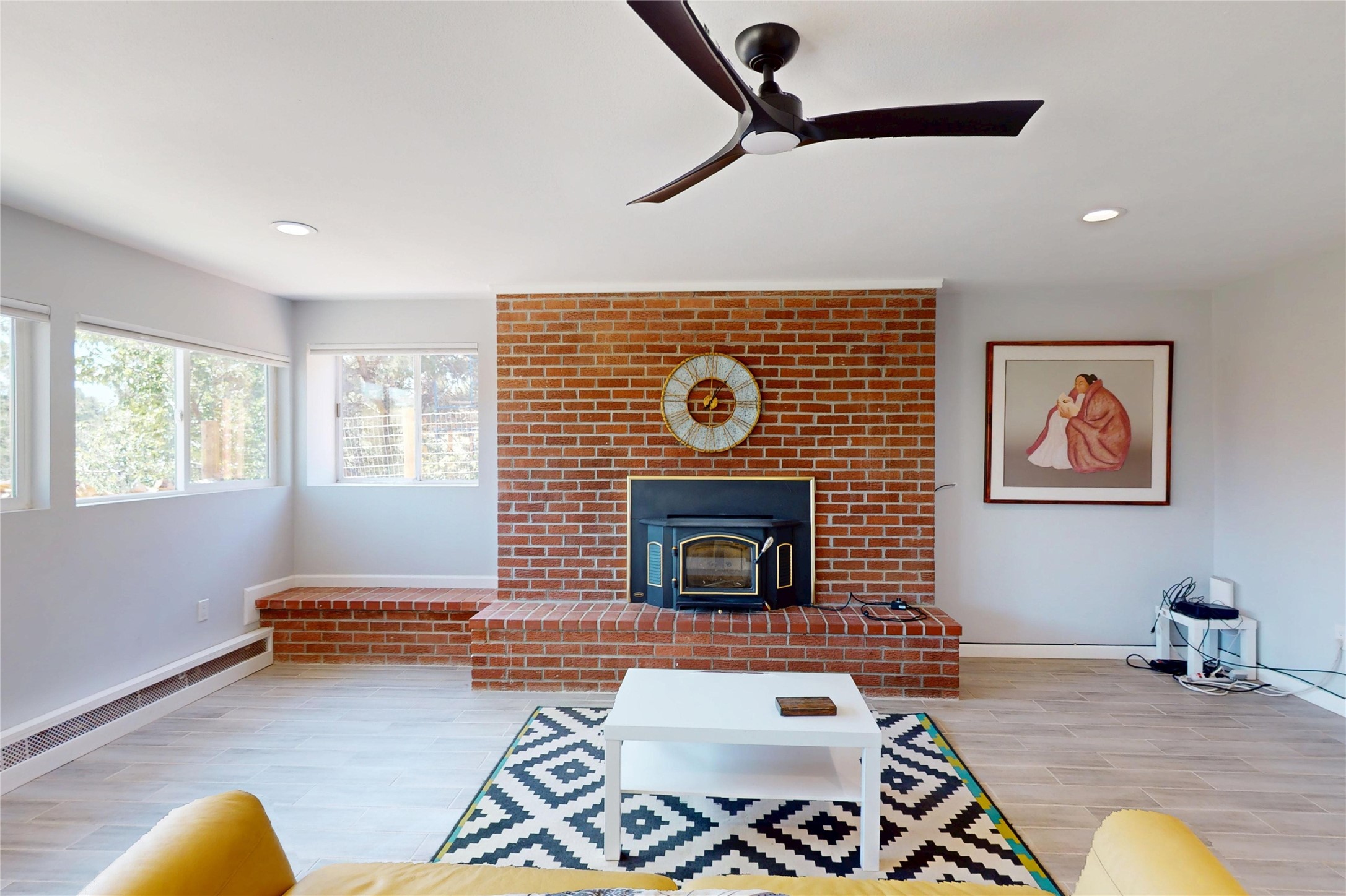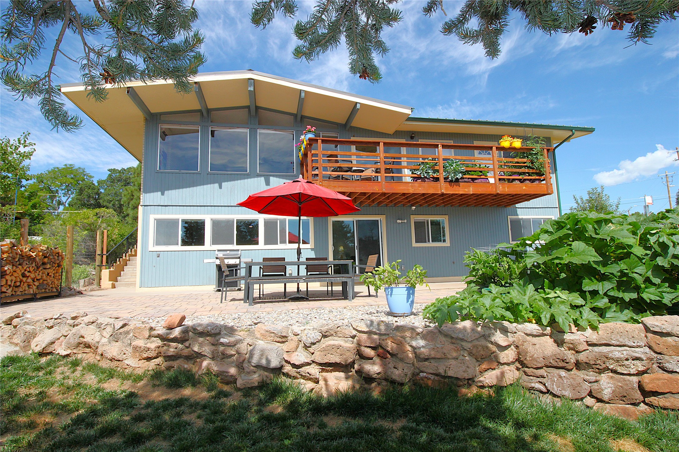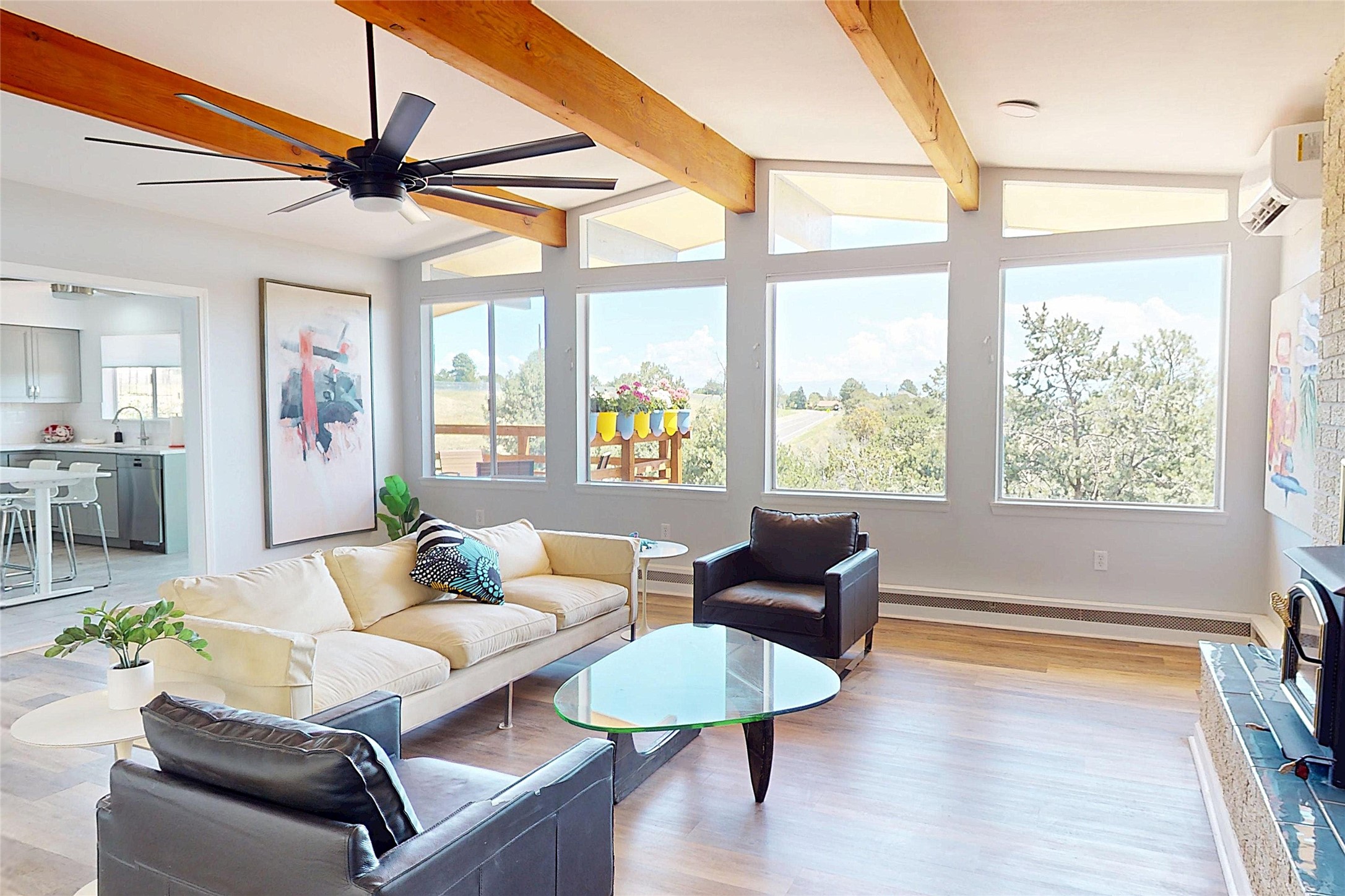 Perched on the canyon's edge, this 3,200+ sq. ft. home offers sweeping canyon and mountain views. The sun-filled entry atrium, with expansive windows and flagstone flooring, welcomes you into the home with a versatile space that offers so many options. Through French doors, the spacious living room features vaulted ceilings with exposed beams, a cozy fireplace, and picture windows that frame the stunning scenery. The living area opens to the kitchen, complete with updated cabinetry, quartz countertops, and stainless-steel appliances, including a Bosch dishwasher and a Caf dual-oven induction stove. Just off the kitchen is a deck where you can enjoy spectacular sunrises or evening shade with canyon breezes. The main level hosts a primary suite with an ensuite bath featuring shaker style cabinets and a curved-glass shower. A second bedroom with deck access and a full bath complete this level. Downstairs, a large den with brick fireplace opens to the fully fenced backyard, joined by a third bedroom, full bath, generous laundry room, and abundant storage. Mini splits create year-round comfort, complemented by gas hot water heat and two fireplace inserts. Outdoor amenities include terraced landscaping, a covered patio, and a backyard with access to the historic Gonzales Road Trail, connecting to the Bayo Canyon Trail system. Barranca Elementary, community pool, tennis courts, soccer fields, and a park with pavilion are all close by. Upgrades include: 2025: Quartz countertop, sink, disposal, ceiling fans, and entry door, 2024: South side re-stuccoed, new gutters/guard rails, refrigerator, and microwave, 2023: dishwasher, dual oven stove, vinyl plank flooring in living room/bedrooms, xeriscaping, and backyard patio 2022: Metal roof, mini splits, garage doors, fencing, water heater, washer/dryer and bathroom updates. With so many recent improvements, this home feels fresh, modern. Don't miss this one. Schedule your showing today!