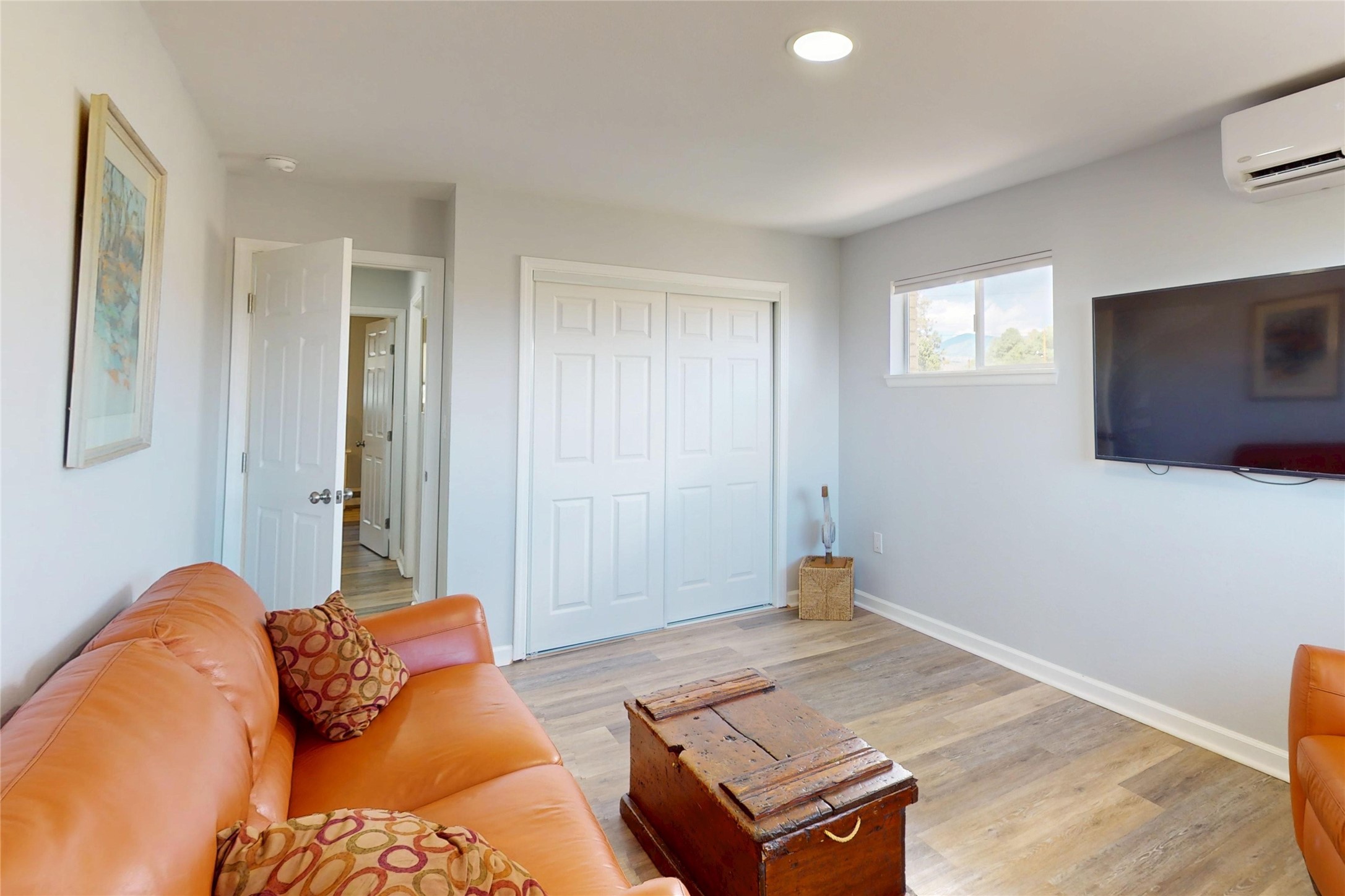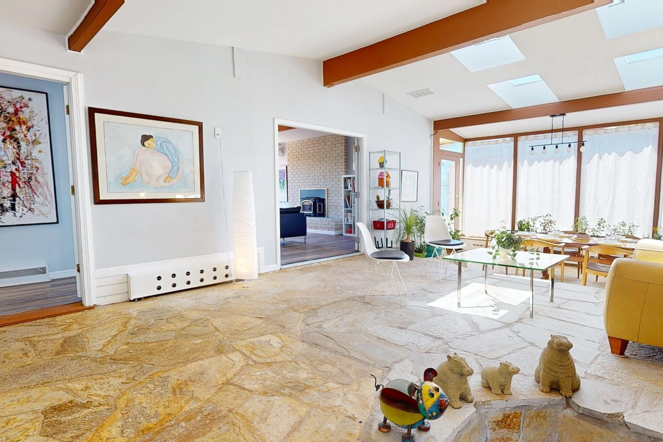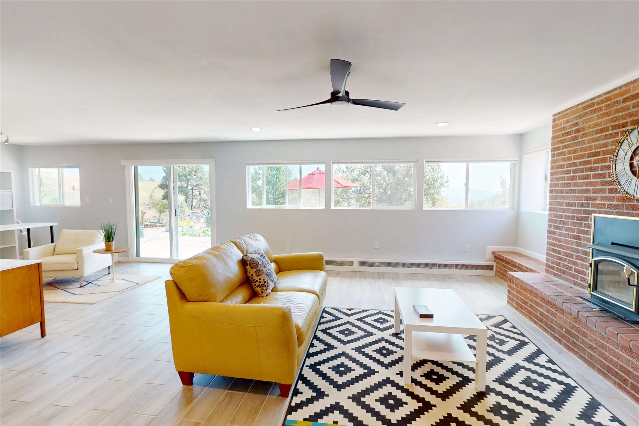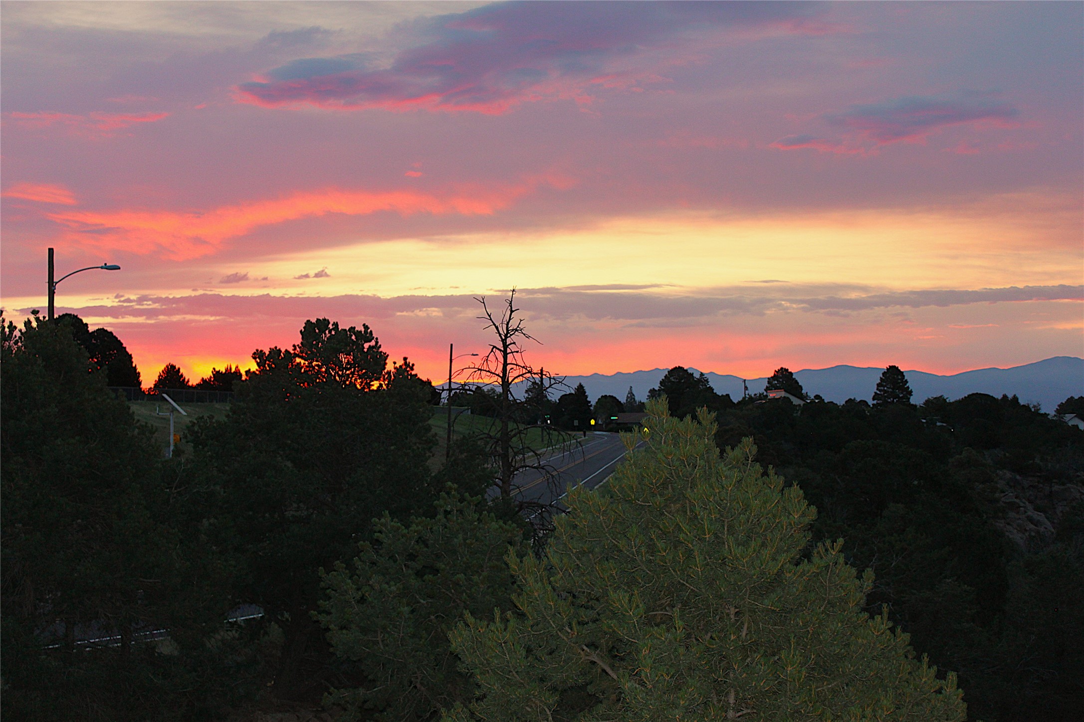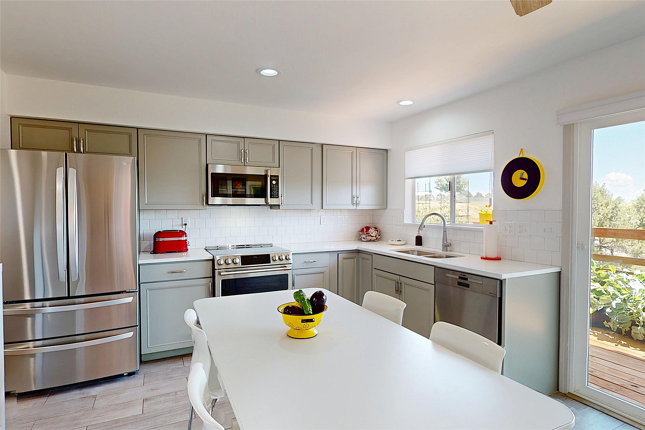 Perched on the canyon's edge, this 3,200+ sq. ft. home offers sweeping canyon and mountain views. The sun-filled entry atrium, with expansive windows and flagstone flooring, welcomes you into the home with a versatile space that offers so many options. Through French doors, the spacious living room features vaulted ceilings with exposed beams, a cozy fireplace, and picture windows that frame the stunning scenery. The living area opens to the kitchen, complete with updated cabinetry, quartz countertops, and stainless-steel appliances, including a Bosch dishwasher and a Caf dual-oven induction stove. Just off the kitchen is a deck where you can enjoy spectacular sunrises or evening shade with canyon breezes. The main level hosts a primary suite with an ensuite bath featuring shaker style cabinets and a curved-glass shower. A second bedroom with deck access and a full bath complete this level. Downstairs, a large den with brick fireplace opens to the fully fenced backyard, joined by a third bedroom, full bath, generous laundry room, and abundant storage. Mini splits create year-round comfort, complemented by gas hot water heat and two fireplace inserts. Outdoor amenities include terraced landscaping, a covered patio, and a backyard with access to the historic Gonzales Road Trail, connecting to the Bayo Canyon Trail system. Barranca Elementary, community pool, tennis courts, soccer fields, and a park with pavilion are all close by. Upgrades include: 2025: Quartz countertop, sink, disposal, ceiling fans, and entry door, 2024: South side re-stuccoed, new gutters/guard rails, refrigerator, and microwave, 2023: dishwasher, dual oven stove, vinyl plank flooring in living room/bedrooms, xeriscaping, and backyard patio 2022: Metal roof, mini splits, garage doors, fencing, water heater, washer/dryer and bathroom updates. With so many recent improvements, this home feels fresh, modern. Don't miss this one. Schedule your showing today!