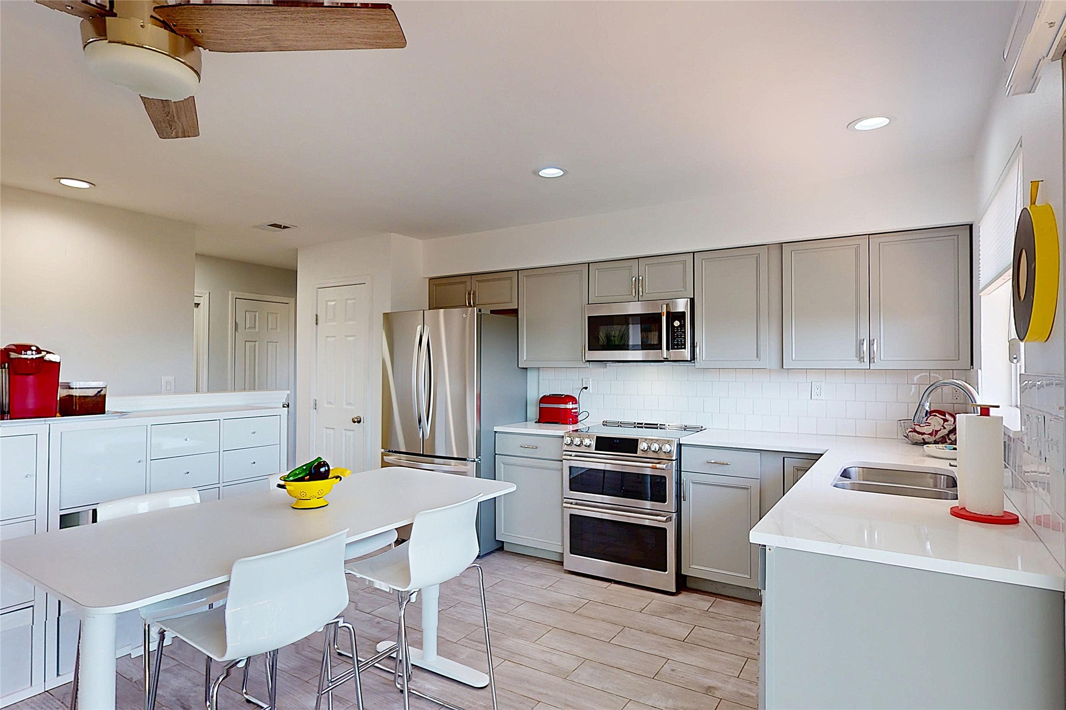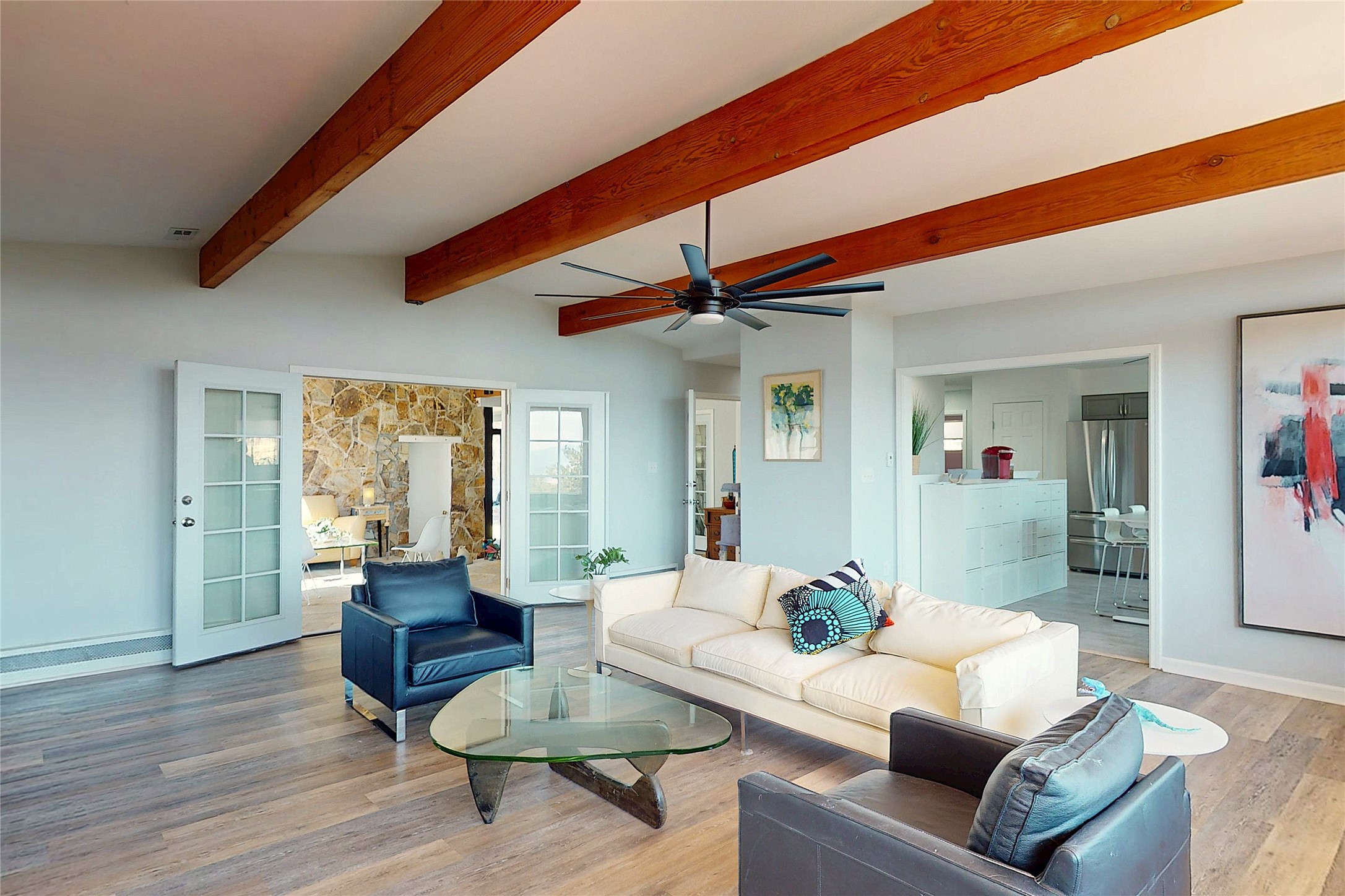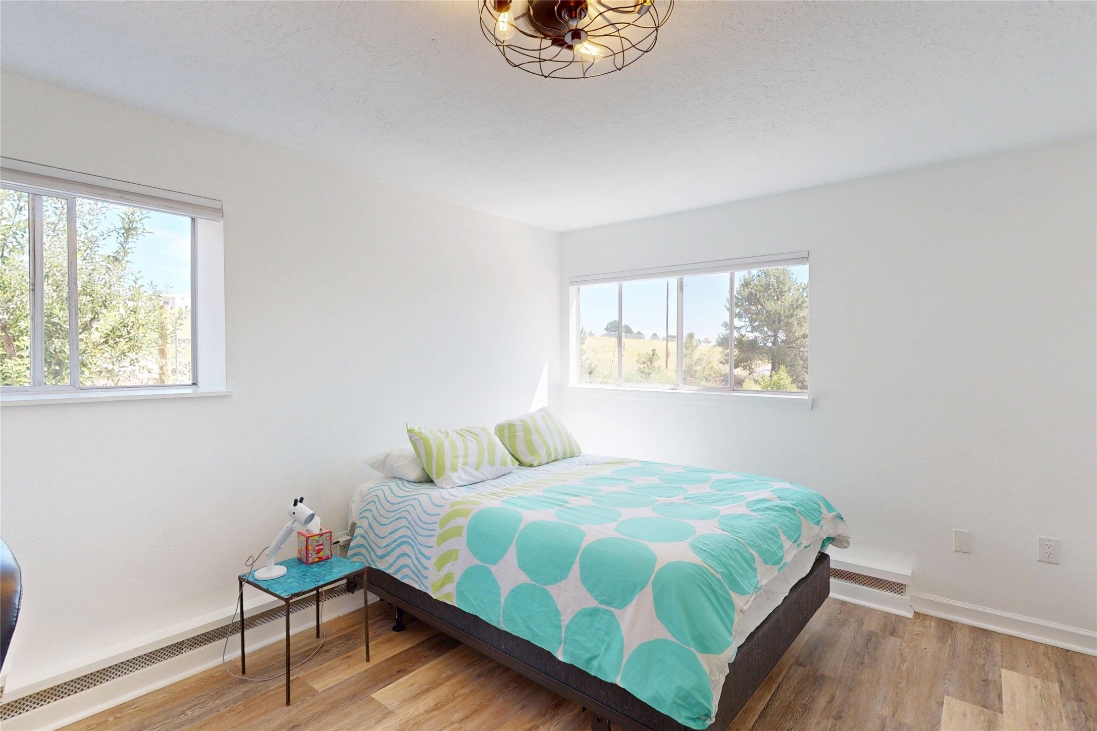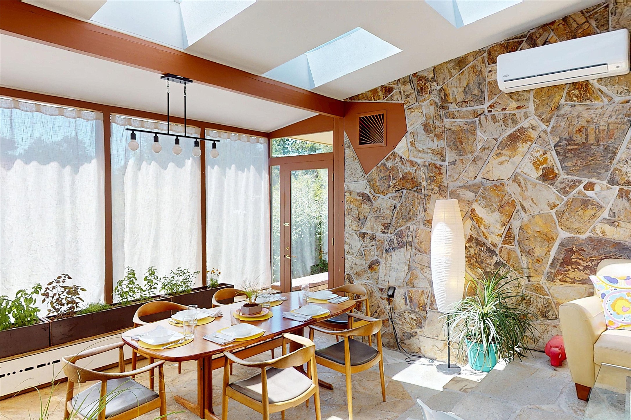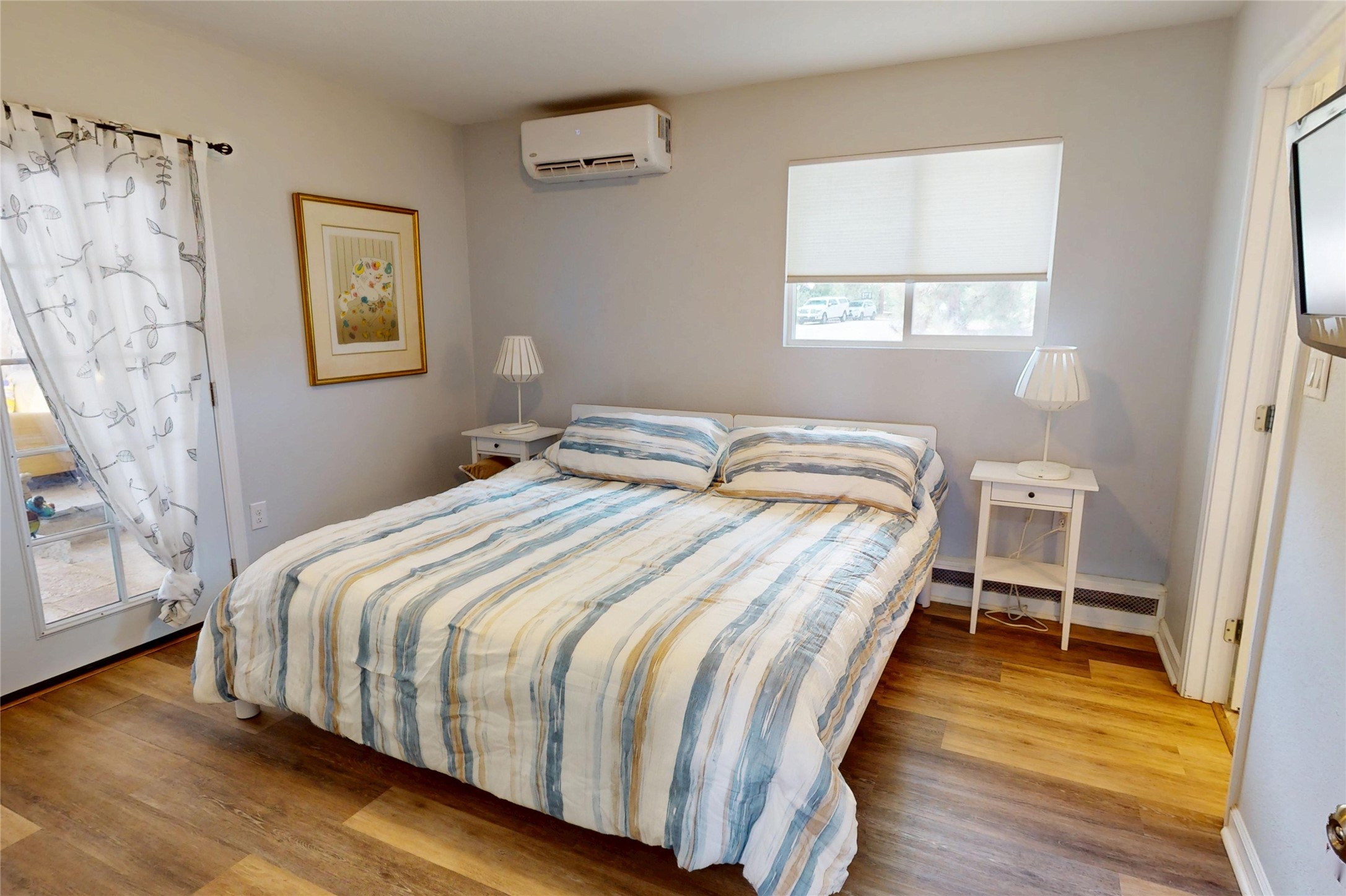 Perched on the canyon's edge, this 3,200+ sq. ft. home offers sweeping canyon and mountain views. The sun-filled entry atrium, with expansive windows and flagstone flooring, welcomes you into the home with a versatile space that offers so many options. Through French doors, the spacious living room features vaulted ceilings with exposed beams, a cozy fireplace, and picture windows that frame the stunning scenery. The living area opens to the kitchen, complete with updated cabinetry, quartz countertops, and stainless-steel appliances, including a Bosch dishwasher and a Caf dual-oven induction stove. Just off the kitchen is a deck where you can enjoy spectacular sunrises or evening shade with canyon breezes. The main level hosts a primary suite with an ensuite bath featuring shaker style cabinets and a curved-glass shower. A second bedroom with deck access and a full bath complete this level. Downstairs, a large den with brick fireplace opens to the fully fenced backyard, joined by a third bedroom, full bath, generous laundry room, and abundant storage. Mini splits create year-round comfort, complemented by gas hot water heat and two fireplace inserts. Outdoor amenities include terraced landscaping, a covered patio, and a backyard with access to the historic Gonzales Road Trail, connecting to the Bayo Canyon Trail system. Barranca Elementary, community pool, tennis courts, soccer fields, and a park with pavilion are all close by. Upgrades include: 2025: Quartz countertop, sink, disposal, ceiling fans, and entry door, 2024: South side re-stuccoed, new gutters/guard rails, refrigerator, and microwave, 2023: dishwasher, dual oven stove, vinyl plank flooring in living room/bedrooms, xeriscaping, and backyard patio 2022: Metal roof, mini splits, garage doors, fencing, water heater, washer/dryer and bathroom updates. With so many recent improvements, this home feels fresh, modern. Don't miss this one. Schedule your showing today!