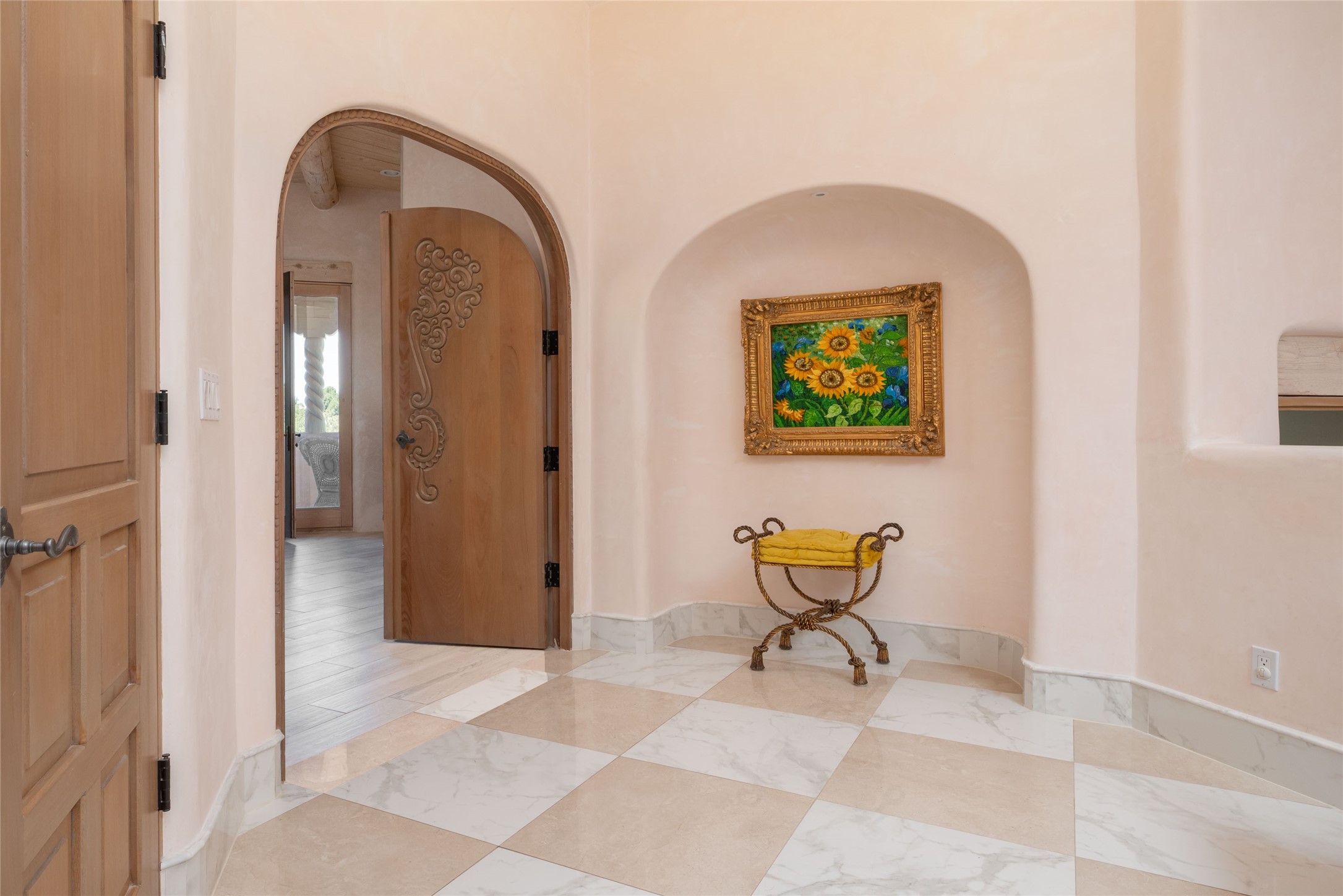 Grand Hacienda Winner and the unrivaled Belle of Tano Road redefines the essence of luxury living. Nestled behind exquisite handcrafted wrought iron gates, you are transported to a serene desert oasis, embraced by the splendor of nature, offering unparalleled privacy and sanctuary from the world. As you enter through handcrafted mahogany and wrought iron doors, the soaring ceilings and diamond plaster walls create an atmosphere of grandeur, while the Italian porcelain floors reflect a commitment to the highest standards of luxury and craftsmanship. Every detail has been meticulously curated for you. The great room, with its endless windows, invites you to bask in the breathtaking views of the sweeping mountains and the enchanting cityscape below, perfectly positioned above the exclusive enclave of Santa Fe. The sprawling estate houses two exquisite primary suites, each featuring spa-like bathrooms with soaking tubs, emperor showers, and ample space to have a powder room lounge, a meditation space, or a fitness area. Each of the four bedrooms is its own sanctuary, complete with fireplace and en-suite facilities, ensuring every guest feels like royalty and that their comfort and privacy are paramount. The gourmet kitchen is a culinary dream featuring custom cabinetry, Wolf range with double ovens and a warming drawer, Sub-Zero refrigerator, and a massive island seamlessly connecting to the outdoor cooking and dining spaces for effortless entertaining. Expansive grounds, nearly three lush acres, adorned with manicured lawns, vibrant rose gardens, and fruit trees, offer an idyllic setting for outdoor gatherings. These luxurious spaces provide not just comfort, but a lifestyle of sophistication. Immaculately maintained and thoughtfully expanded, this sprawling 6,700sq.ft estate is a testament to refined living. This is more than just a home - it is a lifestyle drenched in luxury and elegance. Design that speaks to the most discerning tastes and coveted desires. *Video*