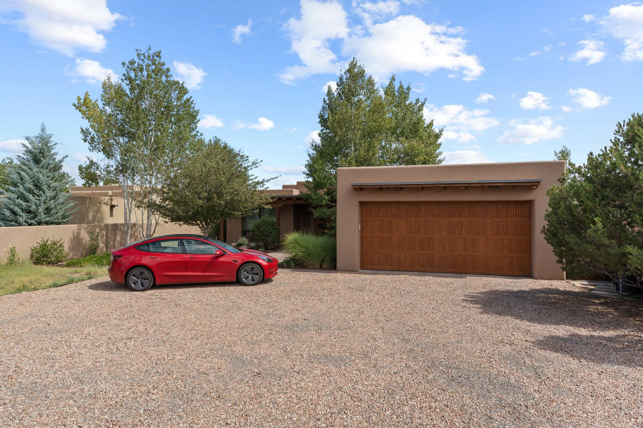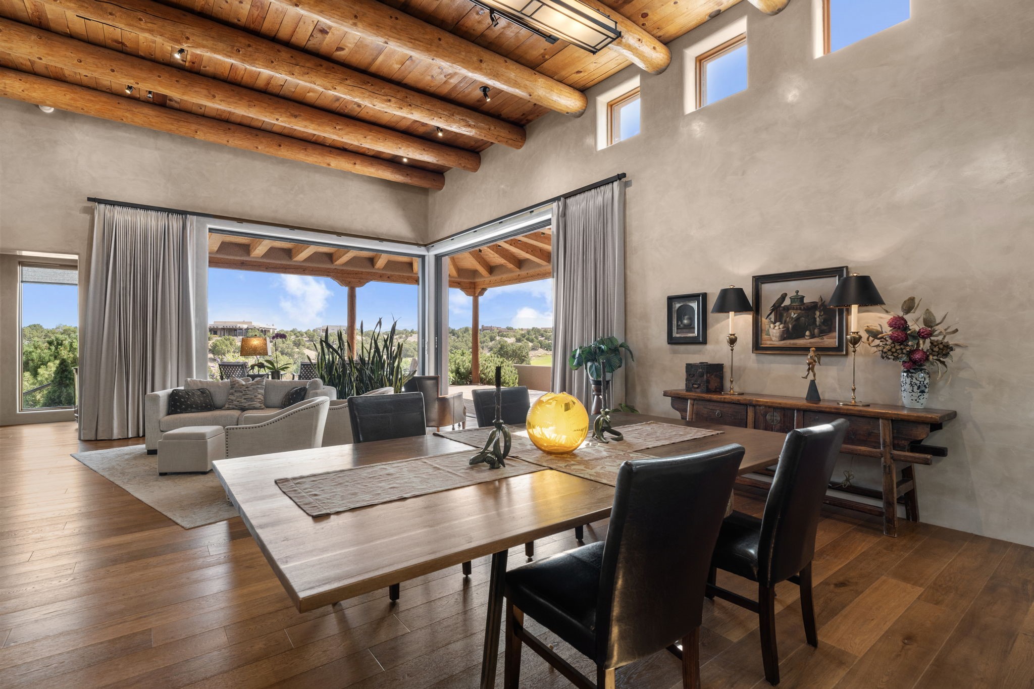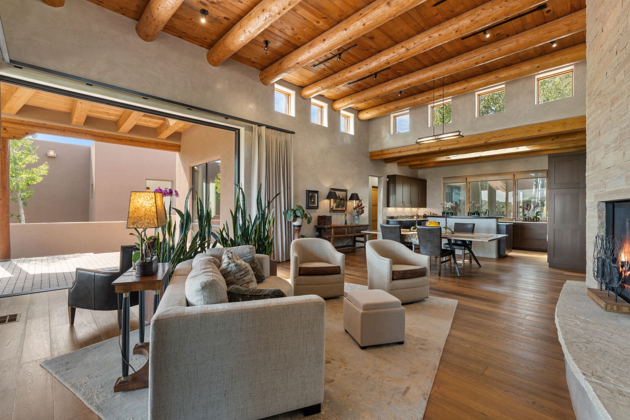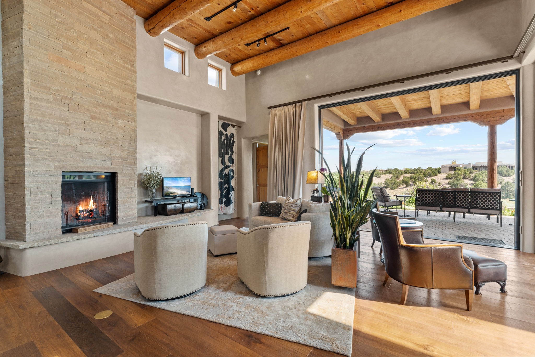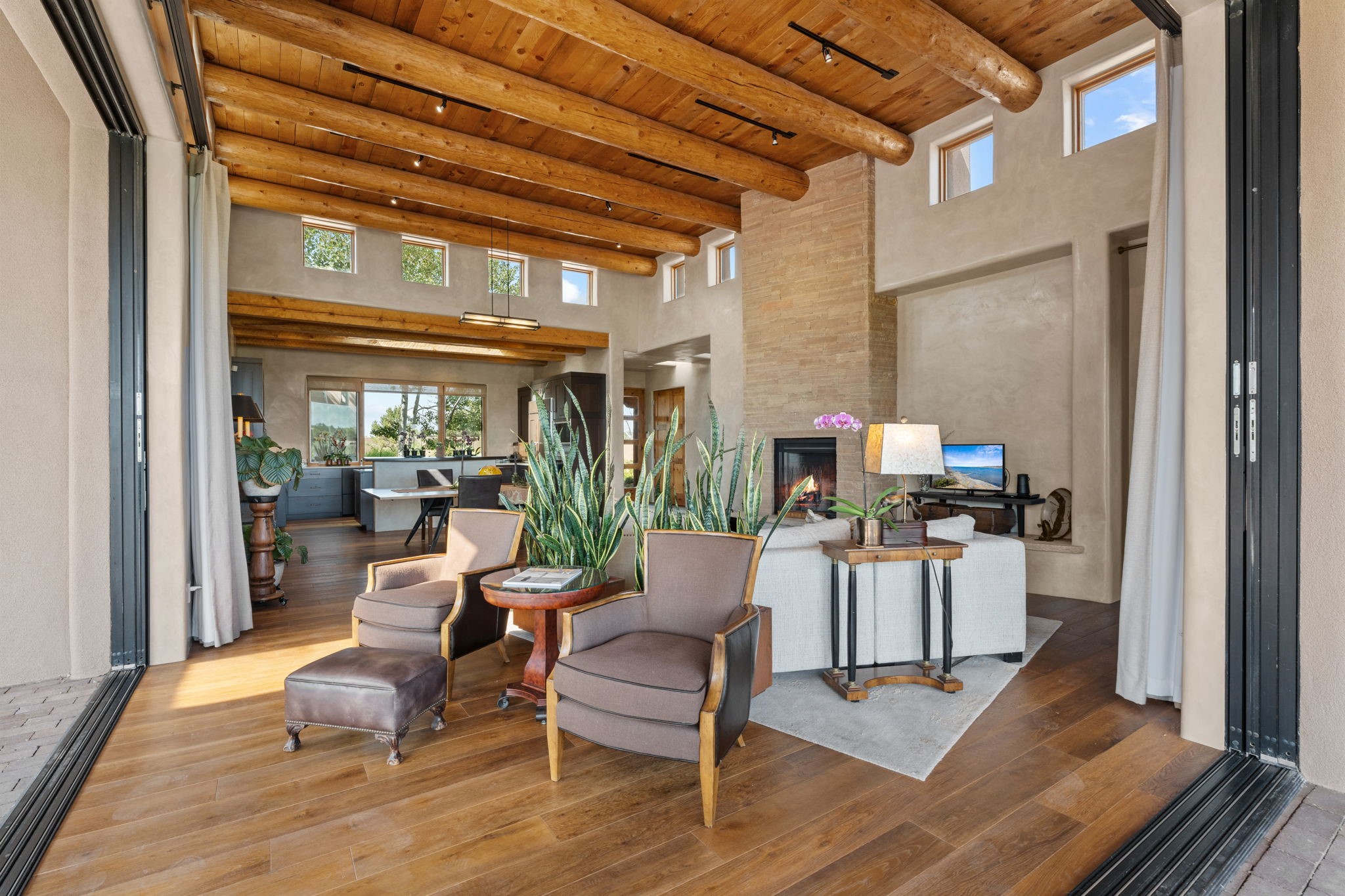 Stunning Tierra Concepts-built home in Las Campanas, plus Golf Membership, select furnishings and Tesla Model 3 are available. this soft contemporary home was chosen by the Developer to be his personal residence. Thoughtful design and remarkable custom finishes grace every aspect of this home.Retracting glass walls create indoor-outdoor flow and maximize spectacular views of both the Sangre de Cristo and Jemez mountains. Home overlooks the Las Campanas Sunset course and offers true indoor/outdoor living on the expansive portal - ideal for intimate gatherings or large-scale entertaining. Take in the 16-ft viga ceilings and diamond plaster in the great room. Throughout the house, numerous skylights, clerestory and large windows allow for abundant light at any time of day. Imagine evenings in front of the new wood-burning fireplace with floor-to-ceiling stacked-stone facing.Chef's kitchen has a six-burner Wolf range, SubZero refrigerator, and 2-drawer dishwasher, as well as generous counter space and storage. Over the kitchen sink is a picture window offering serene views of iconic aspen trees.Primary suite has high ceilings, diamond plaster, a remote-control gas fireplace, and spa-like bath with steam shower, soaking tub, dual vanities and a well-appointed walk-in closet.All bedrooms enjoy privacy with great separation with en-suite bathrooms. The fashionable home is situated on a large, deep lot with new landscaping, enhancing the views. There is a two-car garage with additional storage.Other improvements within last 2 years:- Upgraded HVAC system- New stucco- On-demand H2O heater- Water treatment system- Whole-house surge protection- Custom remote-control window coverings in main rooms- Steam shower & new fixtures in master- New washer/dryer- EV charging station in garage- New garage door & opener- Bidet seats w/remotes- Upgraded lighting throughout- ADA fixtures added to front suite shower