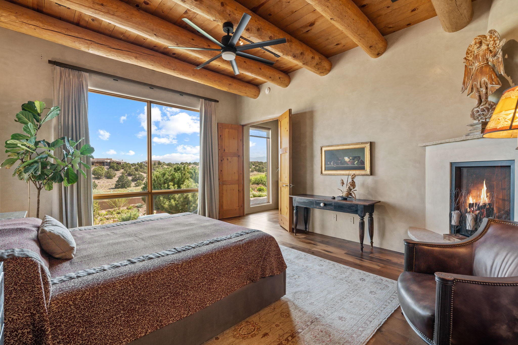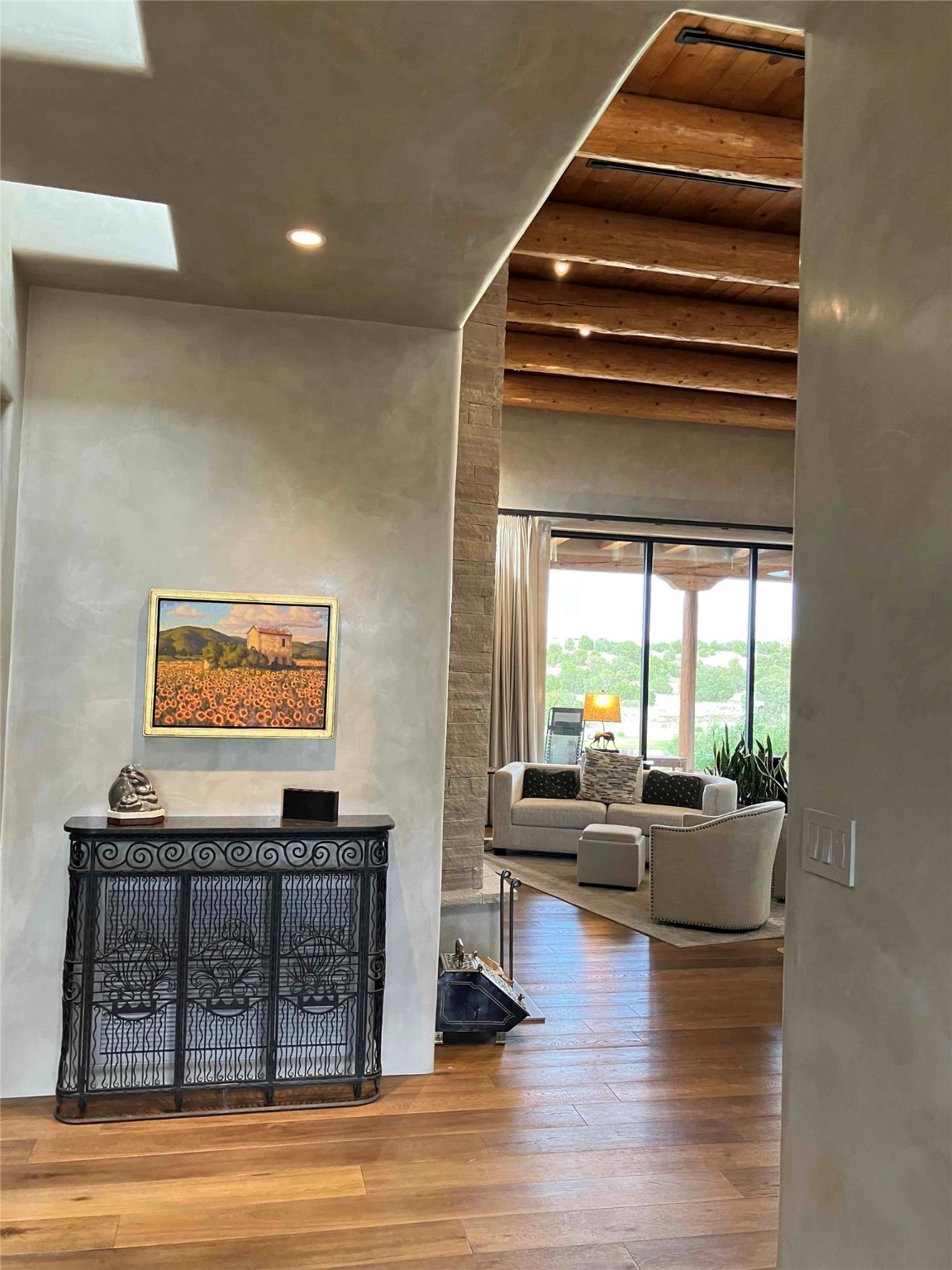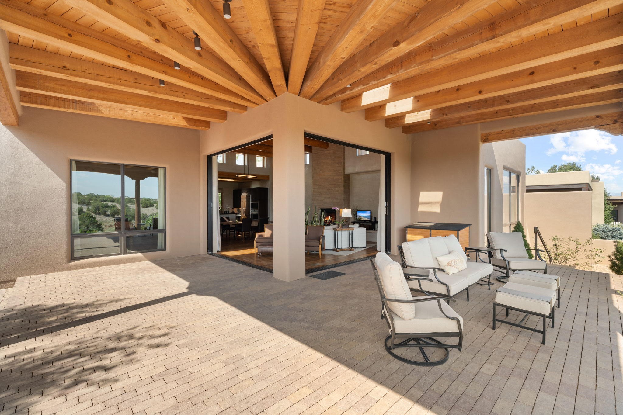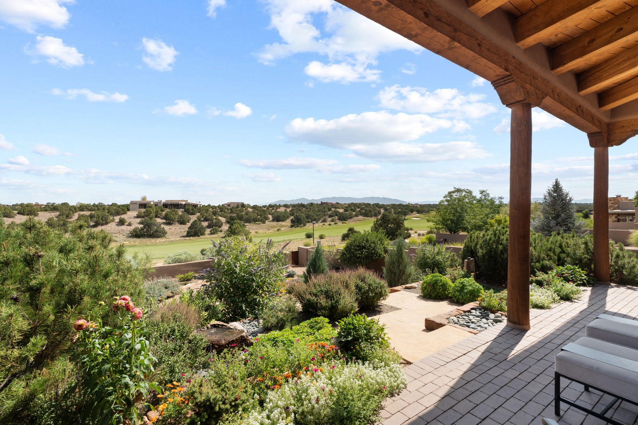 Stunning Tierra Concepts-built home in Las Campanas, plus Golf Membership, select furnishings and Tesla Model 3 are available. this soft contemporary home was chosen by the Developer to be his personal residence. Thoughtful design and remarkable custom finishes grace every aspect of this home.Retracting glass walls create indoor-outdoor flow and maximize spectacular views of both the Sangre de Cristo and Jemez mountains. Home overlooks the Las Campanas Sunset course and offers true indoor/outdoor living on the expansive portal - ideal for intimate gatherings or large-scale entertaining. Take in the 16-ft viga ceilings and diamond plaster in the great room. Throughout the house, numerous skylights, clerestory and large windows allow for abundant light at any time of day. Imagine evenings in front of the new wood-burning fireplace with floor-to-ceiling stacked-stone facing.Chef's kitchen has a six-burner Wolf range, SubZero refrigerator, and 2-drawer dishwasher, as well as generous counter space and storage. Over the kitchen sink is a picture window offering serene views of iconic aspen trees.Primary suite has high ceilings, diamond plaster, a remote-control gas fireplace, and spa-like bath with steam shower, soaking tub, dual vanities and a well-appointed walk-in closet.All bedrooms enjoy privacy with great separation with en-suite bathrooms. The fashionable home is situated on a large, deep lot with new landscaping, enhancing the views. There is a two-car garage with additional storage.Other improvements within last 2 years:- Upgraded HVAC system- New stucco- On-demand H2O heater- Water treatment system- Whole-house surge protection- Custom remote-control window coverings in main rooms- Steam shower & new fixtures in master- New washer/dryer- EV charging station in garage- New garage door & opener- Bidet seats w/remotes- Upgraded lighting throughout- ADA fixtures added to front suite shower