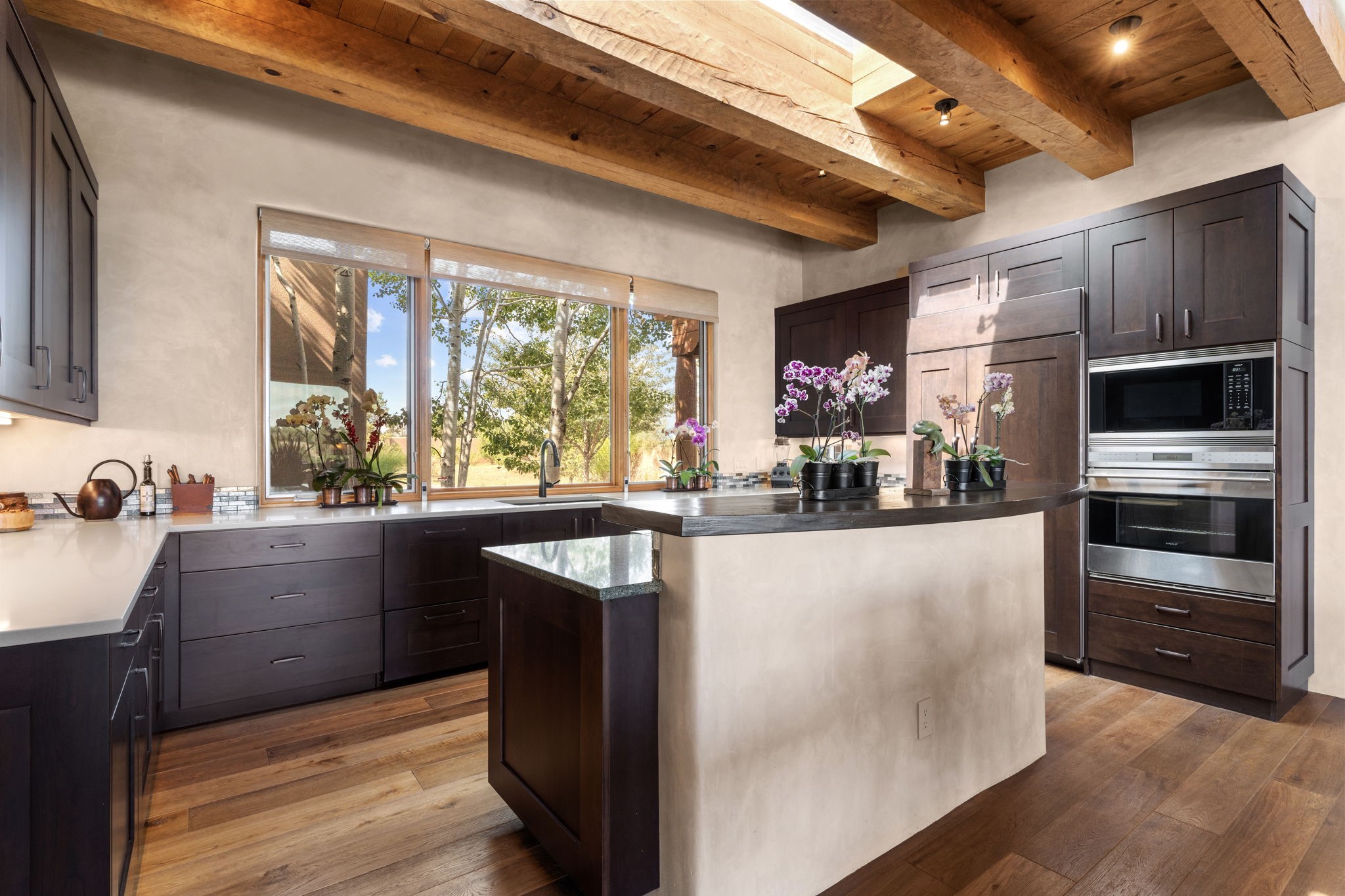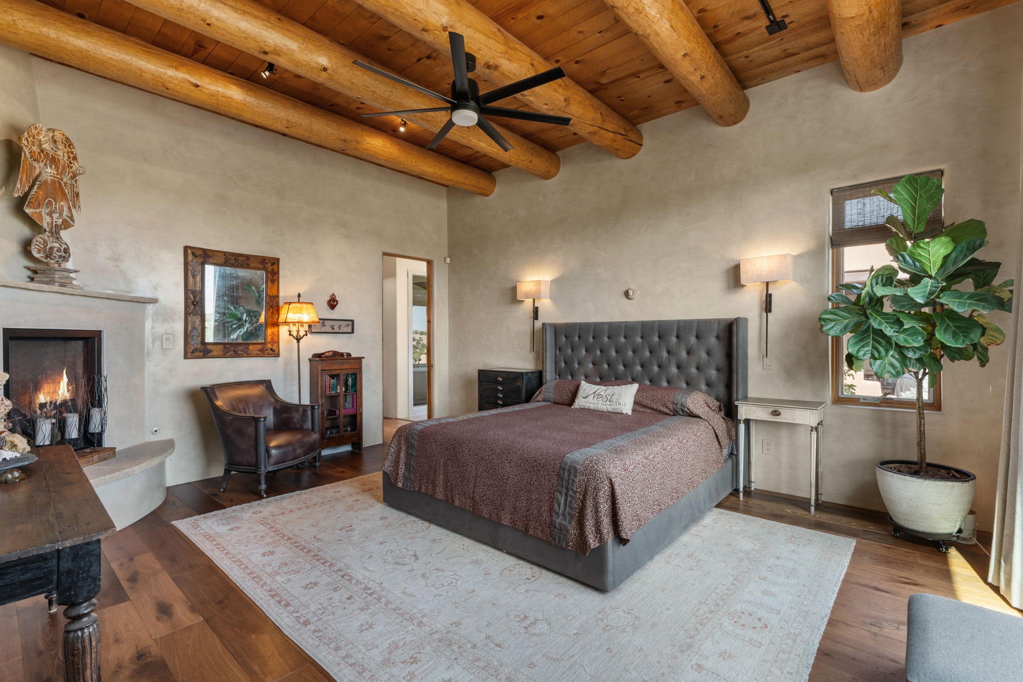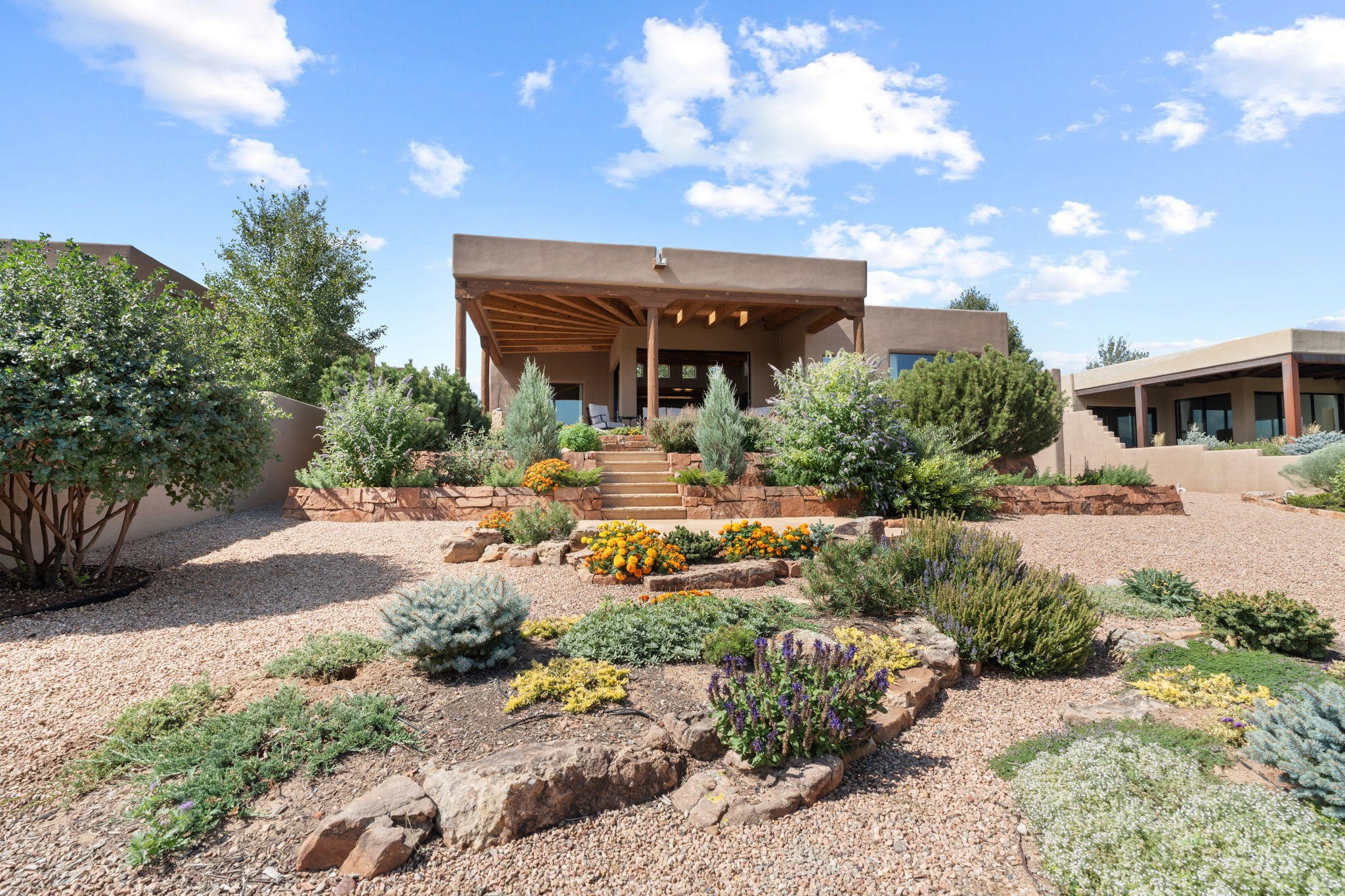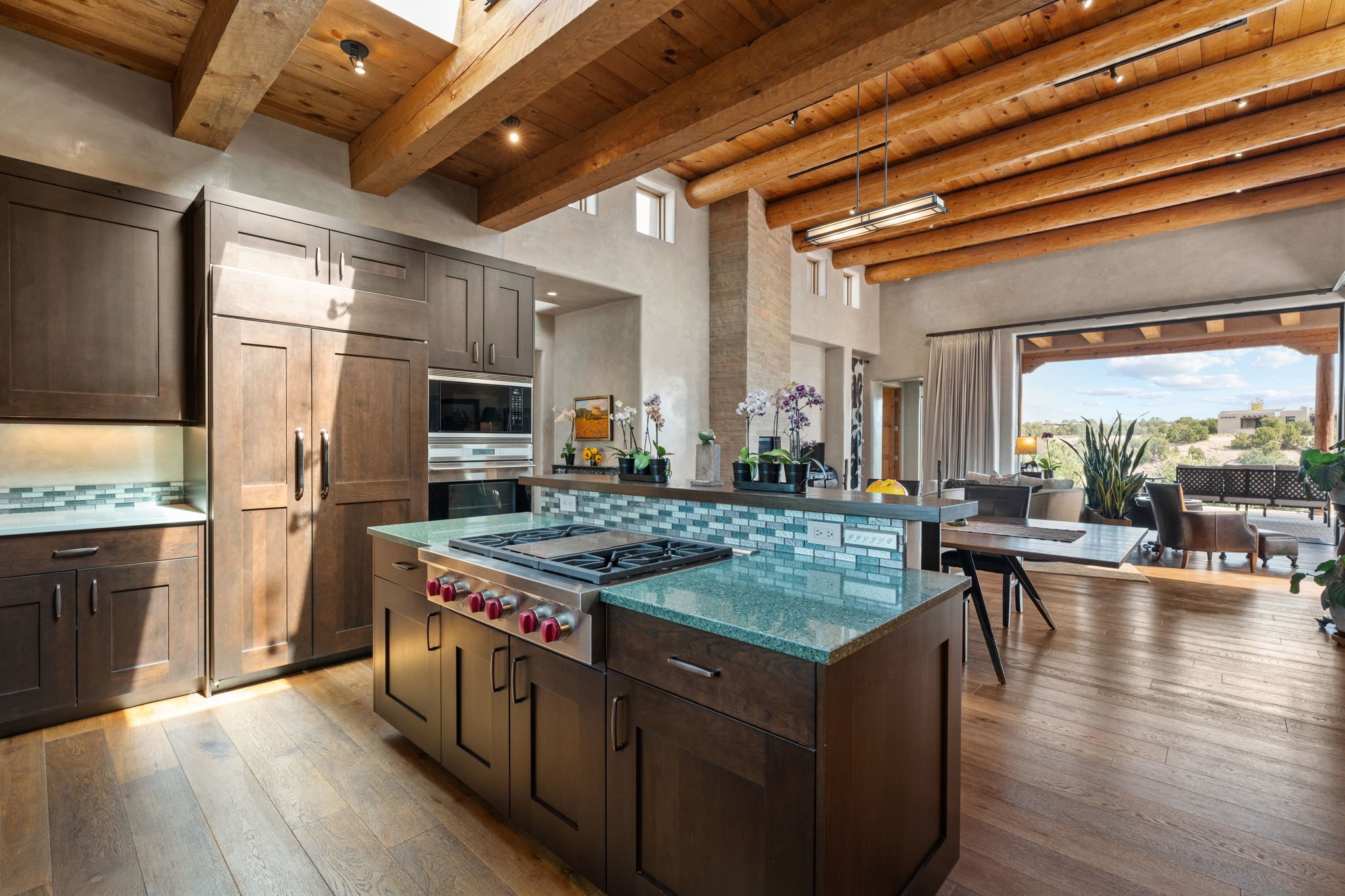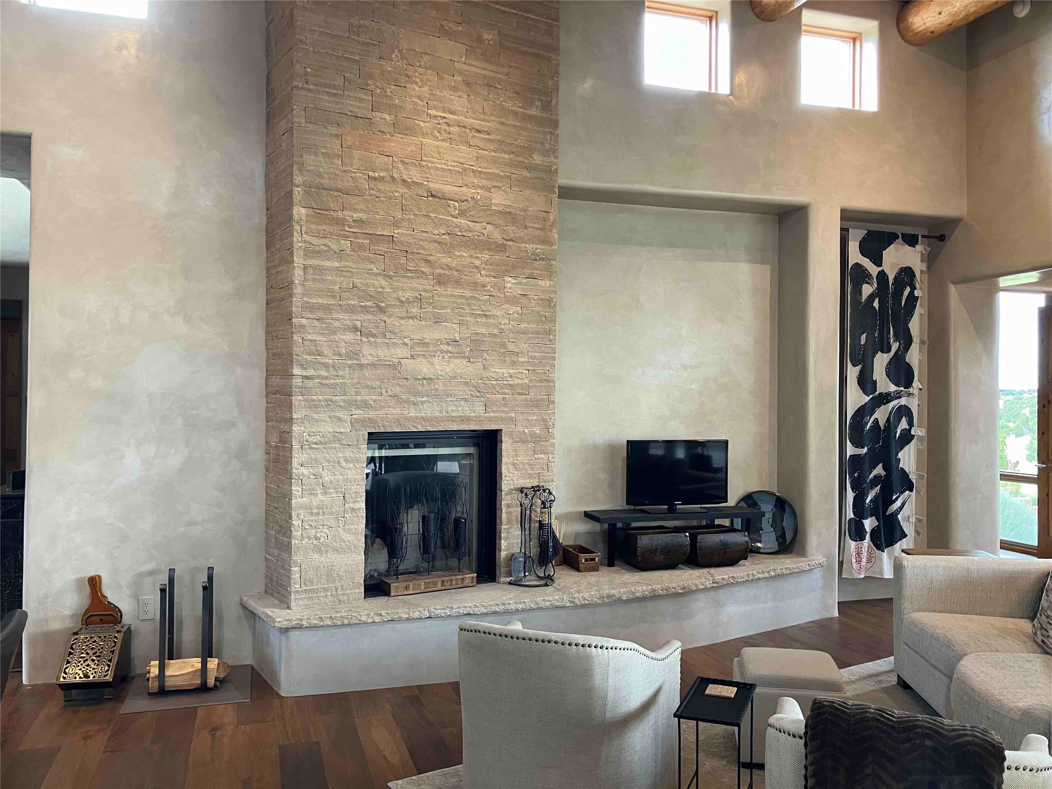 Stunning Tierra Concepts-built home in Las Campanas, plus Golf Membership, select furnishings and Tesla Model 3 are available. this soft contemporary home was chosen by the Developer to be his personal residence. Thoughtful design and remarkable custom finishes grace every aspect of this home.Retracting glass walls create indoor-outdoor flow and maximize spectacular views of both the Sangre de Cristo and Jemez mountains. Home overlooks the Las Campanas Sunset course and offers true indoor/outdoor living on the expansive portal - ideal for intimate gatherings or large-scale entertaining. Take in the 16-ft viga ceilings and diamond plaster in the great room. Throughout the house, numerous skylights, clerestory and large windows allow for abundant light at any time of day. Imagine evenings in front of the new wood-burning fireplace with floor-to-ceiling stacked-stone facing.Chef's kitchen has a six-burner Wolf range, SubZero refrigerator, and 2-drawer dishwasher, as well as generous counter space and storage. Over the kitchen sink is a picture window offering serene views of iconic aspen trees.Primary suite has high ceilings, diamond plaster, a remote-control gas fireplace, and spa-like bath with steam shower, soaking tub, dual vanities and a well-appointed walk-in closet.All bedrooms enjoy privacy with great separation with en-suite bathrooms. The fashionable home is situated on a large, deep lot with new landscaping, enhancing the views. There is a two-car garage with additional storage.Other improvements within last 2 years:- Upgraded HVAC system- New stucco- On-demand H2O heater- Water treatment system- Whole-house surge protection- Custom remote-control window coverings in main rooms- Steam shower & new fixtures in master- New washer/dryer- EV charging station in garage- New garage door & opener- Bidet seats w/remotes- Upgraded lighting throughout- ADA fixtures added to front suite shower