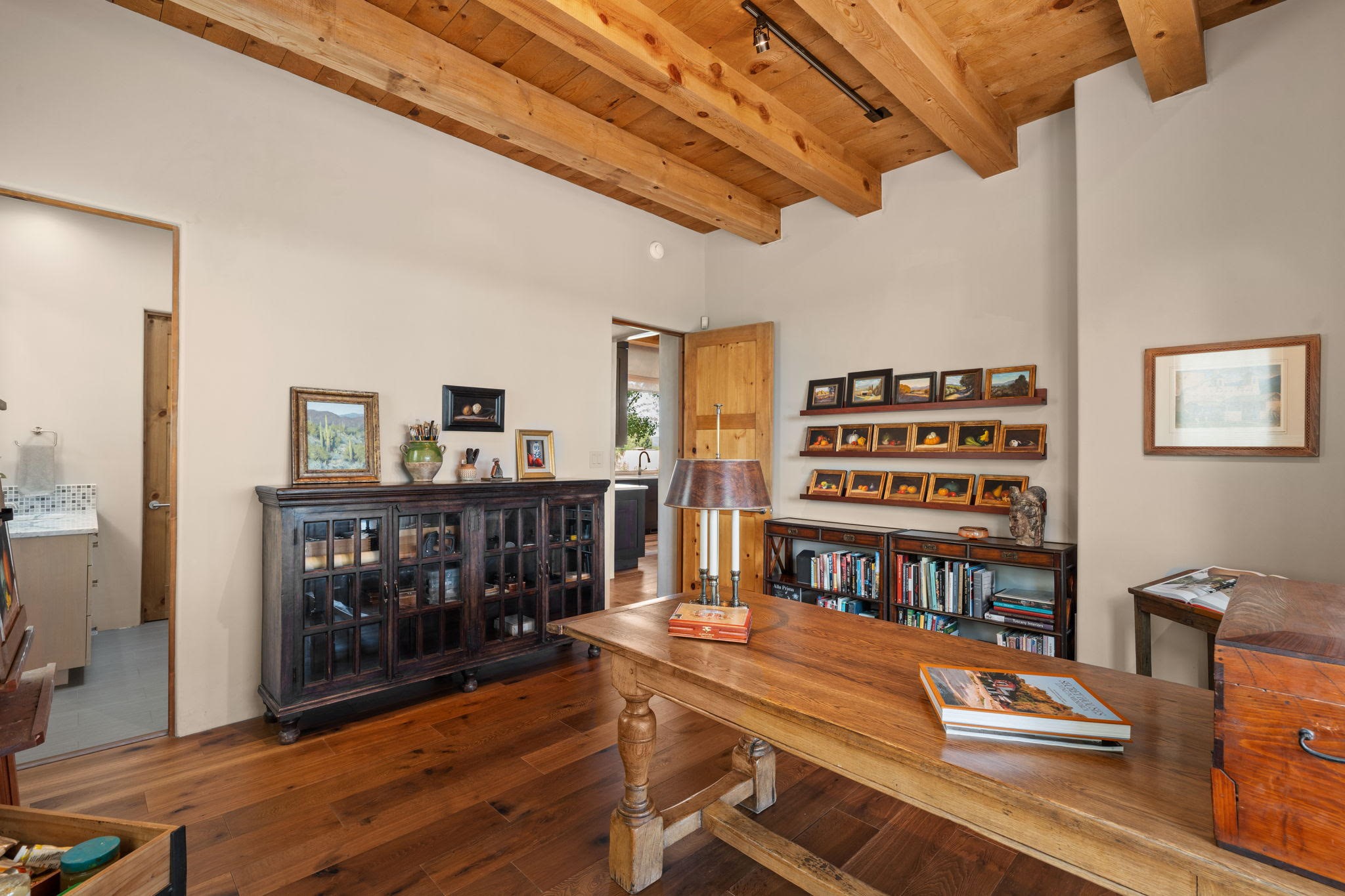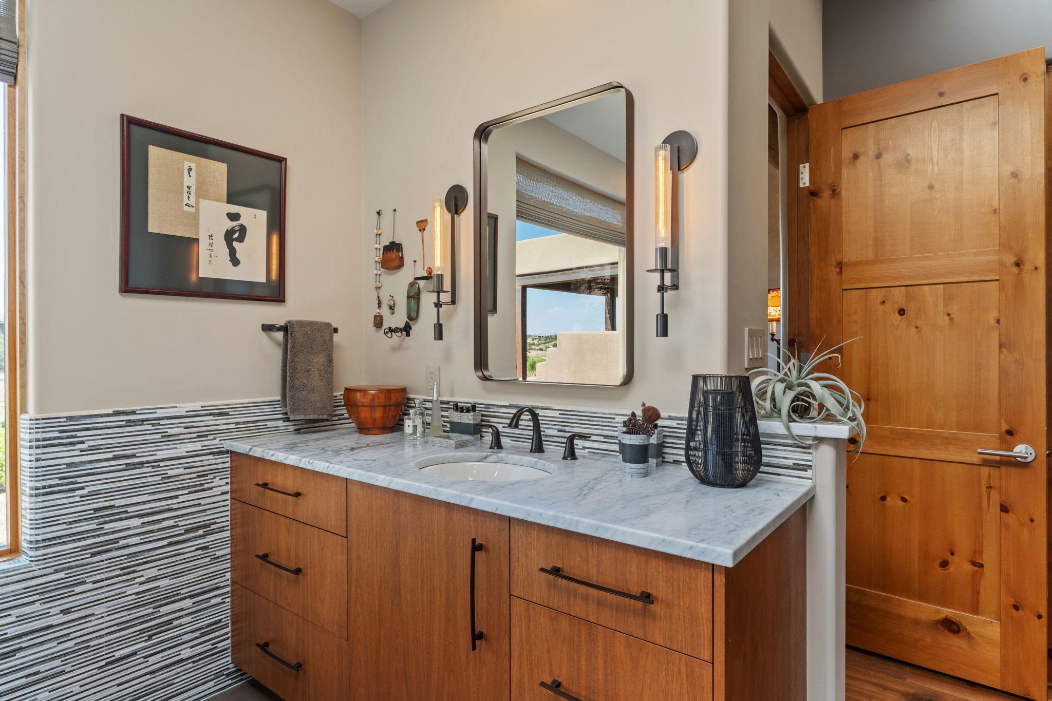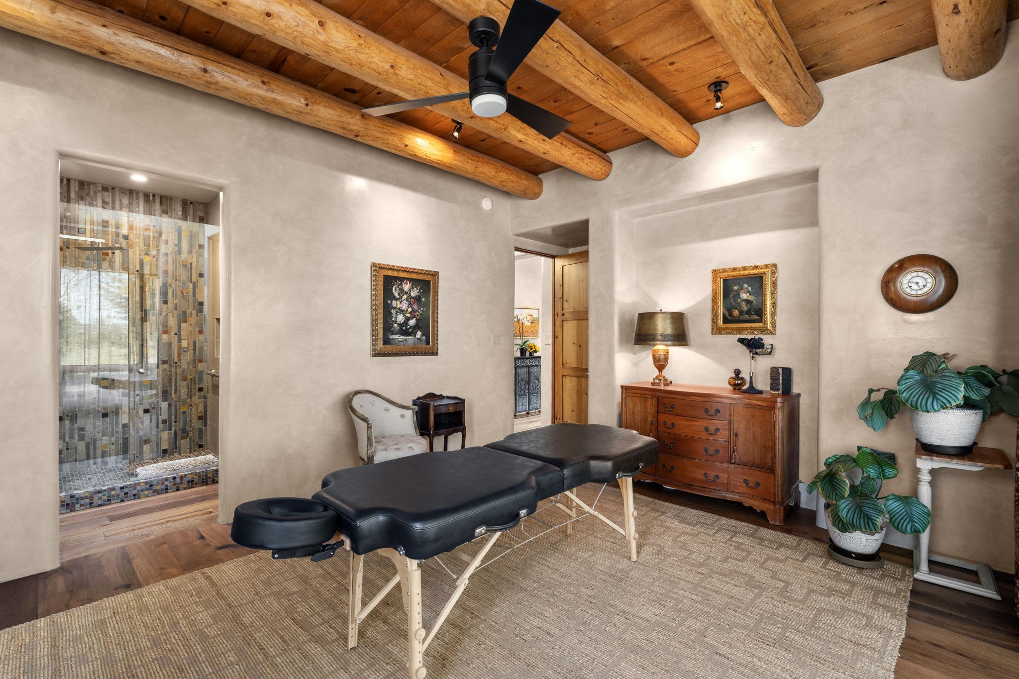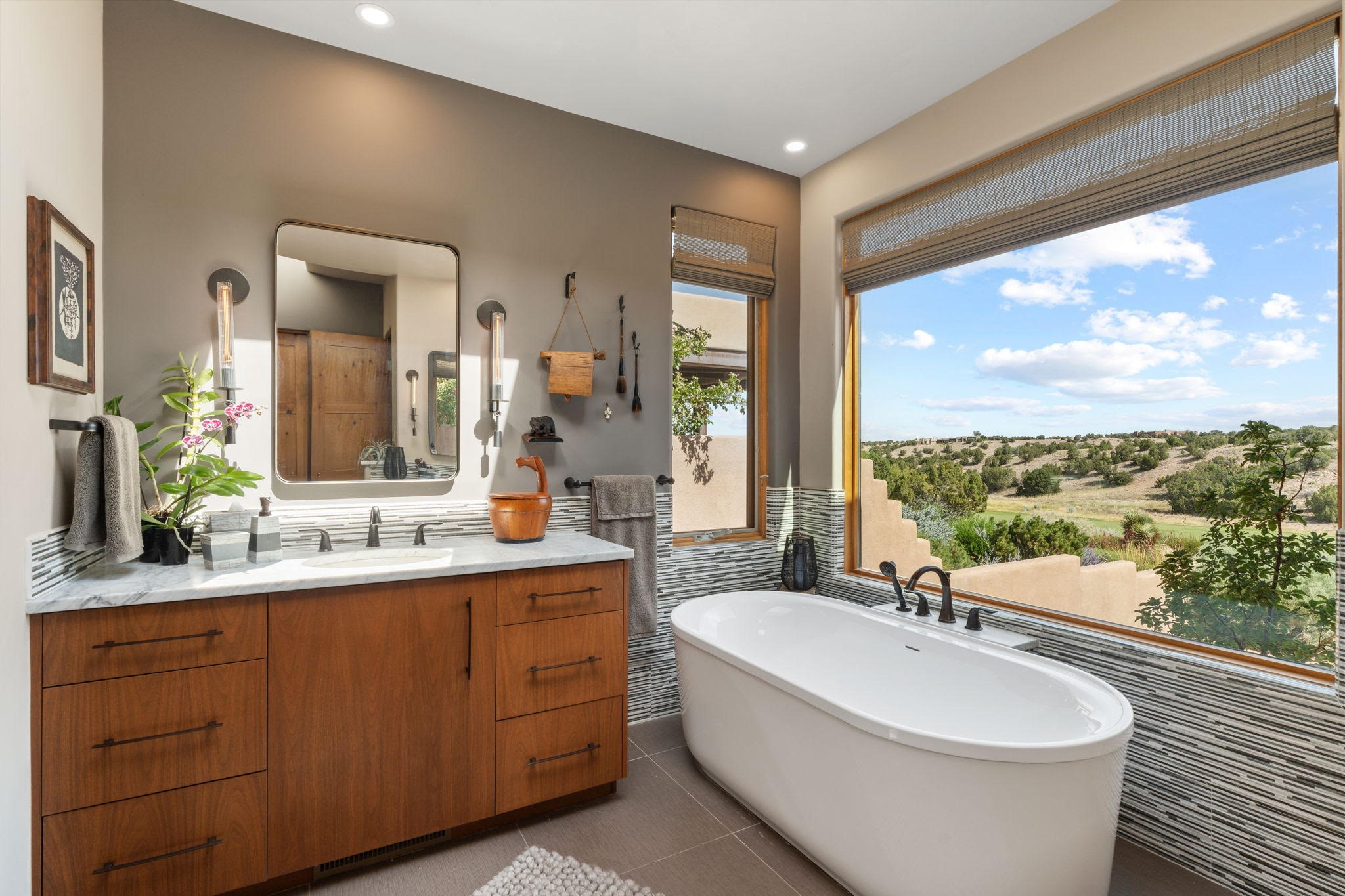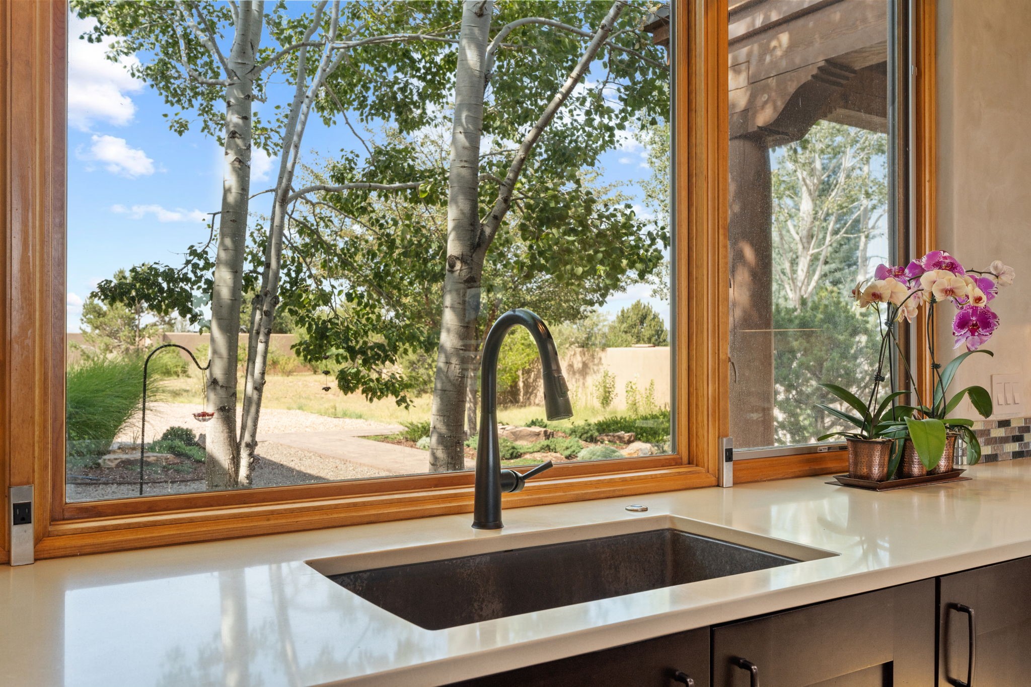 Stunning Tierra Concepts-built home in Las Campanas, plus Golf Membership, select furnishings and Tesla Model 3 are available. this soft contemporary home was chosen by the Developer to be his personal residence. Thoughtful design and remarkable custom finishes grace every aspect of this home.Retracting glass walls create indoor-outdoor flow and maximize spectacular views of both the Sangre de Cristo and Jemez mountains. Home overlooks the Las Campanas Sunset course and offers true indoor/outdoor living on the expansive portal - ideal for intimate gatherings or large-scale entertaining. Take in the 16-ft viga ceilings and diamond plaster in the great room. Throughout the house, numerous skylights, clerestory and large windows allow for abundant light at any time of day. Imagine evenings in front of the new wood-burning fireplace with floor-to-ceiling stacked-stone facing.Chef's kitchen has a six-burner Wolf range, SubZero refrigerator, and 2-drawer dishwasher, as well as generous counter space and storage. Over the kitchen sink is a picture window offering serene views of iconic aspen trees.Primary suite has high ceilings, diamond plaster, a remote-control gas fireplace, and spa-like bath with steam shower, soaking tub, dual vanities and a well-appointed walk-in closet.All bedrooms enjoy privacy with great separation with en-suite bathrooms. The fashionable home is situated on a large, deep lot with new landscaping, enhancing the views. There is a two-car garage with additional storage.Other improvements within last 2 years:- Upgraded HVAC system- New stucco- On-demand H2O heater- Water treatment system- Whole-house surge protection- Custom remote-control window coverings in main rooms- Steam shower & new fixtures in master- New washer/dryer- EV charging station in garage- New garage door & opener- Bidet seats w/remotes- Upgraded lighting throughout- ADA fixtures added to front suite shower