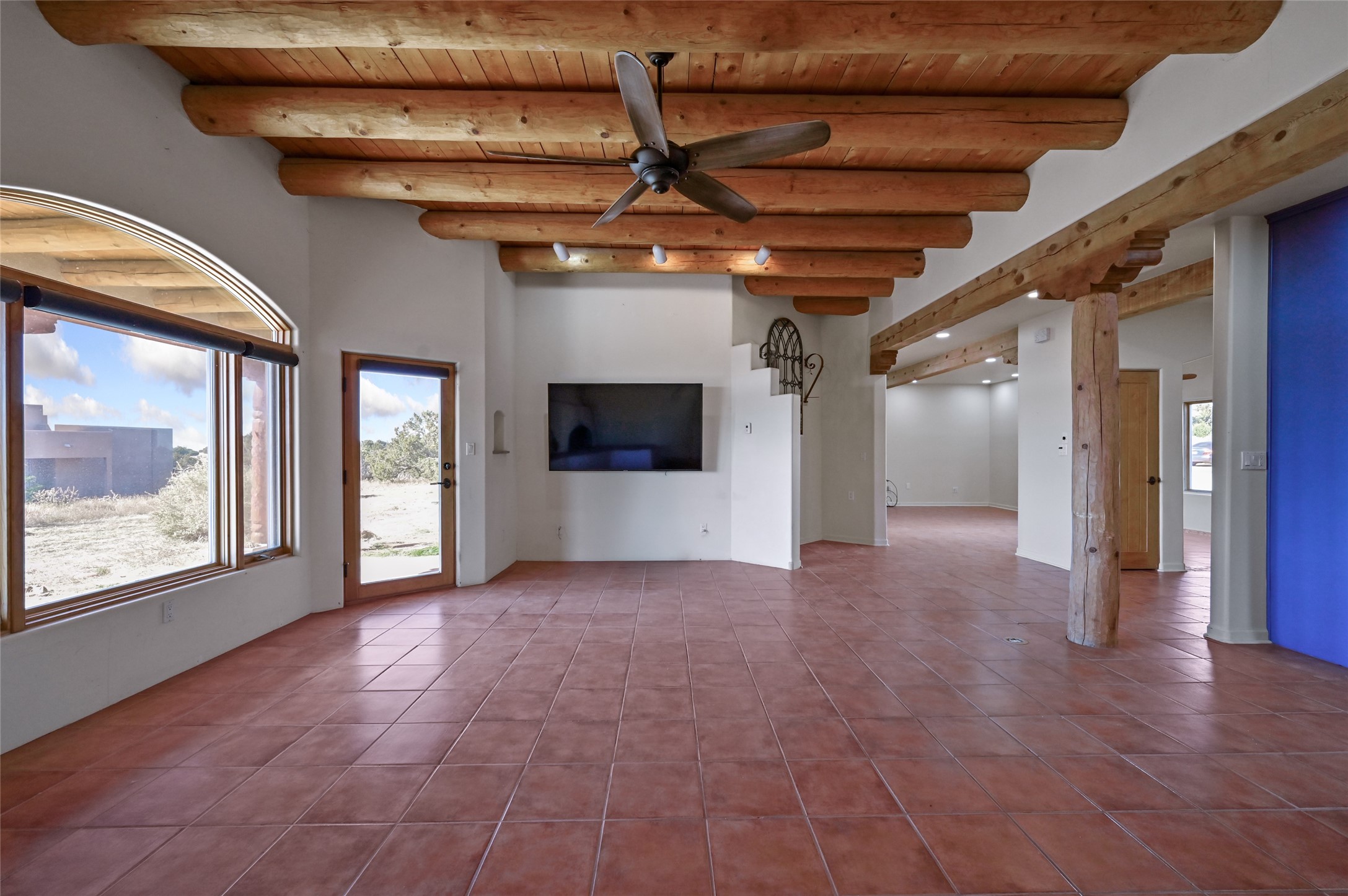 Desirable Eldorado location with stunning Sangre de Cristo and Sandia Mountain views! Set on almost two acres, this beautiful home offers the perfect balance of rural serenity and easy access to Santa Fe's shops, dining, and amenities. Featuring viga ceilings, a very large open floor plan, and generously sized rooms throughout, the home combines spaciousness with classic Santa Fe charm. The flexible layout includes three ensuite bedrooms, four bathrooms, plus an office, ideal for guests, family, or a home workspace. Numerous recent upgrades include the kitchen, bathrooms, well equipment, and roof, providing modern comfort and peace of mind. The modern eat-in kitchen opens to bright living areas accented by wood vigas and a kiva fireplace. Enjoy in-floor radiant heat and take in the expansive mountain views from the covered portal, perfect for outdoor dining or quiet evenings. A two-car garage and workshop/artist studio offer ample space for projects and storage. With breathtaking views, thoughtful upgrades, and an unbeatable Eldorado setting, this home truly has it all--space, style, and comfort in every detail.
