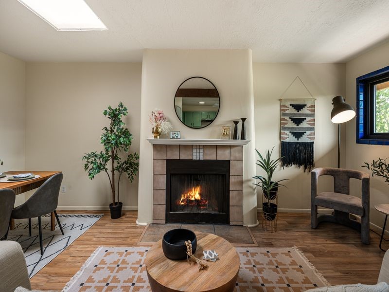 Tucked away on a quiet dead-end street, this rare 2-bedroom, 1-bath condo is one of only six in a small, well-cared-for community. Surrounded by mature gardens and a peaceful setting, it offers both privacy and convenience, just blocks from the Santa Fe Railyard and historic downtown.Inside, you'll find light-filled living spaces, in-unit laundry, and a California double garage--a true rarity in this location. The garage offers versatile use for secure parking, extra storage, or a creative studio space.Enjoy beautiful Sangre de Cristo Mountain views from the balcony and sunset skies from the bedroom. Recent upgrades include new stucco, windows, and a roof, providing low-maintenance living for years to come.Whether you're an artist seeking inspiration or simply want a quiet retreat close to it all, this property offers the perfect blend of Santa Fe charm, comfort, and location.Condos in this community seldom come to market--don't miss your chance to own a special piece of Santa Fe.