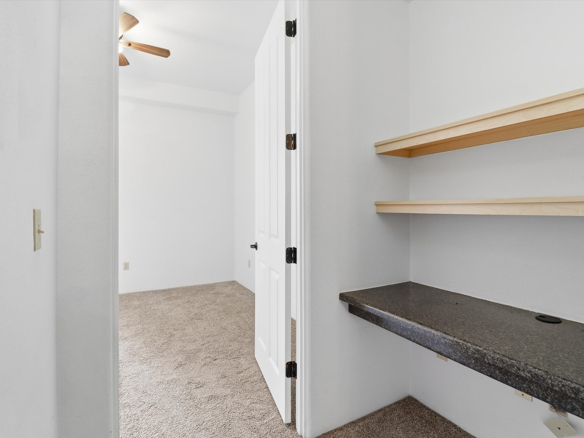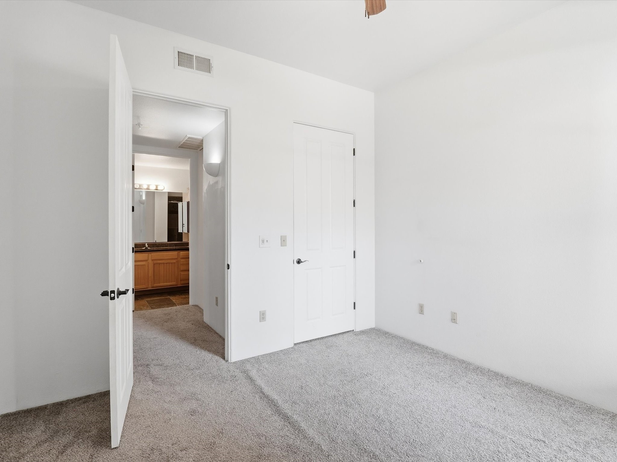 Welcome to this beautiful corner unit in the desirable Alameda Condos! Having abundant natural light, this ground-floor gem has two bedrooms, each with its own full bathroom and walk-in closet. The primary bedroom offers a private patio entrance and an enclosed shower area, perfect for relaxing mornings.Enjoy an open-concept living and dining space centered around a cozy gas corner Kiva fireplace, while the kitchen is equipped with appliances for new homeowners daily use. Step outside to your fenced patio and take in serene pool views.With central refrigerated air conditioning, a host of community amenities--including a pool, gym, reading rooms, gated parking, on-site office, and building-wide WiFi--this condo is perfect for full-time living or a convenient lock-and-leave lifestyle. Comfort, style, and security all in one!
