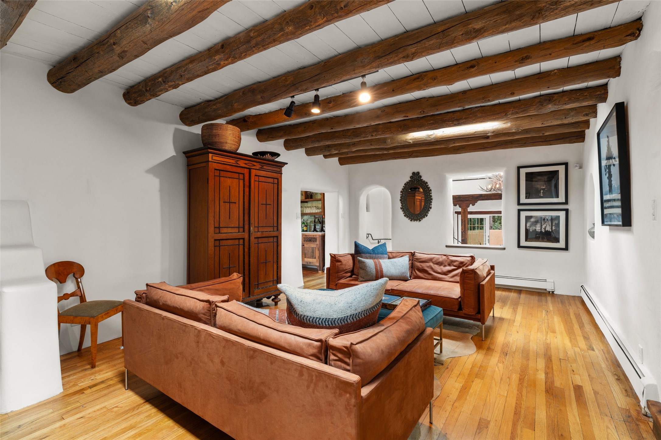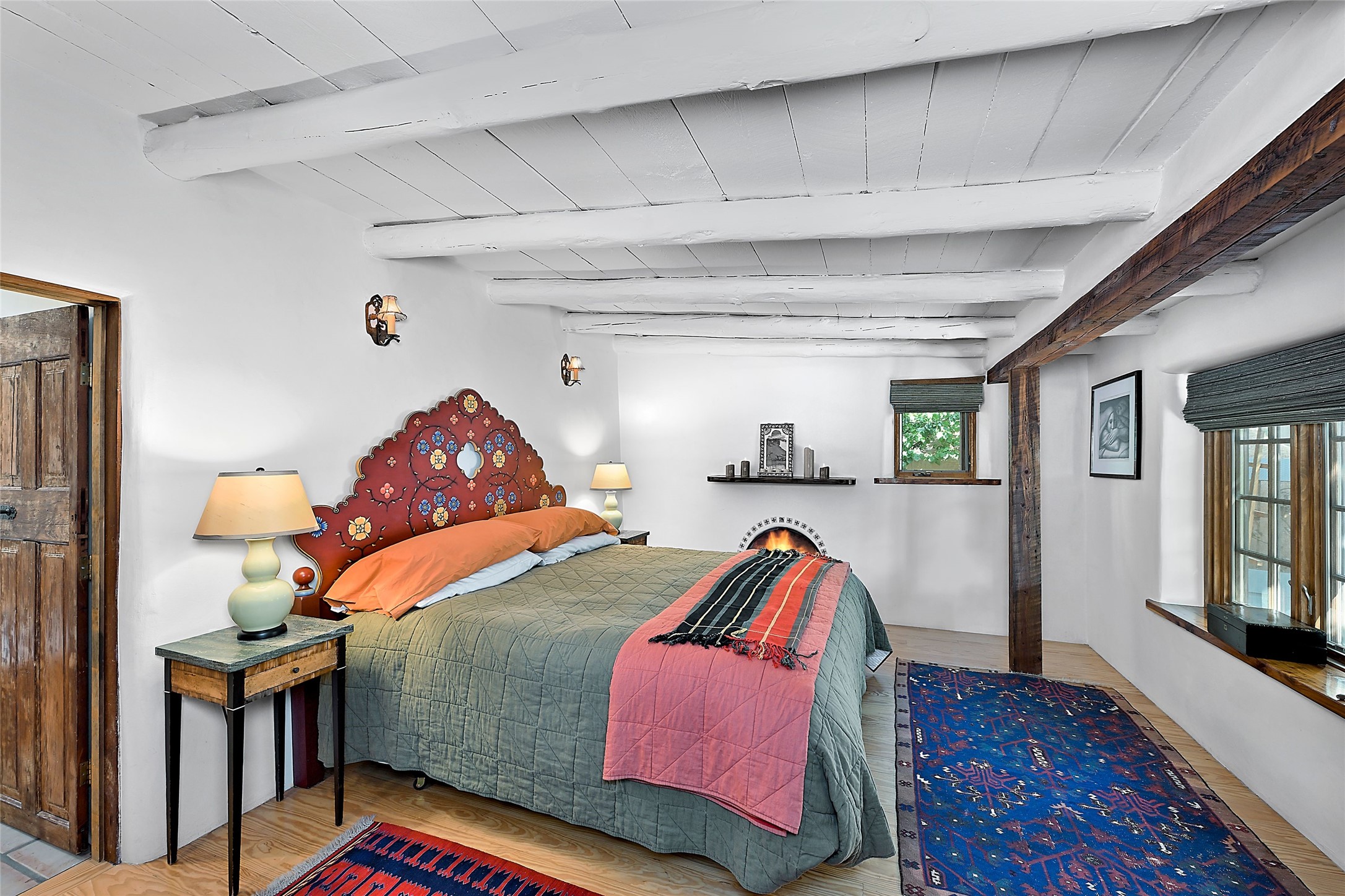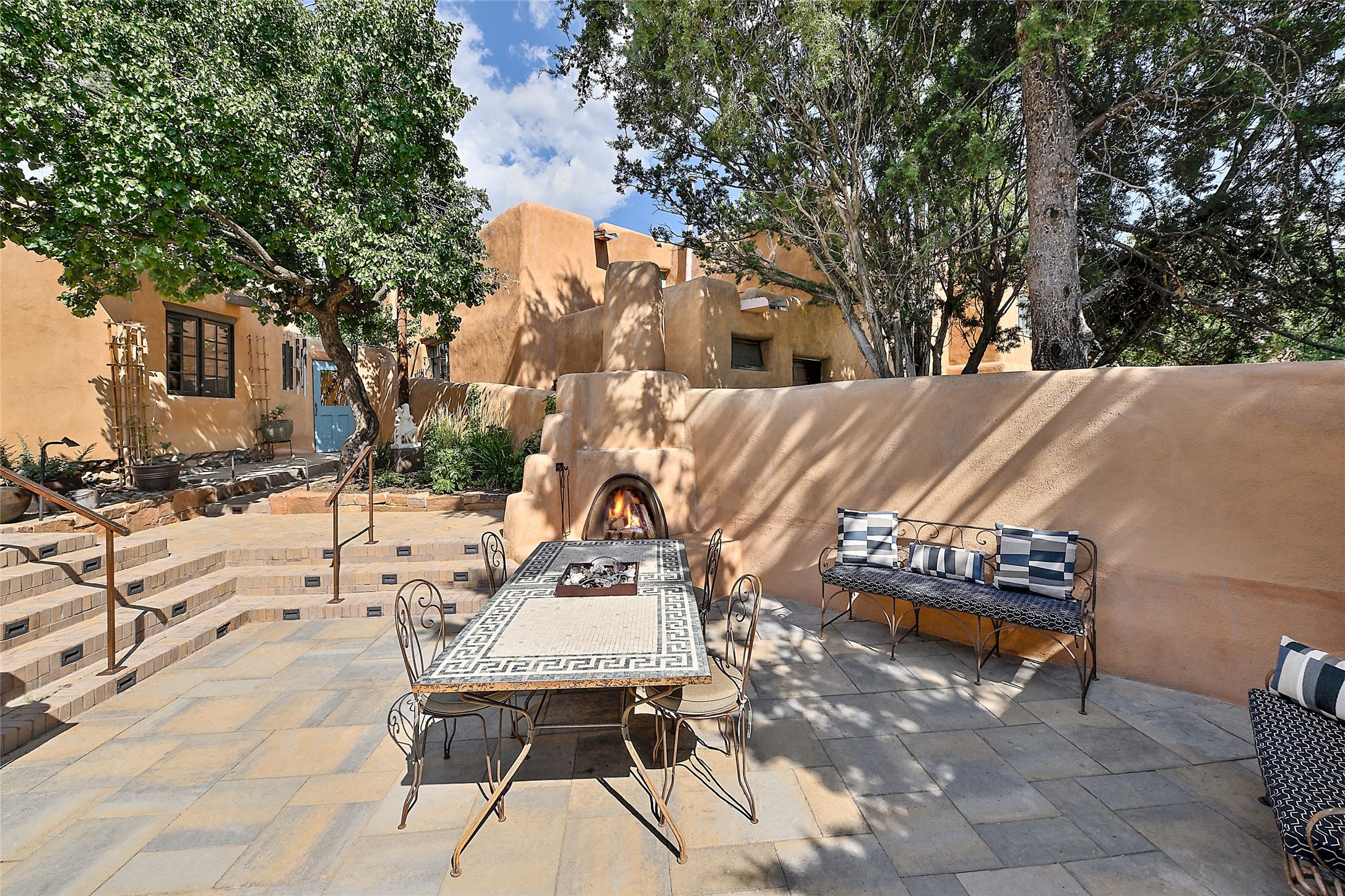 Located in the highly sought-after A++ location on Camino Del Monte Sol, this beautifully remodeled Eastside gem blends timeless Santa Fe charm with modern comfort. Once the residence of renowned artist Joseph Bakos, this one-of-a-kind property offers a rare opportunity to own a piece of Santa Fe history. With approximately 2,843 sq ft of living space, the main home features 3 bedrooms and 3 baths, set on a serene lot with several enchanting outdoor living areas and gardens lovingly curated by the current owners. A magical entry courtyard welcomes you into a space rich in character and authenticity. Classic Santa Fe architectural elements include adobe and frame construction, plaster walls, vigas and beams, kiva fireplaces, and a mix of wood and tile flooring. The custom La Puerta kitchen is a true centerpiece--beautifully crafted and fully equipped for modern living. In addition to the main house, a detached 300 sq ft studio or library offers flexible space for creative work, quiet reading, or extra storage. Ample off-street parking adds convenience to this exceptional property. Turn-key and meticulously maintained, this residence exemplifies the finest in Santa Fe real estate--where heritage, elegance, and location converge.