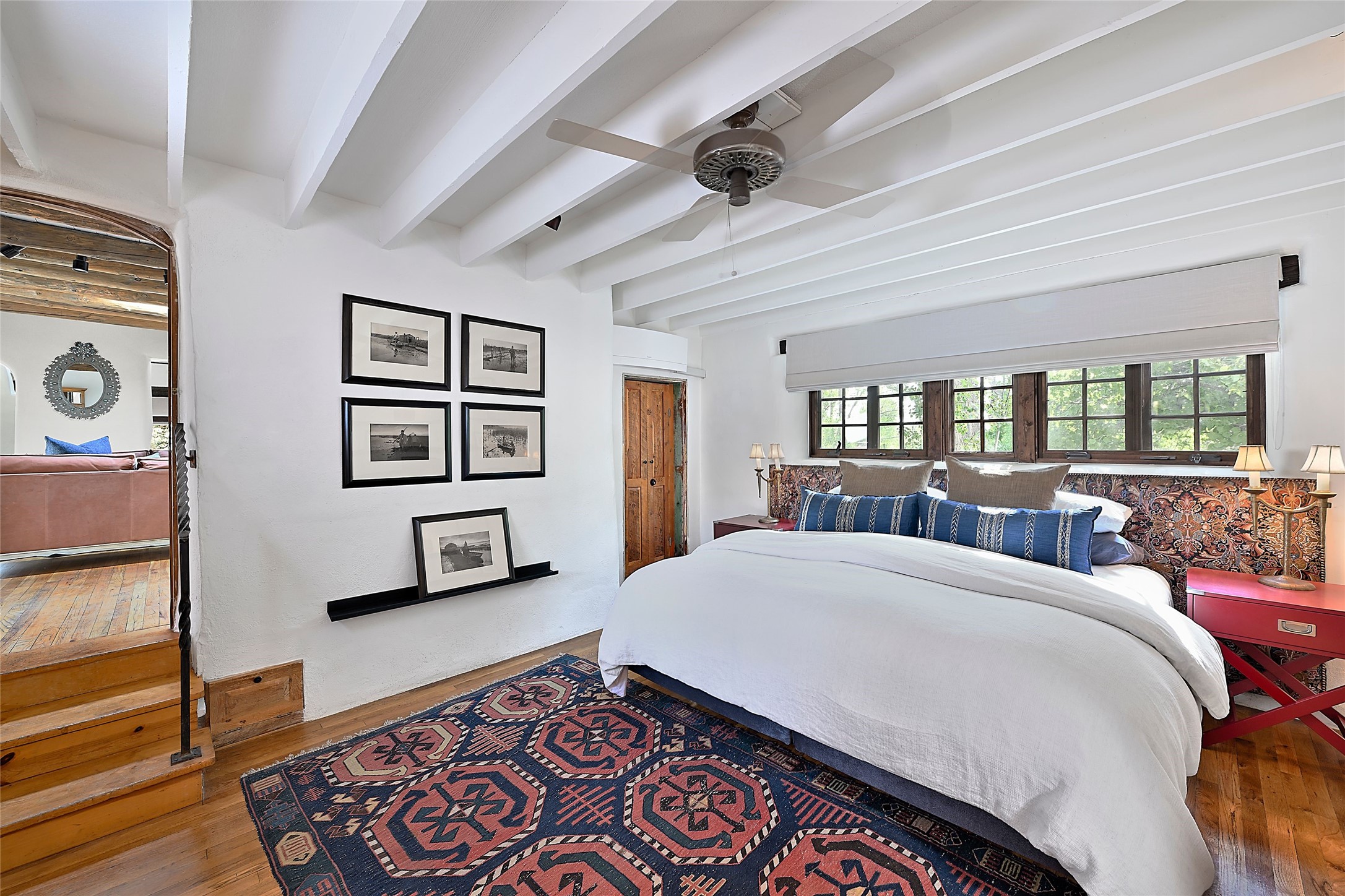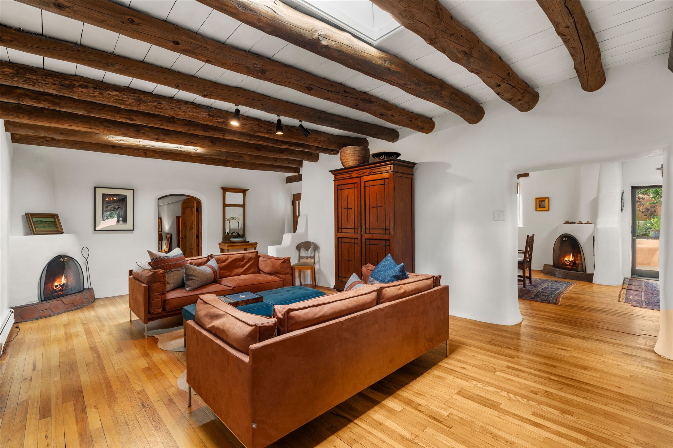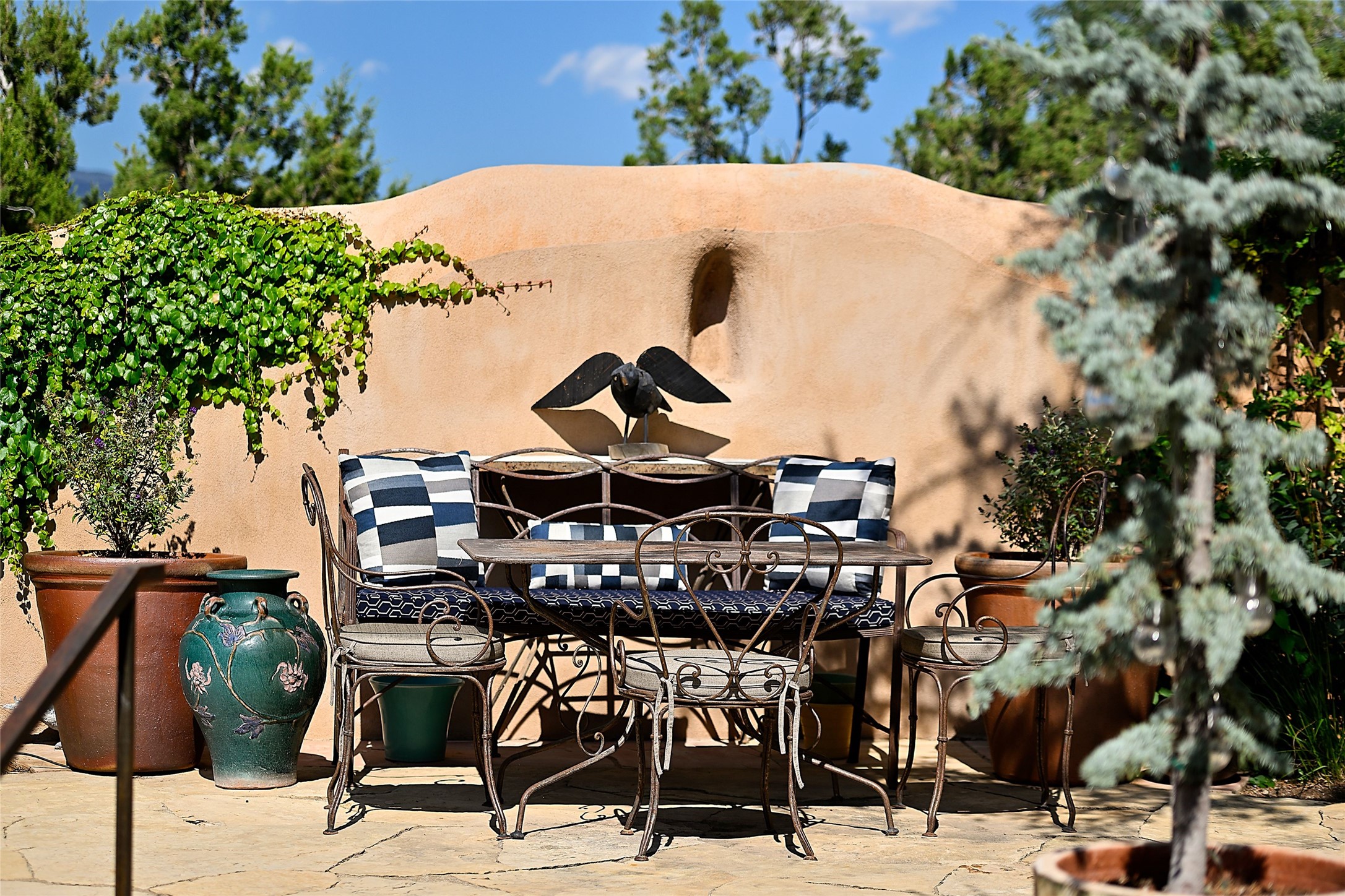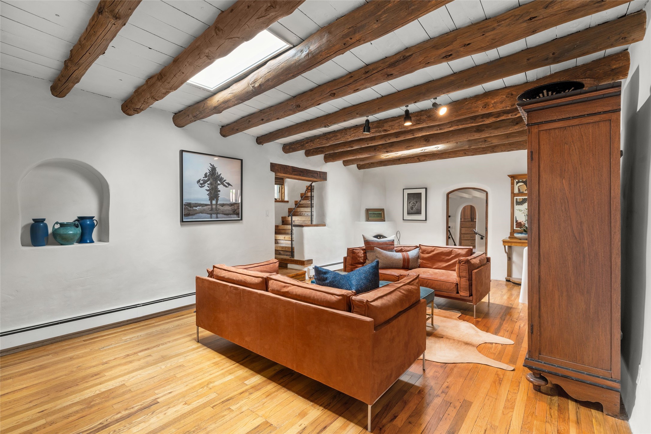 Located in the highly sought-after A++ location on Camino Del Monte Sol, this beautifully remodeled Eastside gem blends timeless Santa Fe charm with modern comfort. Once the residence of renowned artist Joseph Bakos, this one-of-a-kind property offers a rare opportunity to own a piece of Santa Fe history. With approximately 2,843 sq ft of living space, the main home features 3 bedrooms and 3 baths, set on a serene lot with several enchanting outdoor living areas and gardens lovingly curated by the current owners. A magical entry courtyard welcomes you into a space rich in character and authenticity. Classic Santa Fe architectural elements include adobe and frame construction, plaster walls, vigas and beams, kiva fireplaces, and a mix of wood and tile flooring. The custom La Puerta kitchen is a true centerpiece--beautifully crafted and fully equipped for modern living. In addition to the main house, a detached 300 sq ft studio or library offers flexible space for creative work, quiet reading, or extra storage. Ample off-street parking adds convenience to this exceptional property. Turn-key and meticulously maintained, this residence exemplifies the finest in Santa Fe real estate--where heritage, elegance, and location converge.