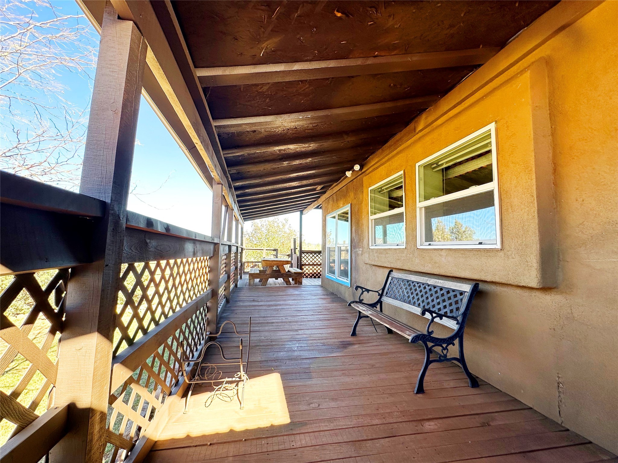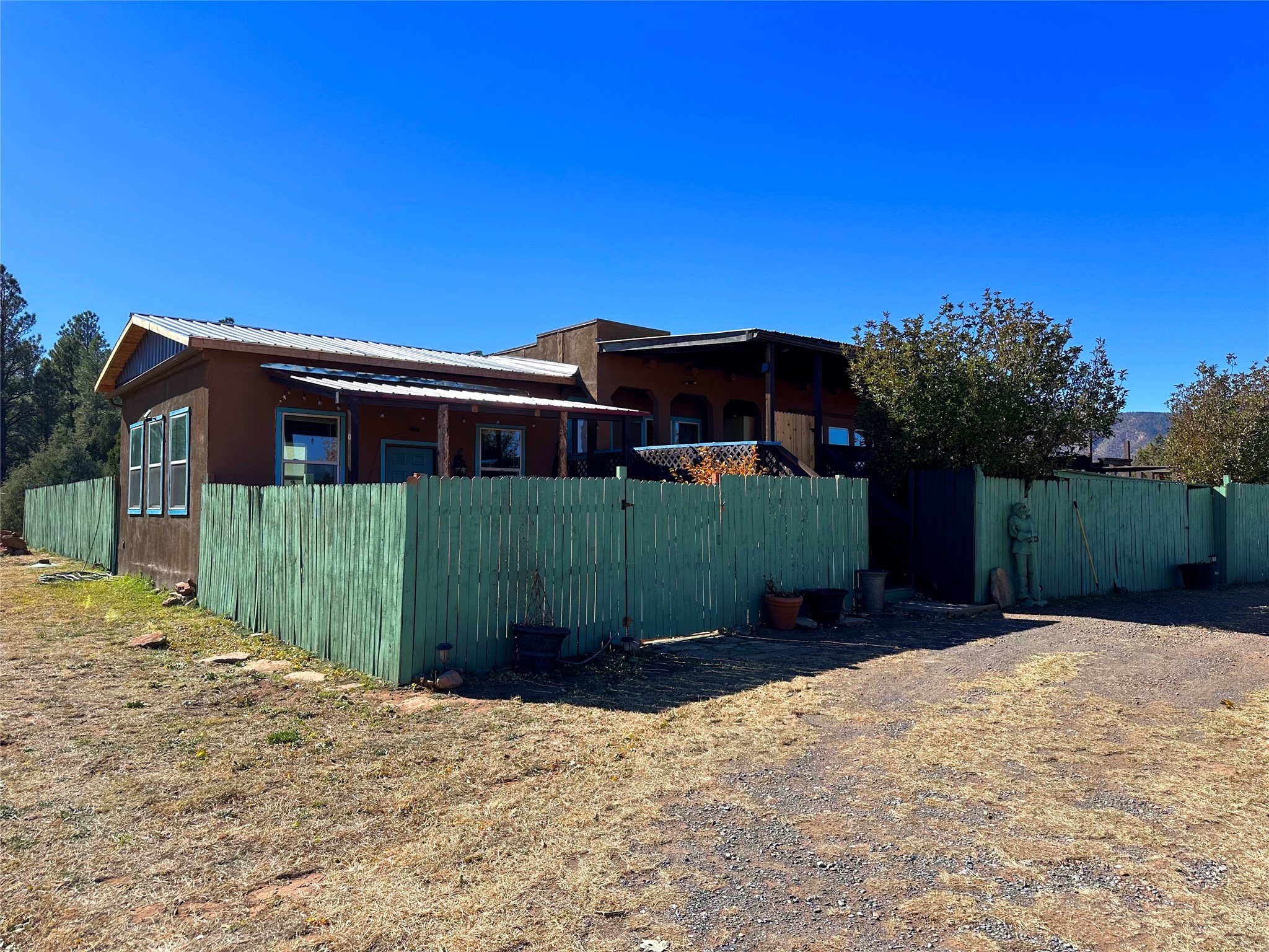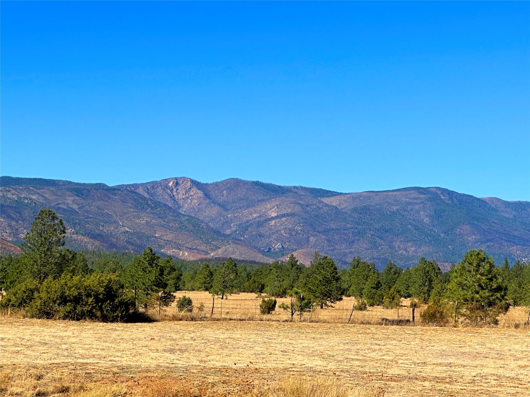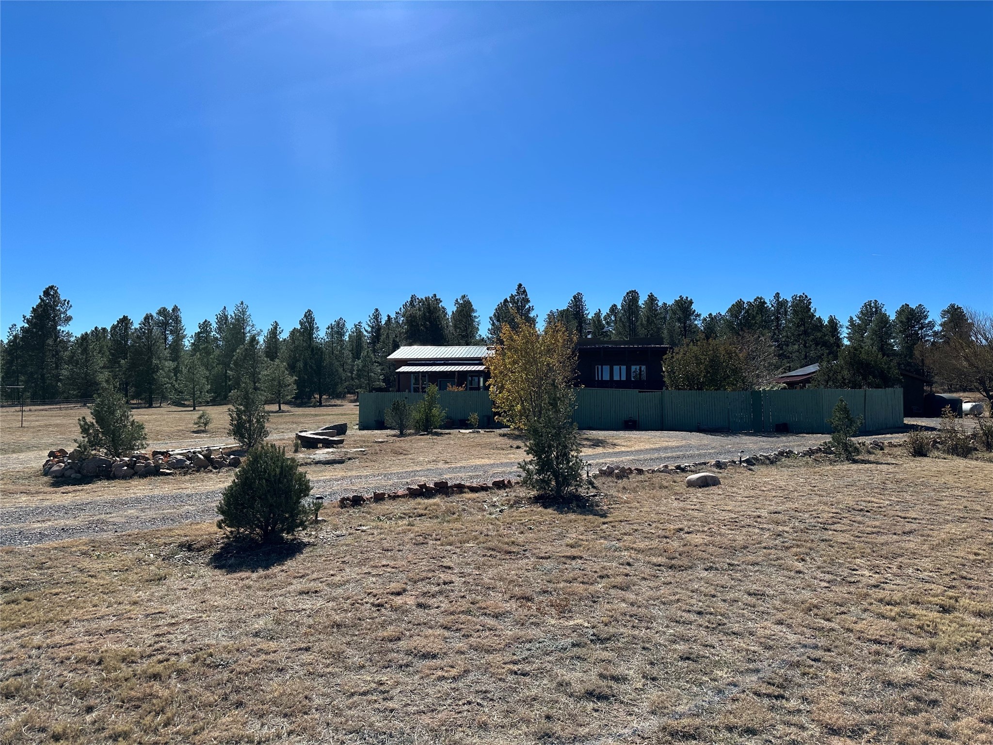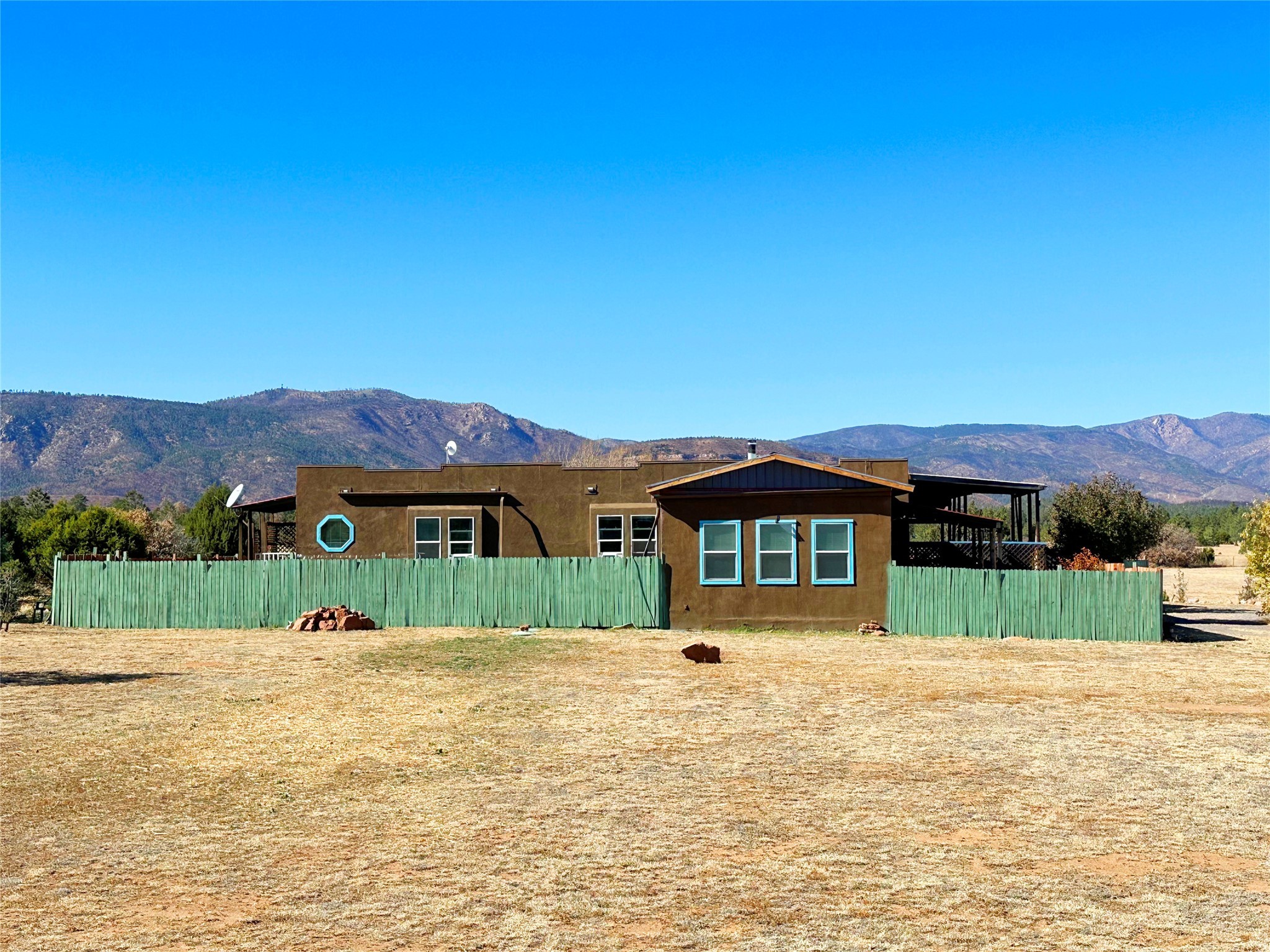 Welcome home to this delightful 2 bedroom, 2 bath modular home on 5.04 acres of stunning New Mexico landscape in San Geronimo. This beautifully level property offers breathtaking panoramic mountain views, rolling meadows, and graceful pine trees - your own natural sanctuary. The thoughtfully designed master suite serves as your personal haven, featuring a comfortable sitting area and access to its own private covered deck where you can unwind after a fulfilling day. Additionally, the home features an expansive wrap-around deck offering commanding views of the iconic Hermit's Peak and spectacular sunsets across the crisp mountain landscape.The spacious kitchen provides generous storage and counter space, ideal for preparing meals or entertaining. The den offers wonderful flexibility with its