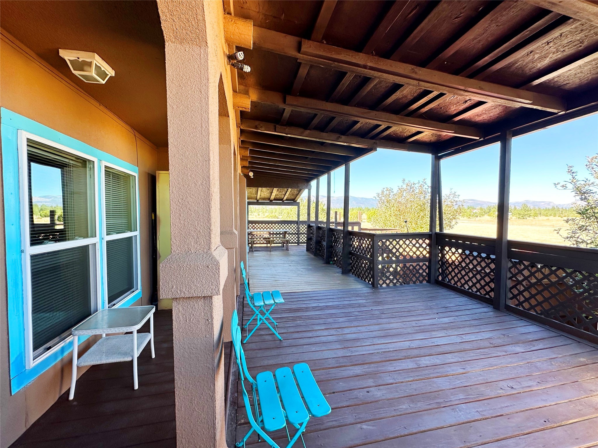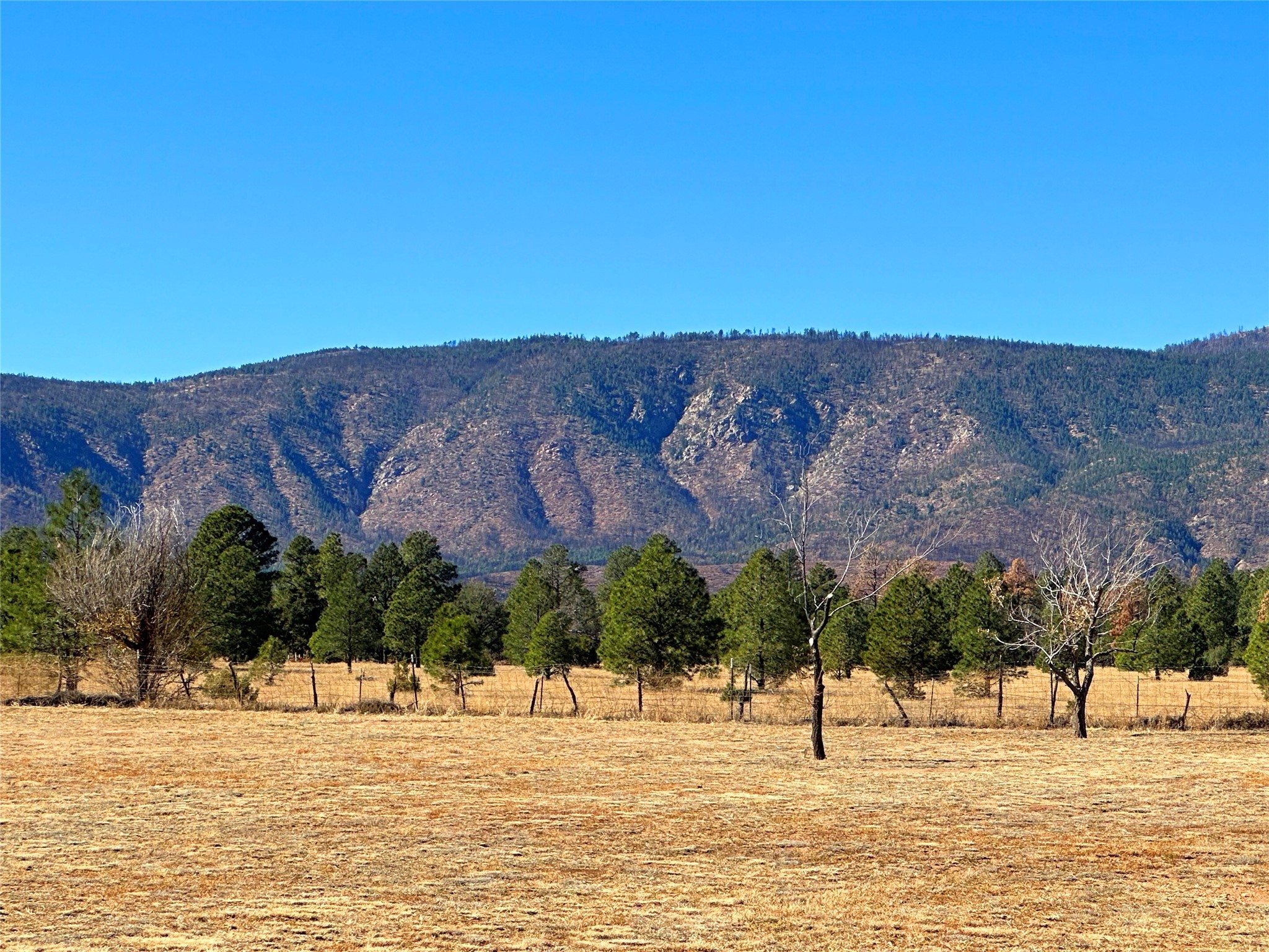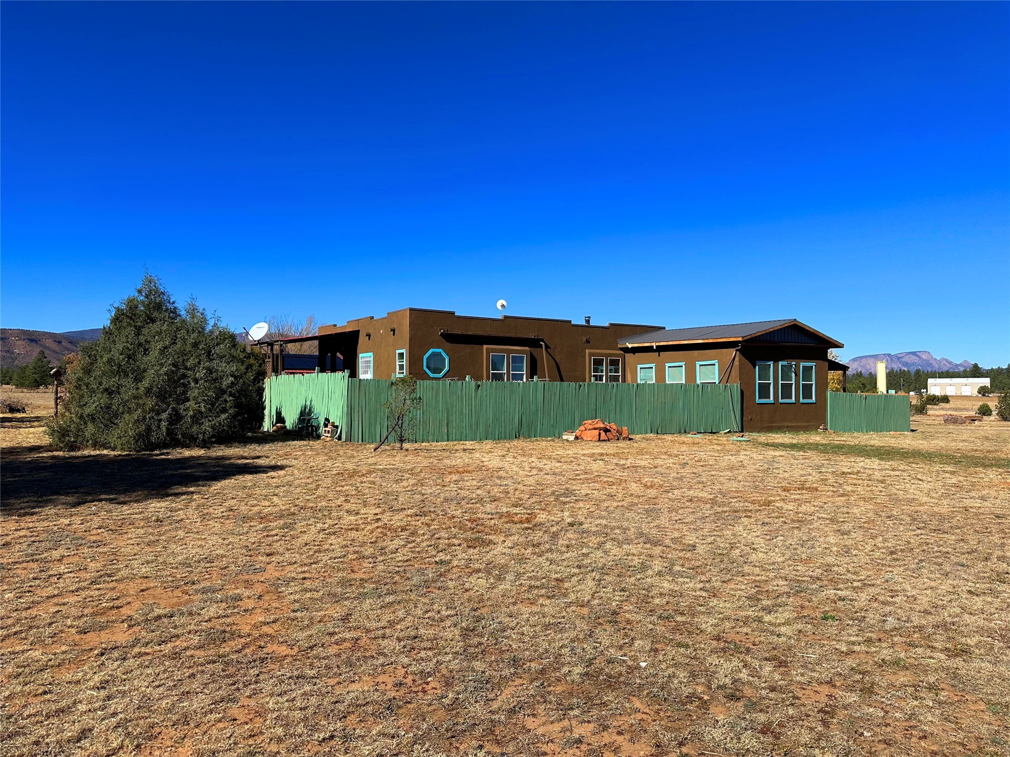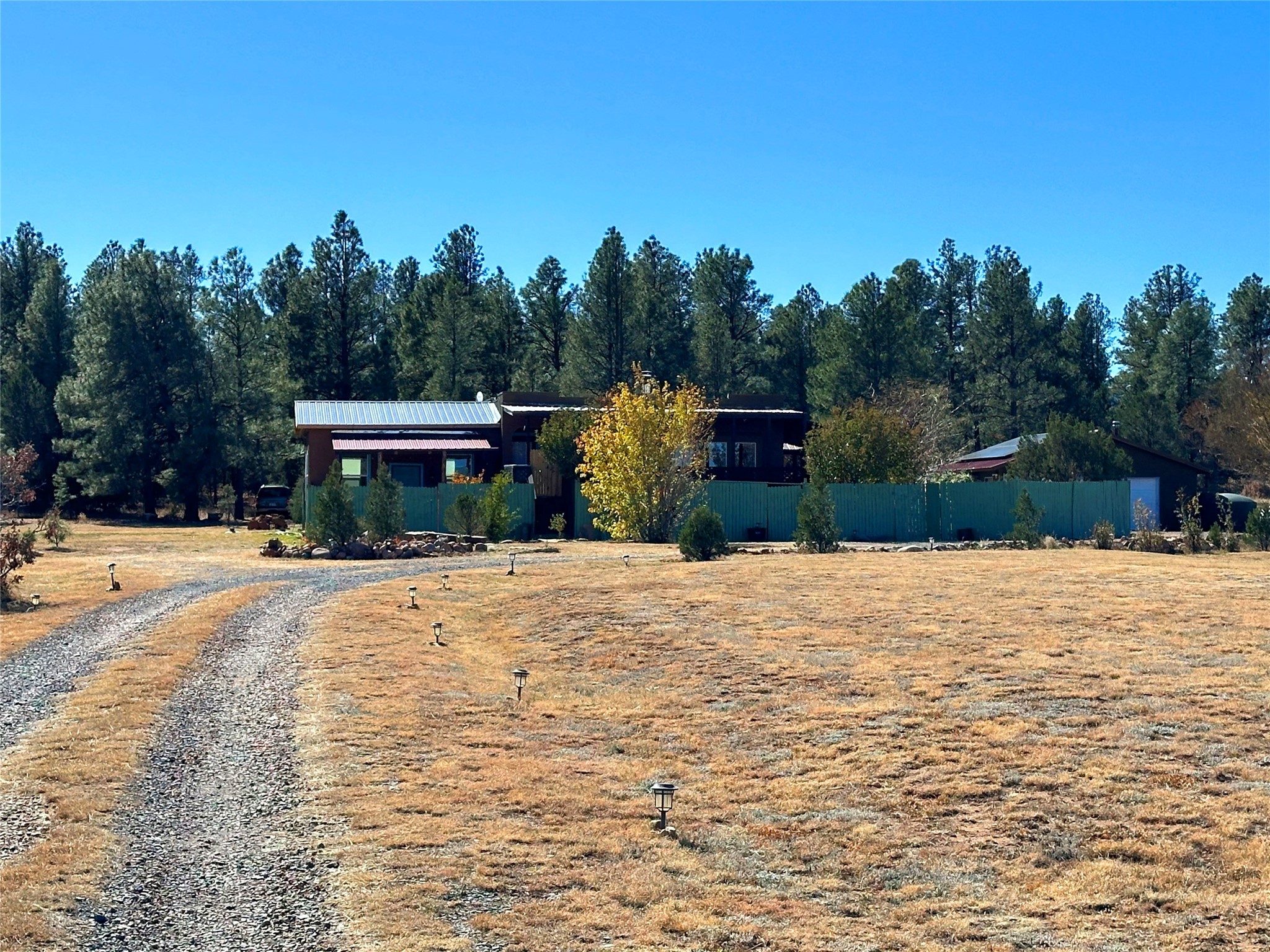 Welcome home to this delightful 2 bedroom, 2 bath modular home on 5.04 acres of stunning New Mexico landscape in San Geronimo. This beautifully level property offers breathtaking panoramic mountain views, rolling meadows, and graceful pine trees - your own natural sanctuary. The thoughtfully designed master suite serves as your personal haven, featuring a comfortable sitting area and access to its own private covered deck where you can unwind after a fulfilling day. Additionally, the home features an expansive wrap-around deck offering commanding views of the iconic Hermit's Peak and spectacular sunsets across the crisp mountain landscape.The spacious kitchen provides generous storage and counter space, ideal for preparing meals or entertaining. The den offers wonderful flexibility with its
