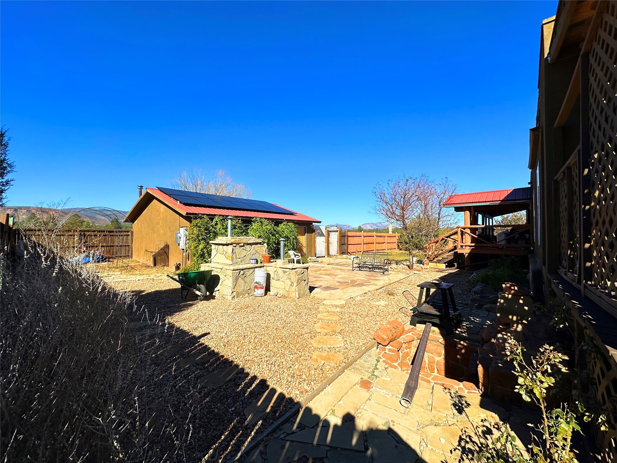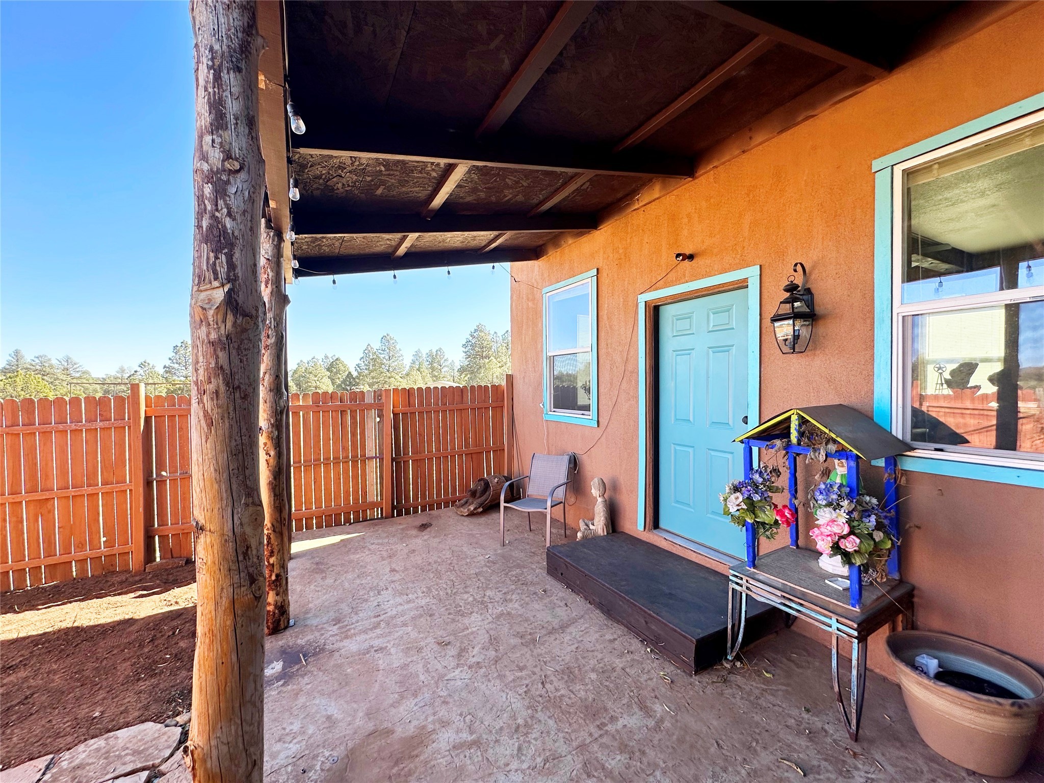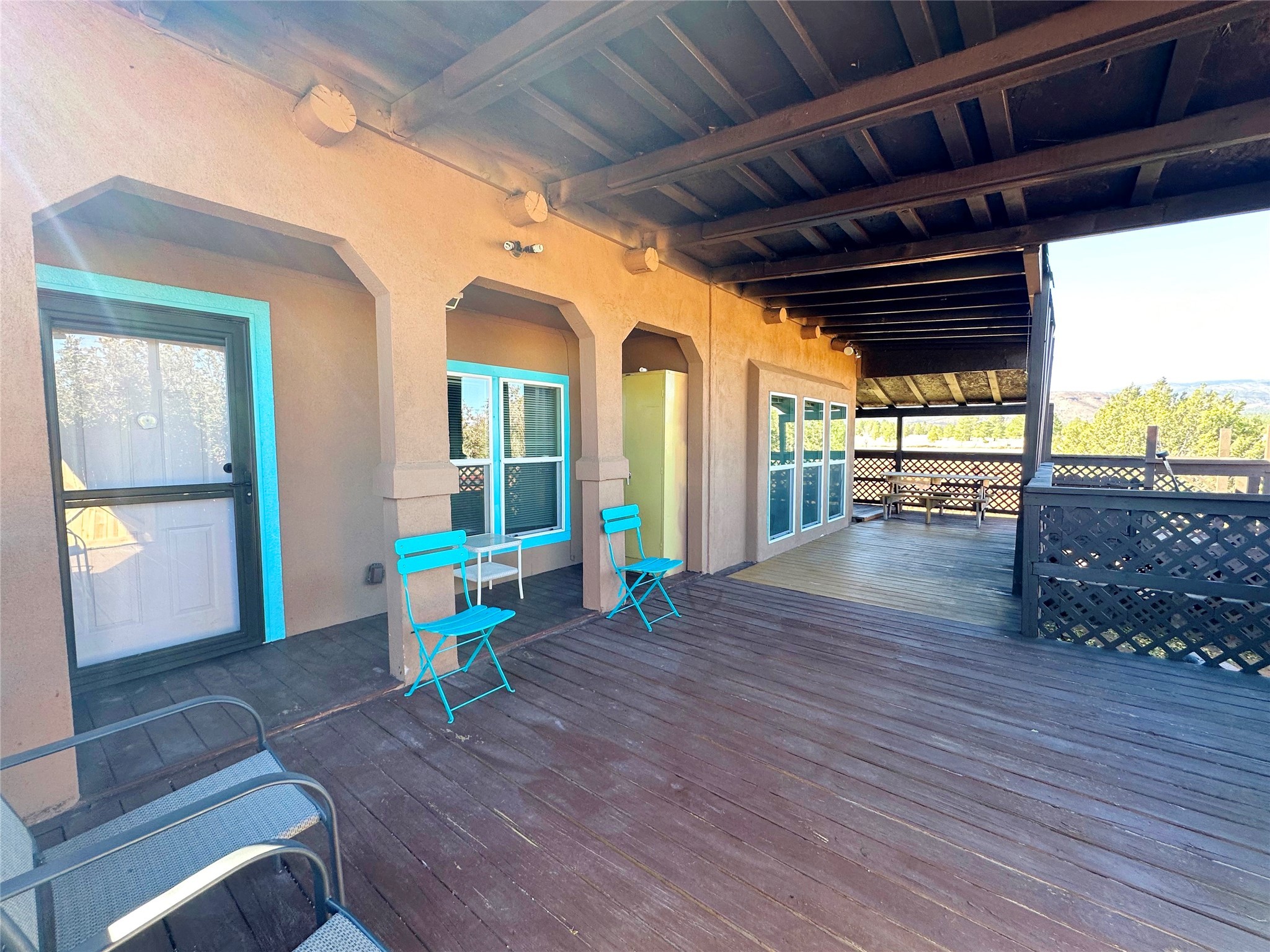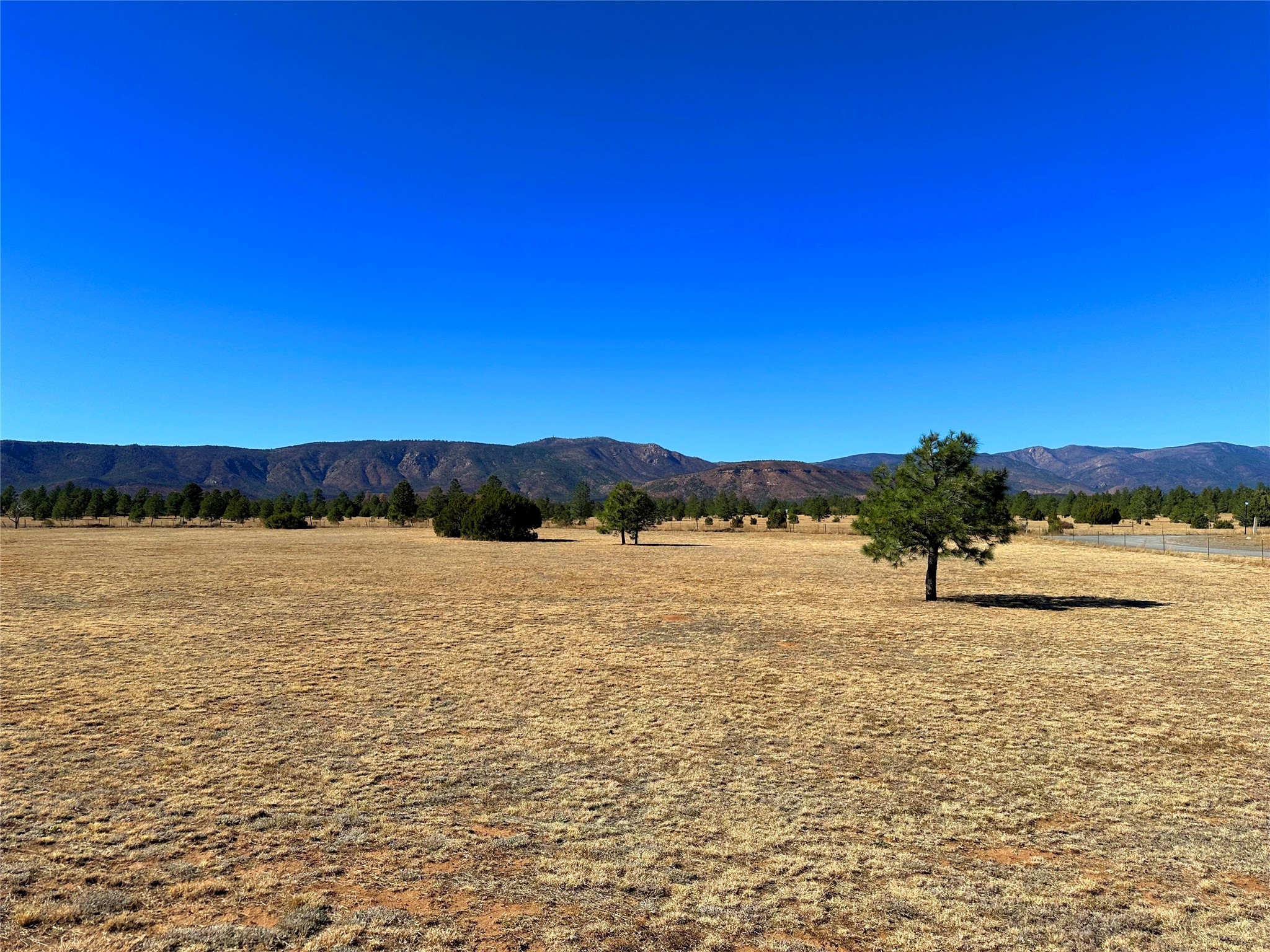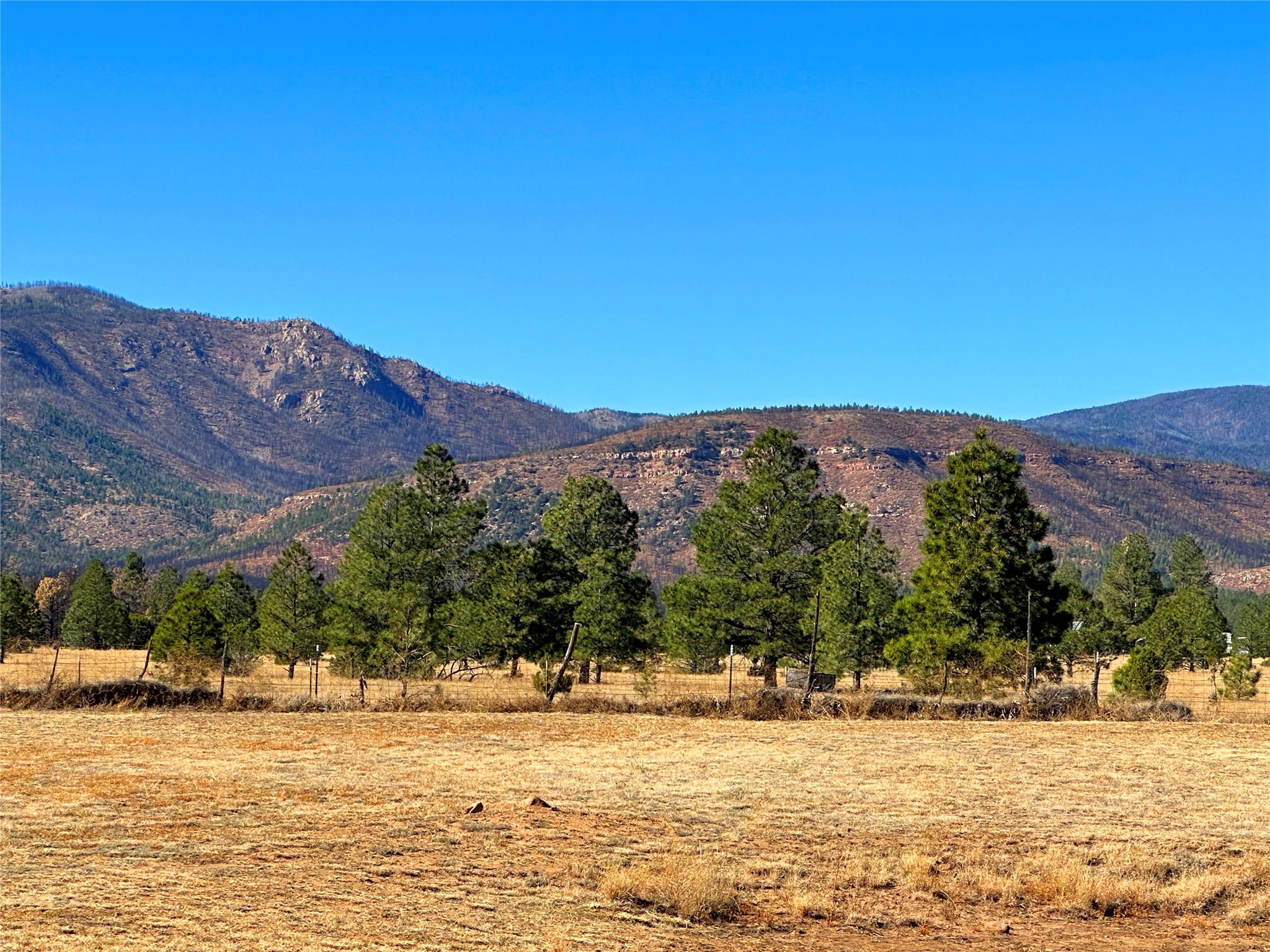 Welcome home to this delightful 2 bedroom, 2 bath modular home on 5.04 acres of stunning New Mexico landscape in San Geronimo. This beautifully level property offers breathtaking panoramic mountain views, rolling meadows, and graceful pine trees - your own natural sanctuary. The thoughtfully designed master suite serves as your personal haven, featuring a comfortable sitting area and access to its own private covered deck where you can unwind after a fulfilling day. Additionally, the home features an expansive wrap-around deck offering commanding views of the iconic Hermit's Peak and spectacular sunsets across the crisp mountain landscape.The spacious kitchen provides generous storage and counter space, ideal for preparing meals or entertaining. The den offers wonderful flexibility with its