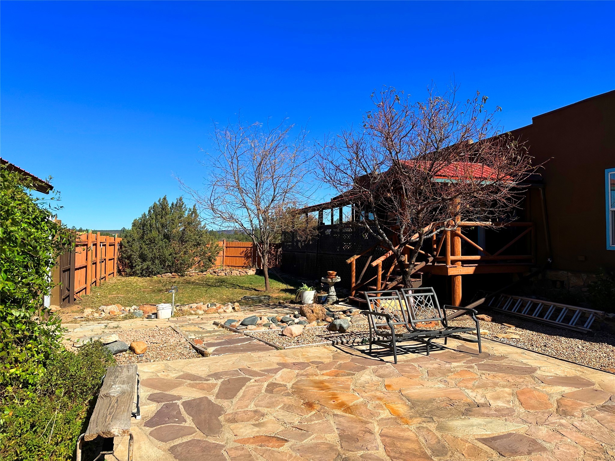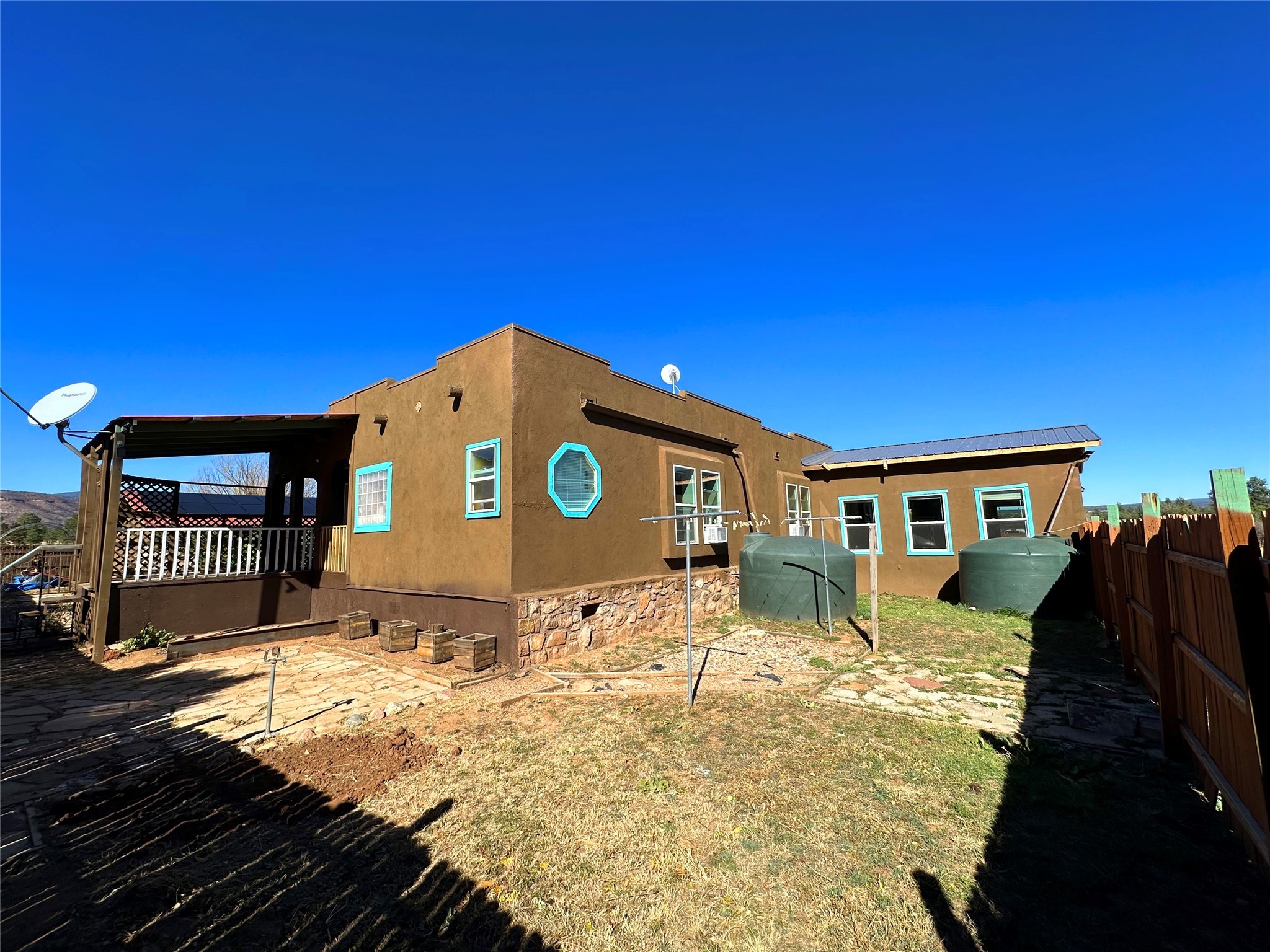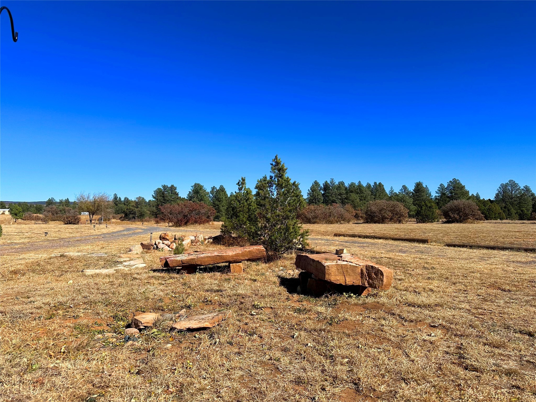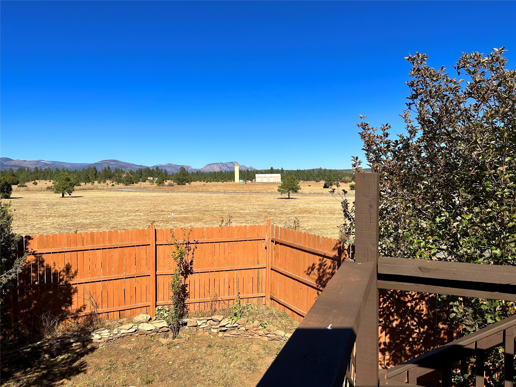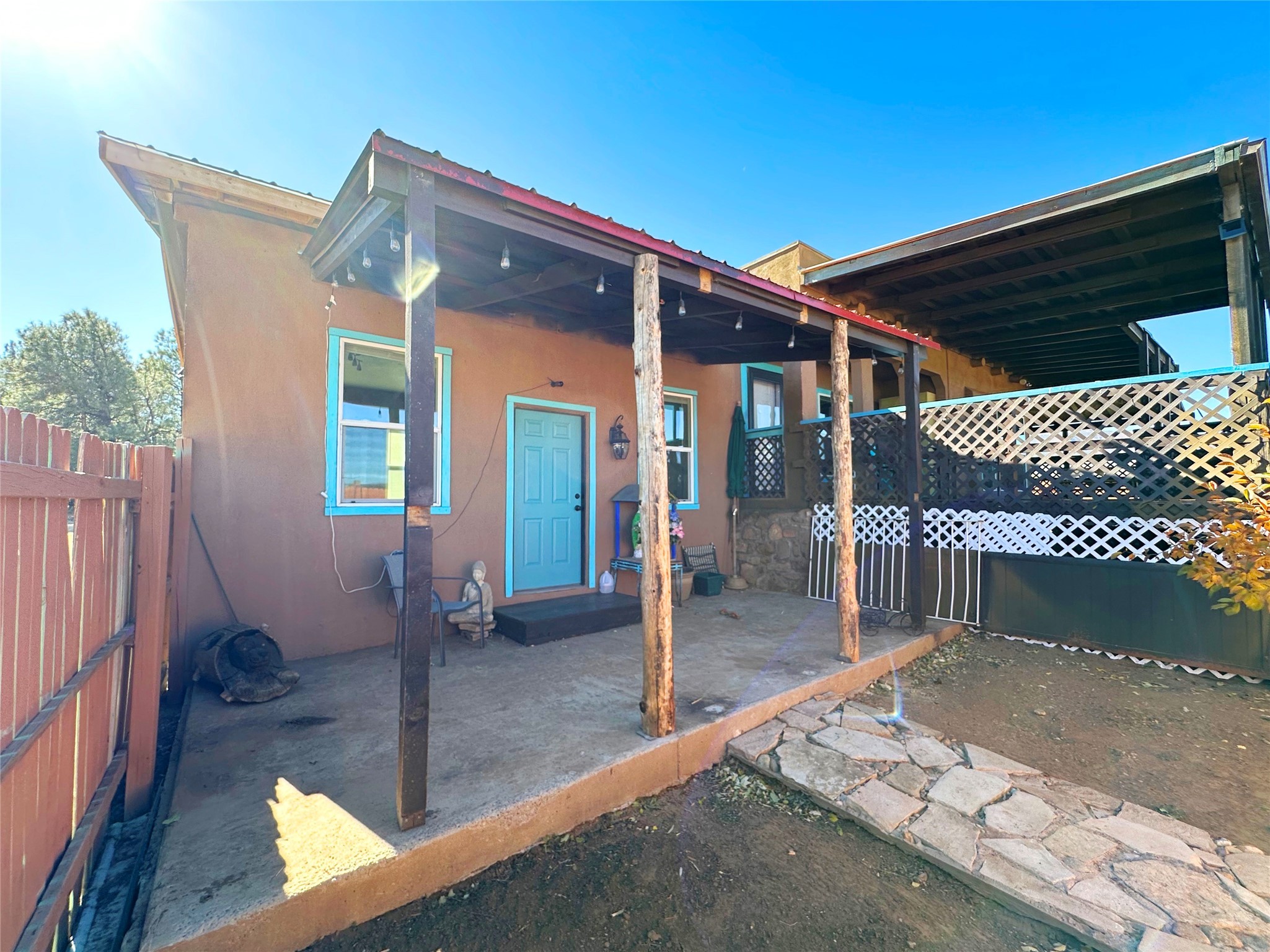 Welcome home to this delightful 2 bedroom, 2 bath modular home on 5.04 acres of stunning New Mexico landscape in San Geronimo. This beautifully level property offers breathtaking panoramic mountain views, rolling meadows, and graceful pine trees - your own natural sanctuary. The thoughtfully designed master suite serves as your personal haven, featuring a comfortable sitting area and access to its own private covered deck where you can unwind after a fulfilling day. Additionally, the home features an expansive wrap-around deck offering commanding views of the iconic Hermit's Peak and spectacular sunsets across the crisp mountain landscape.The spacious kitchen provides generous storage and counter space, ideal for preparing meals or entertaining. The den offers wonderful flexibility with its