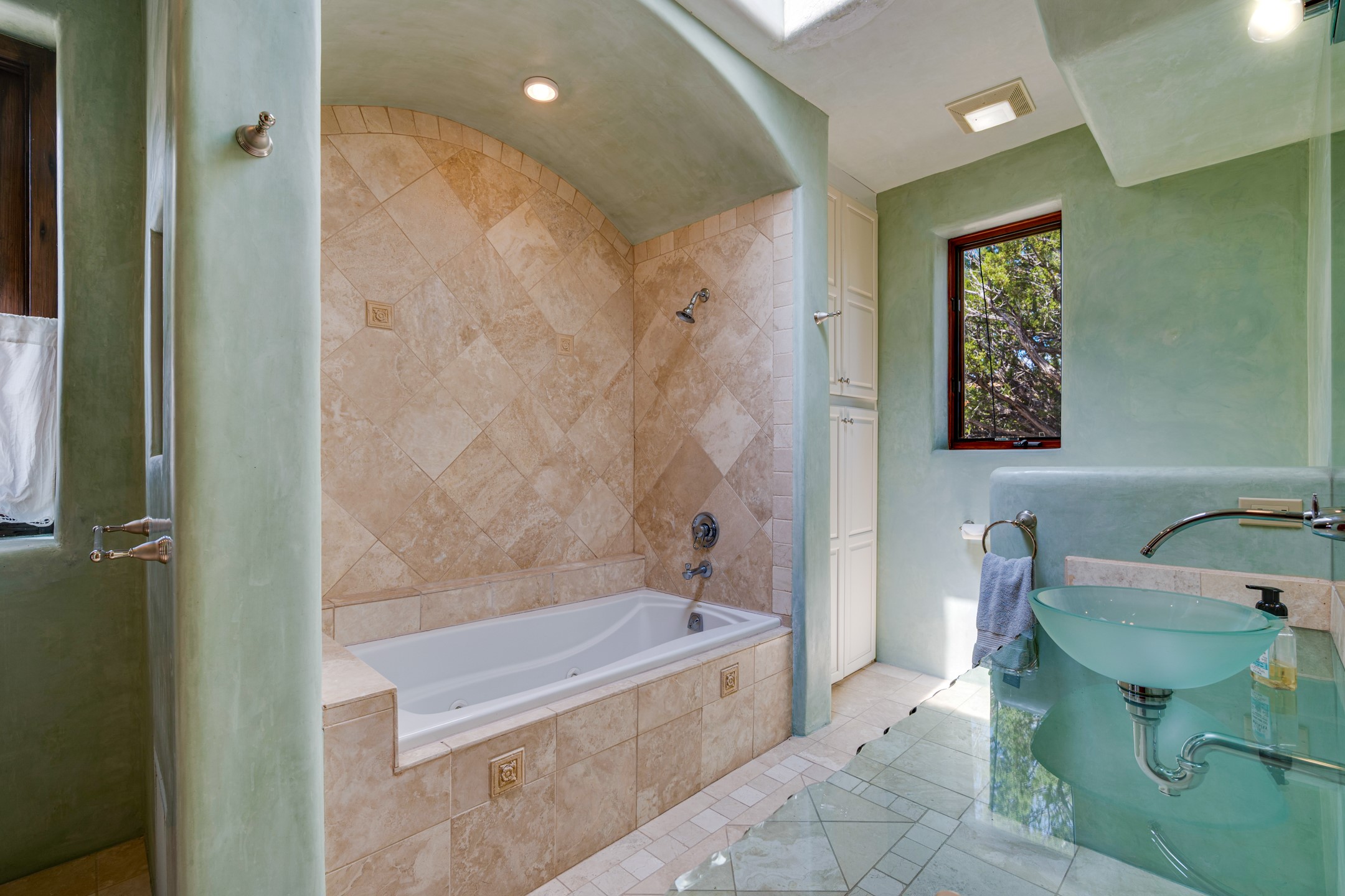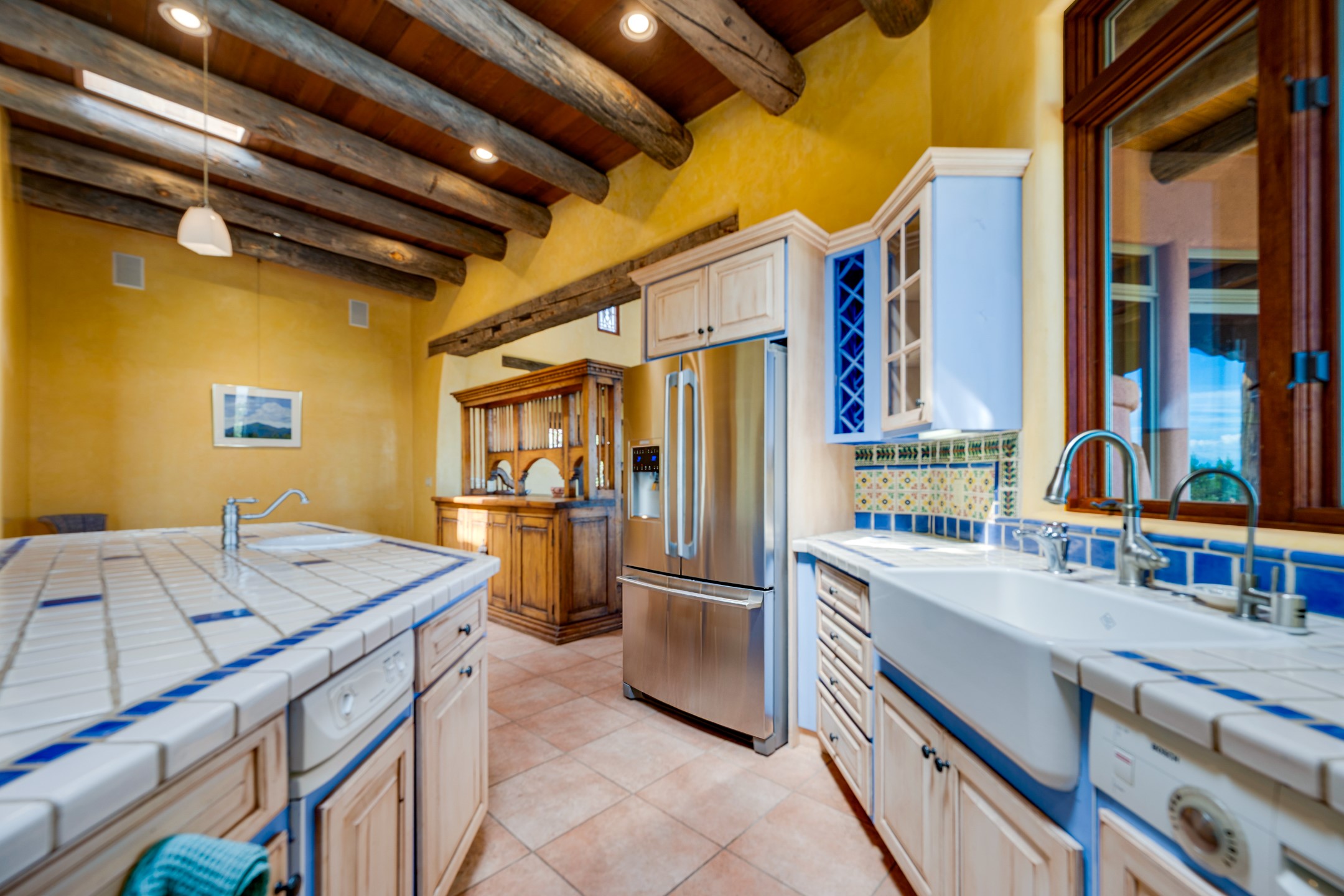 Oro Viejo Ranch is a timeless sanctuary on 106 acres. A harmonious blend of natural splendor, meticulous craftsmanship, and modern convenience. There are breathtaking panoramic views of the Sangre de Cristo, Ortiz Mountains, Cerrillos Hills, and the iconic Lone Butte. The main residence showcases authentic Southwest style, adobe and rastra construction. It features intricate plasterwork, recycled wood vigas, and a heated indoor pool, the rooftop deck offers truly unobstructed views. The solid oak cabin adds rustic charm, originally owned by the Hoover family, and rebuilt on-site. Horse enthusiasts will appreciate the six-stall, barn, tack room, workshop, covered hay storage, electric, and hot water, and protected outdoor runs. An insulated chicken coop provides the perfect setup for fresh eggs, while a private well with a large storage tank ensures a reliable water source.A convenient RV hookup is also available on the property.