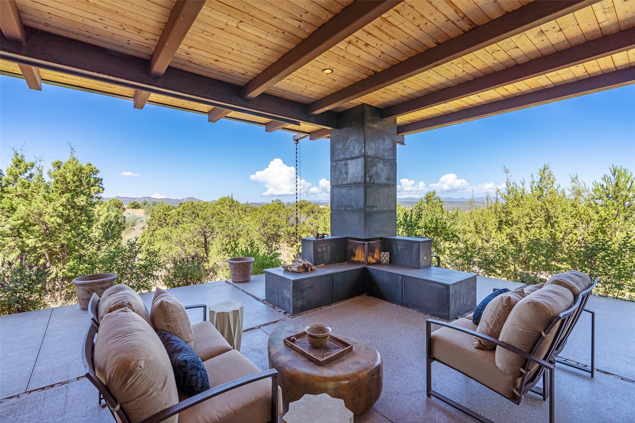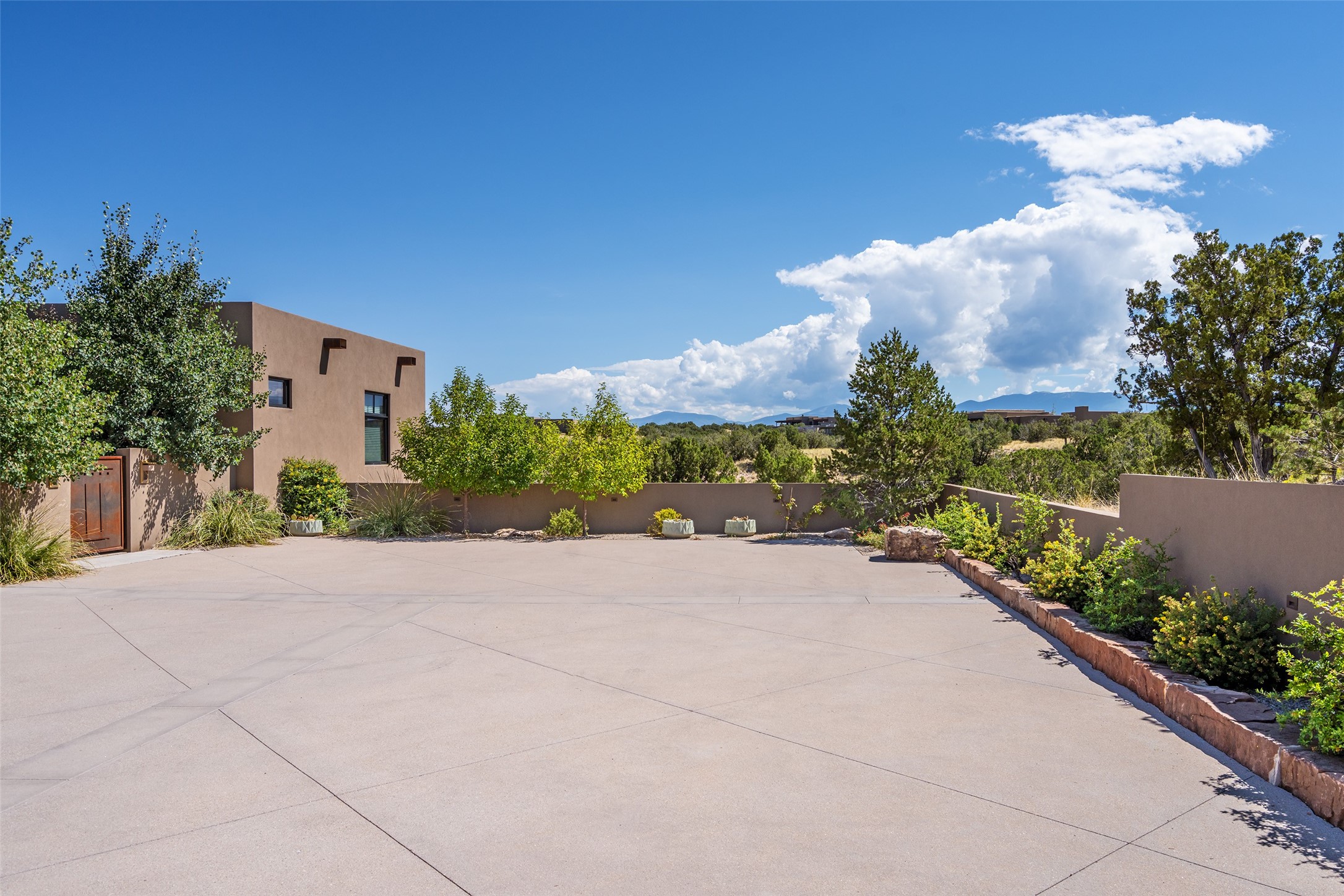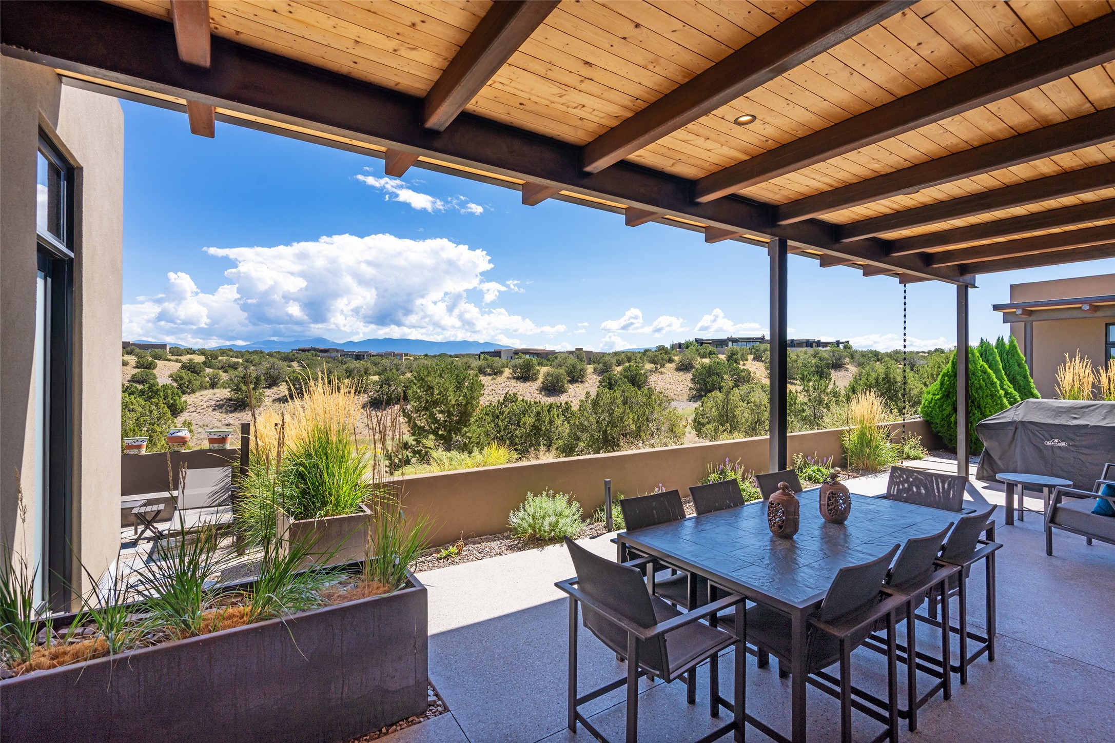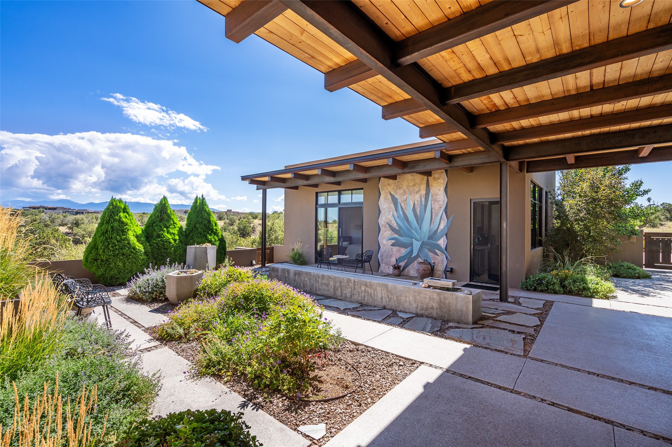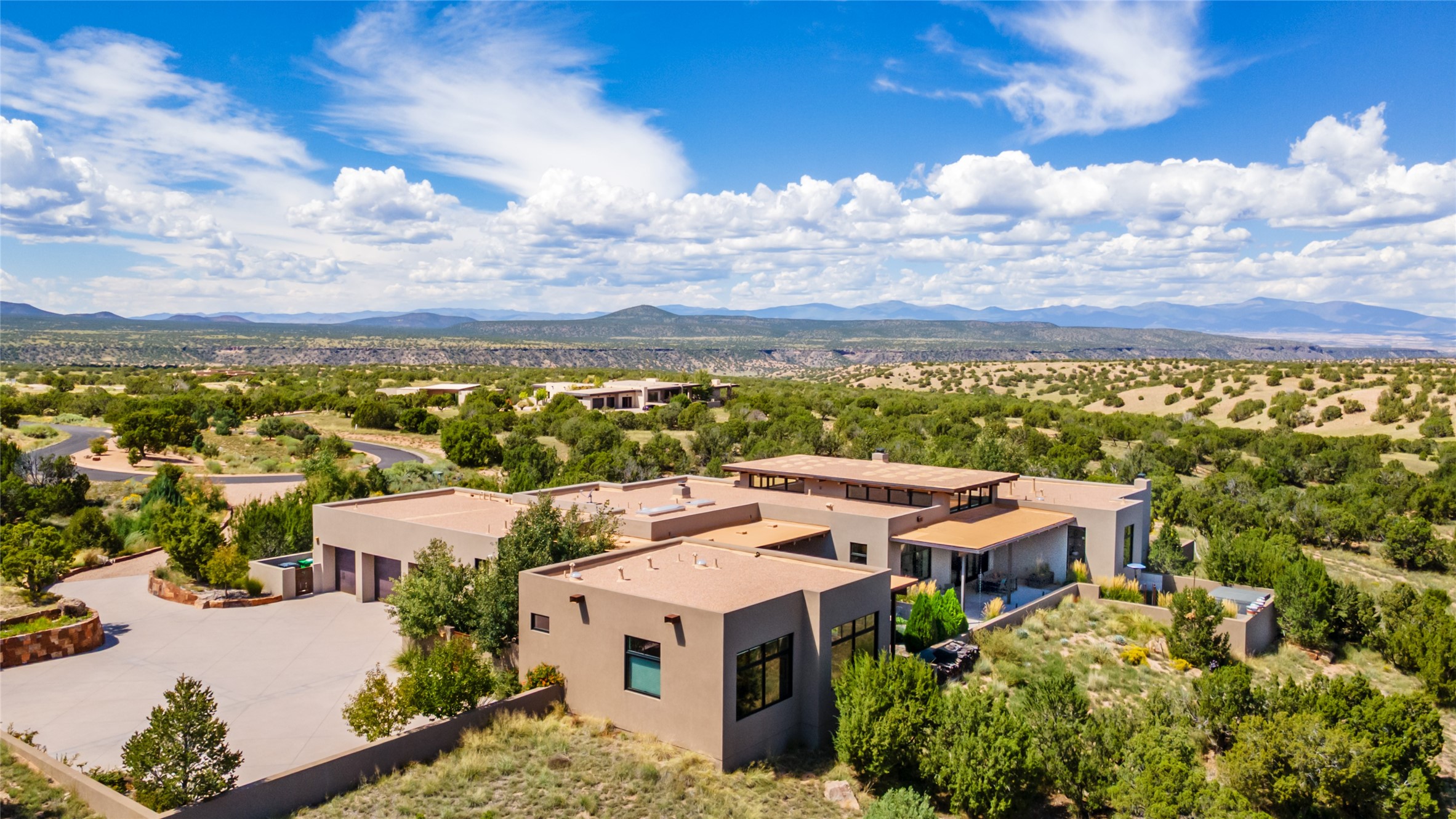 CONTEMPORARY MASTERPIECE IN LAS CAMPANAS WITH UNPARALLELED VIEWS TO BOTH MOUNTAIN RANGES. Bordering Bureau of Land Management Land, this exceptional property offers sweeping Eastern and Western Mountain vistas with uncompromised privacy. The 3,947 sqft main home has plenty of natural light, towering wood and steel ceilings and clerestory windows - designed by noted architect Lorn Tryk and executed by Prull Custom Builders - featuring 1 bedroom, 2 offices, a media room, and gallery-like spaces enhanced by travertine floors, warm stacked-stone masonry walls, custom ironwork, and motorized shades. The Owner's suite looks to the landscape and is a haven of tranquility. A detached guest house provides 2 bedrooms, 2 bathrooms, and a kitchenette - perfect for extended stays of hosting in style. Smart-home systems, a whole-home natural gas generator, and a 3-car garage with an oversized truck bay ensure convenience and peace of mind. Designed for modern living, the chef's kitchen includes Wolf and Sub-Zero appliances, dual dishwashers & ovens, steam oven, large wine fridge, pantry, and striking Spanish woven-metal light fixtures. Outdoor living is extraordinary with patios accessible from nearly every room, 3 fountains, hot tub with outdoor shower, and a custom Agave mural by artist Pam Platt. Four fireplaces add warmth and ambience indoors and out. Phenomenal cross-lighting, gorgeous driveway approach, and refined details throughout complete this contemporary retreat in one of Santa Fe's most prestigious communities.