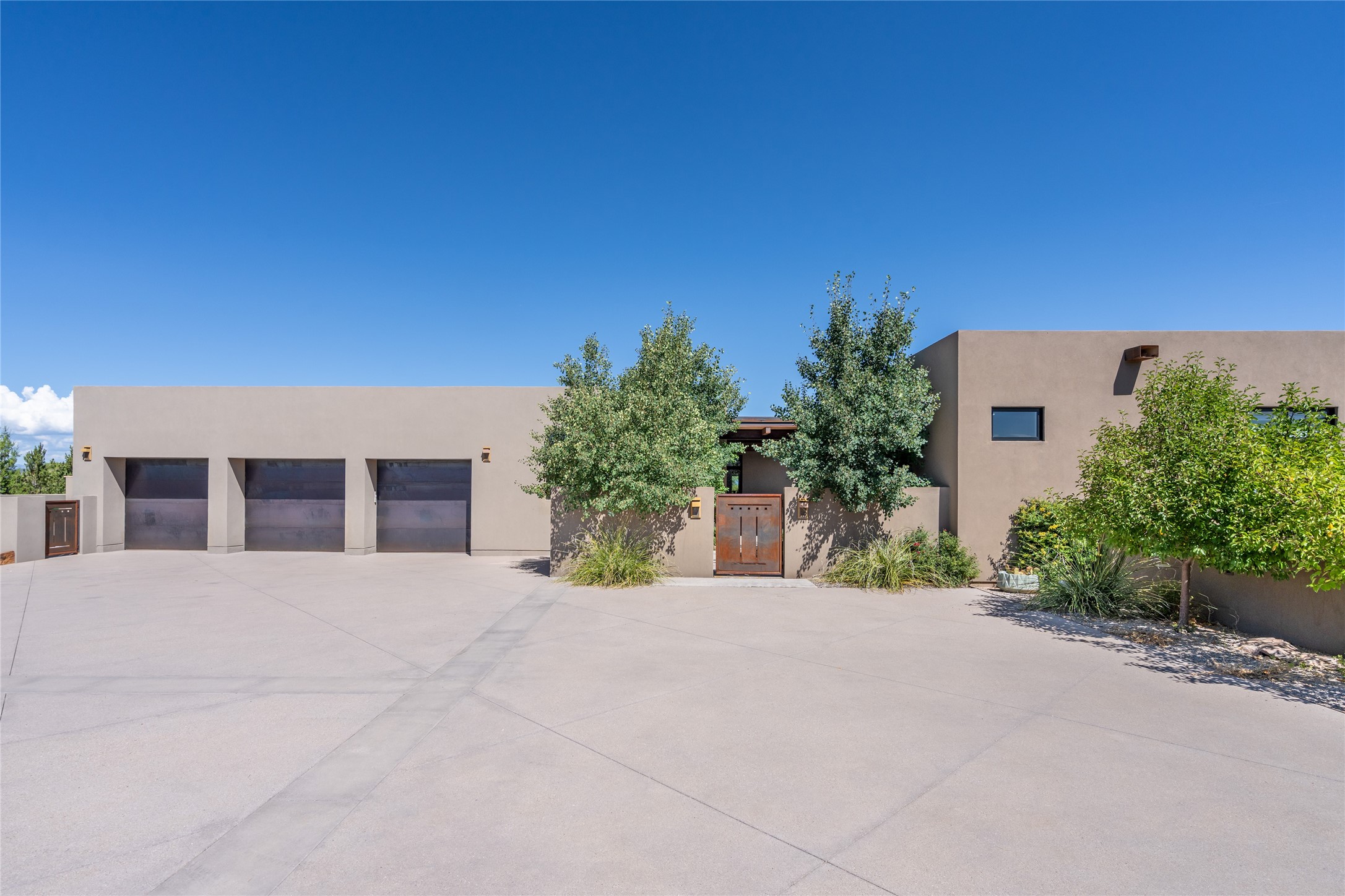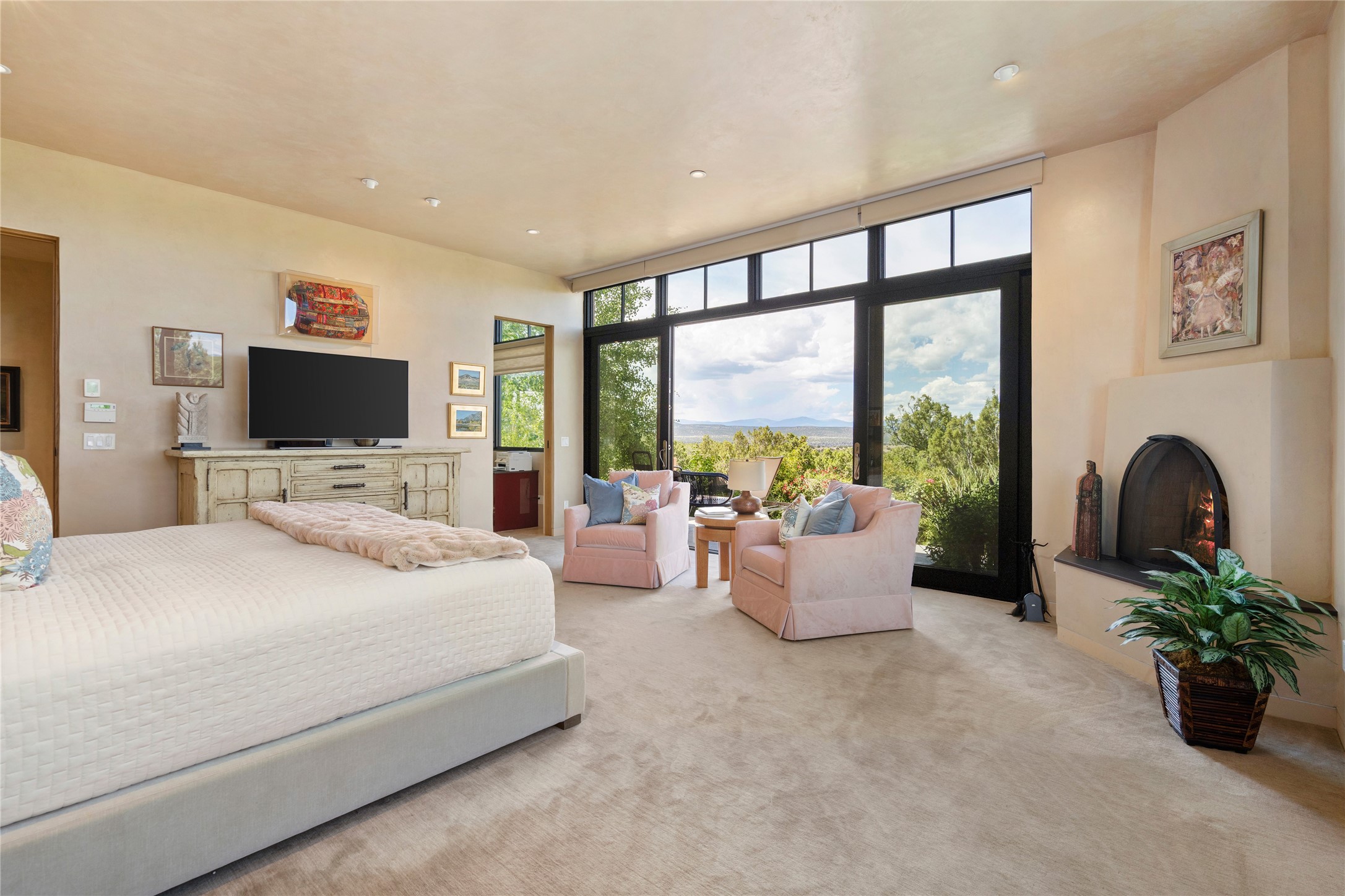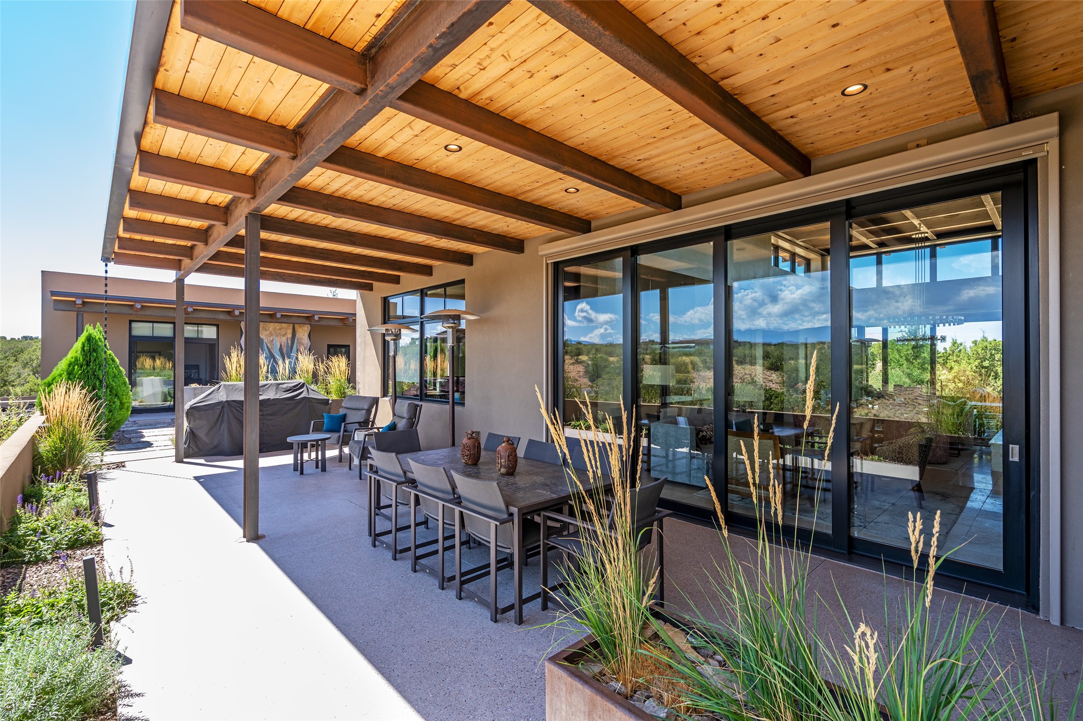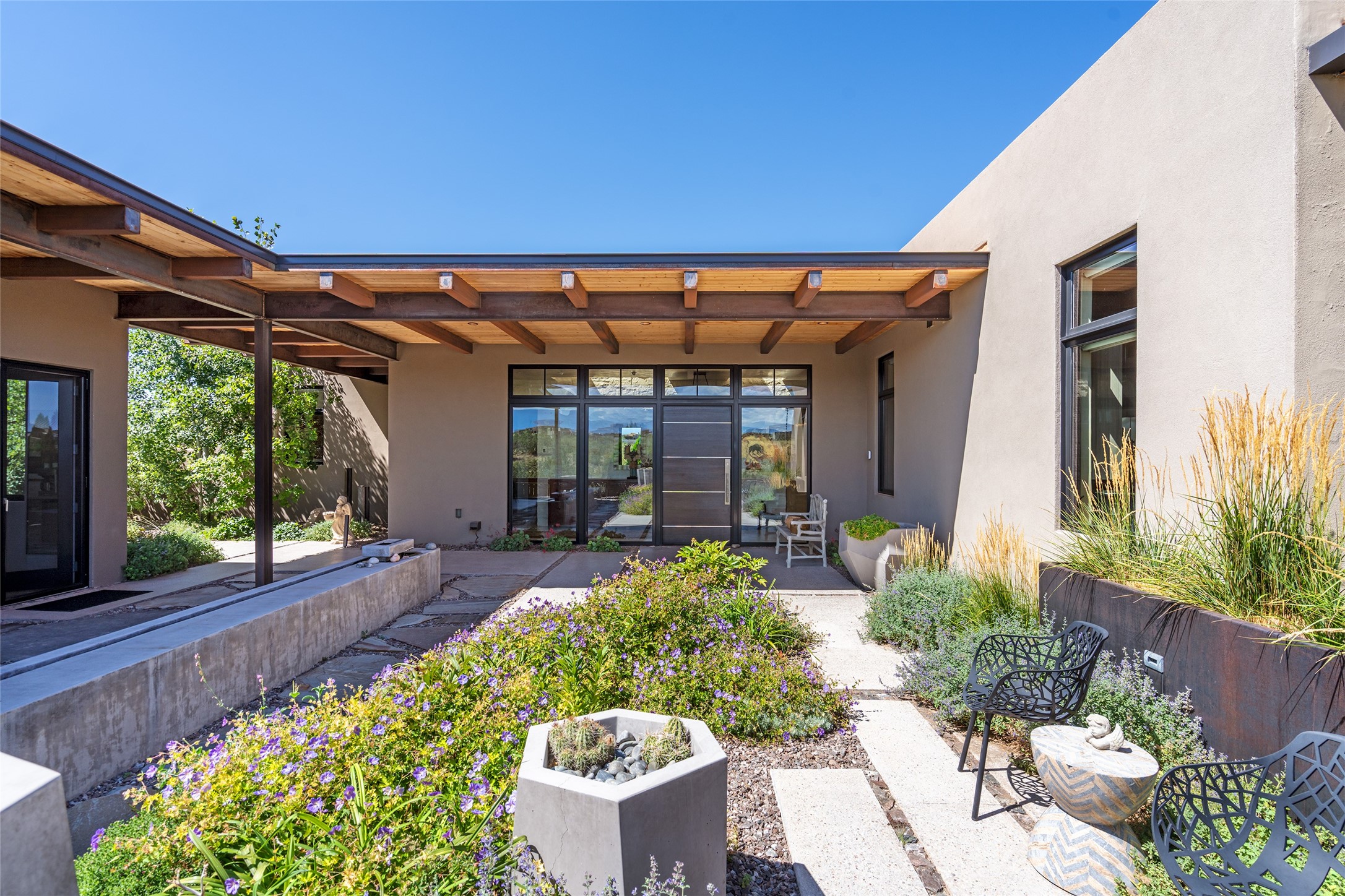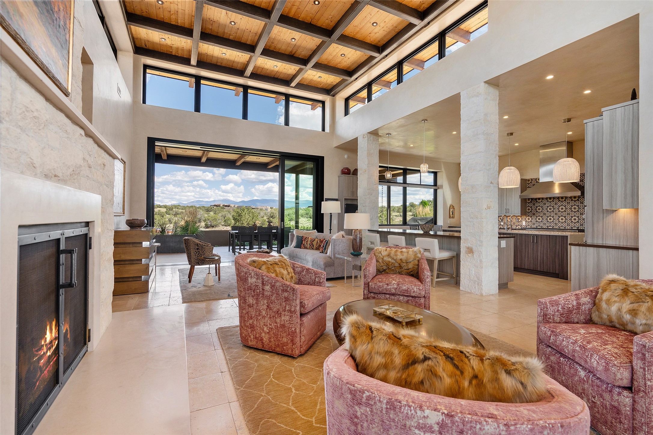 CONTEMPORARY MASTERPIECE IN LAS CAMPANAS WITH UNPARALLELED VIEWS TO BOTH MOUNTAIN RANGES. Bordering Bureau of Land Management Land, this exceptional property offers sweeping Eastern and Western Mountain vistas with uncompromised privacy. The 3,947 sqft main home has plenty of natural light, towering wood and steel ceilings and clerestory windows - designed by noted architect Lorn Tryk and executed by Prull Custom Builders - featuring 1 bedroom, 2 offices, a media room, and gallery-like spaces enhanced by travertine floors, warm stacked-stone masonry walls, custom ironwork, and motorized shades. The Owner's suite looks to the landscape and is a haven of tranquility. A detached guest house provides 2 bedrooms, 2 bathrooms, and a kitchenette - perfect for extended stays of hosting in style. Smart-home systems, a whole-home natural gas generator, and a 3-car garage with an oversized truck bay ensure convenience and peace of mind. Designed for modern living, the chef's kitchen includes Wolf and Sub-Zero appliances, dual dishwashers & ovens, steam oven, large wine fridge, pantry, and striking Spanish woven-metal light fixtures. Outdoor living is extraordinary with patios accessible from nearly every room, 3 fountains, hot tub with outdoor shower, and a custom Agave mural by artist Pam Platt. Four fireplaces add warmth and ambience indoors and out. Phenomenal cross-lighting, gorgeous driveway approach, and refined details throughout complete this contemporary retreat in one of Santa Fe's most prestigious communities.