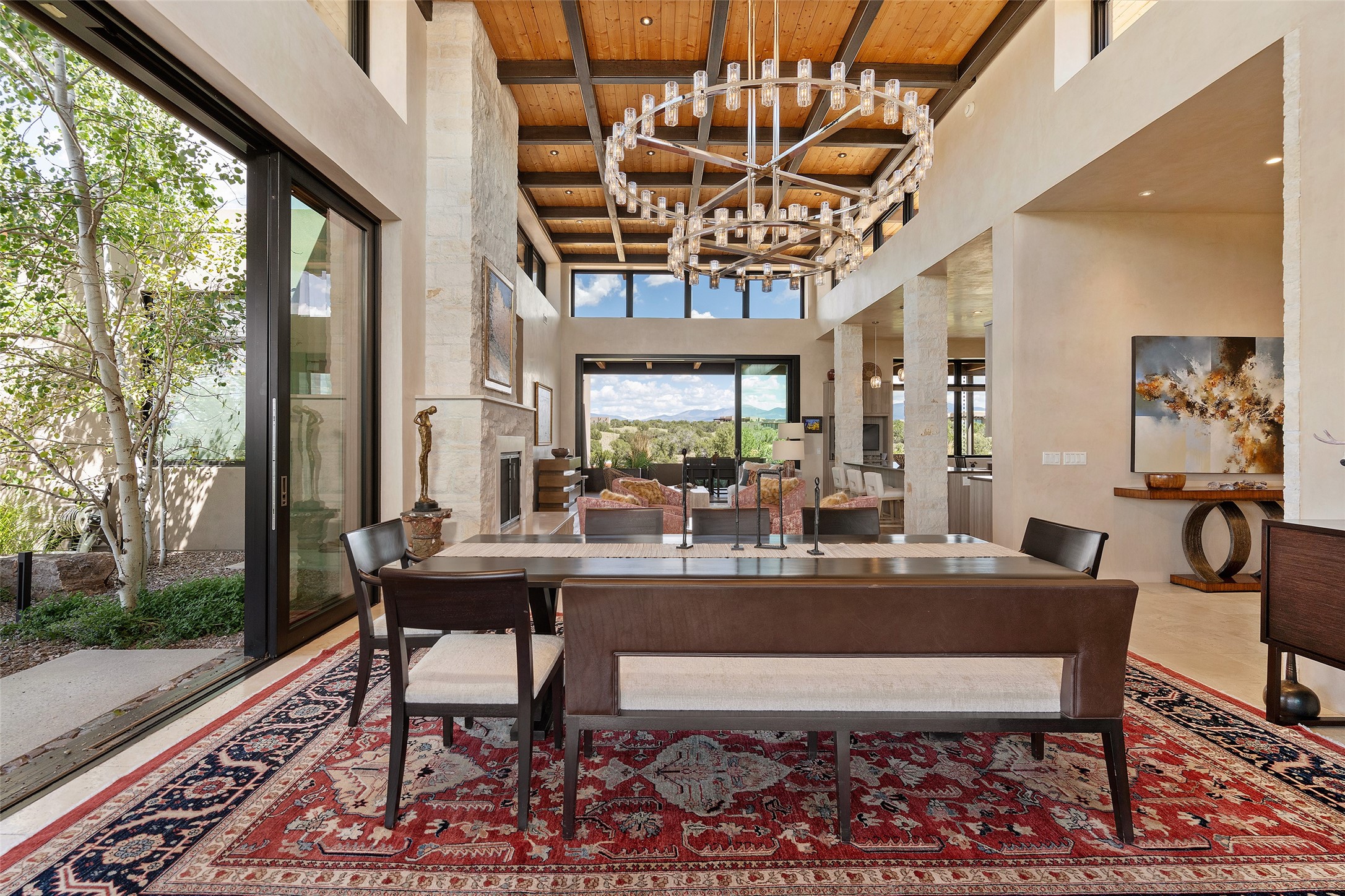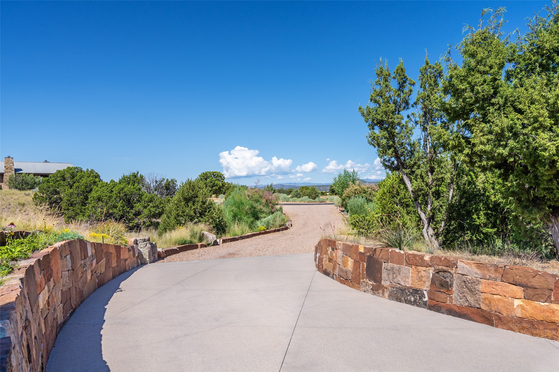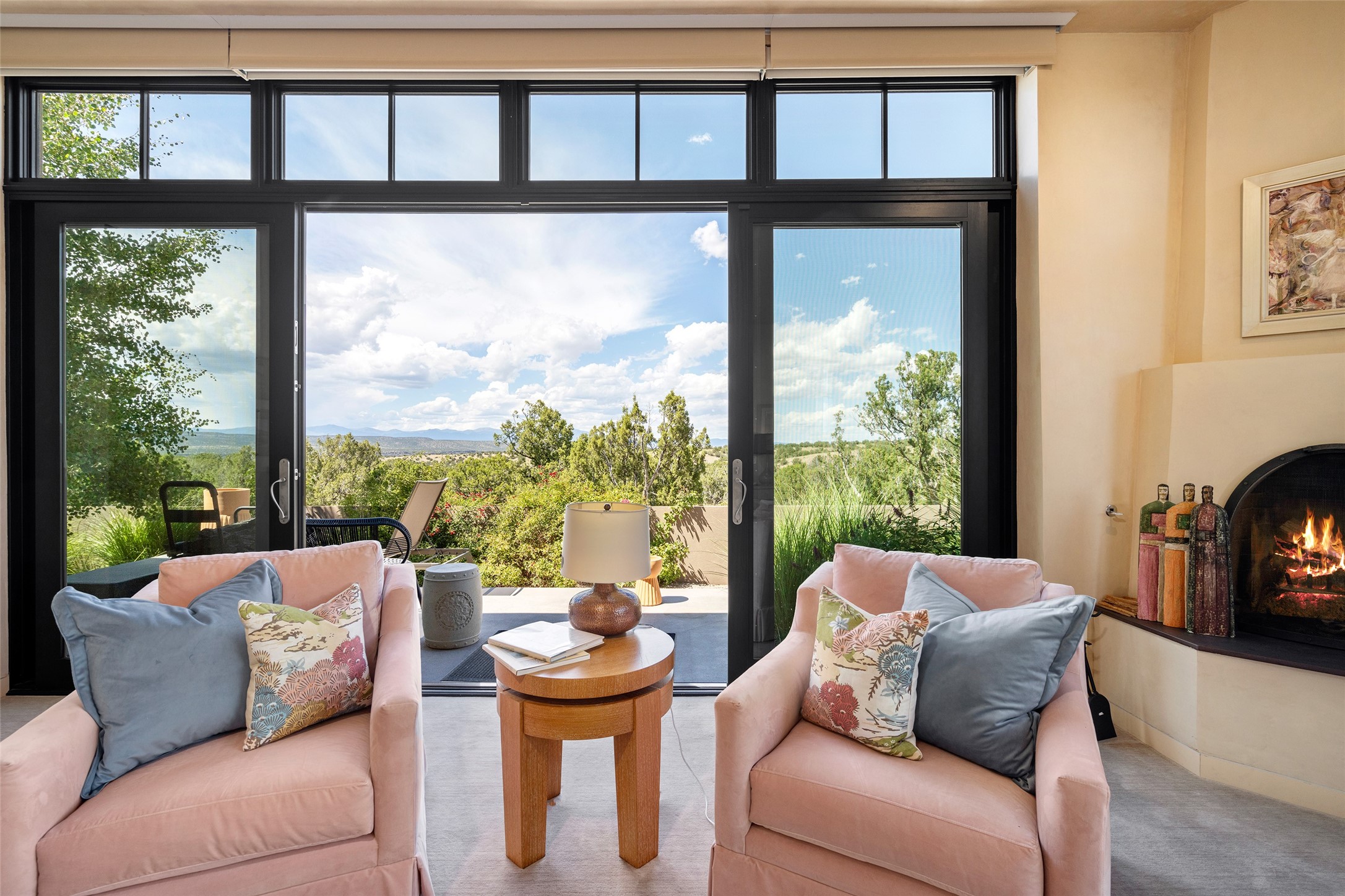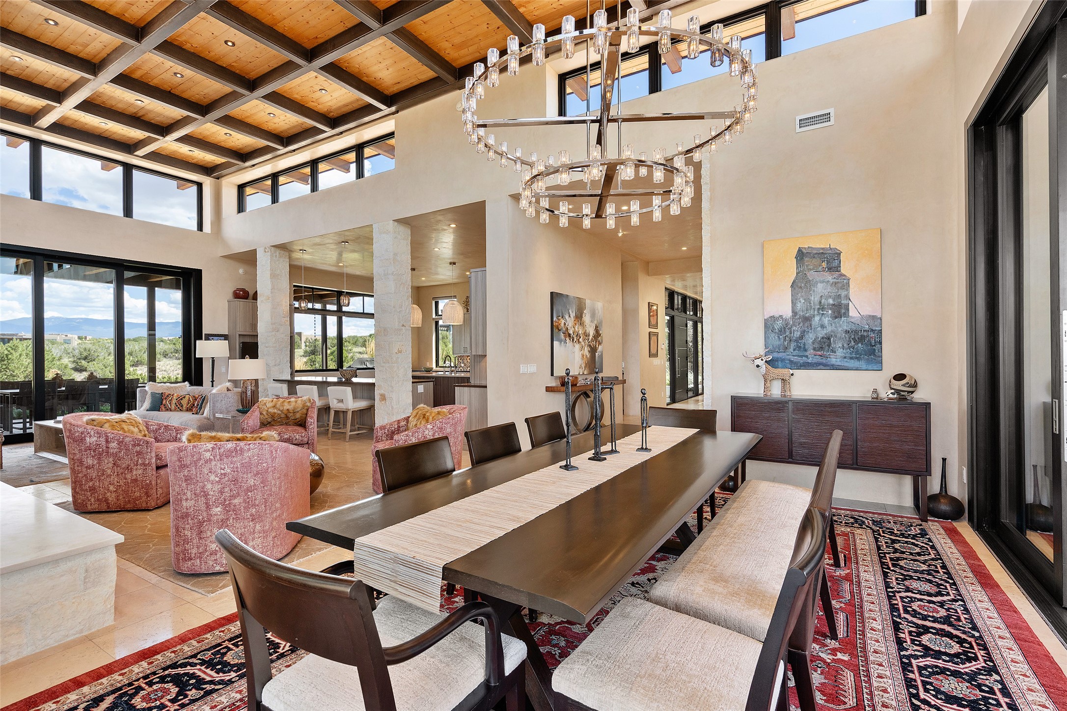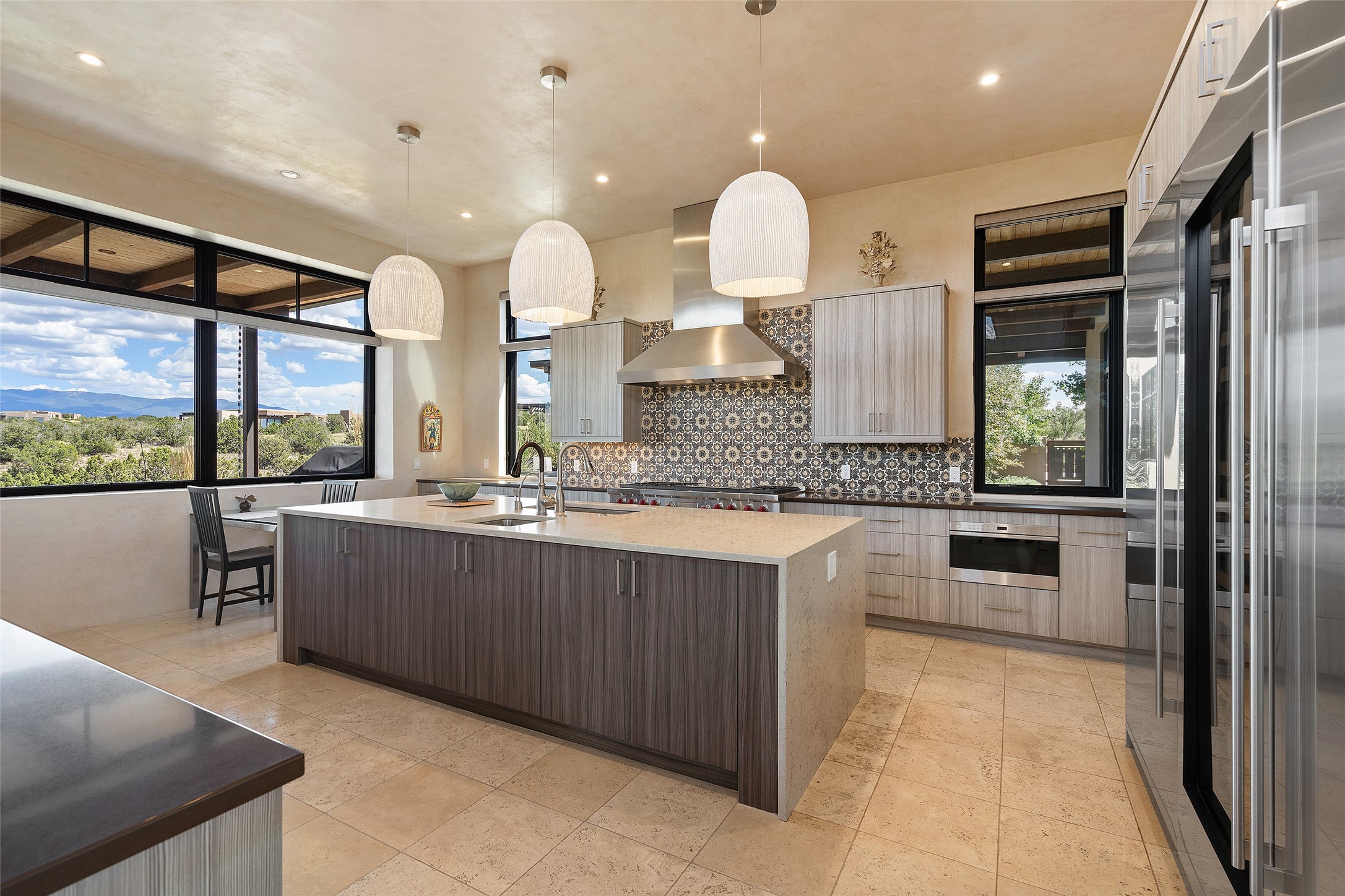 CONTEMPORARY MASTERPIECE IN LAS CAMPANAS WITH UNPARALLELED VIEWS TO BOTH MOUNTAIN RANGES. Bordering Bureau of Land Management Land, this exceptional property offers sweeping Eastern and Western Mountain vistas with uncompromised privacy. The 3,947 sqft main home has plenty of natural light, towering wood and steel ceilings and clerestory windows - designed by noted architect Lorn Tryk and executed by Prull Custom Builders - featuring 1 bedroom, 2 offices, a media room, and gallery-like spaces enhanced by travertine floors, warm stacked-stone masonry walls, custom ironwork, and motorized shades. The Owner's suite looks to the landscape and is a haven of tranquility. A detached guest house provides 2 bedrooms, 2 bathrooms, and a kitchenette - perfect for extended stays of hosting in style. Smart-home systems, a whole-home natural gas generator, and a 3-car garage with an oversized truck bay ensure convenience and peace of mind. Designed for modern living, the chef's kitchen includes Wolf and Sub-Zero appliances, dual dishwashers & ovens, steam oven, large wine fridge, pantry, and striking Spanish woven-metal light fixtures. Outdoor living is extraordinary with patios accessible from nearly every room, 3 fountains, hot tub with outdoor shower, and a custom Agave mural by artist Pam Platt. Four fireplaces add warmth and ambience indoors and out. Phenomenal cross-lighting, gorgeous driveway approach, and refined details throughout complete this contemporary retreat in one of Santa Fe's most prestigious communities.